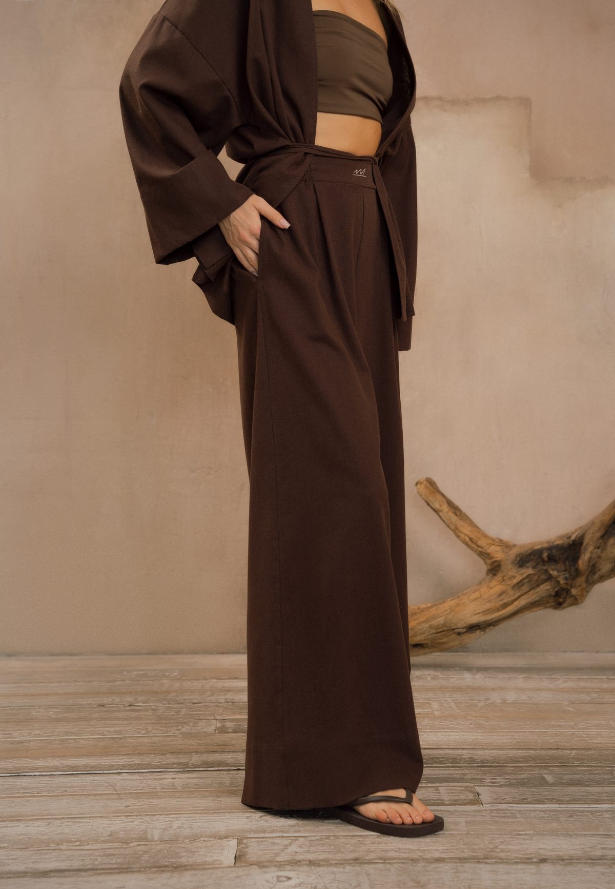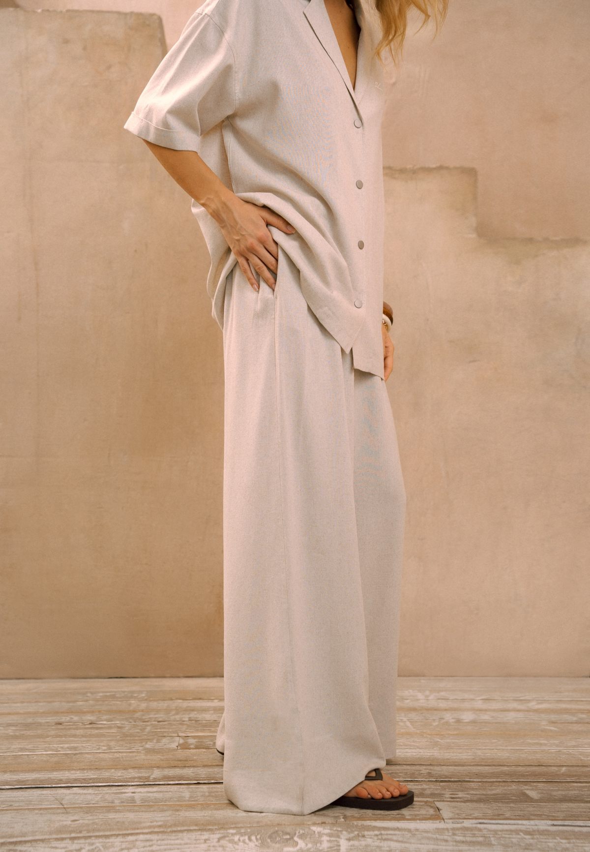 Широкие брюки-палаццо "Лотос" из коллекции Softwear выполнены изо льна натурального бежевого оттенка. Интересный крой пояса, два боковых кармана, лаконичная тональная вышивка с логотипом бренда на поясе, вытачки спереди, которые создают красивые фигурные складки и декоративная строчка по низу. Брюки отлично подойдут для пляжных и летних образов и хорошо сочетаются с шоколадным и полосатым льном из коллекции Softwear. В комплекте к брюкам в ассортименте представлена рубашка "Лили"