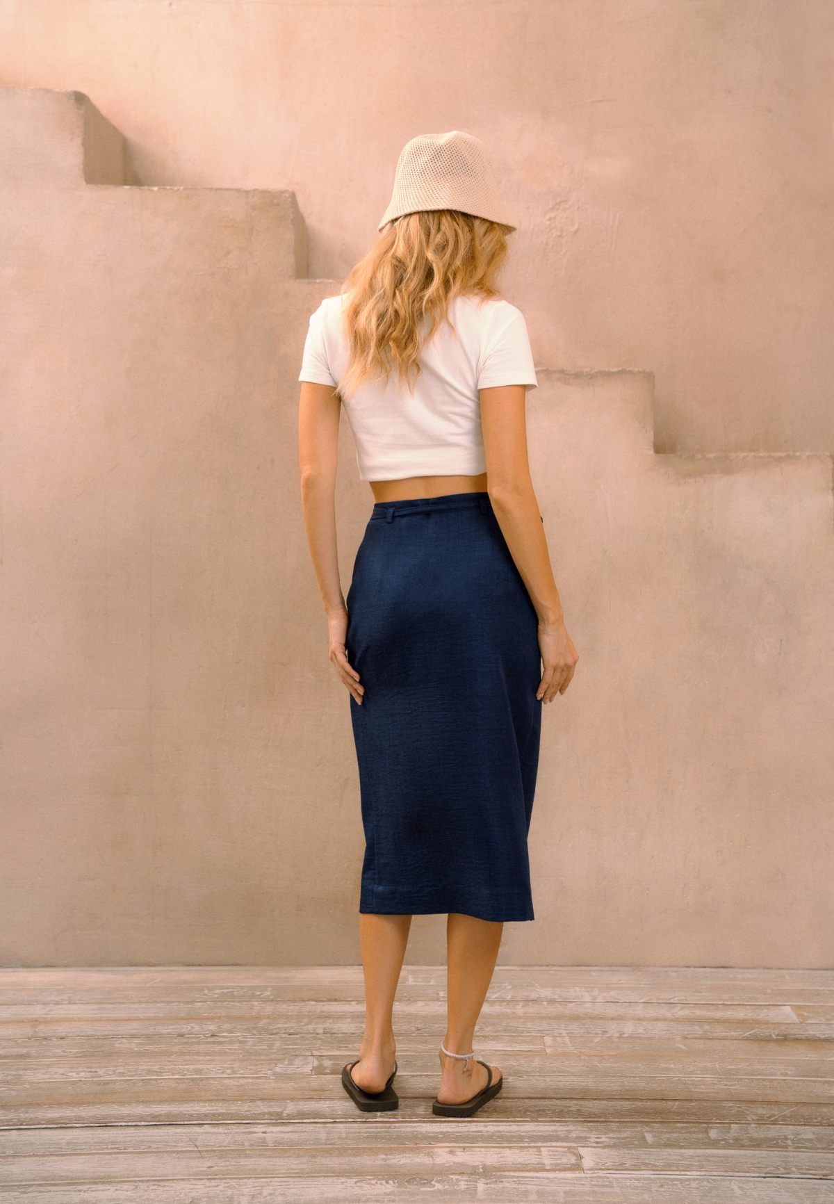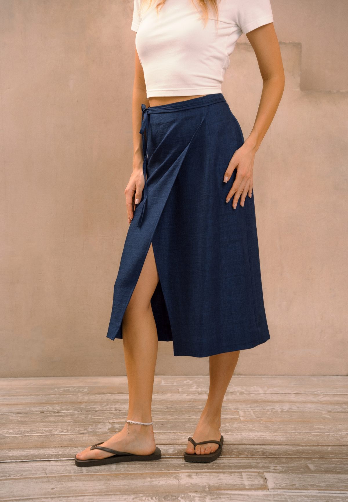 Удлиненная юбка на запах «Лотос» из легкого мягкого материала из коллекции Softwear. Шнурок выполнен из основного материала, сзади имеются петли для фиксации шнурка. С его помощью можно по-разному подвязывать юбку вокруг талии. Конструкция запаха создает игривый вырез спереди, который открывает ногу при ходьбе. Глубокий синий цвет отсылает к морской тематике.