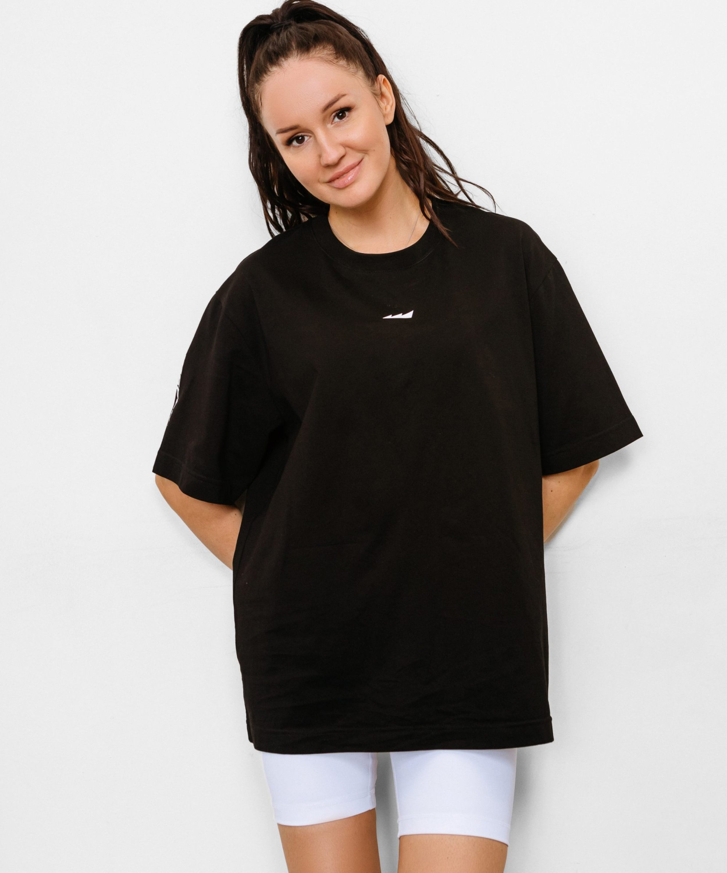 Женская футболка oversize силуэта. Сделана из 100% плотного хлопка - гипоаллергенного материала, отлично пропускающего воздух. Спущенная линия плеча делает крой футболки более молодежной. На груди расположен контрастный лого-принт. Модель представлена в классическом черном цвете. Стильная базовая модель для любого образа на каждый день.