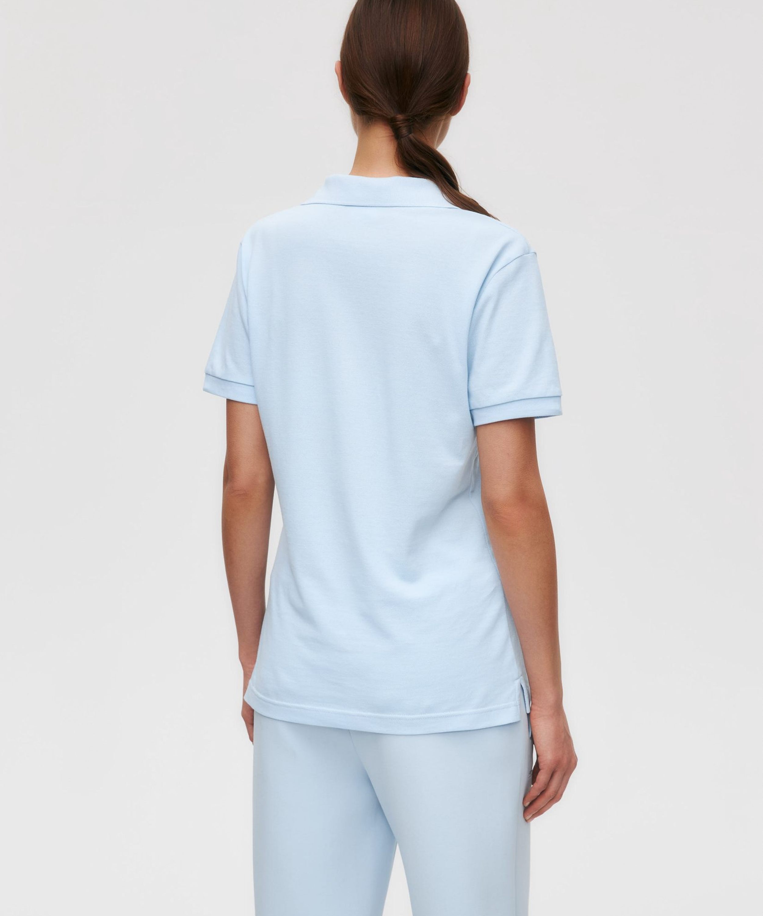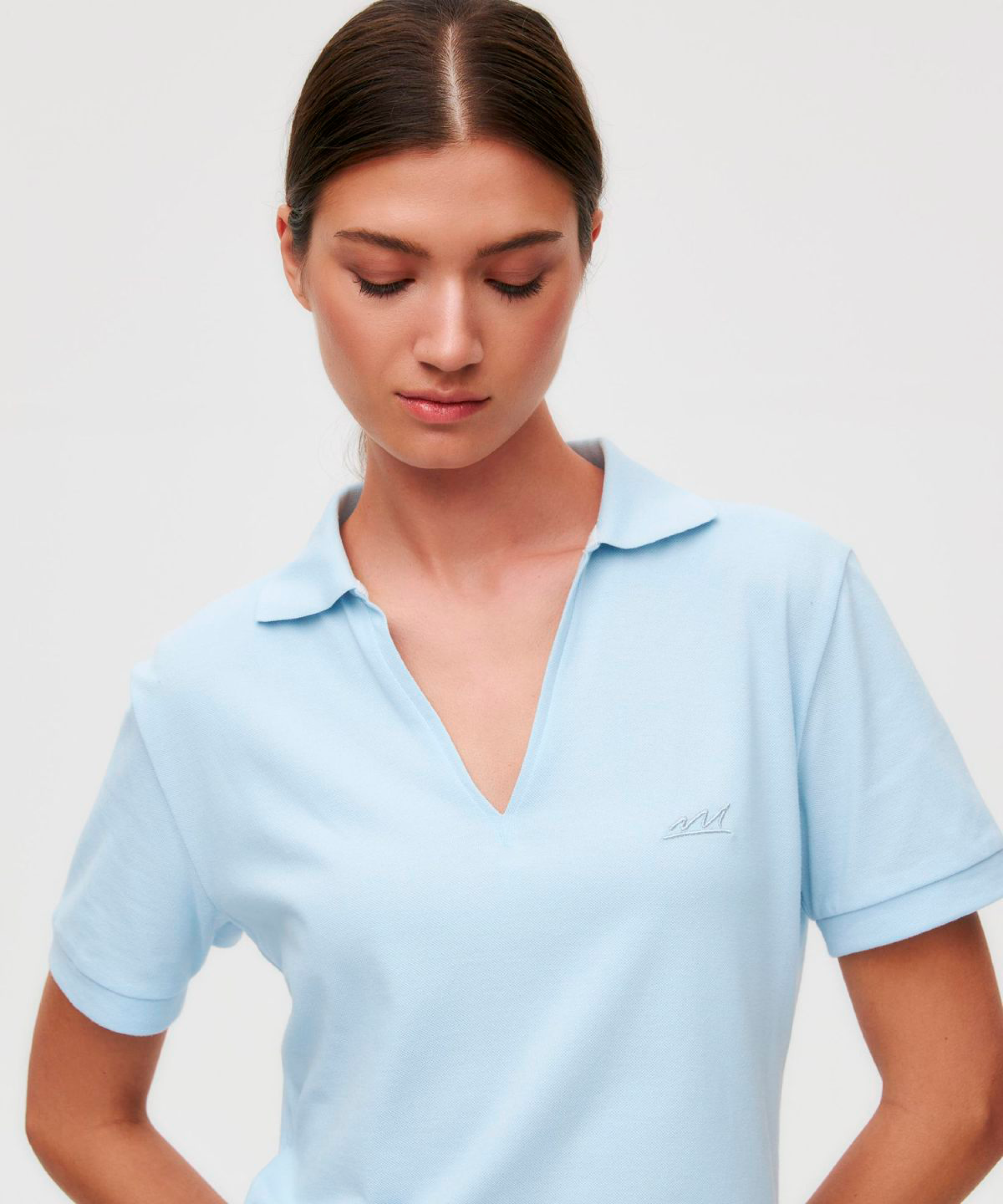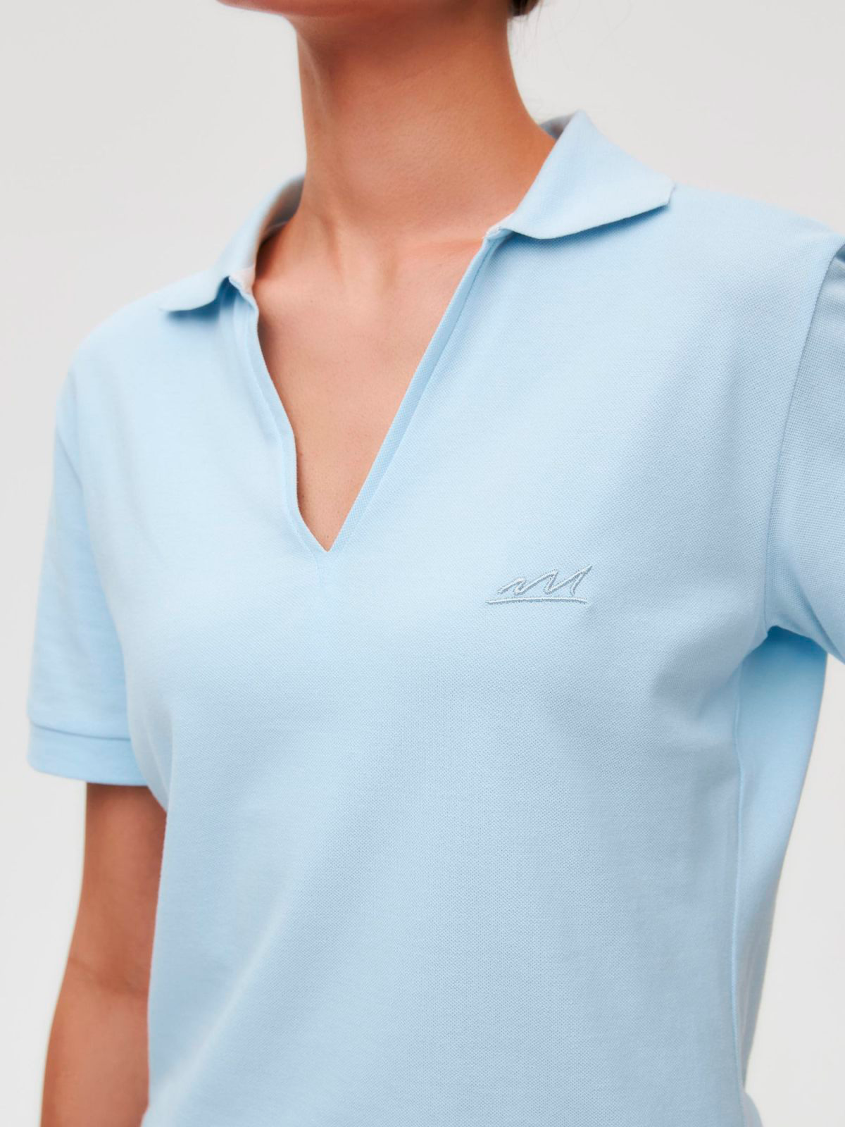 Женское классическое поло в спортивном стиле с V-вырезом выполнено из 100% хлопка. Прямой крой, классическая посадка. На груди расположена лаконичная вышивка с логотипом бренда. Поло представлено в двух цветах: нежно-голубой и холодный серый. Поло отлично сочетается как со спортивными вещами, так и с классическими брюками и юбкой.