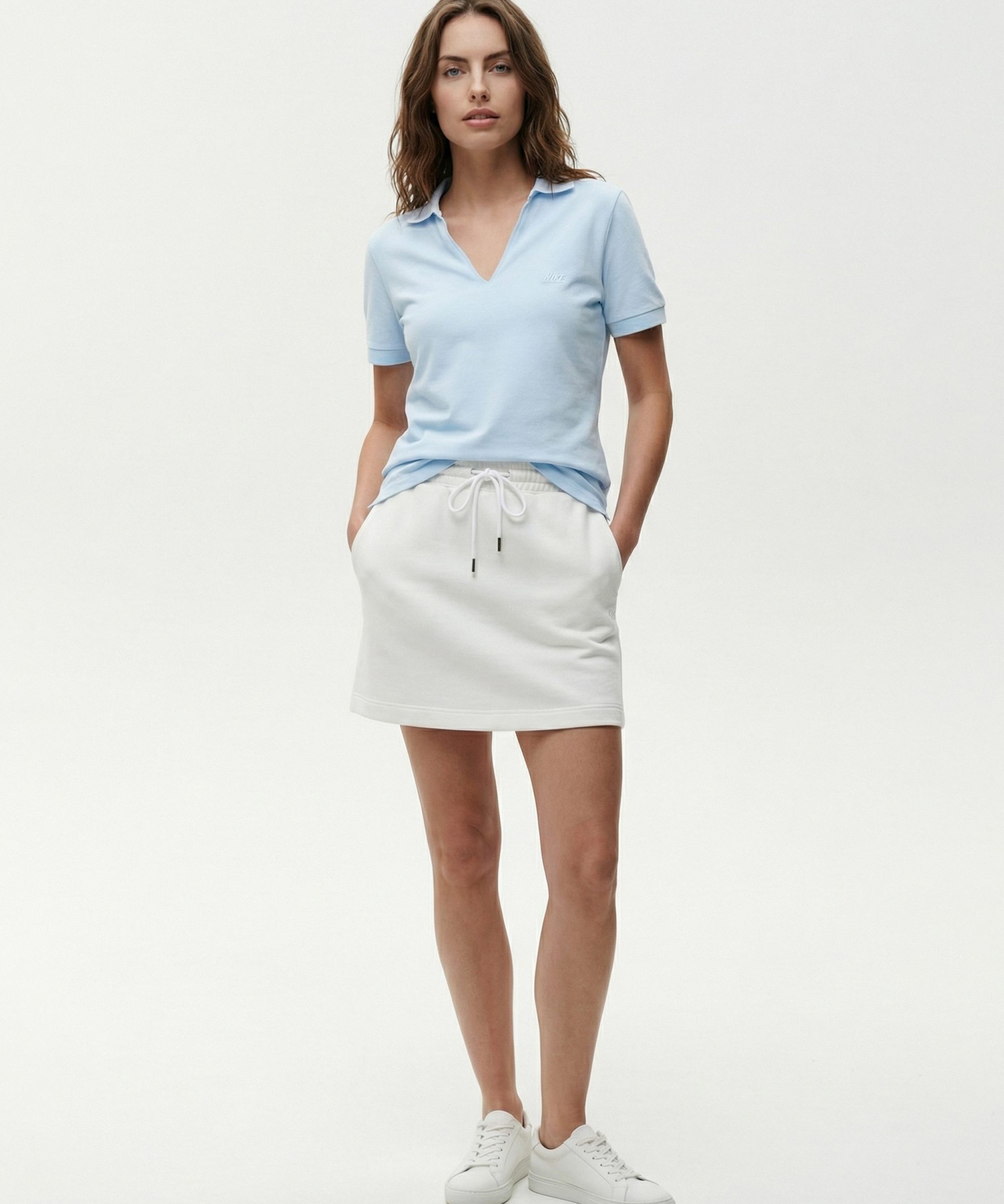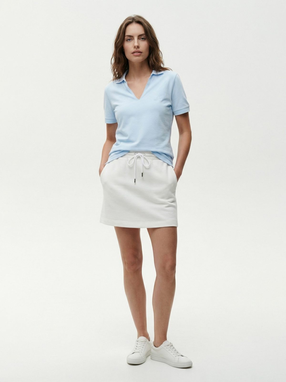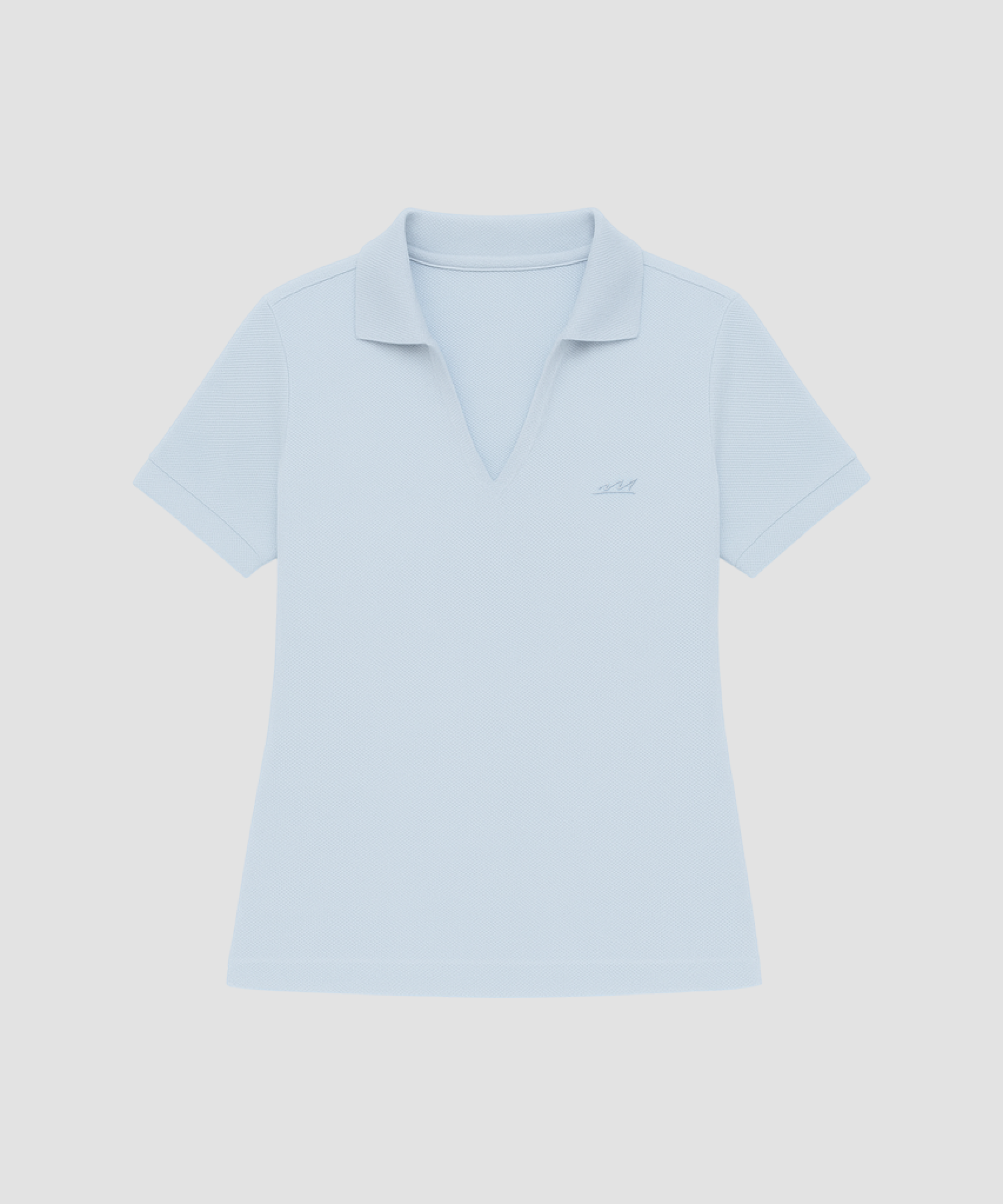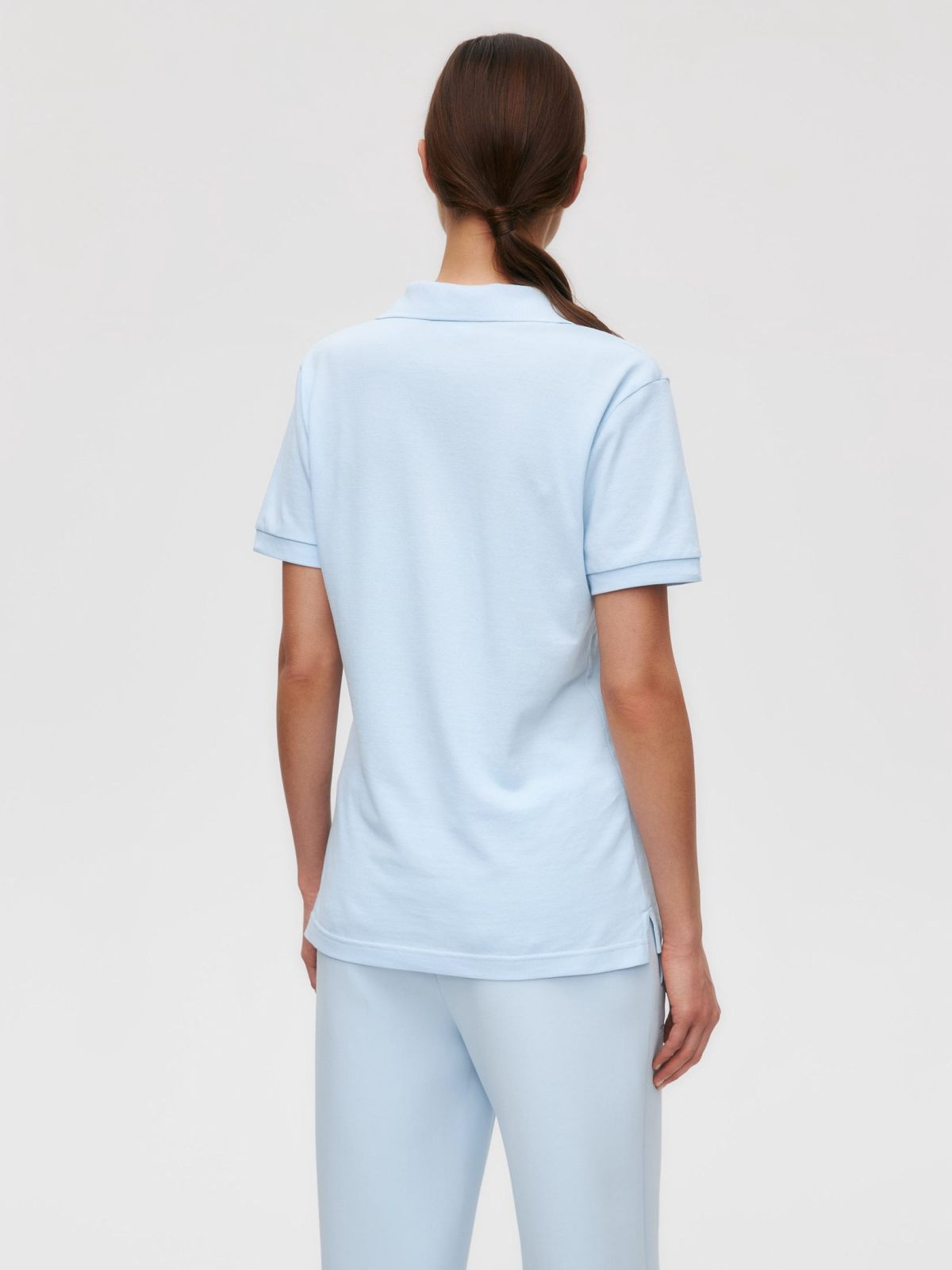 Женское классическое поло в спортивном стиле с V-вырезом выполнено из 100% хлопка. Прямой крой, классическая посадка. На груди расположена лаконичная вышивка с логотипом бренда. Поло представлено в двух цветах: нежно-голубой и холодный серый. Поло отлично сочетается как со спортивными вещами, так и с классическими брюками и юбкой.