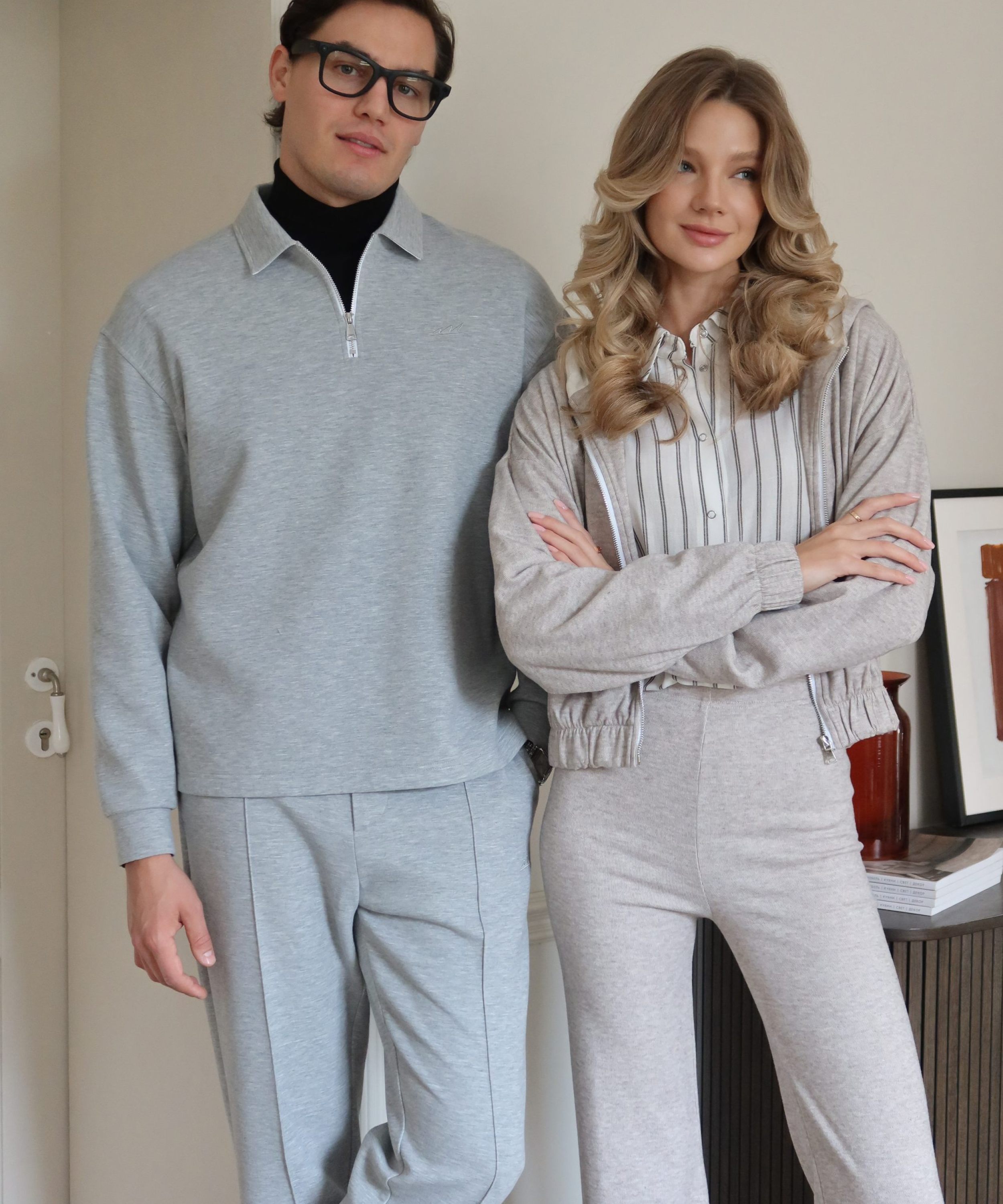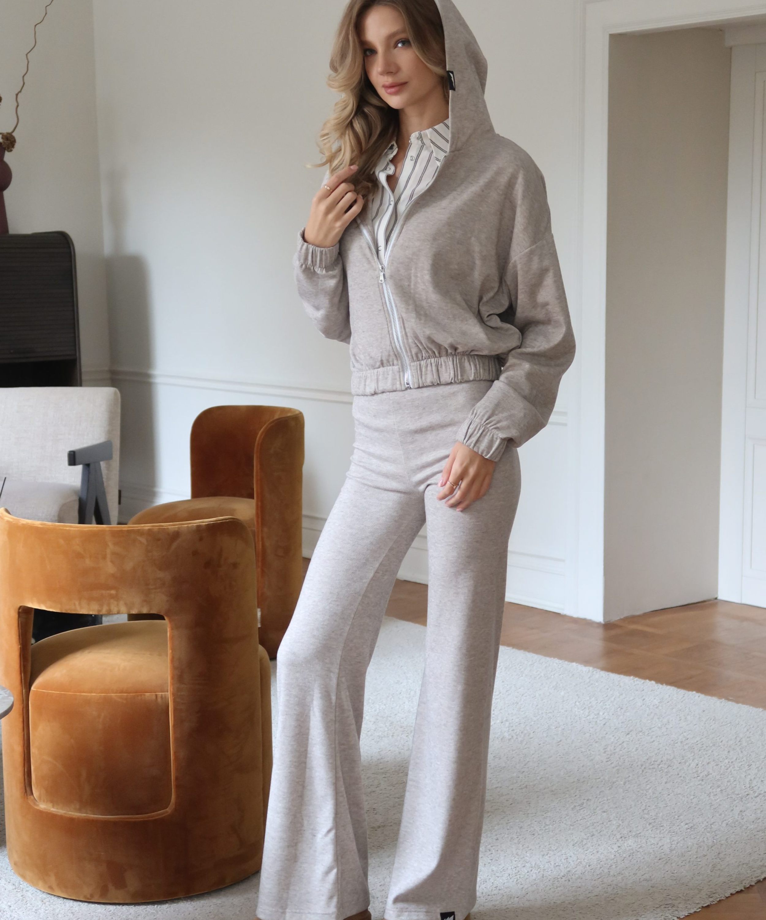 Расклешенные брюки с высокой посадкой выполнены из материала, в составе которого 67% полиэстера 25% вискозы и 8% эластана, за счет чего брюки невероятного мягкие и комфортные. На брюках внизу с левой стороны расположен лаконичный жаккардовый флажок с логотипом бренда. Брюки представлены в двух классических цветах: серый и бежевый меланж. Комплектом к брюкам в ассортименте имеется худи W5HOM34. Отличный выбор для комфортного образа в спортивном стиле на каждый день.