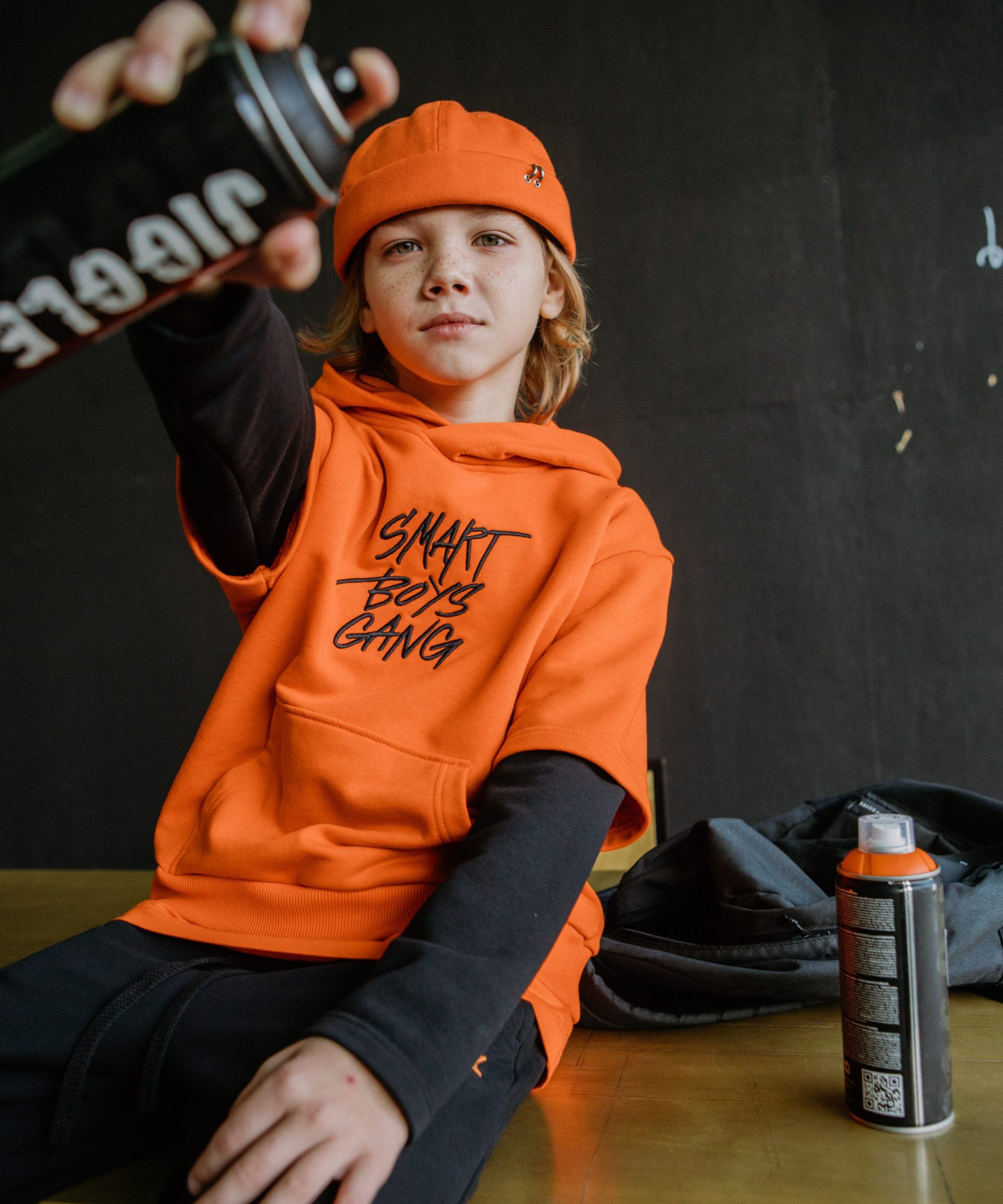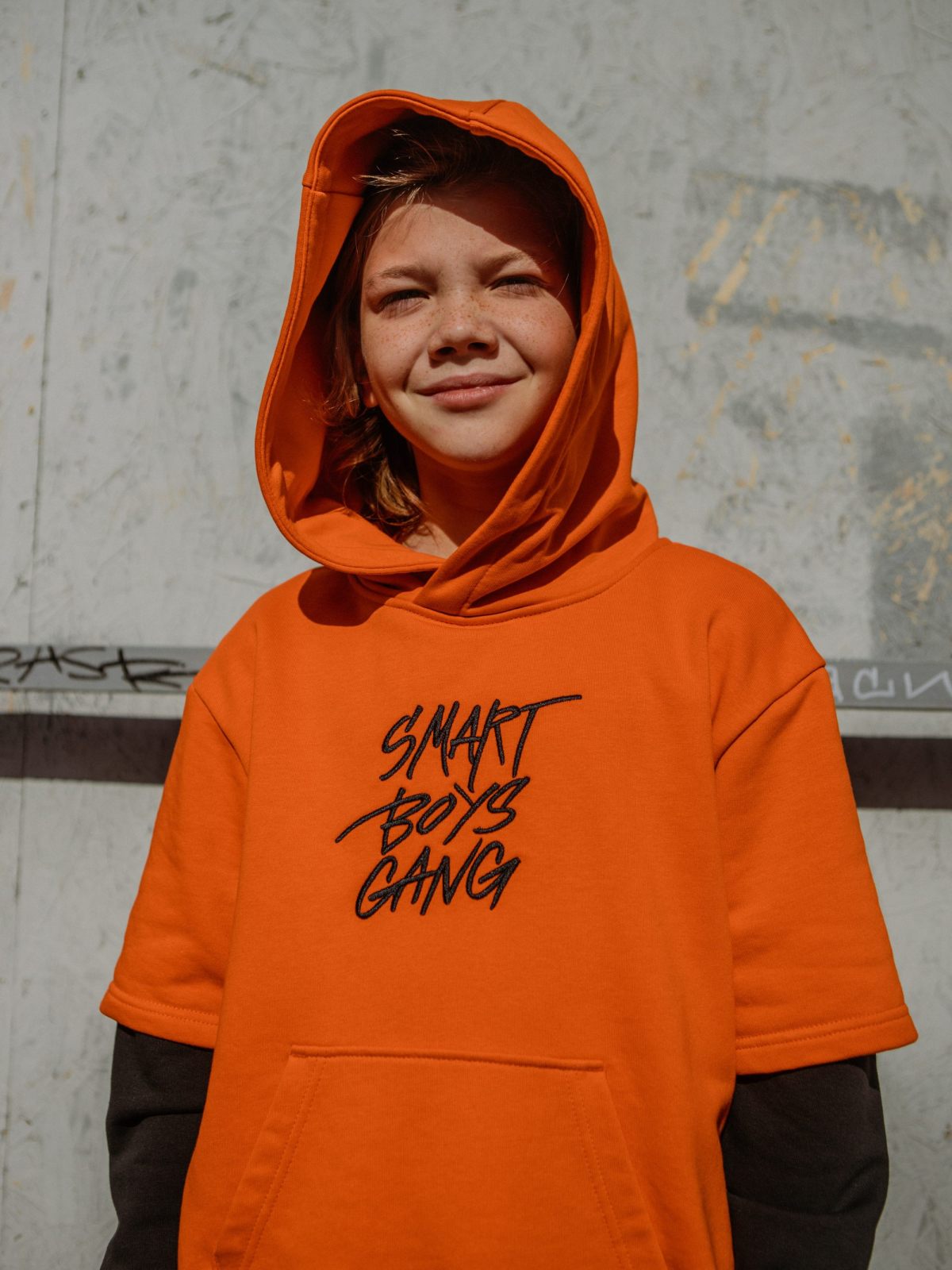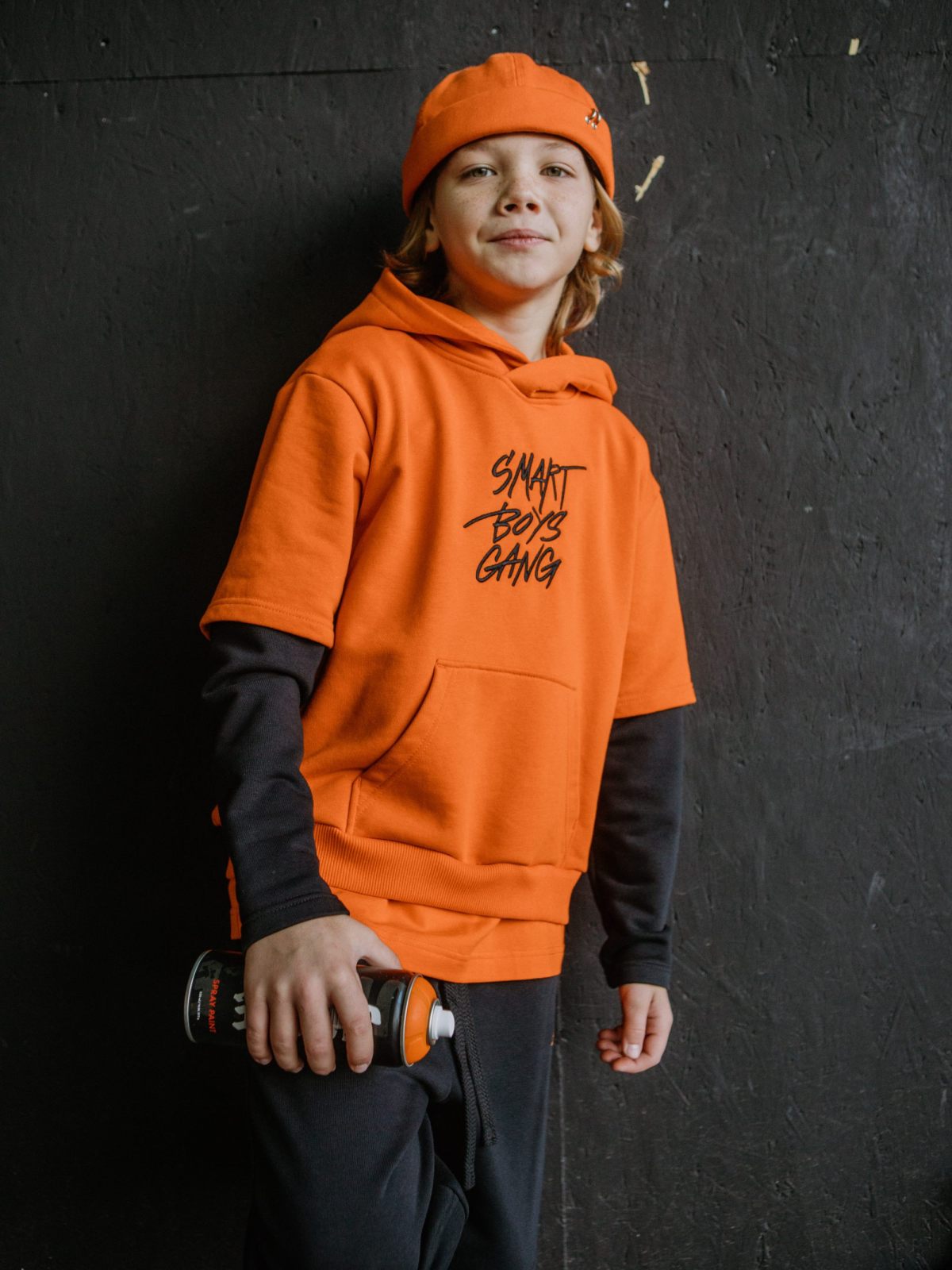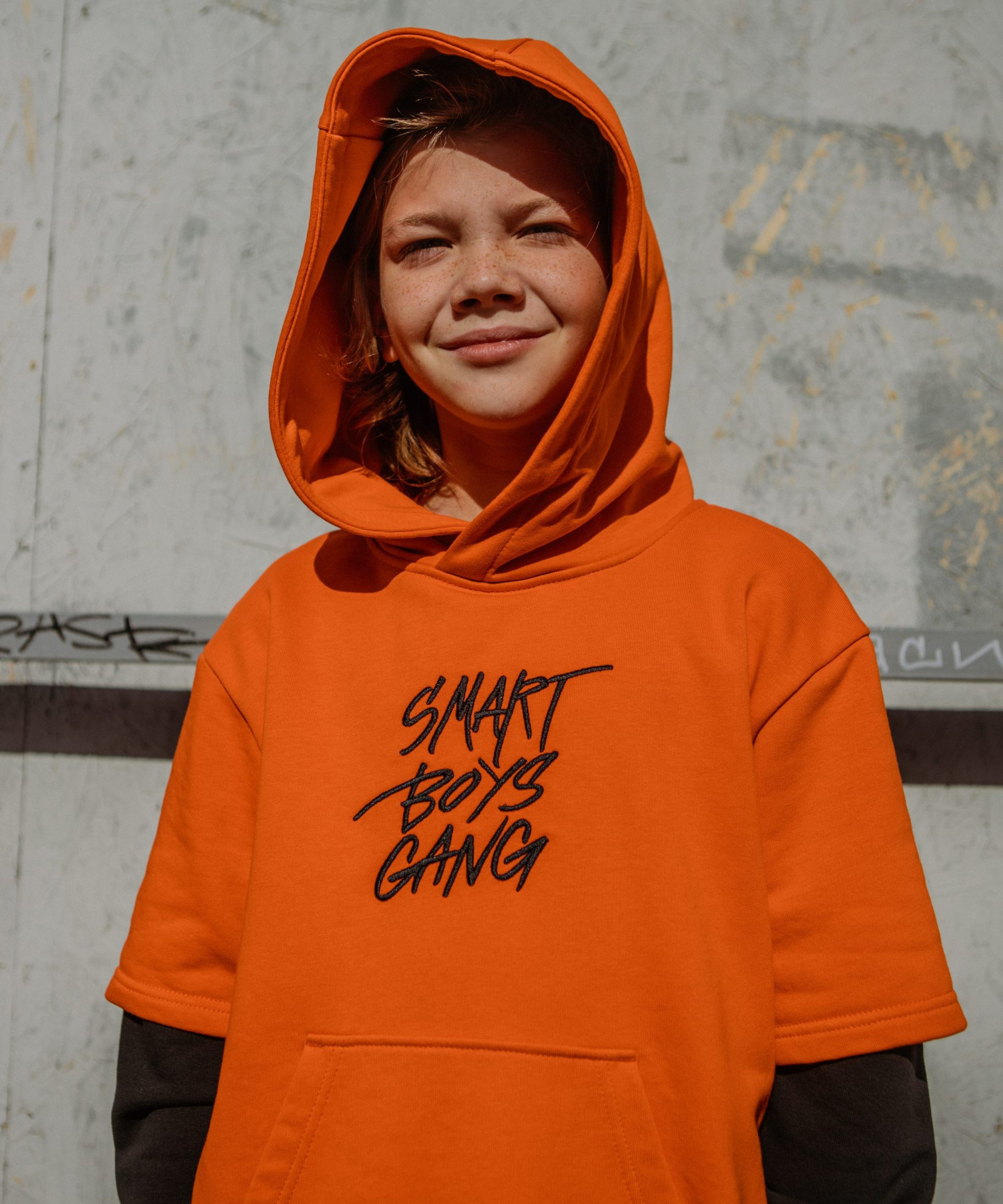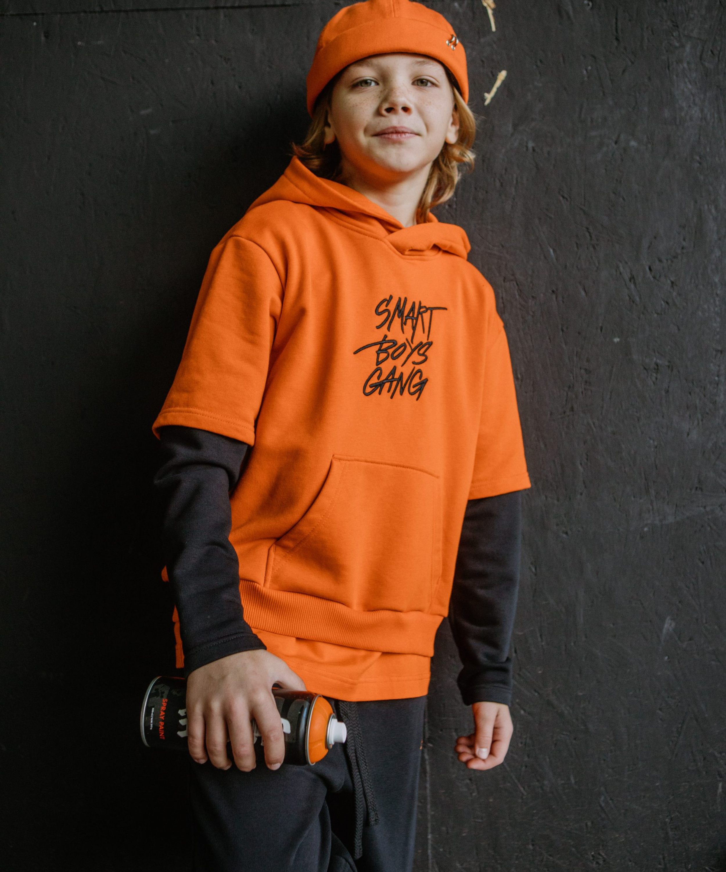 Детское худи прямого силуэта из коллекции SBG. Выполнен из материала, в составе которого 80% хлопка и 20% полиэстера, что обеспечивает отличную посадку и долговечность изделия. На груди расположена большая граффити-вышивка с названием коллекции "Smart Boys Gang" - стиль дерзости и бунтарства для целеустремленных парней! Карман-кенгуру, глубокий капюшон для защиты от непогоды, необычный двойной крой контрастных рукавов, яркий черно-оранжевый цвет - все что нужно для комфорта и запоминающегося образа.