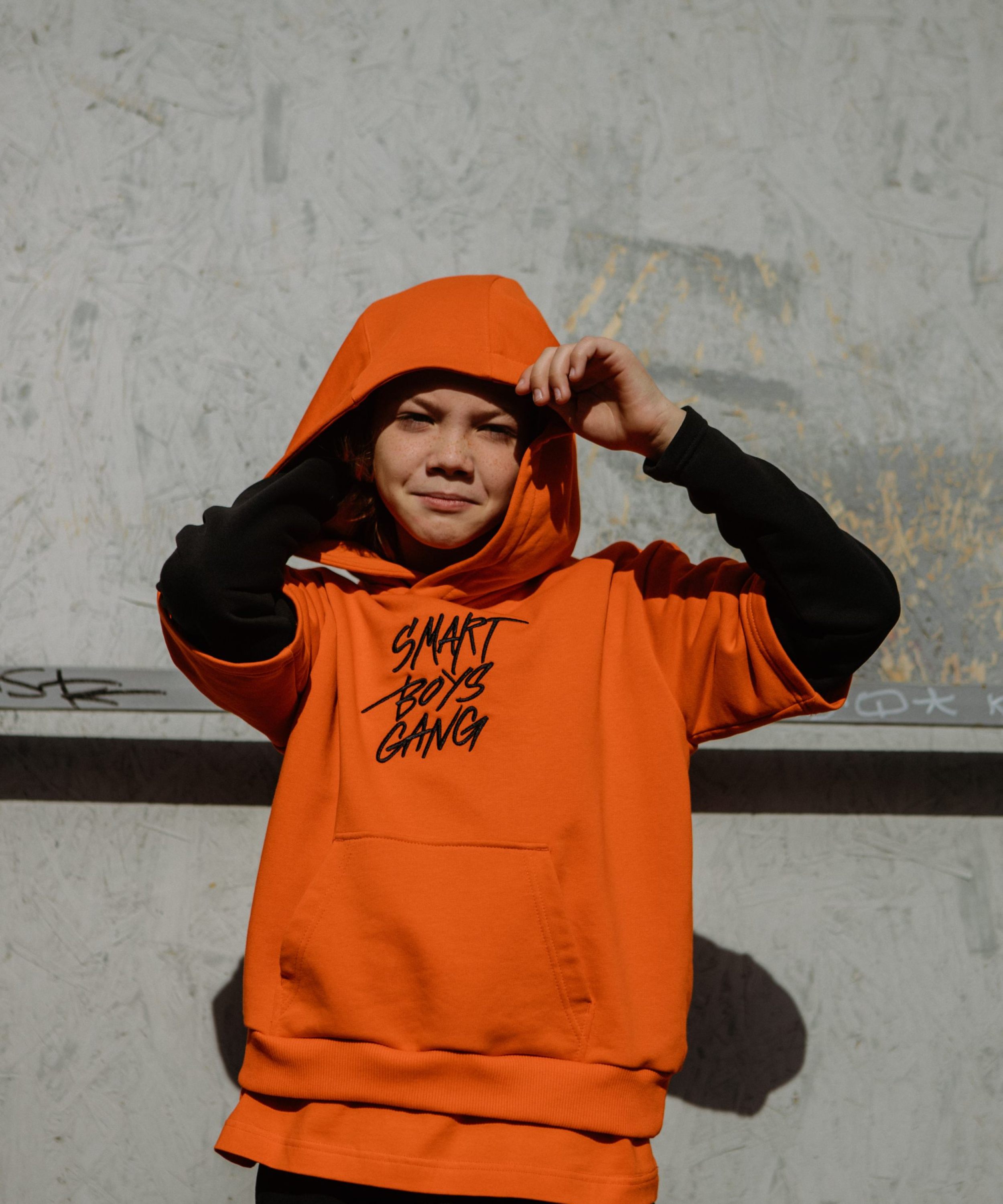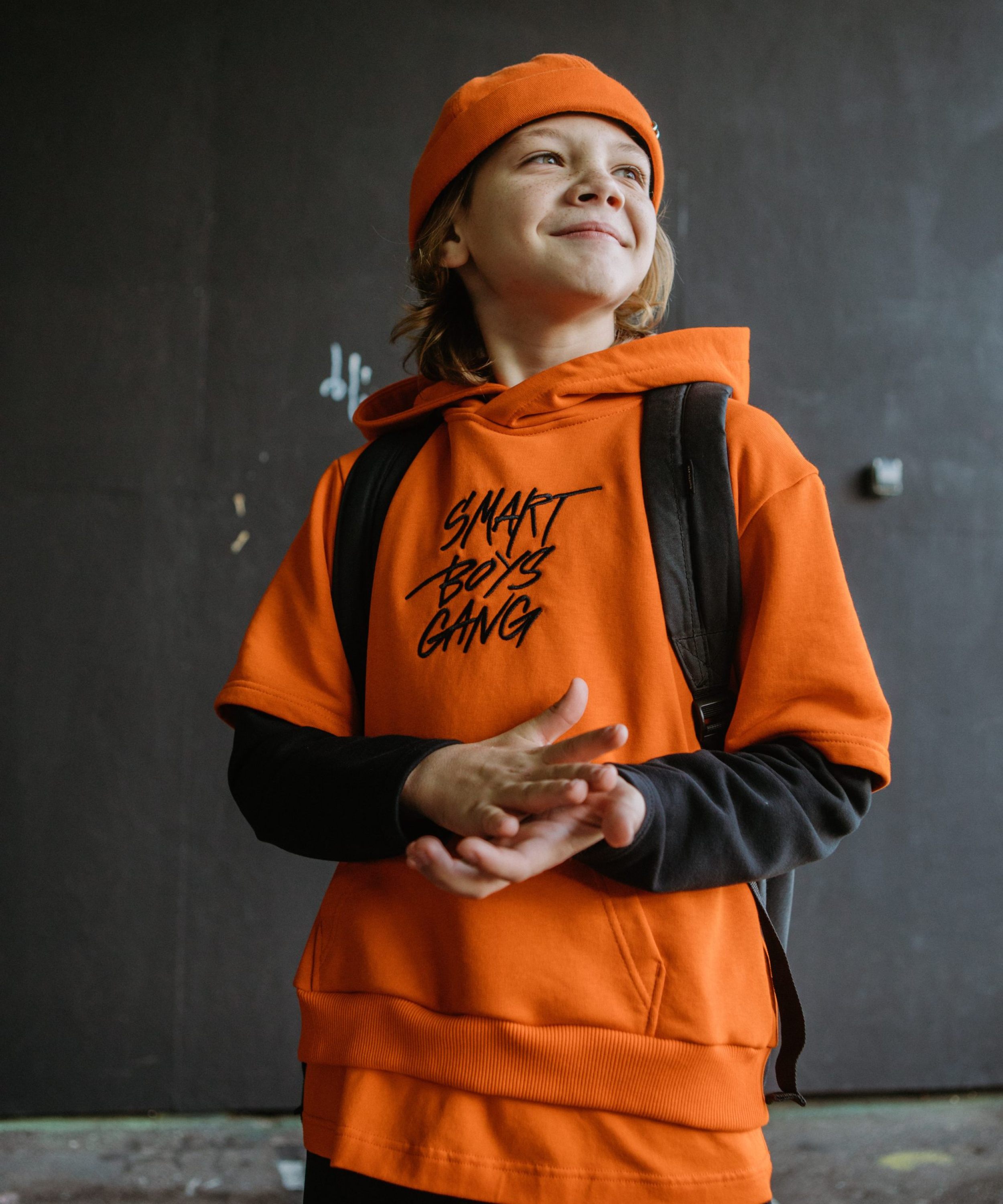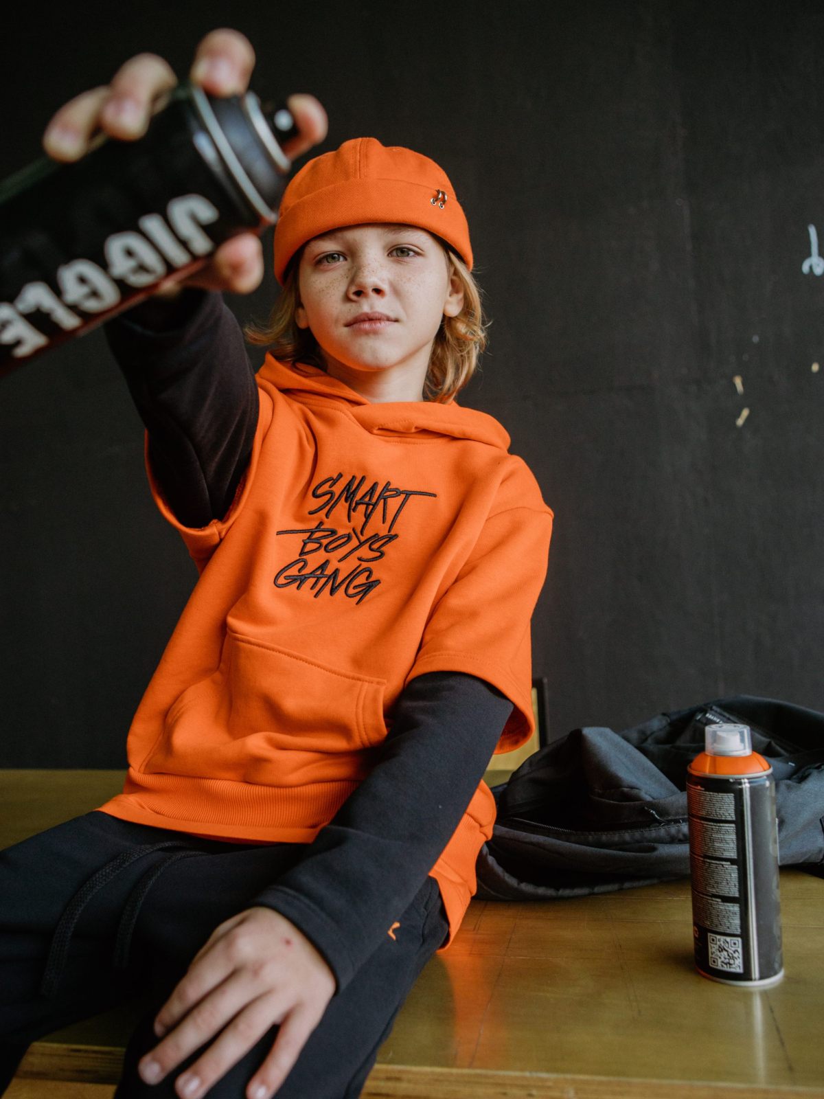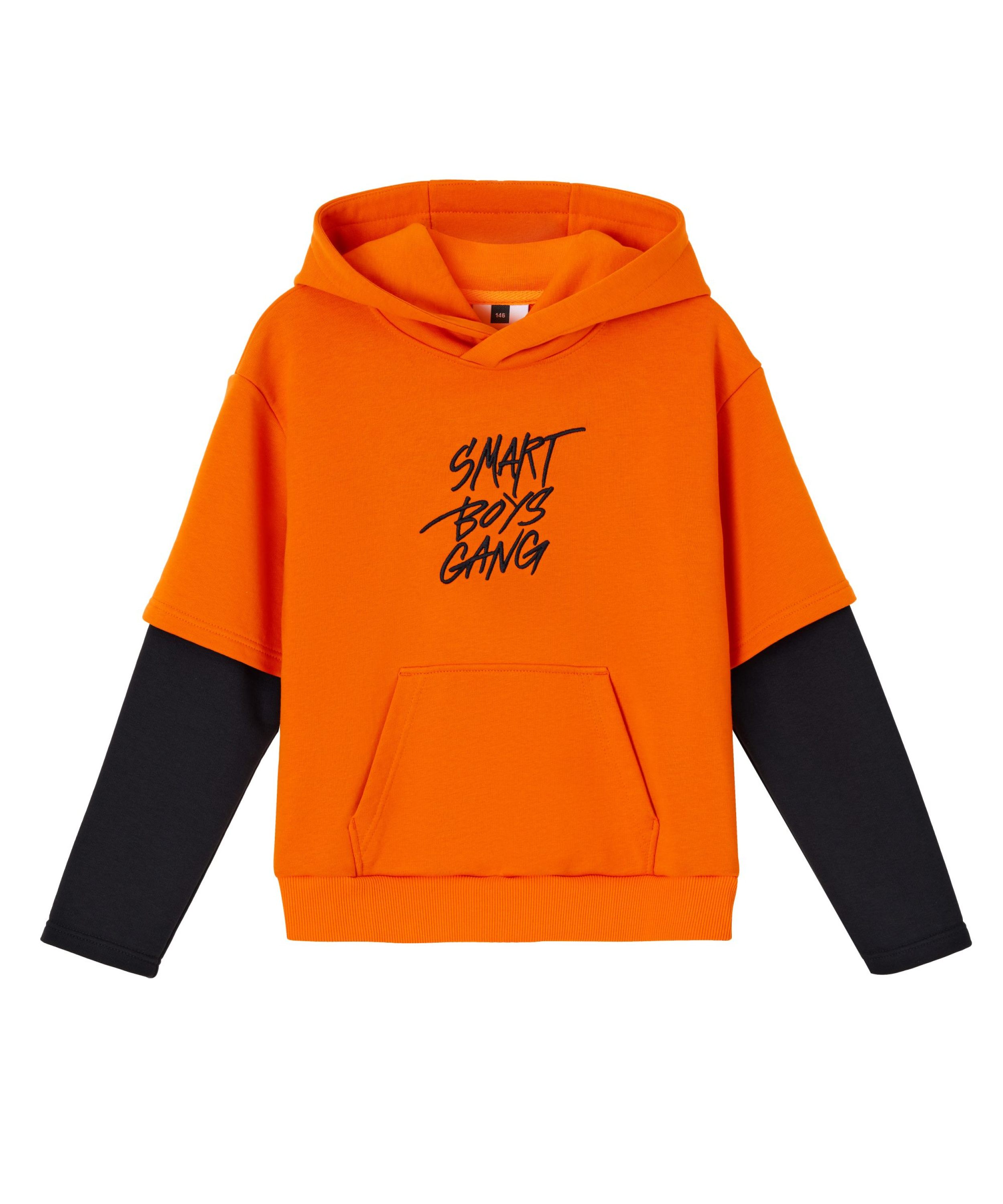 Детское худи прямого силуэта из коллекции SBG. Выполнен из материала, в составе которого 80% хлопка и 20% полиэстера, что обеспечивает отличную посадку и долговечность изделия. На груди расположена большая граффити-вышивка с названием коллекции "Smart Boys Gang" - стиль дерзости и бунтарства для целеустремленных парней! Карман-кенгуру, глубокий капюшон для защиты от непогоды, необычный двойной крой контрастных рукавов, яркий черно-оранжевый цвет - все что нужно для комфорта и запоминающегося образа.