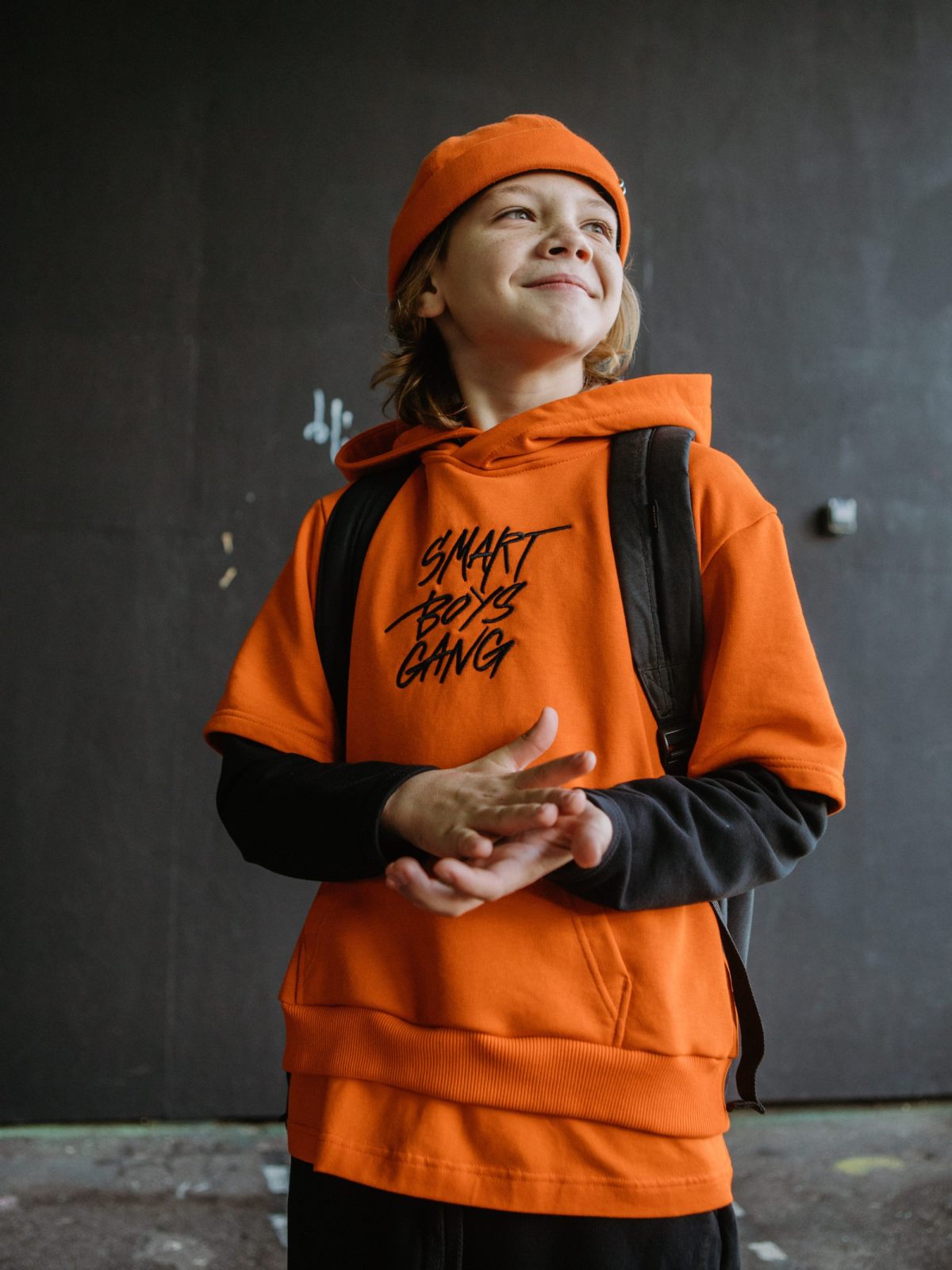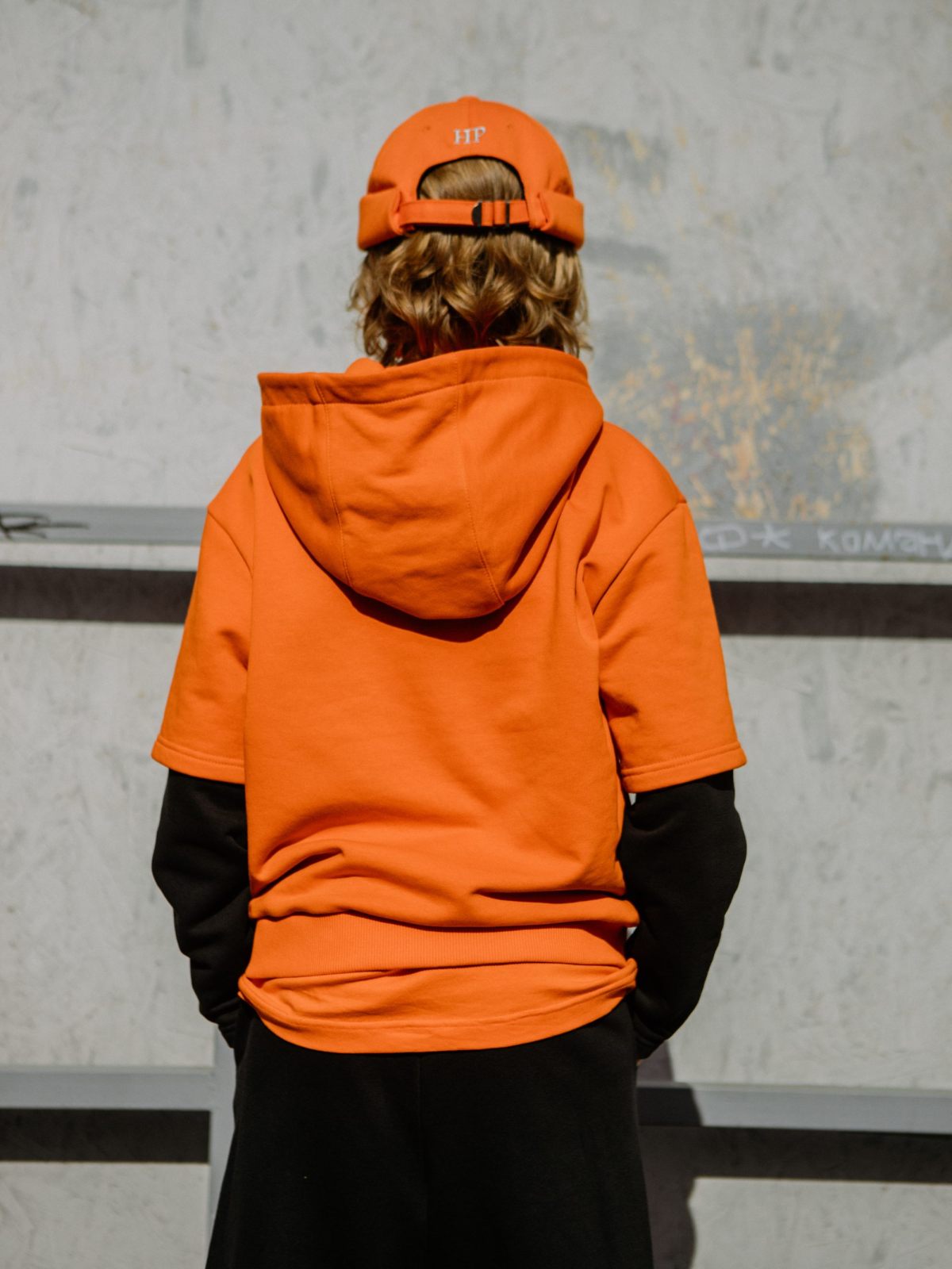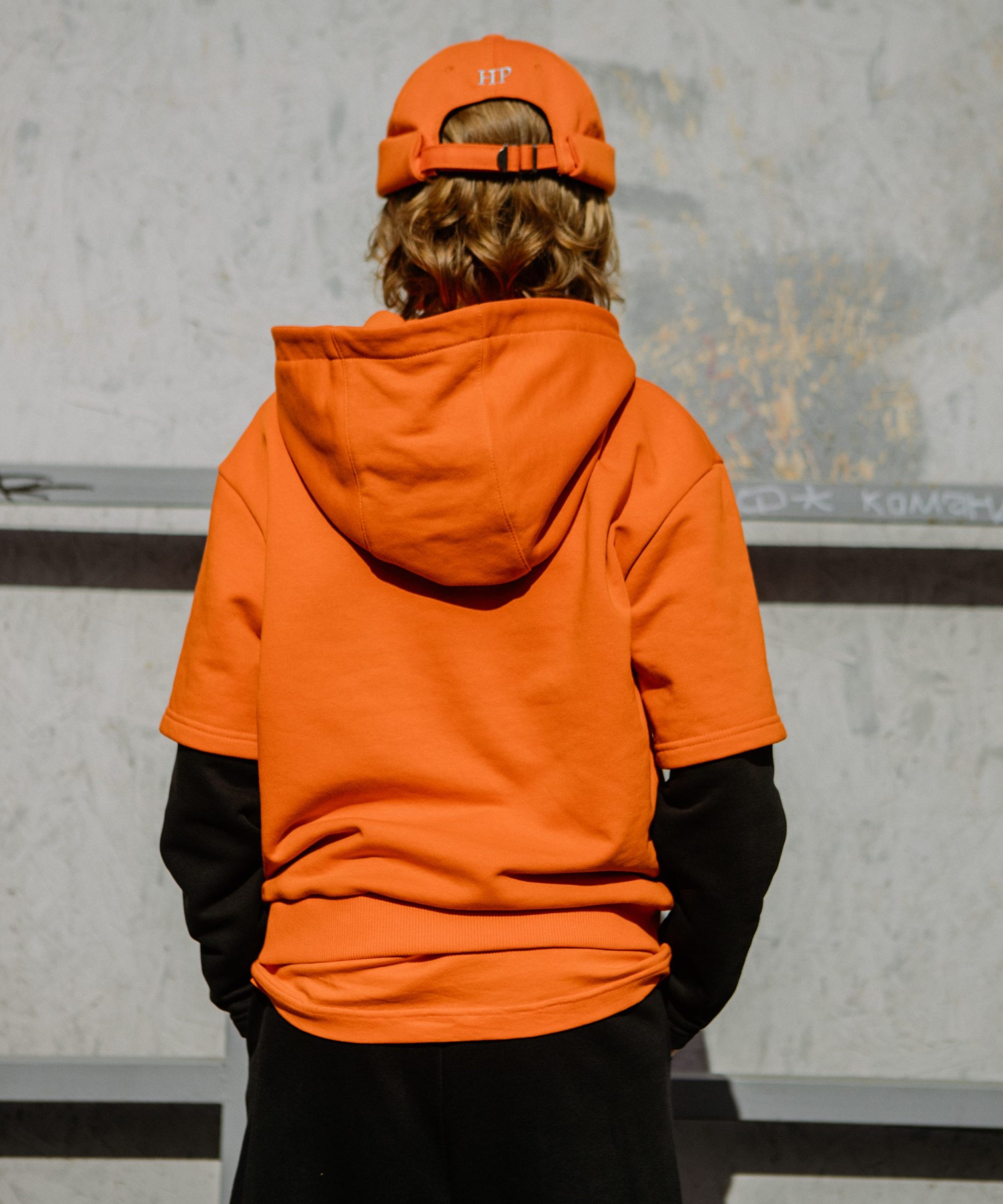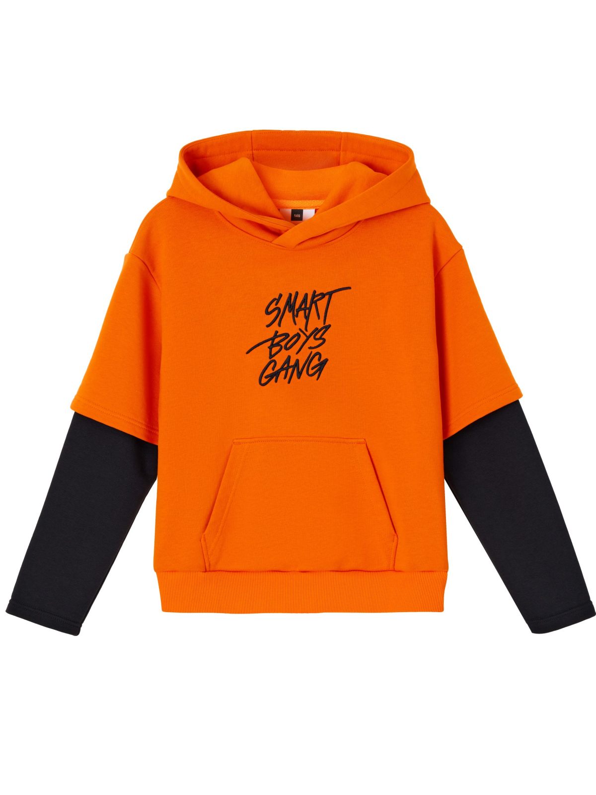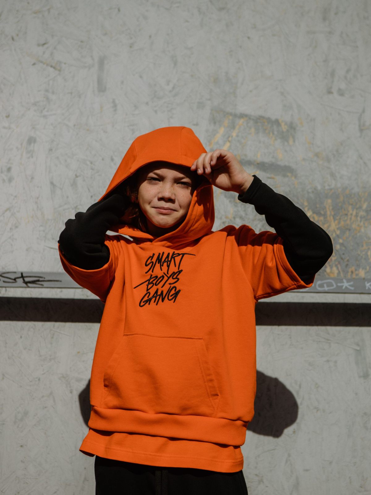Детское худи прямого силуэта из коллекции SBG. Выполнен из материала, в составе которого 80% хлопка и 20% полиэстера, что обеспечивает отличную посадку и долговечность изделия. На груди расположена большая граффити-вышивка с названием коллекции "Smart Boys Gang" - стиль дерзости и бунтарства для целеустремленных парней! Карман-кенгуру, глубокий капюшон для защиты от непогоды, необычный двойной крой контрастных рукавов, яркий черно-оранжевый цвет - все что нужно для комфорта и запоминающегося образа.