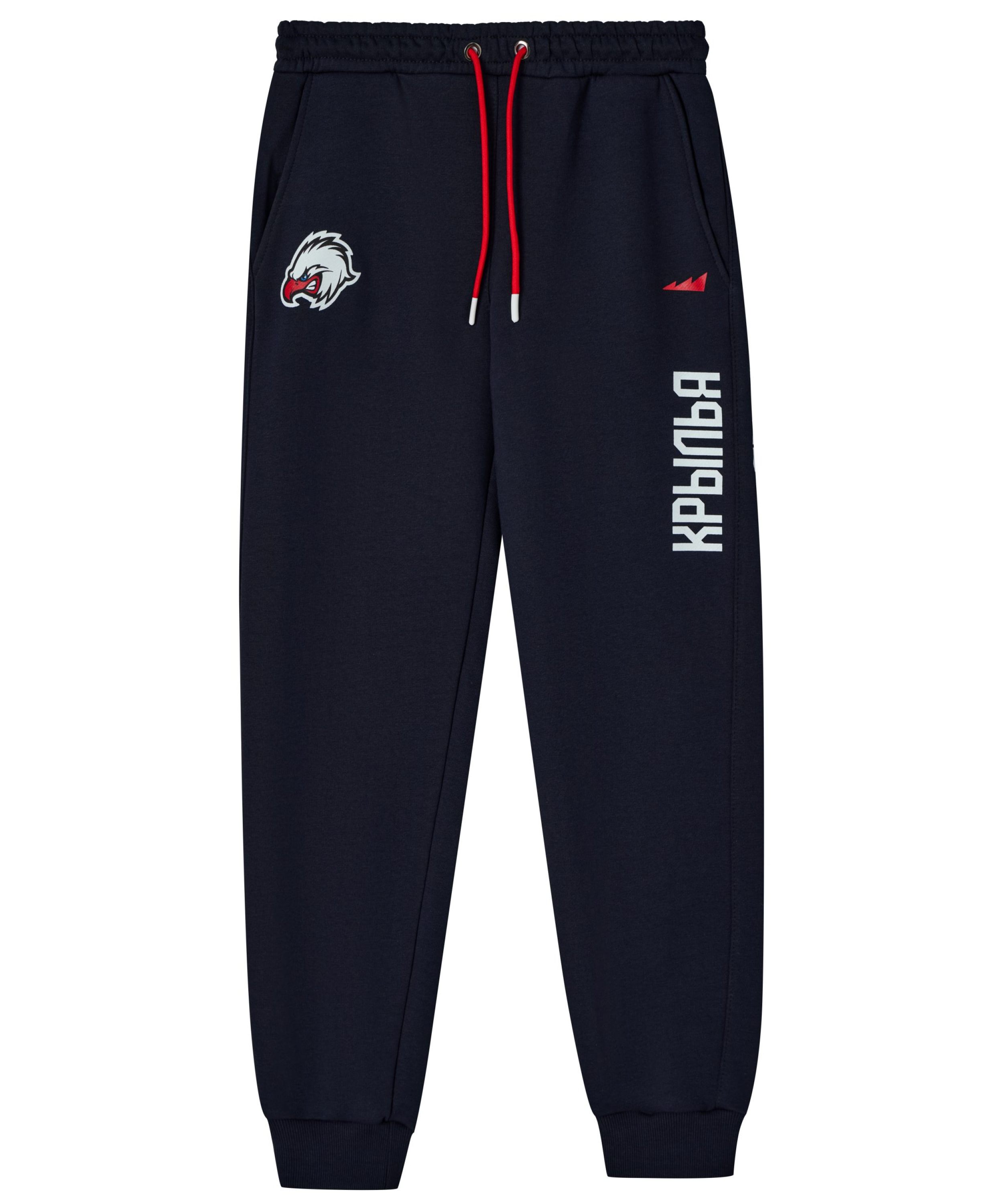 Детские брюки на манжетах прямого силуэта Regular лимитированной коллекции "Крылья Советов". Выполнены из материала, в составе которого 85% хлопка и 15% полиэстера, что обеспечивает отличную посадку и долговечность изделия. Эластичный контрастный шнур в поясе помогает регулировать посадку. На правой ноге расположен стильный принт - эмблема легендарного хоккейного клуба, на левой - принт-логотип и надпись-акцент. Модель представлена в базовом темно-синем цвете. Качество и стиль для настоящих фанатов!