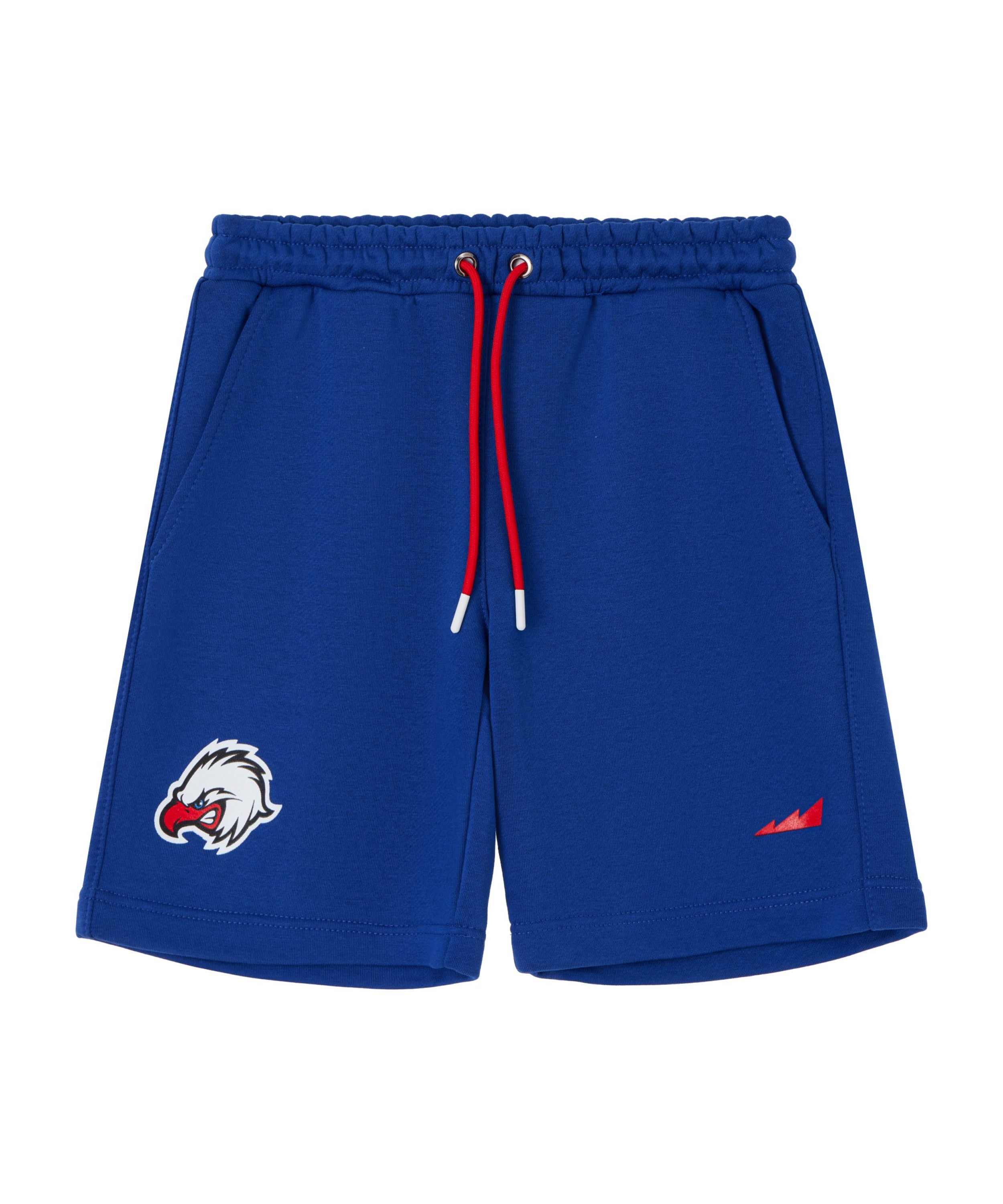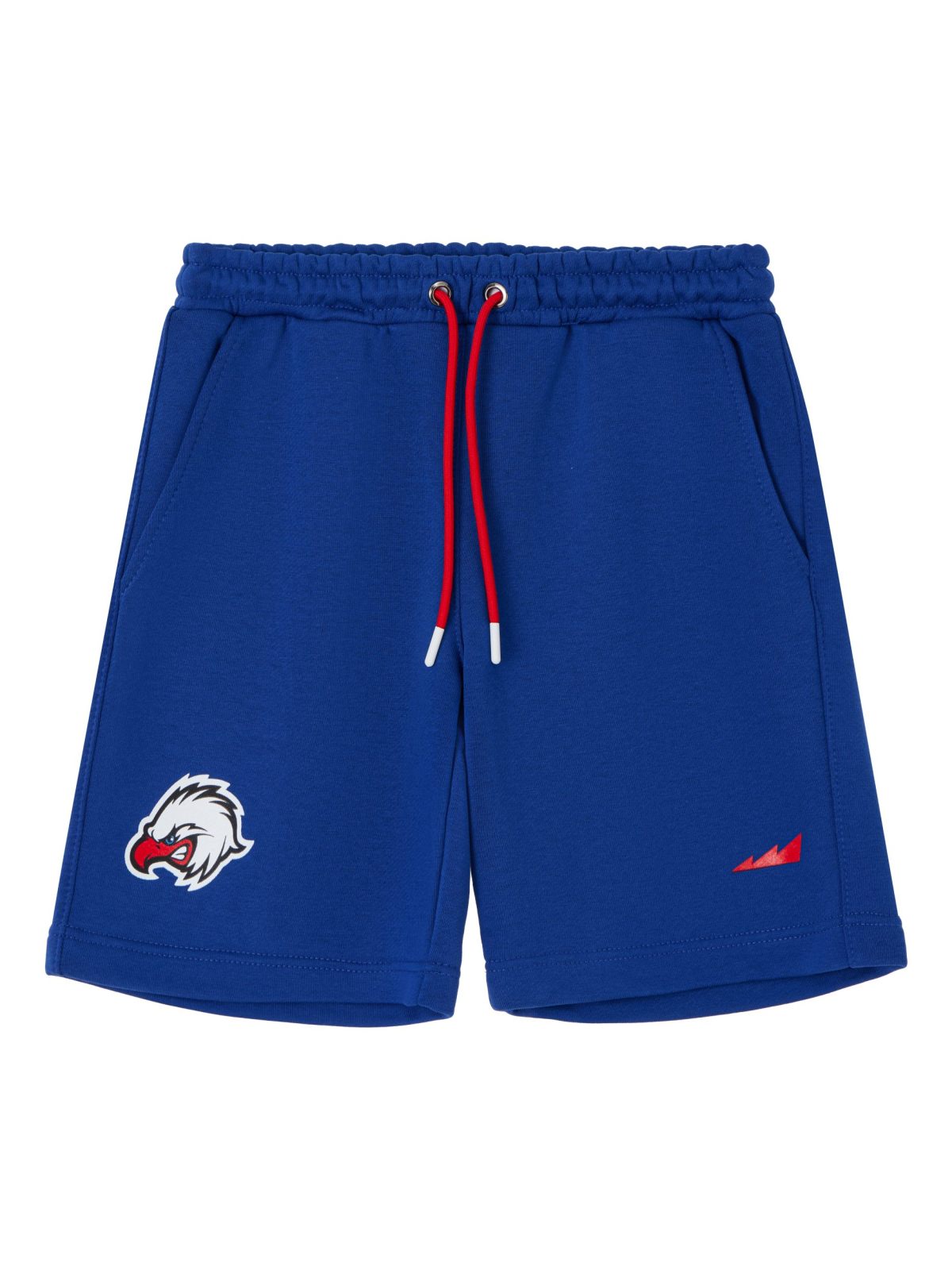 Детские шорты прямого силуэта Regular лимитированной коллекции "Крылья Советов". Выполнены из материала, в составе которого 70% хлопка и 30% полиэстера, что обеспечивает отличную посадку и долговечность изделия. Эластичный шнур в поясе помогает регулировать посадку. На правой ноге расположен стильный принт - эмблема легендарного хоккейного клуба, на левой - принт-логотип. Модель представлена в трендовом синем цвете. Качество и стиль для настоящих фанатов!