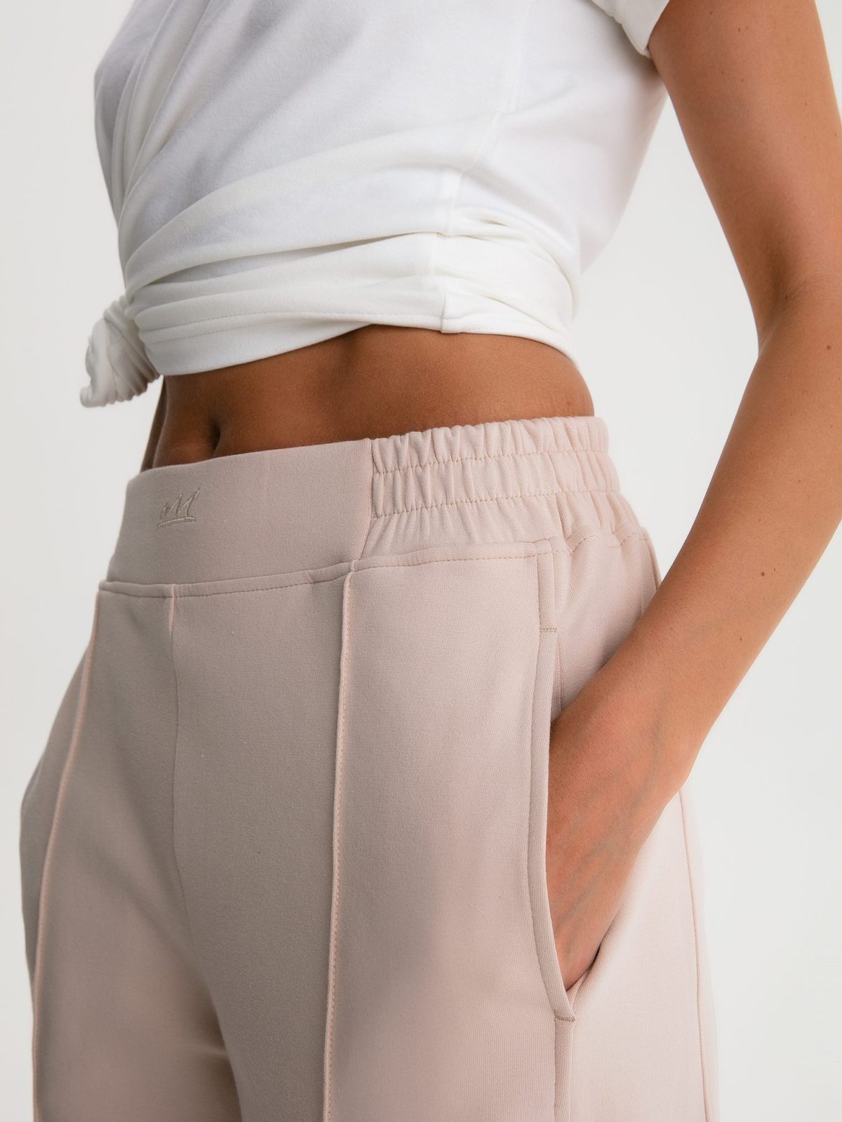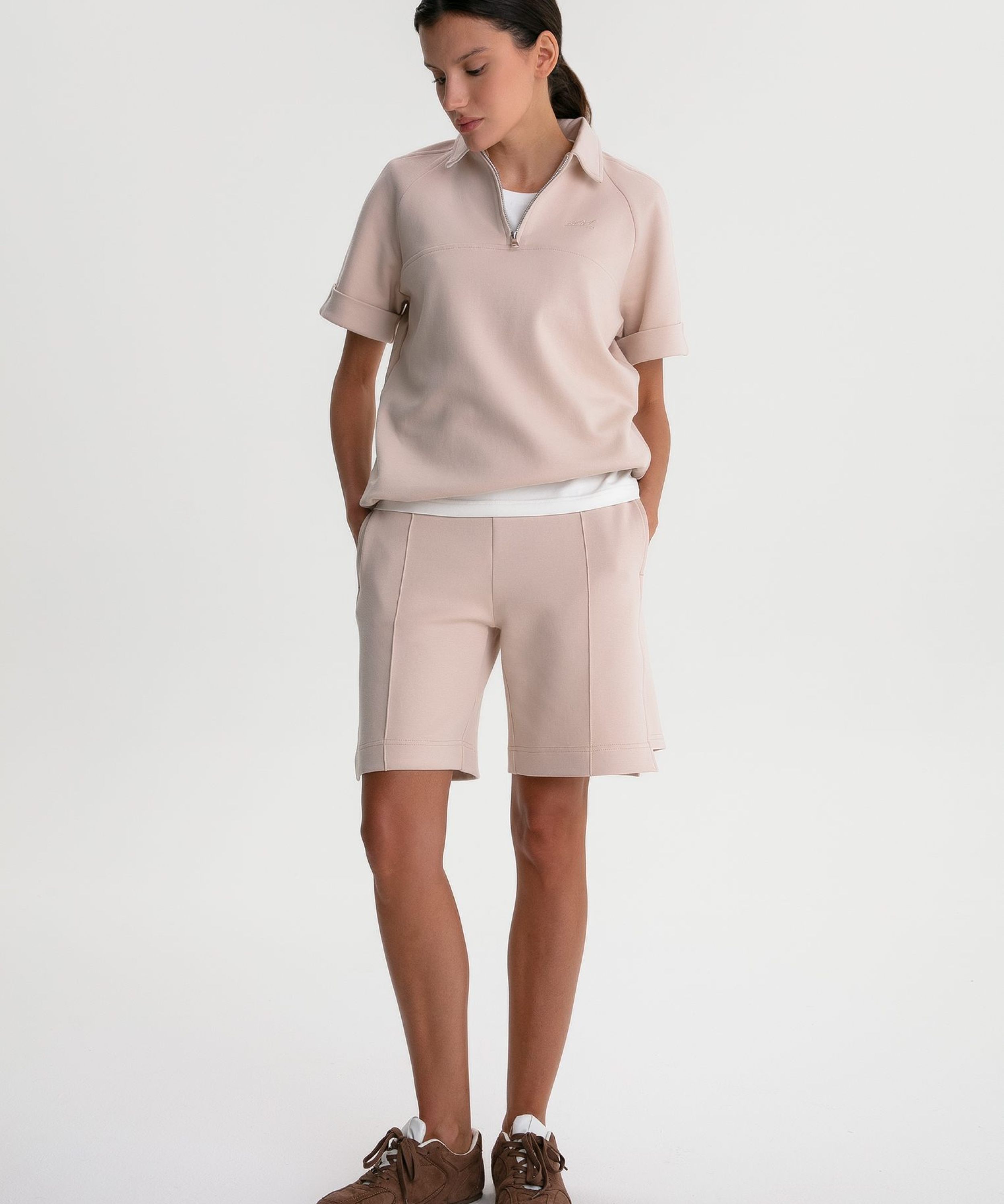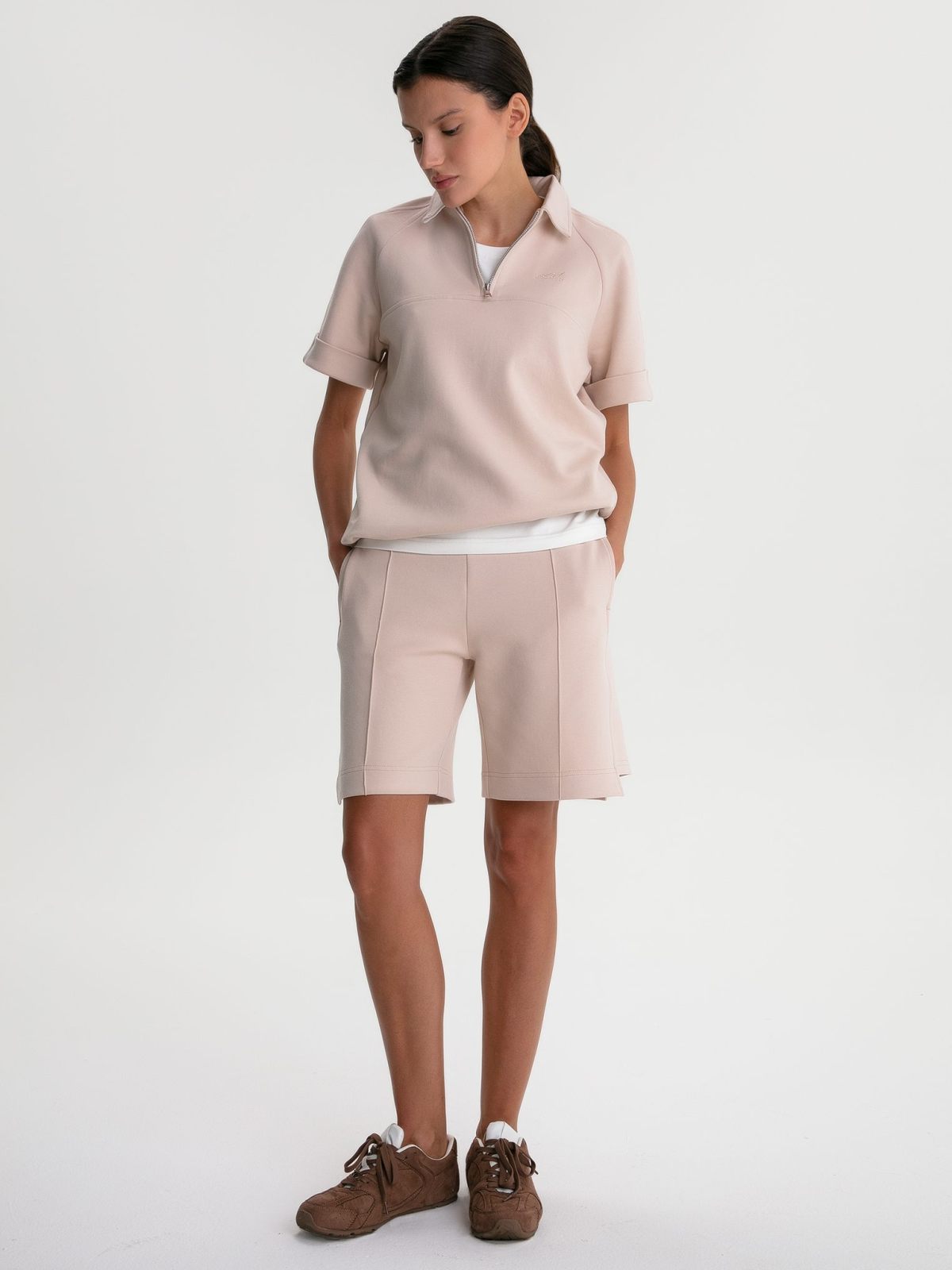 Шорты со стрелками в классическом стиле из коллеции Pure выполнены из материала скуба, в состав которого входит 76% хлопока 19% полиэстера 5% лайкры, за счет чего шорты отлично держат форму и долговечны в носке. Благодаря большой доле хлопка в изделии, данная скуба является гипоаллергенной. Посадка шорт - средняя. По бокам имеются небольшие разрезы, что делает силуэт более женственным и игривым. Шорты имеют два боковых кармана. На поясе расположена тональная вышивка с логотипом бренда. В ассортименте к шортам представлен джемпер W4PR32-BGE. Костюм отлично подойдет для летнего образа в спортивном стиле, но так же хорошо сочетается с белой рубашкой.