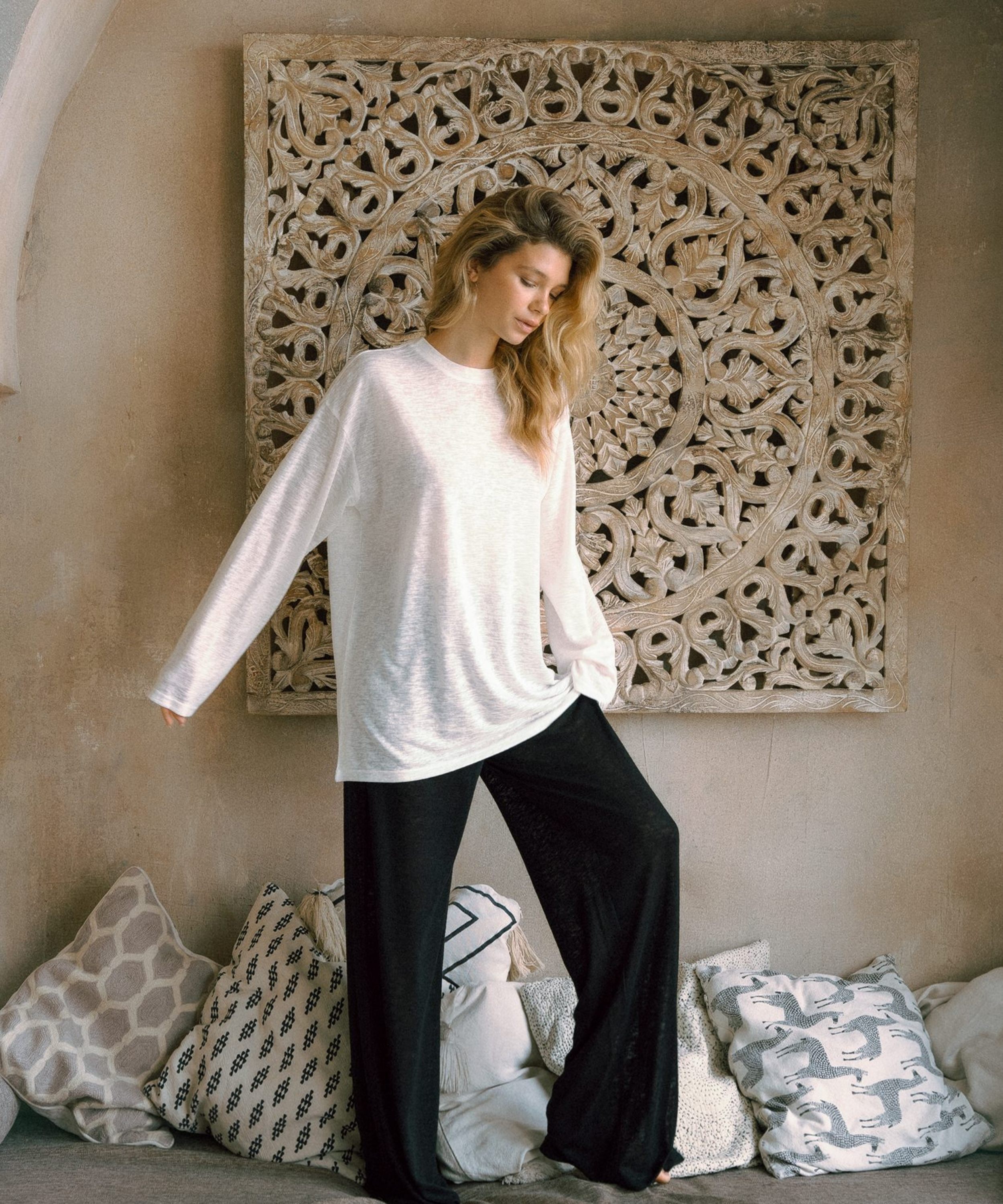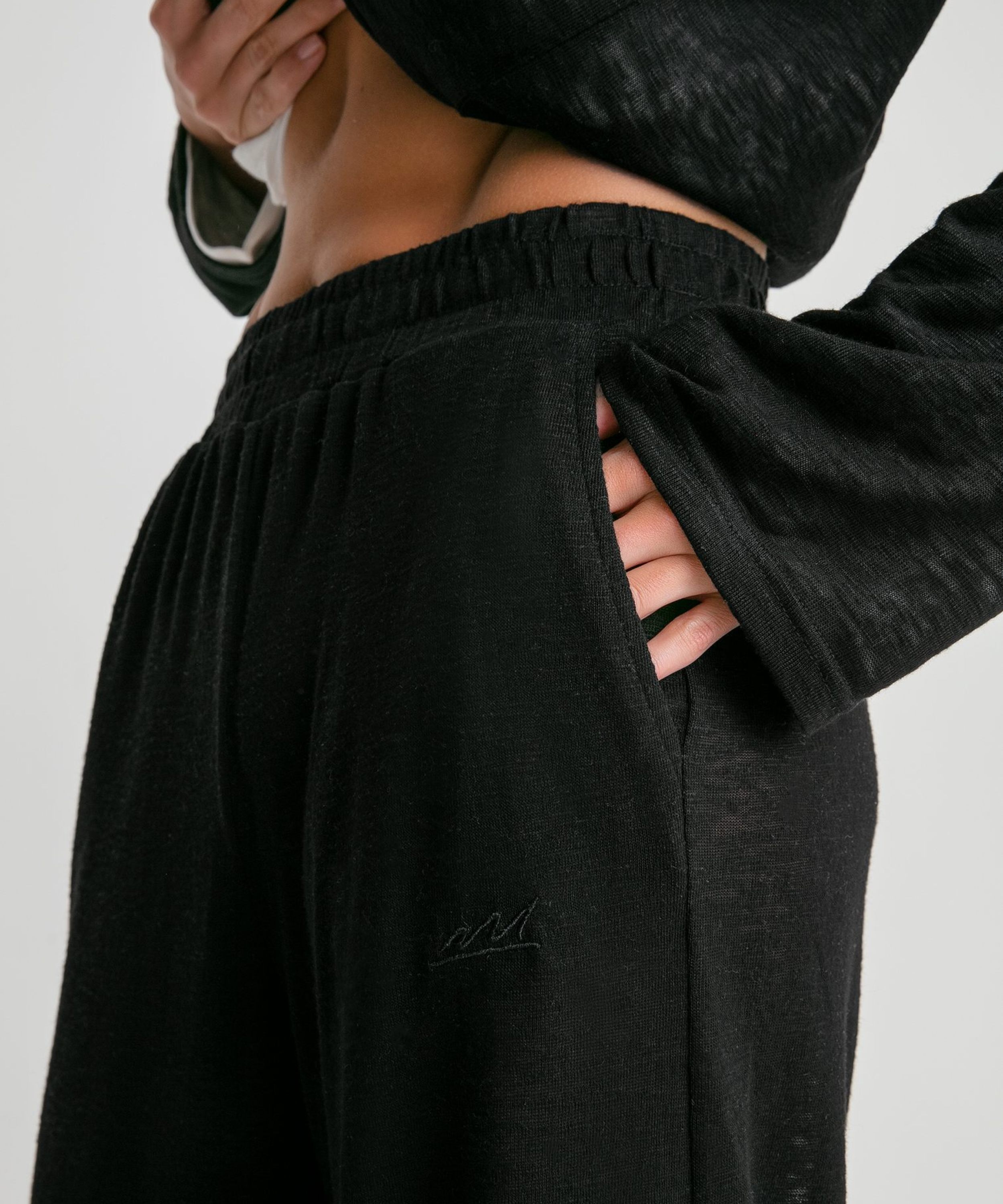 Женские широкие полупрозрачные брюки из коллекции Softwear выполнены из материала, в составе которого 65% вискозы 35% полиэстра. Брюки невероятно комфортные и приятные к телу. Легкий струящийся материал отлично подойдет на жаркую летнюю погоду. Эластичный пояс на резинке обеспечивает отличную посадку. Брюки имеют два боковых кармана. На левой ноге расположена тональная вышивка с логотипом бренда. В ассортименте к брюкам представлен лонгслив W4SFW411-BLK. Комплект отлично подходит для пляжных и повседневных летних образов.