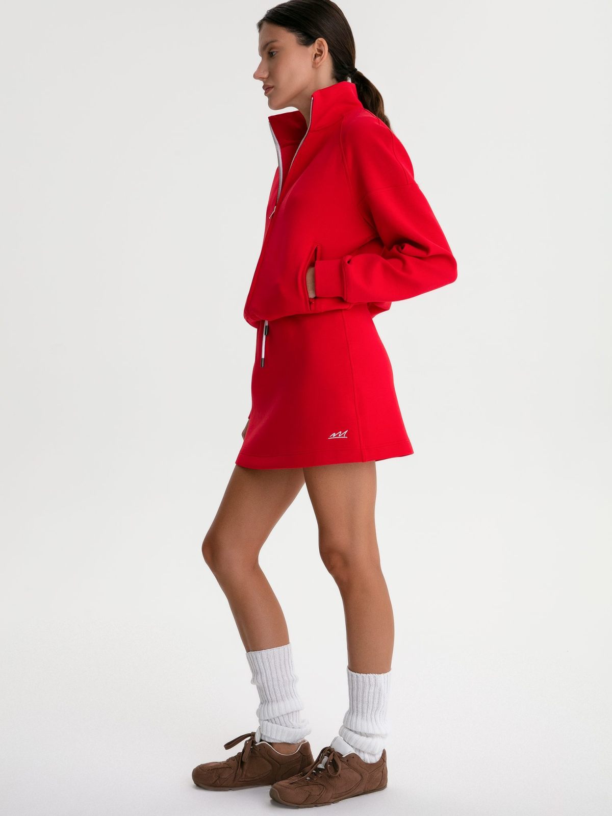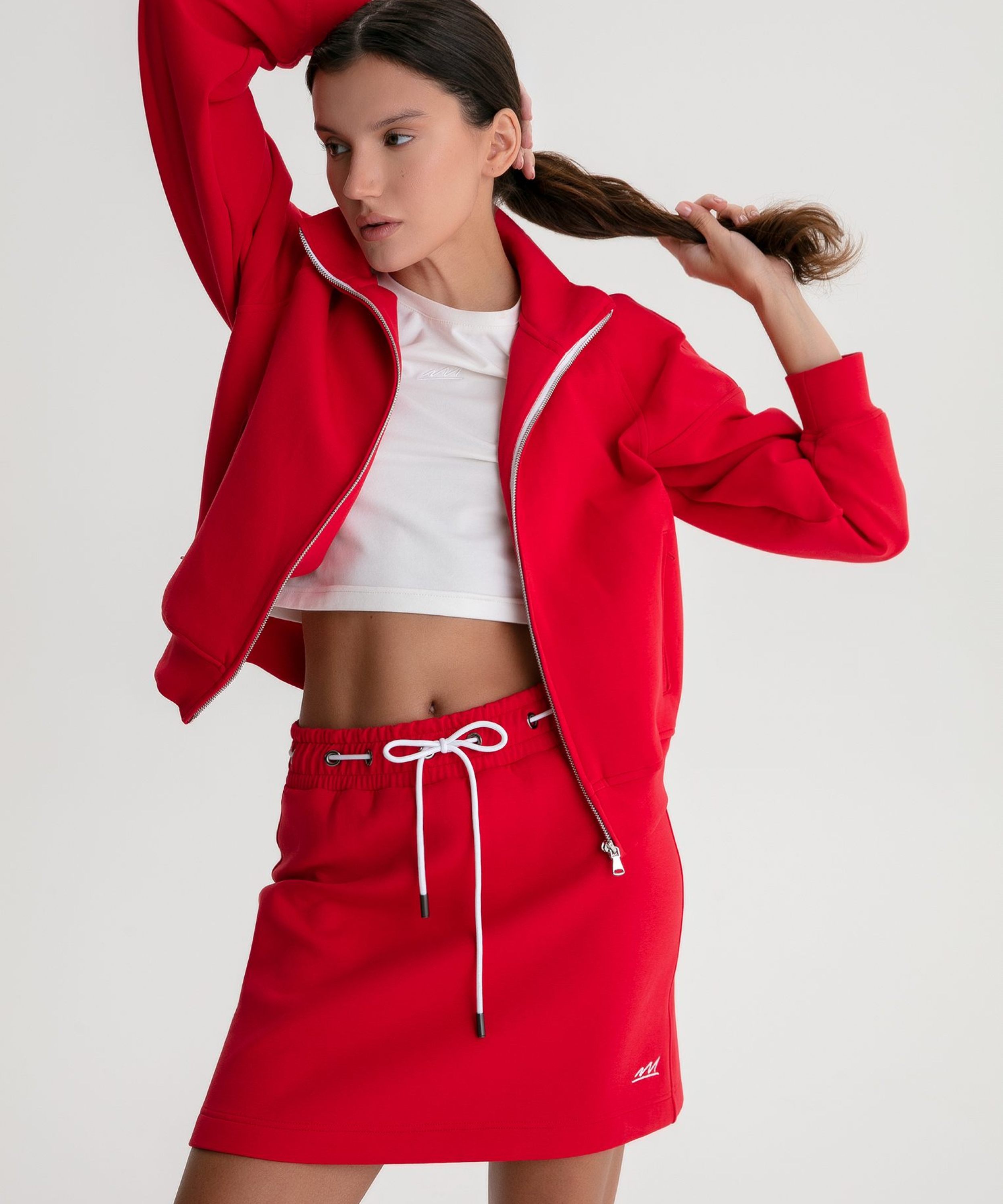 Укороченная юбка из коллекции Pure выполнена из материала скуба, в состав которого входит 82% хлопка, 12% полиэстера, 6% эластана, за счет чего юбка отлично держит форму и долговечная в носке. Благодаря большой доле хлопка в изделии, данная скуба является гипоаллергенной. Ключевым элементом модели является контрасный шнурок в поясе, который не только регулирует посадку, но и является интересной декоративной деталью. Слева расположена контрастная вышивка с логотипом бренда. В ассортименте к юбке представлен джемпер W4PR31-RED и худи W4PR34-RED. Трендовый яркий костюм на лето.
