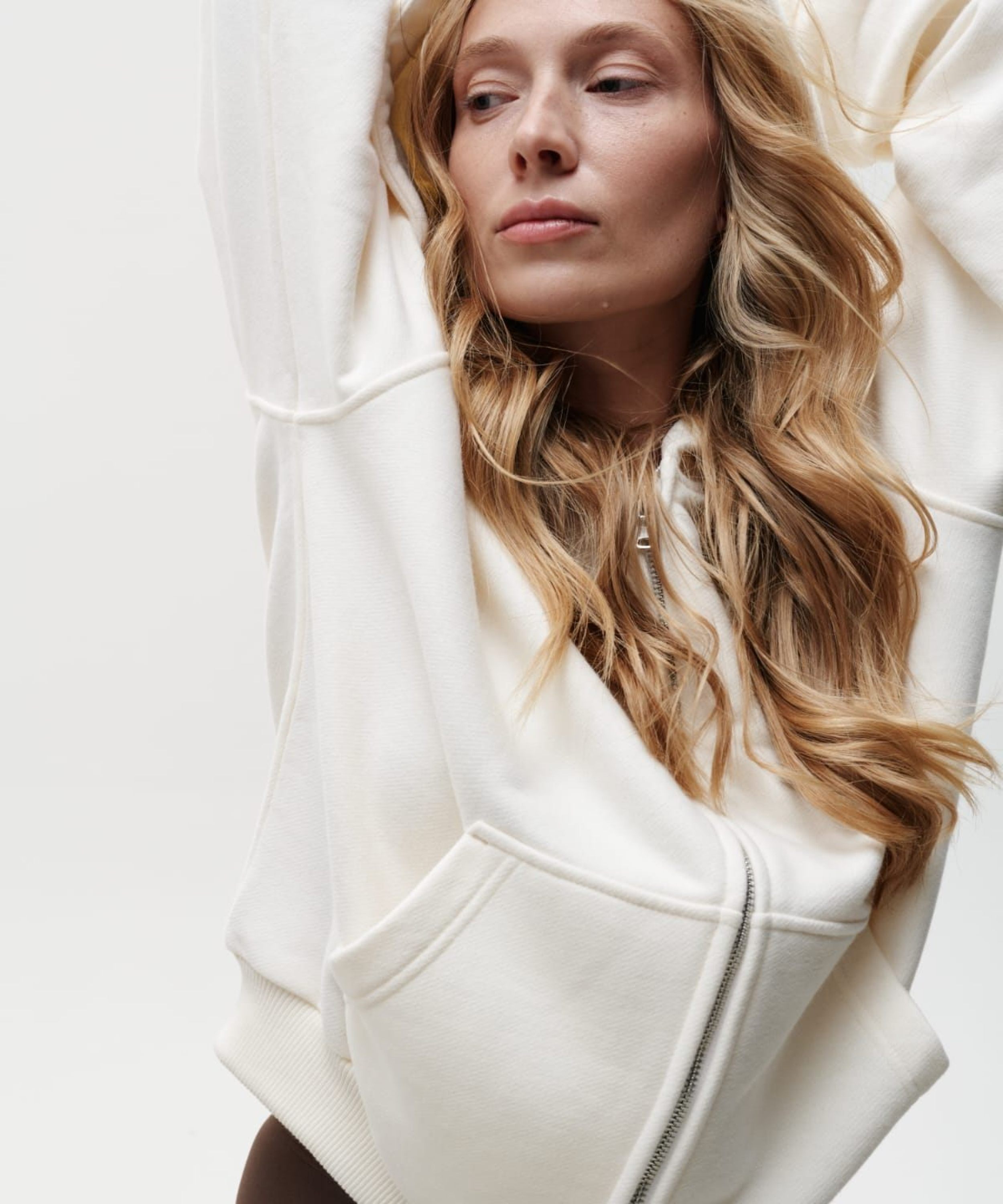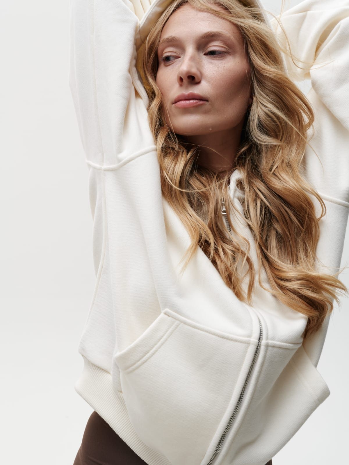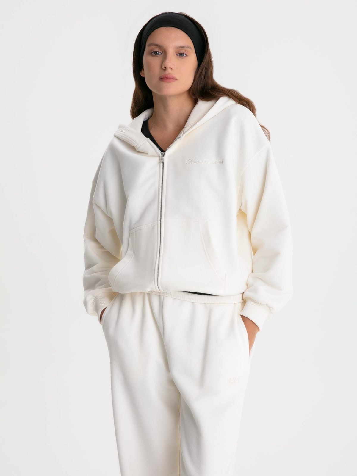 Худи "Ева" на молнии свободного кроя из коллекции Classic выполнено из материала с эффектом peach, в состав которого входит 90% хлопка 10% полиэстра, за счет чего худи отлично держит форму и долговечно в носке. Материал невероятно мягкий и приятный на ощупь. Худи имеет два боковых кармана, вышивку с логотипом бренда на капюшоне и вышивку со слоганом коллекции "From AM to PM" на груди слева. В ассортименте к худи представлены брюки "Ева" W5CLP83-ECR. Уютный мягкий костюм на прохладную летнюю погоду. |