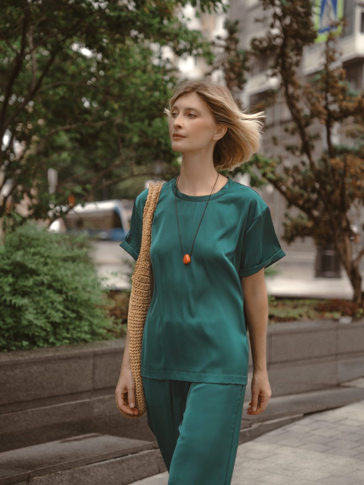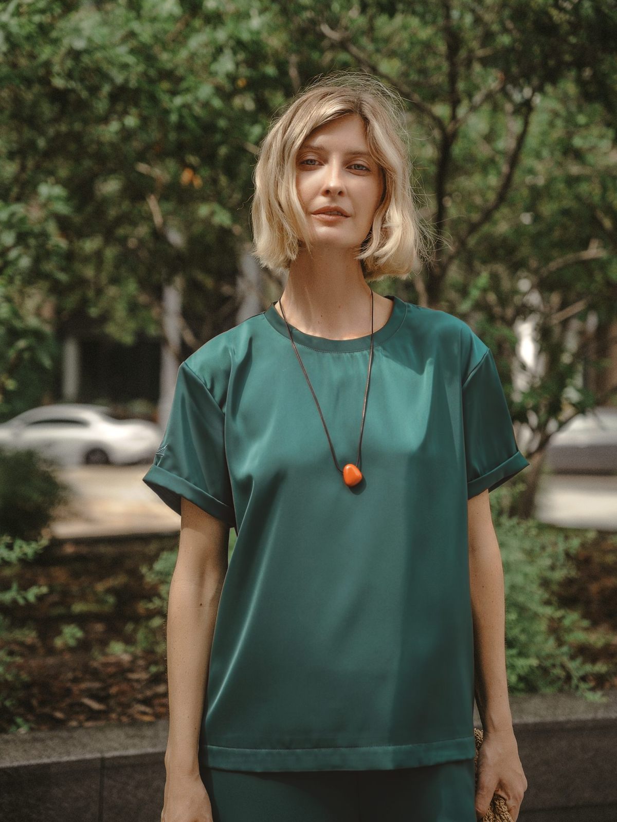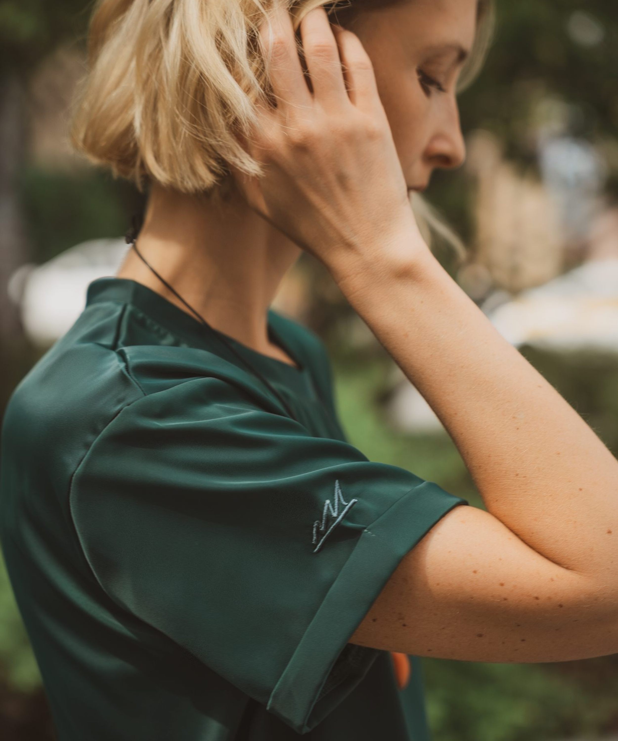 Легкая блузка с эффектом шелка из коллекции Gardenika. Материал очень приятный к телу и имеет эффект охлаждения. На правом рукаве расположена лаконичная тональная вышивка с логотипом бренда. К блузке в ассортименте представлены брюки W3GN84.