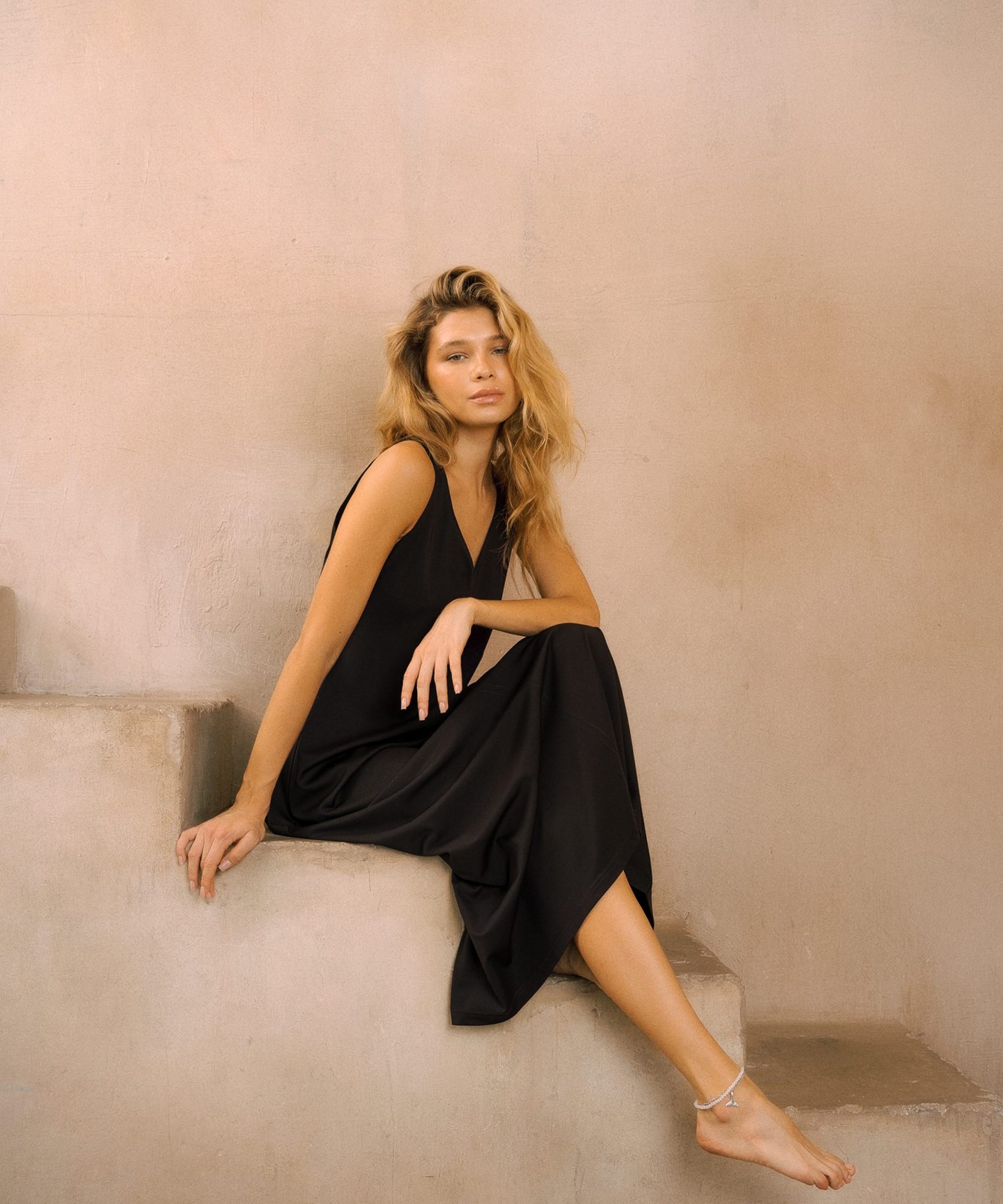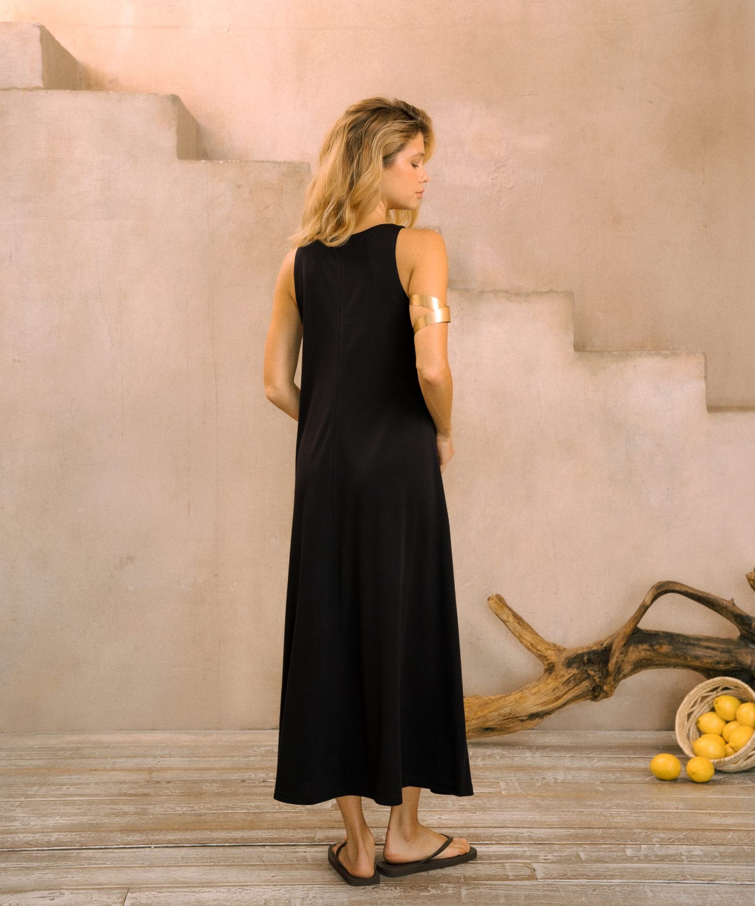 Платье-макси "Ветер" свободного кроя из коллекции Pure выполнено из материала, в составе которого 60% вискозы, 31% нейлона и 9% спандекса. Материал легкий, приятный к телу, отлично подходит на летнюю погоду. V-вырез и широкие лямки отлично подчеркивают плечи и зону декольте. Крой платья расширяется от талии к низу, что делает юбку летящей. Хорошо сочетается как с кардиганами, так и с толстовками и джемперами.