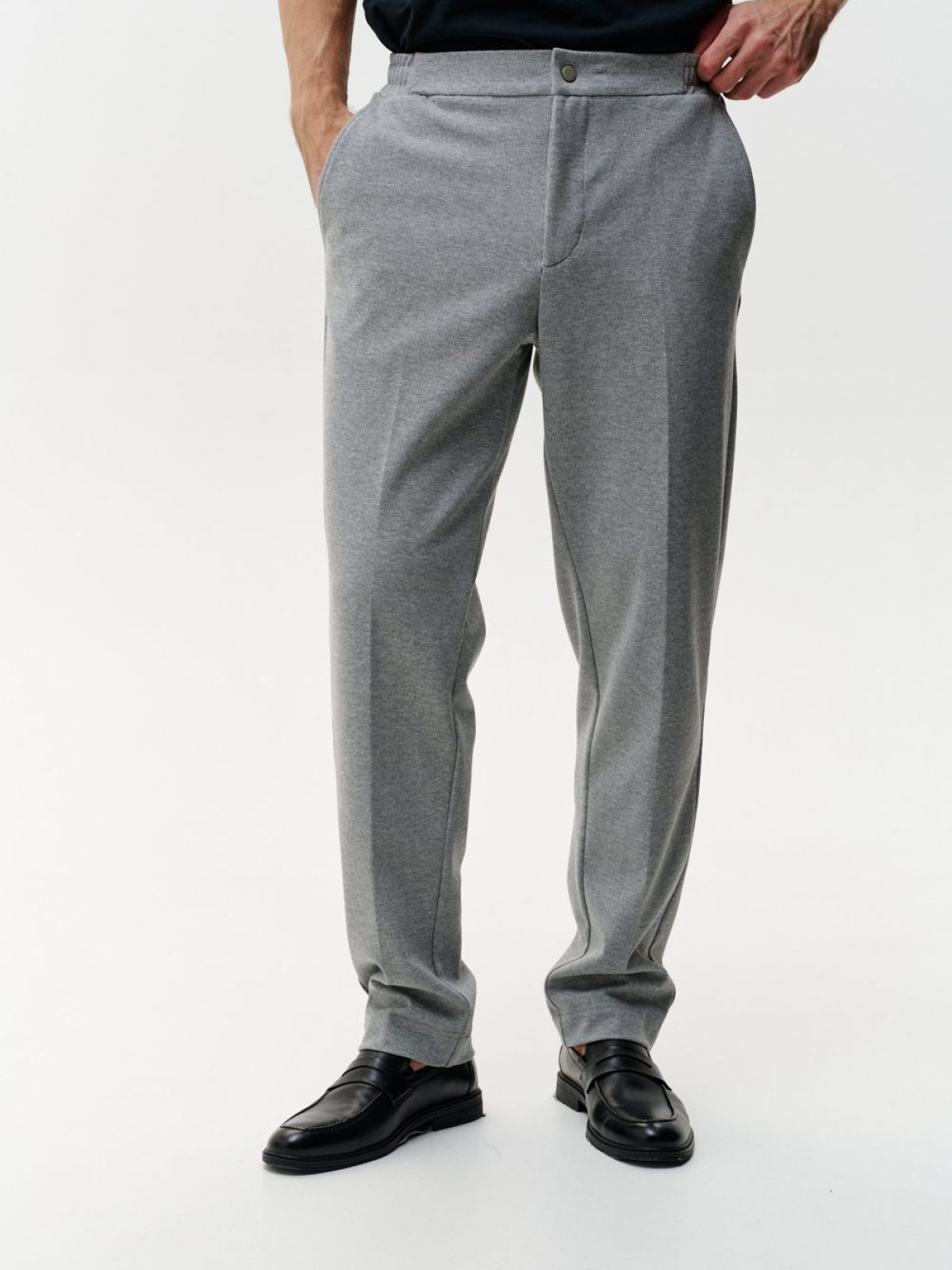 Брюки со стрелками прямого кроя из коллекции Office Core в лаконичном сером меланже выполнены из материала, в составе которого преимущественно вискоза и нейлон, за счет чего материал гладкий и приятный на ощупь, слегка тянется, но при этом выглядит фактурно. Брюки имеют два боковых кармана, два задних кармана на кнопках, пояс на резинке и кнопке. К брюкам в ассортименте представлен джемпер "Генрих" 2M2OC31E1-25GRY/MLG10. Важно: материал имеет низкую пиллингуемость, но частое соприкосновение с аксессуарами может привести к образованию пилли.