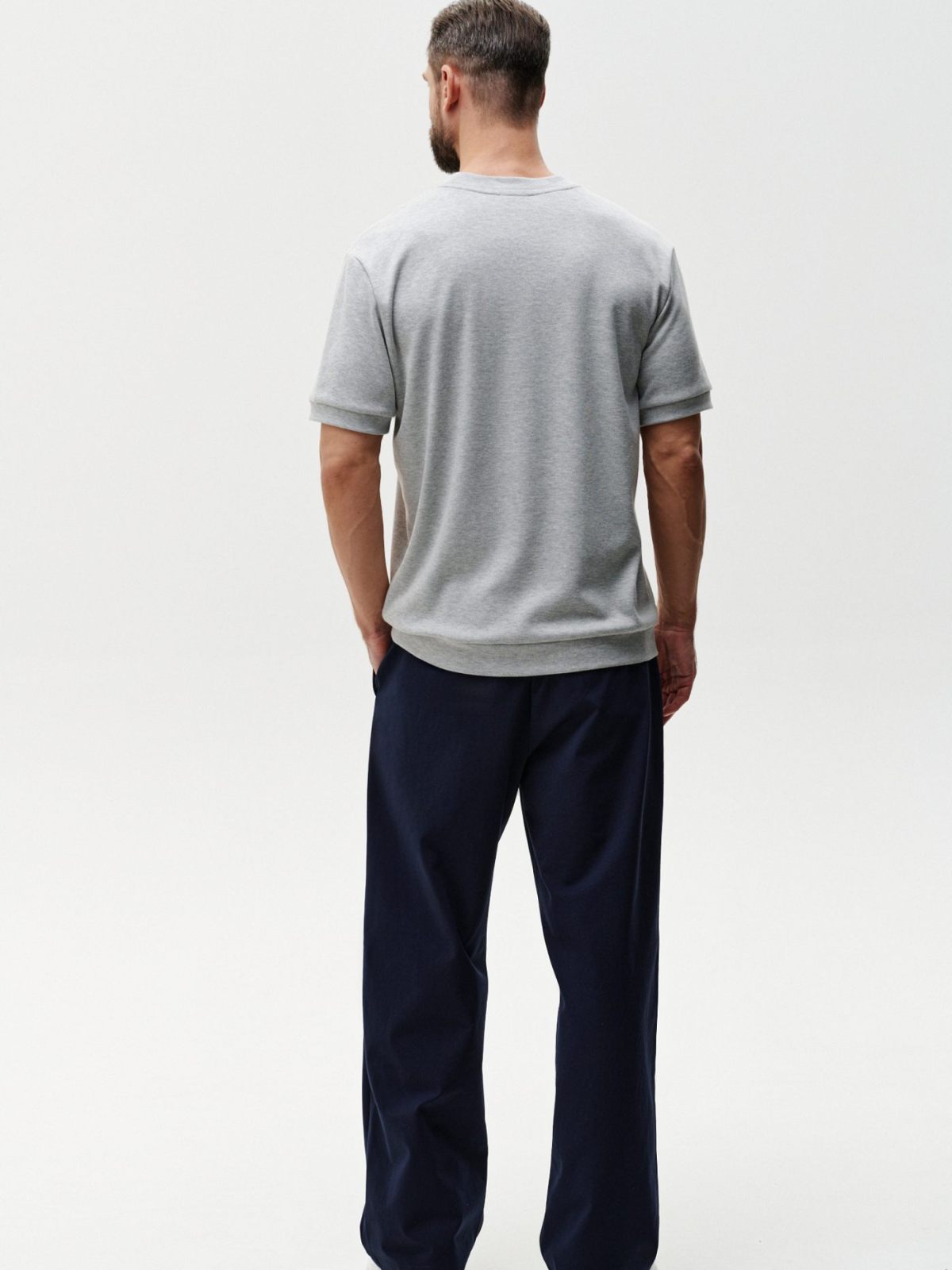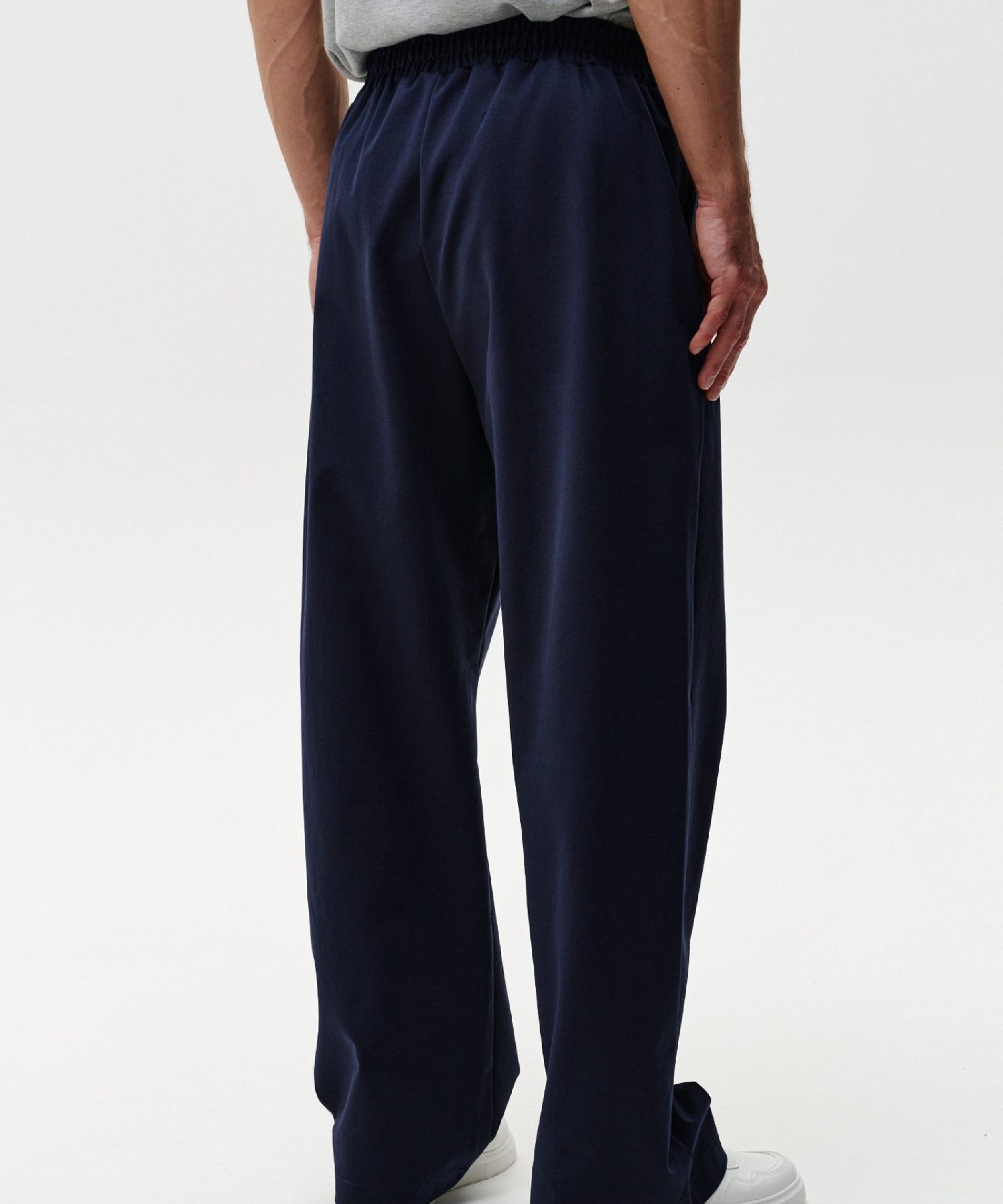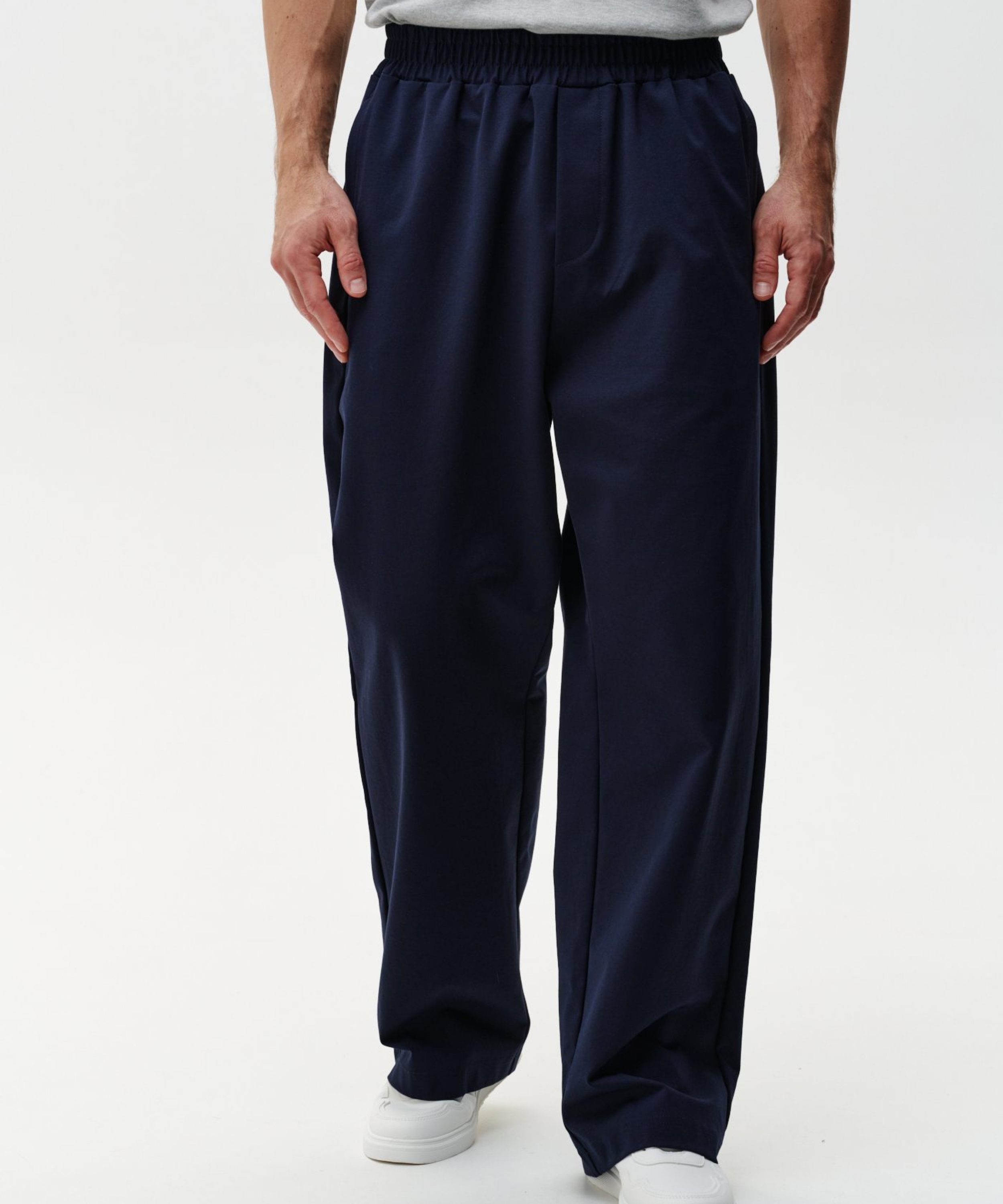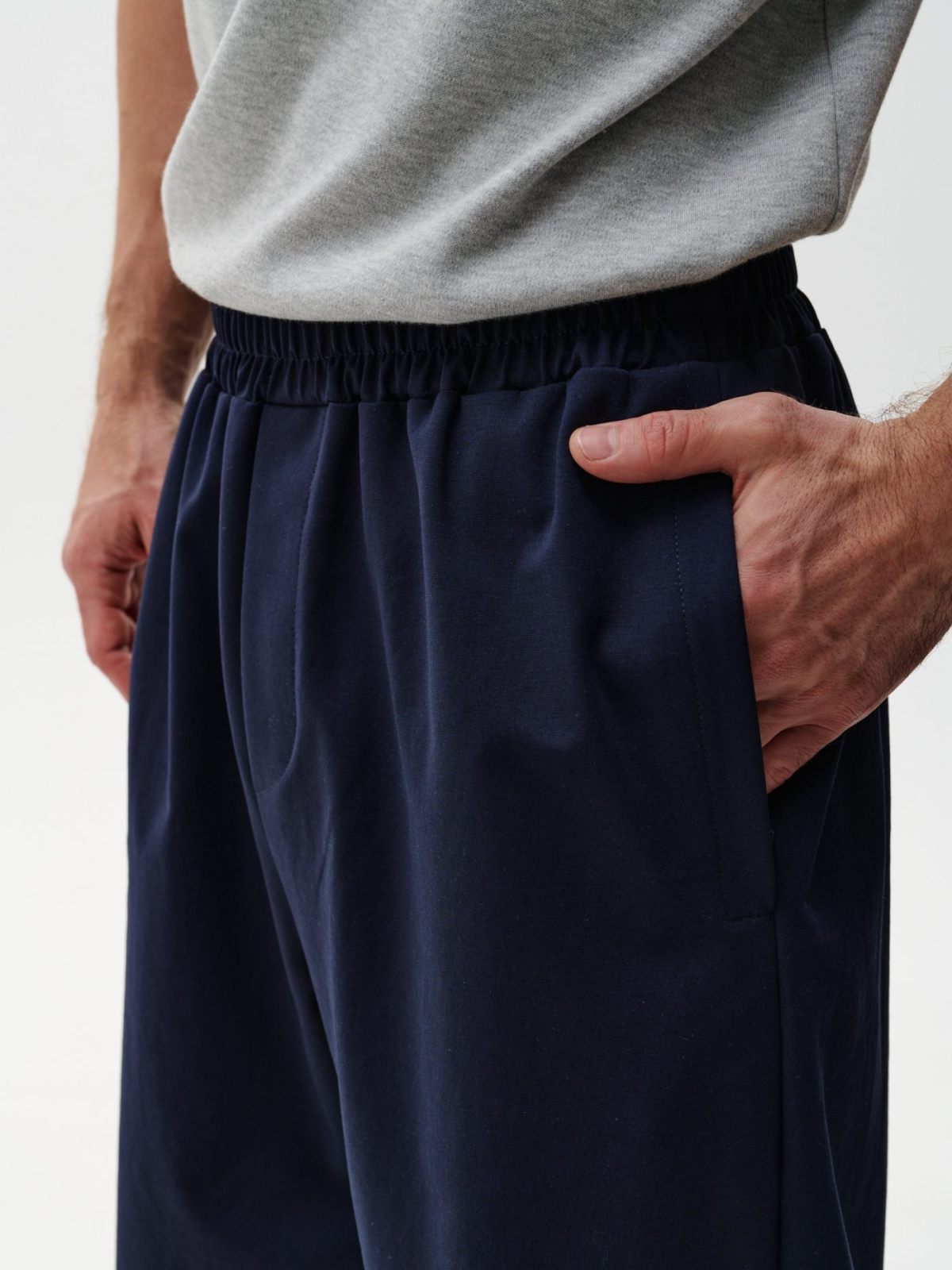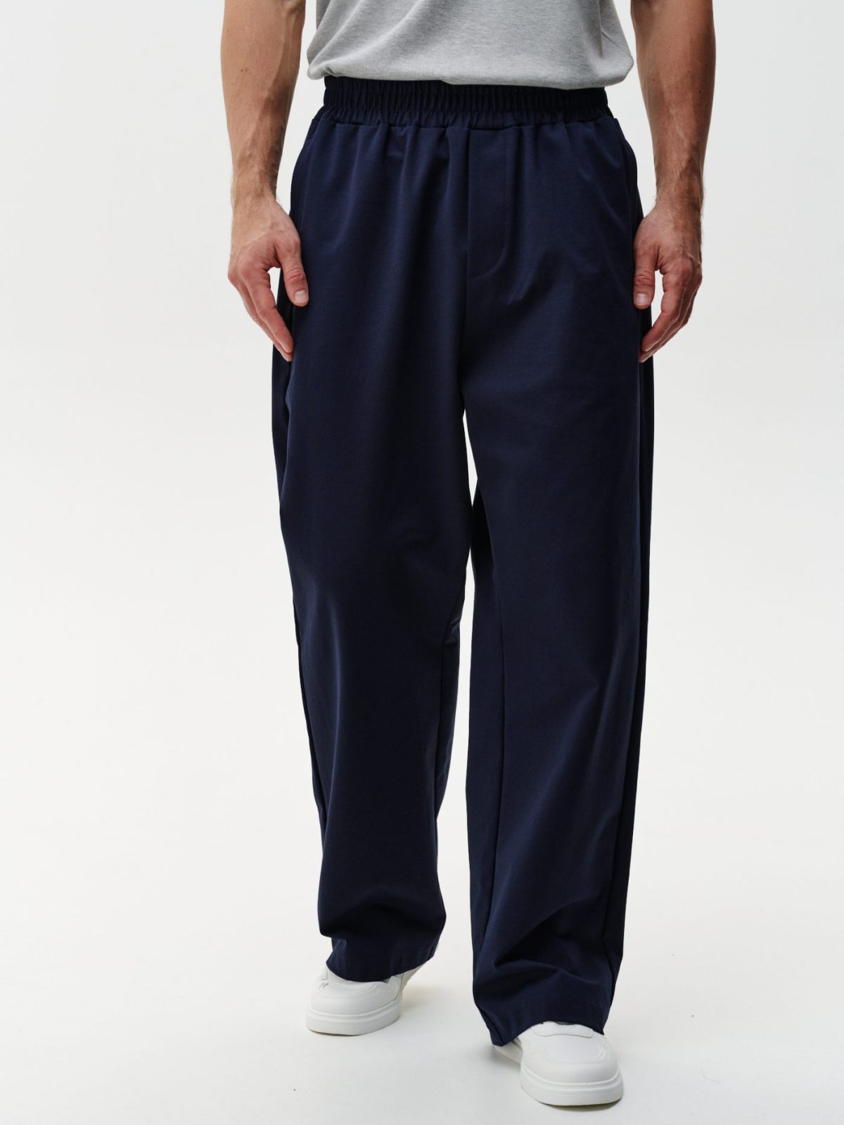 Широкие прямые брюки "Эхо" из коллекции Pure в строгом темно-синем цвете navi. Материал - джерси, приятный на ощупь, гладкий, прочный и структурный, отлично держит форму. За счет добавления нейлона в состав материал слегка тянется. Брюки имеют два боковых кармана на молнии, внутренний шнурок в поясе для регулировки посадки, пояс на резинке. Гульфик на брюках декоративный. Свободный крой и структурный материал позволяют сочетать брюки с любыми верхами, в том числе свитерами, создавая стильные образы на каждый день.