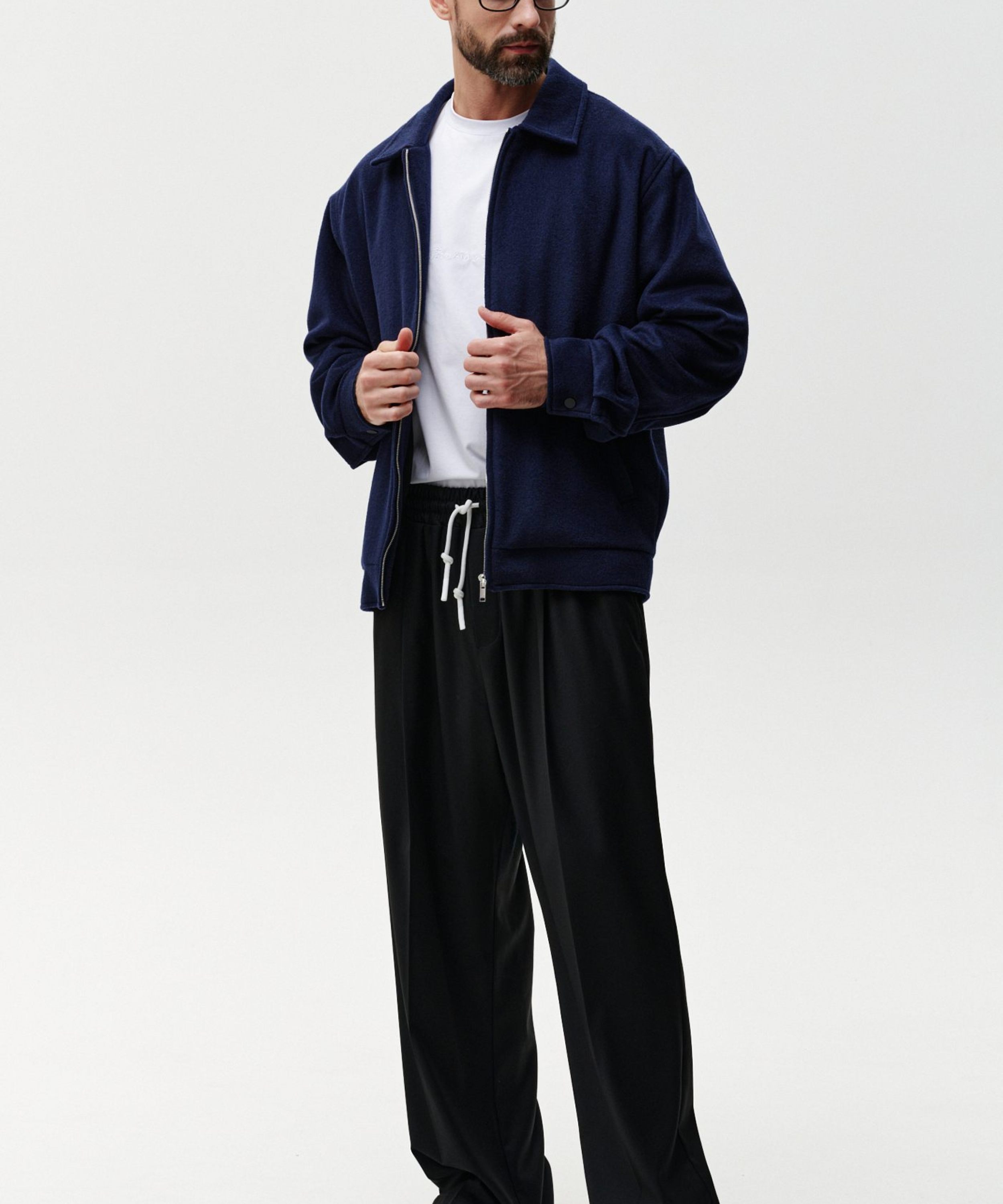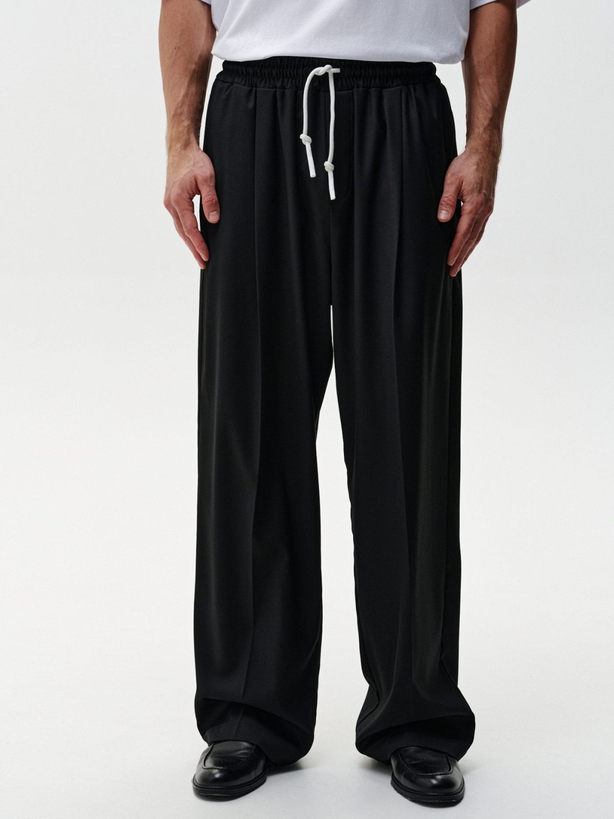 Широкие прямые брюки "Женя" свободного кроя из костюмной ткани с вискозой. На лицевой стороне выполнены защипы и декоративные стрелки. Брюки имеют два боковых кармана, эластичный пояс и контрастный шнурок для регулировки посадки. Гульфик на брюках декоративный. Свободный крой и структурный материал позволяют сочетать брюки с любыми верхами, в том числе свитерами, создавая стильные образы на каждый день.
