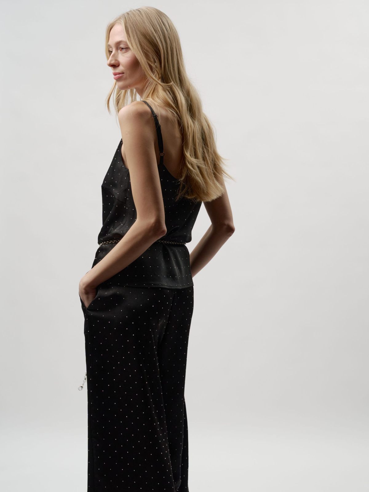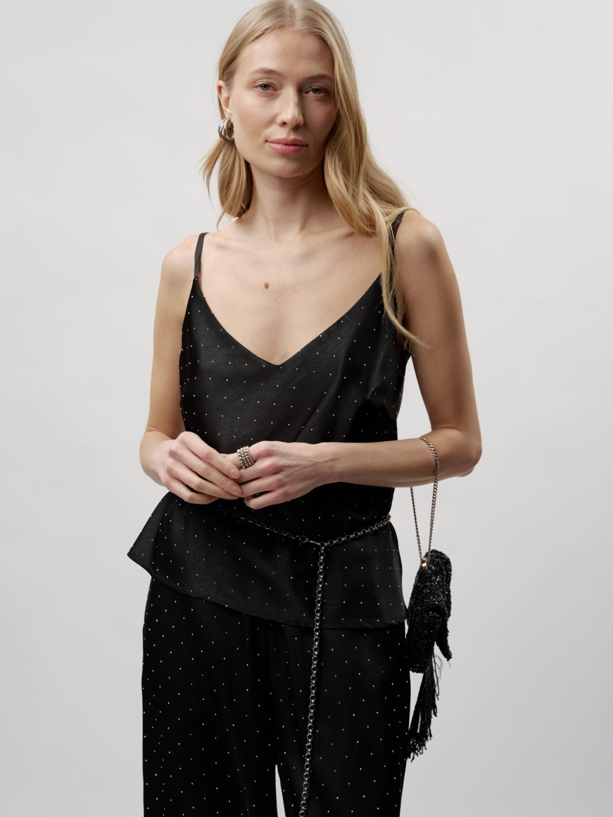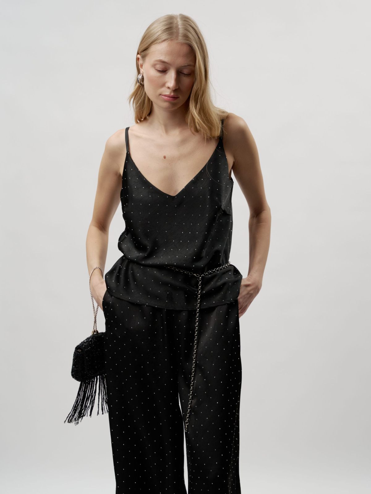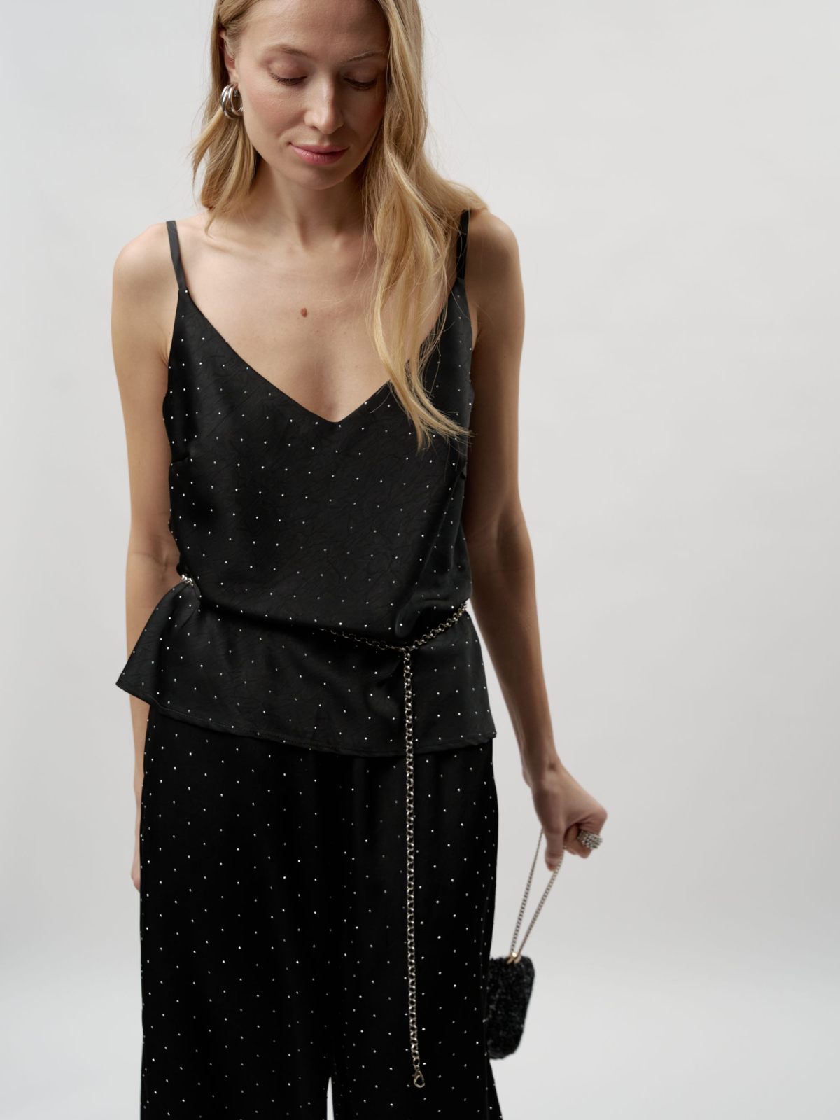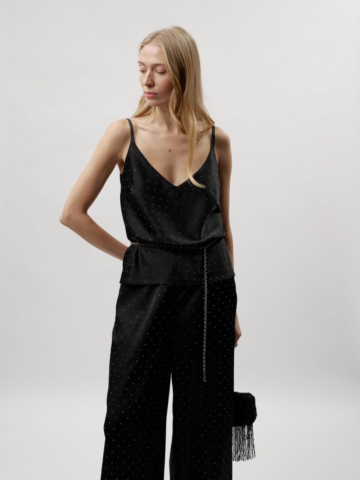 Блузка-топ "Флер" со стразами выполнена из материала с имитацией шелка. Глубокий черный цвет подчеркивает фигуру, сияние маленьких акцентных страз, которое раскрывается при движении, создает элегантный образ. У блузки регулируются бретельки. В комплекте к блузке можно приобрести брюки SBW2NY84W-47BLK65 и рубашку SBW2NY53W-23BLK101.