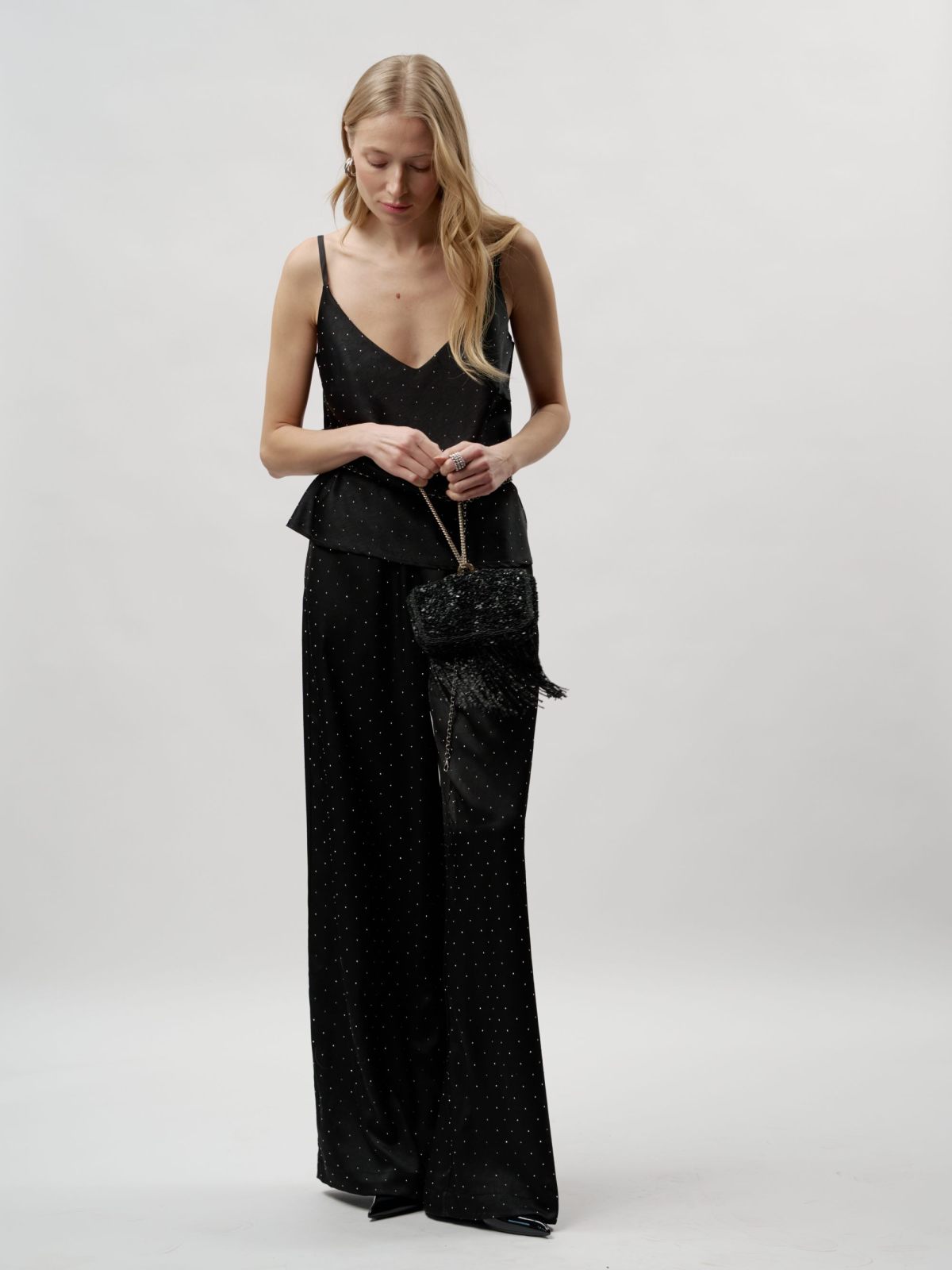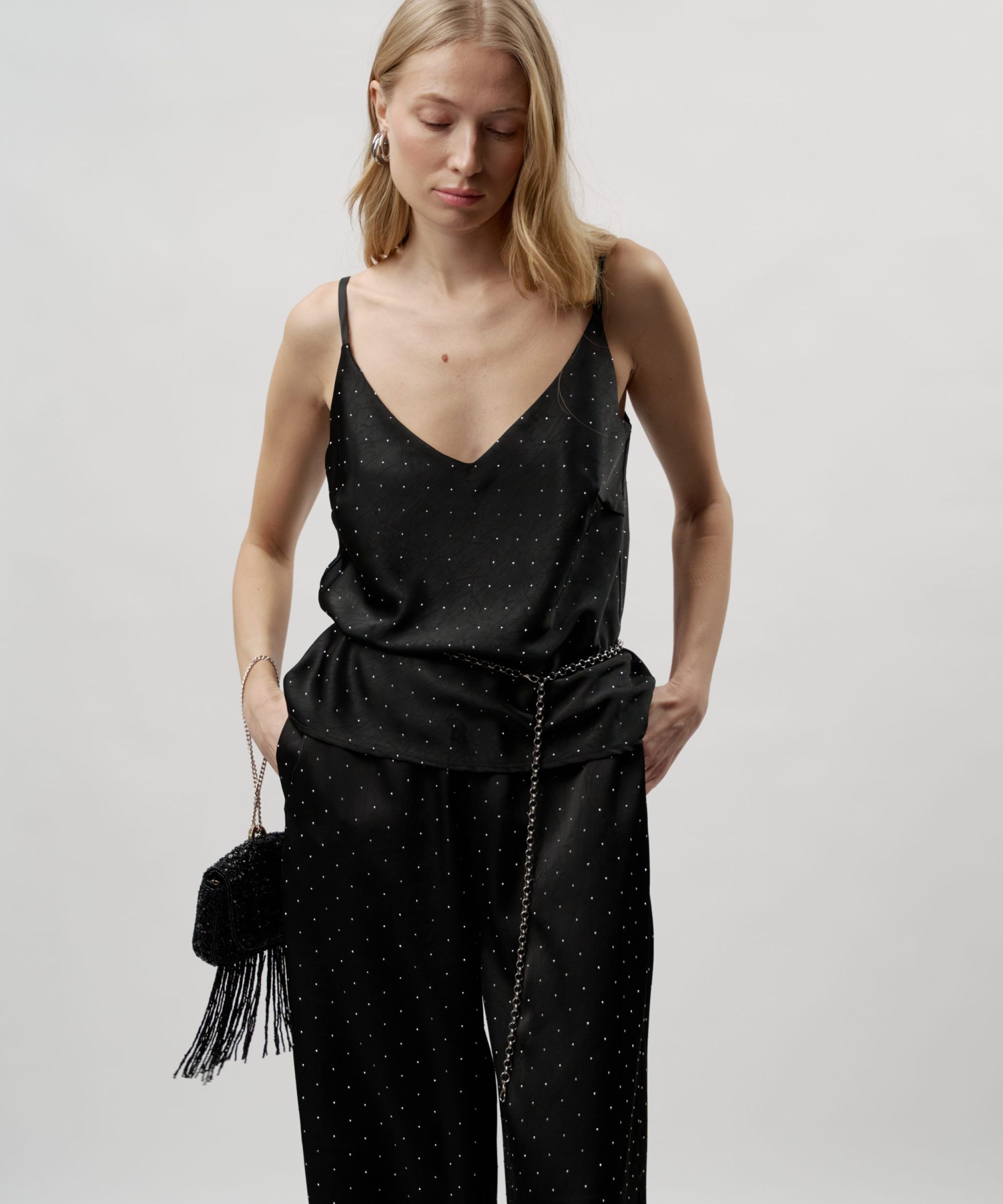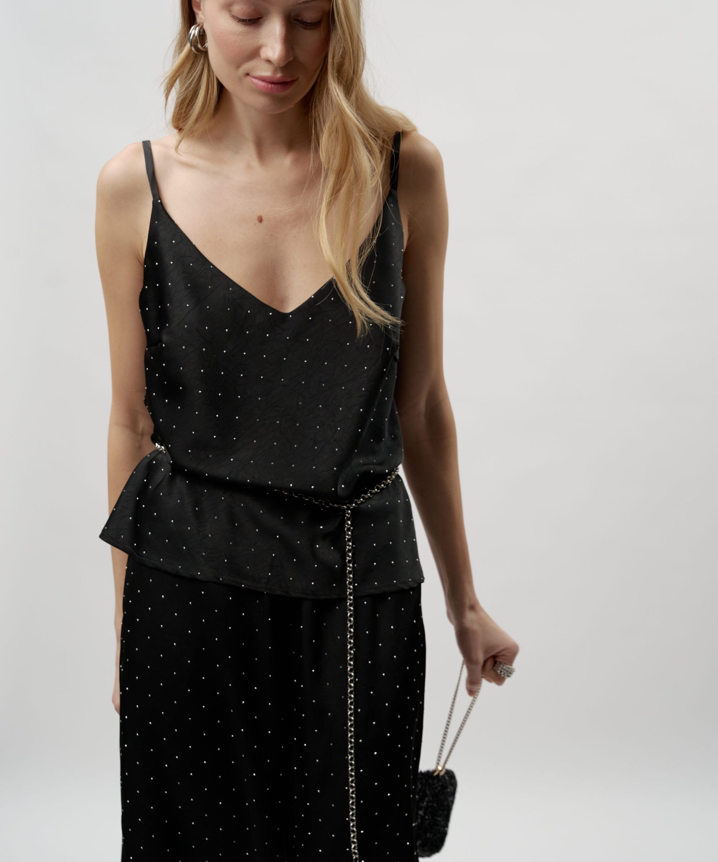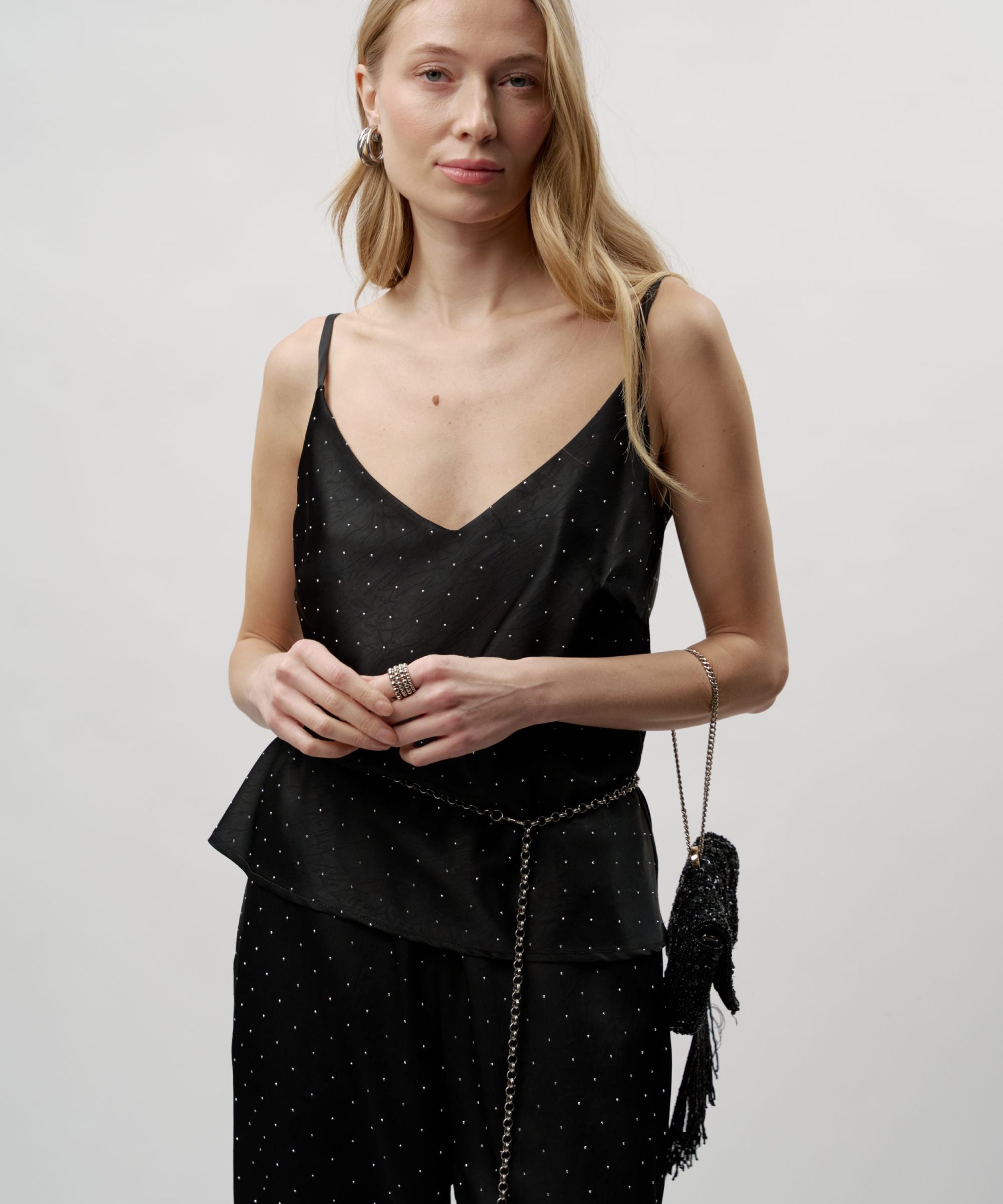 Блузка-топ "Флер" со стразами выполнена из материала с имитацией шелка. Глубокий черный цвет подчеркивает фигуру, сияние маленьких акцентных страз, которое раскрывается при движении, создает элегантный образ. У блузки регулируются бретельки. В комплекте к блузке можно приобрести брюки SBW2NY84W-47BLK65 и рубашку SBW2NY53W-23BLK101.