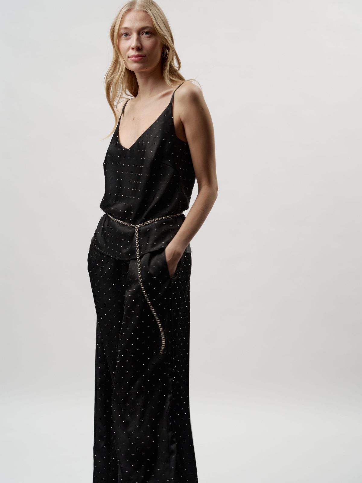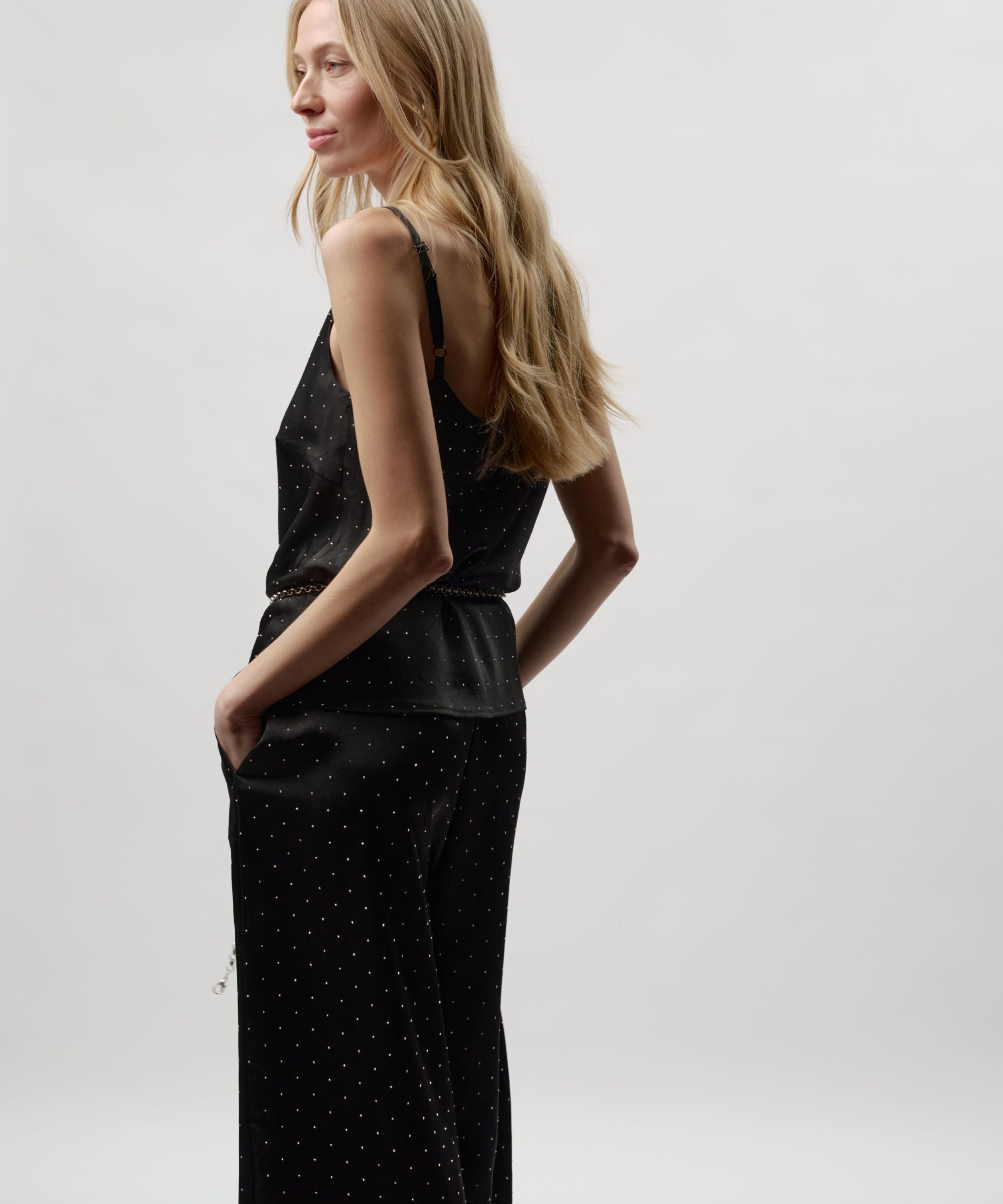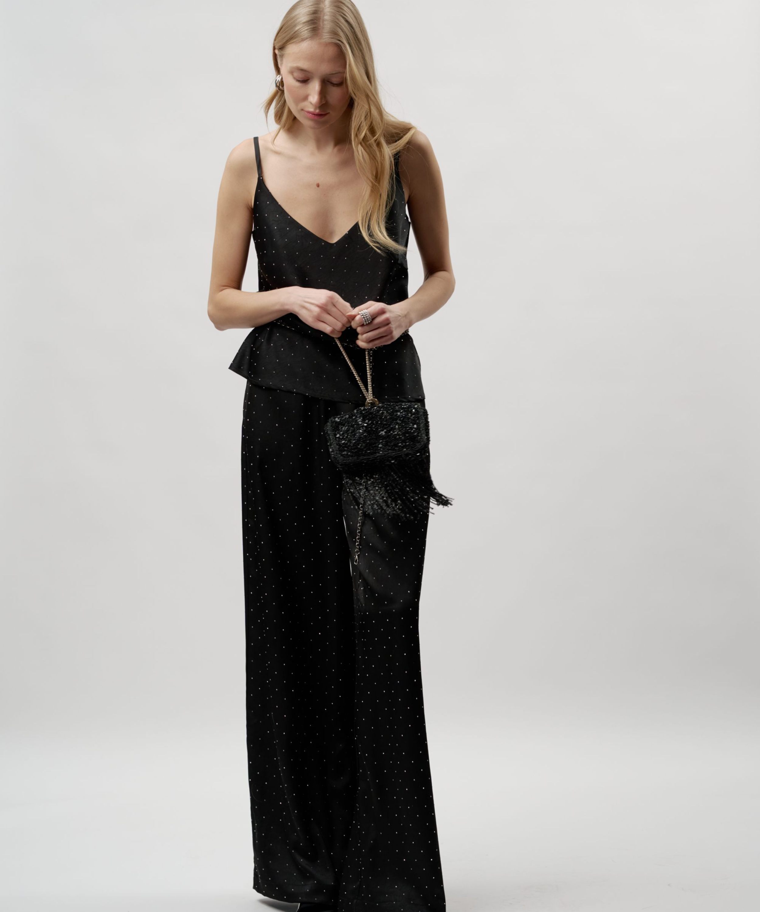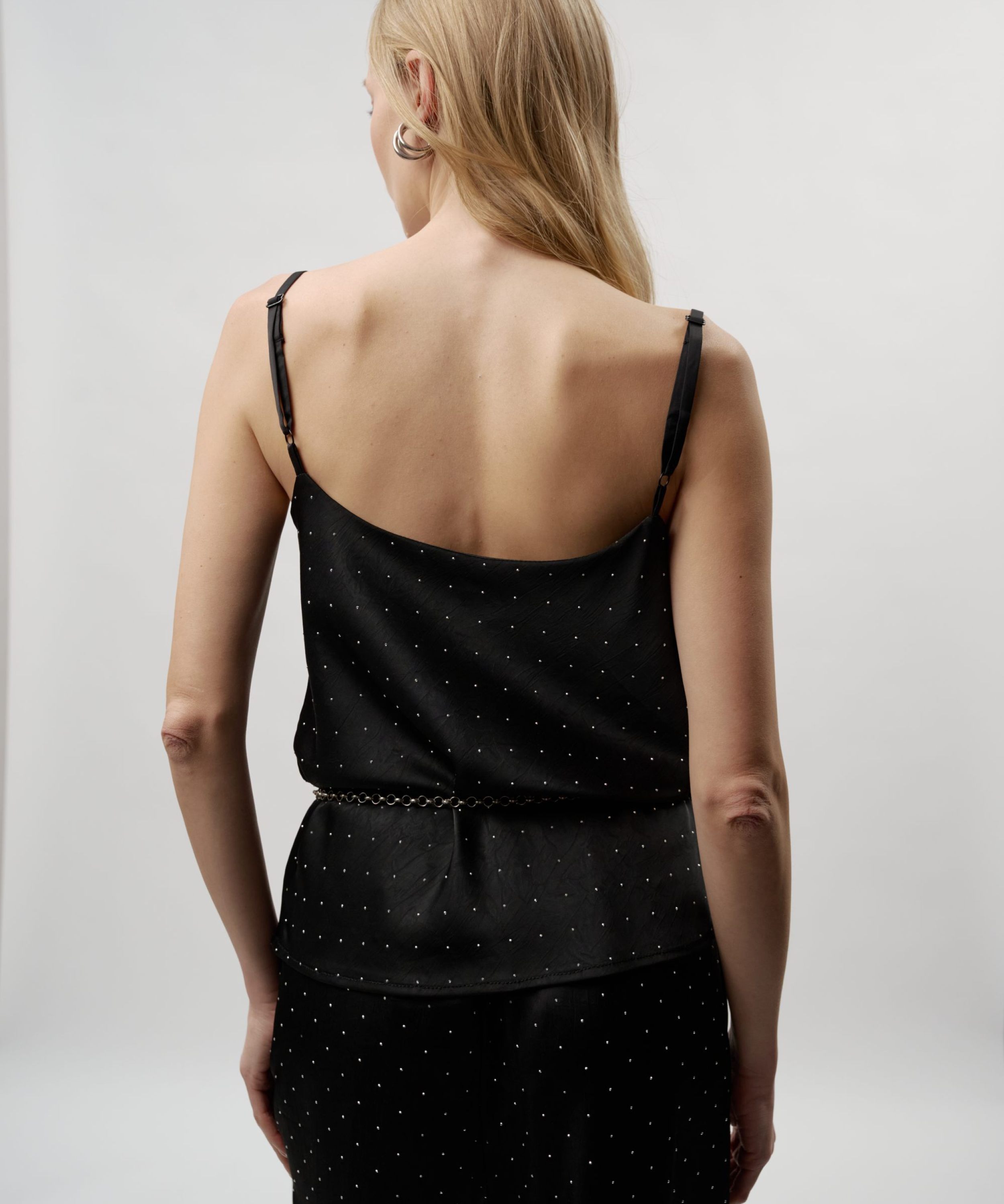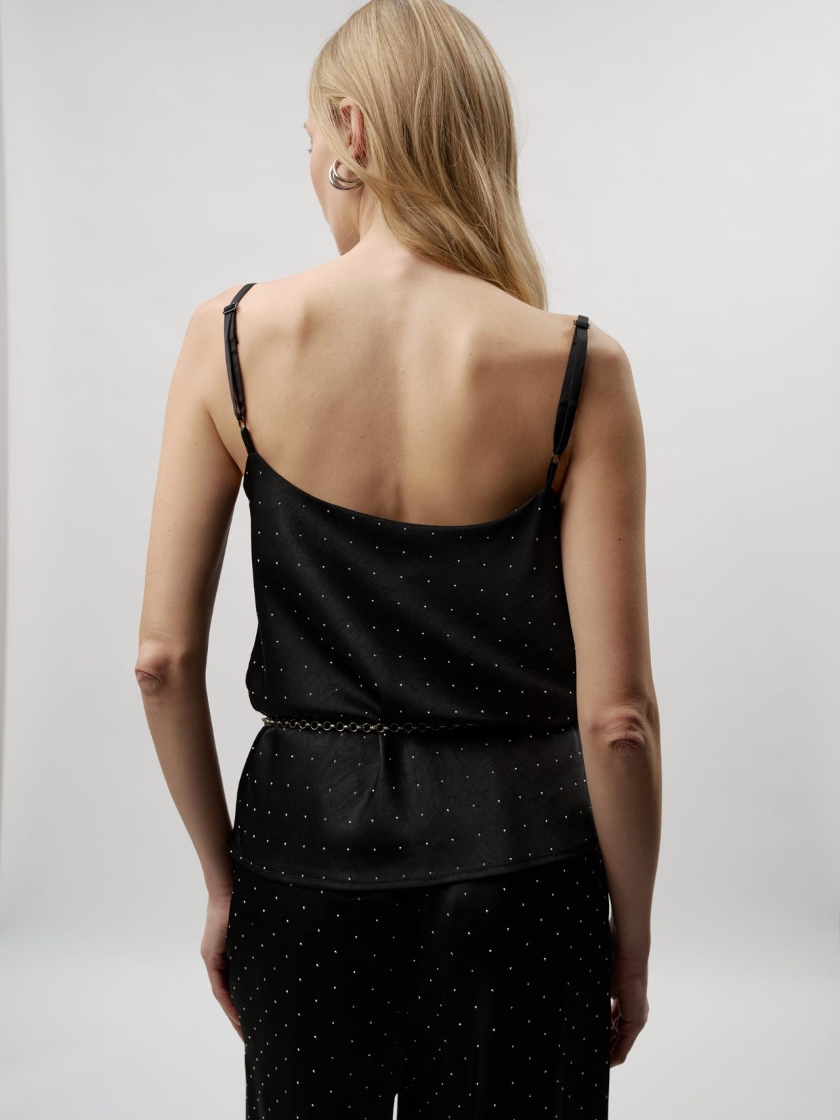Блузка-топ "Флер" со стразами выполнена из материала с имитацией шелка. Глубокий черный цвет подчеркивает фигуру, сияние маленьких акцентных страз, которое раскрывается при движении, создает элегантный образ. У блузки регулируются бретельки. В комплекте к блузке можно приобрести брюки SBW2NY84W-47BLK65 и рубашку SBW2NY53W-23BLK101.