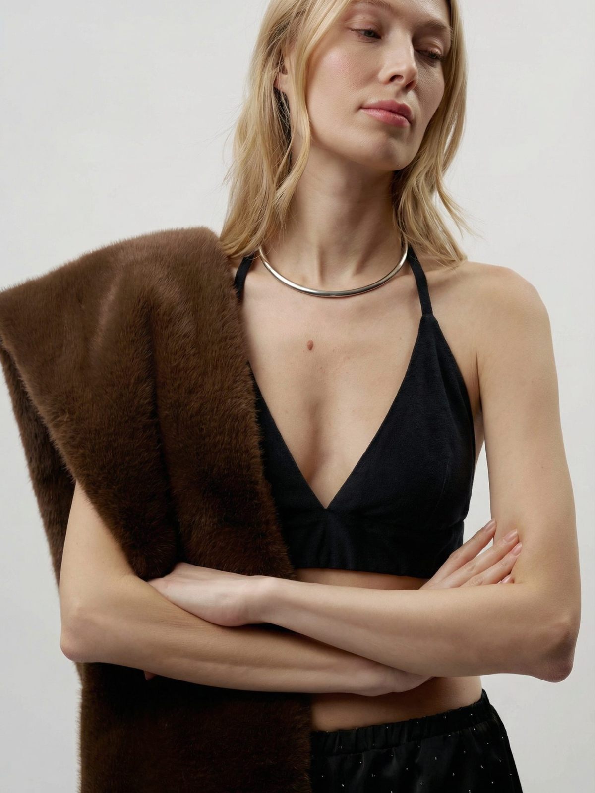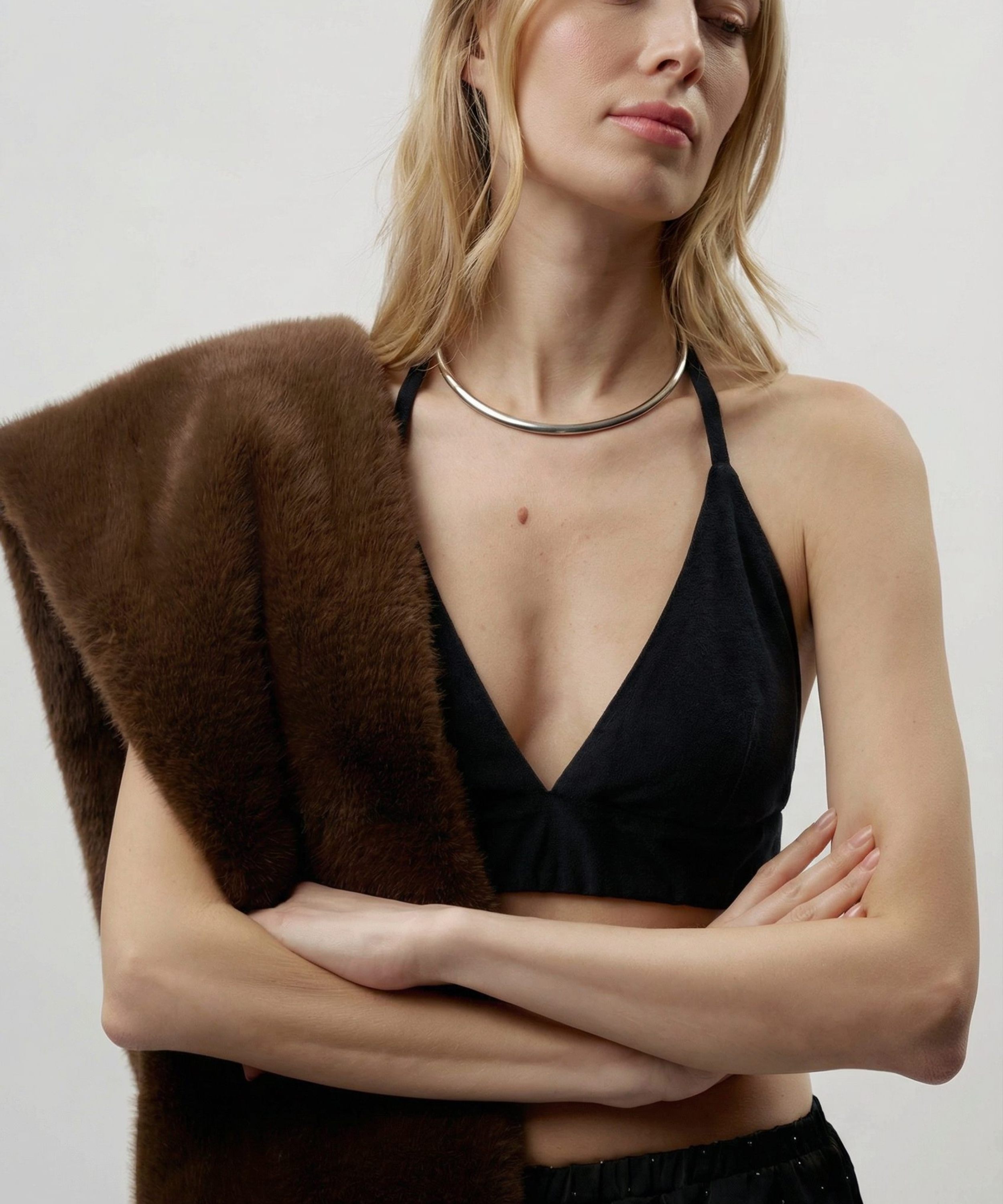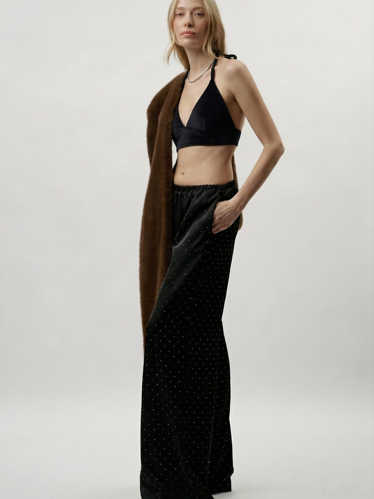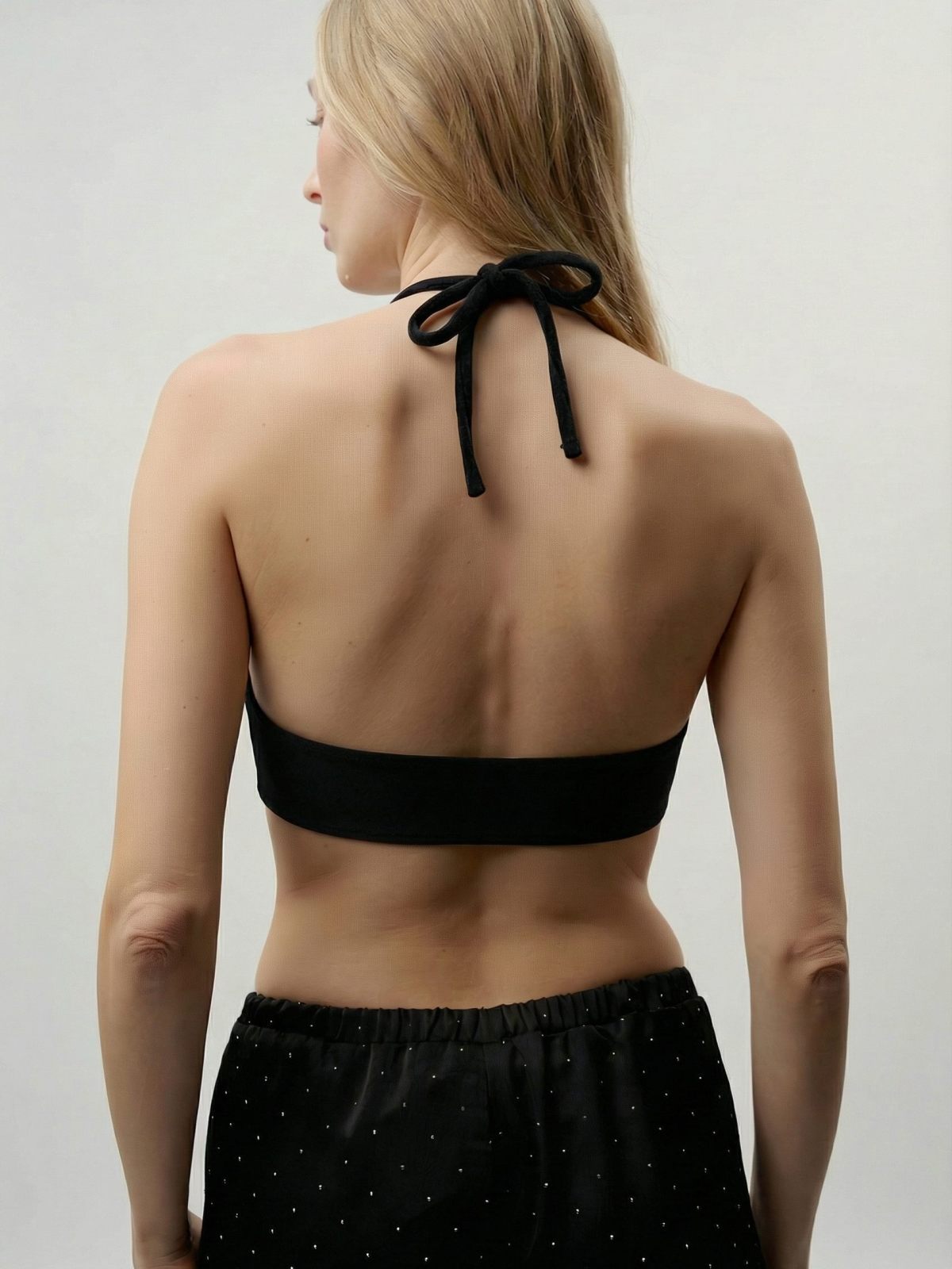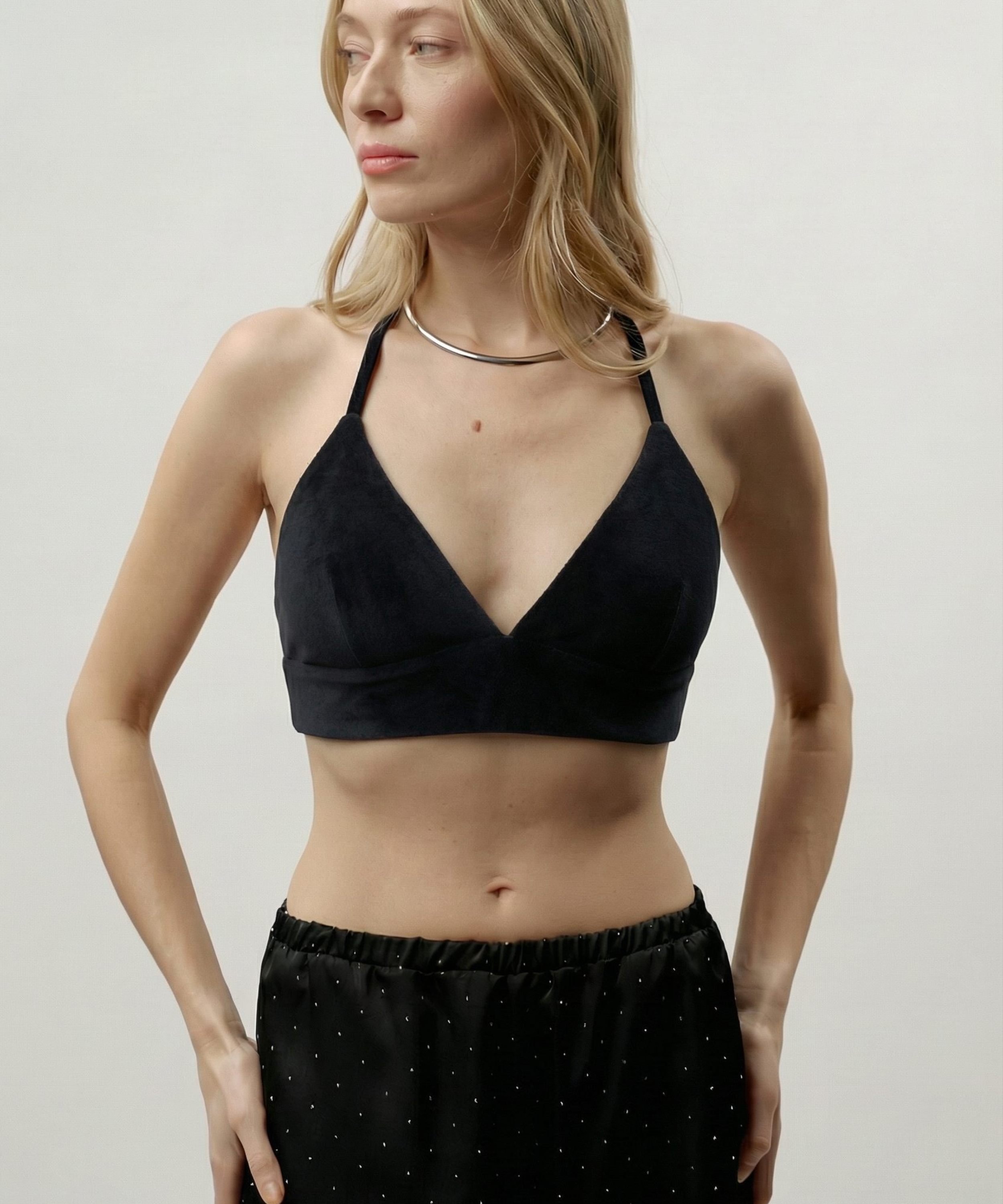 Топ "Флер" из черного, мягкого и приятного к телу велюра. Топ на эластичном широком поясе комфортно прилегает к телу и обеспечивает хорошую посадку. Бретельки подвязные, что дает возможность регулировать высоту лямок и посадку под себя. Топ хорошо держит форму за счет чашек, которые можно убрать при желании. В комплекте к топу в ассортименте представлены брюки со стразами "Флер" SBW2NY84W-47BLK65 и полупрозрачная рубашка "Марина" SBW2NY53W-23BLK101.