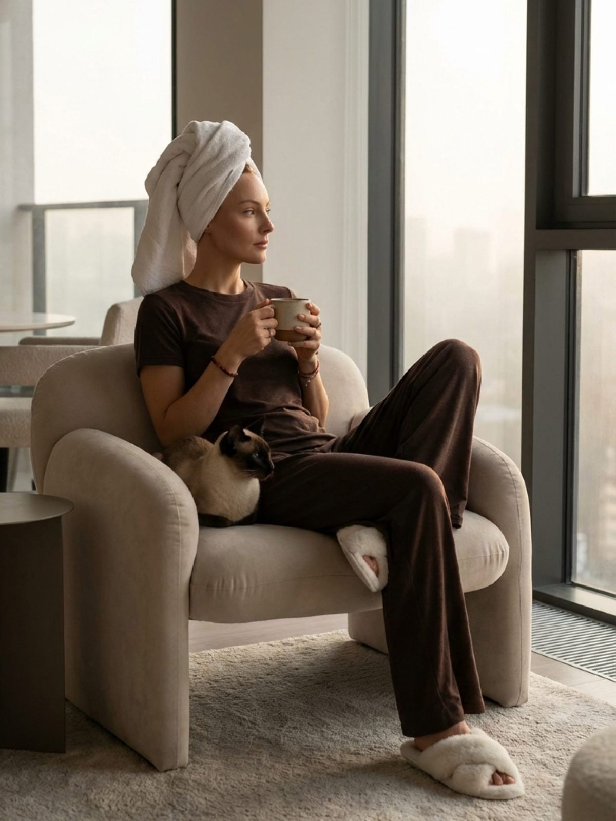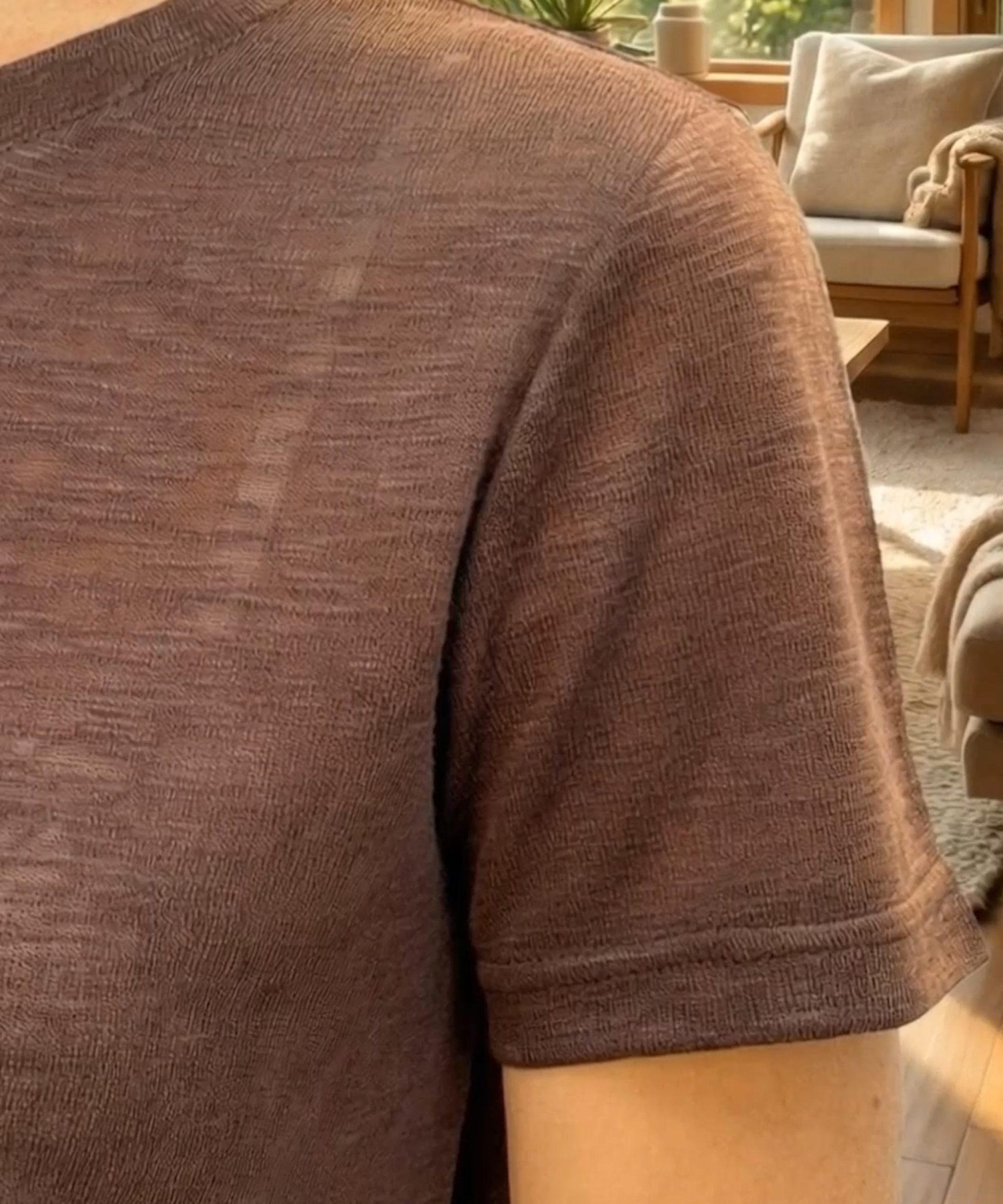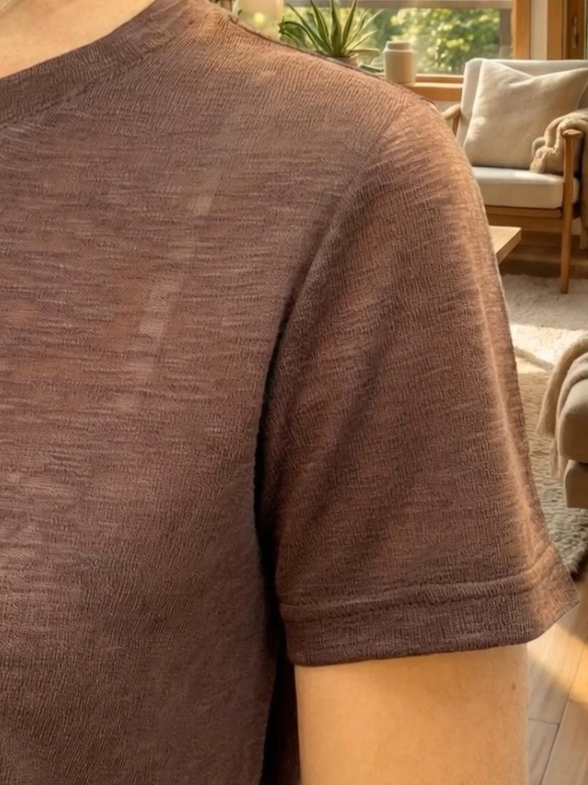 Прямой свободный силуэт, классический круглый вырез и короткие рукава. Длина до линии бедра позволяет носить навыпуск или заправлять. Глубокий шоколадный оттенок и нежный розовый легко сочетаются с базовыми вещами.