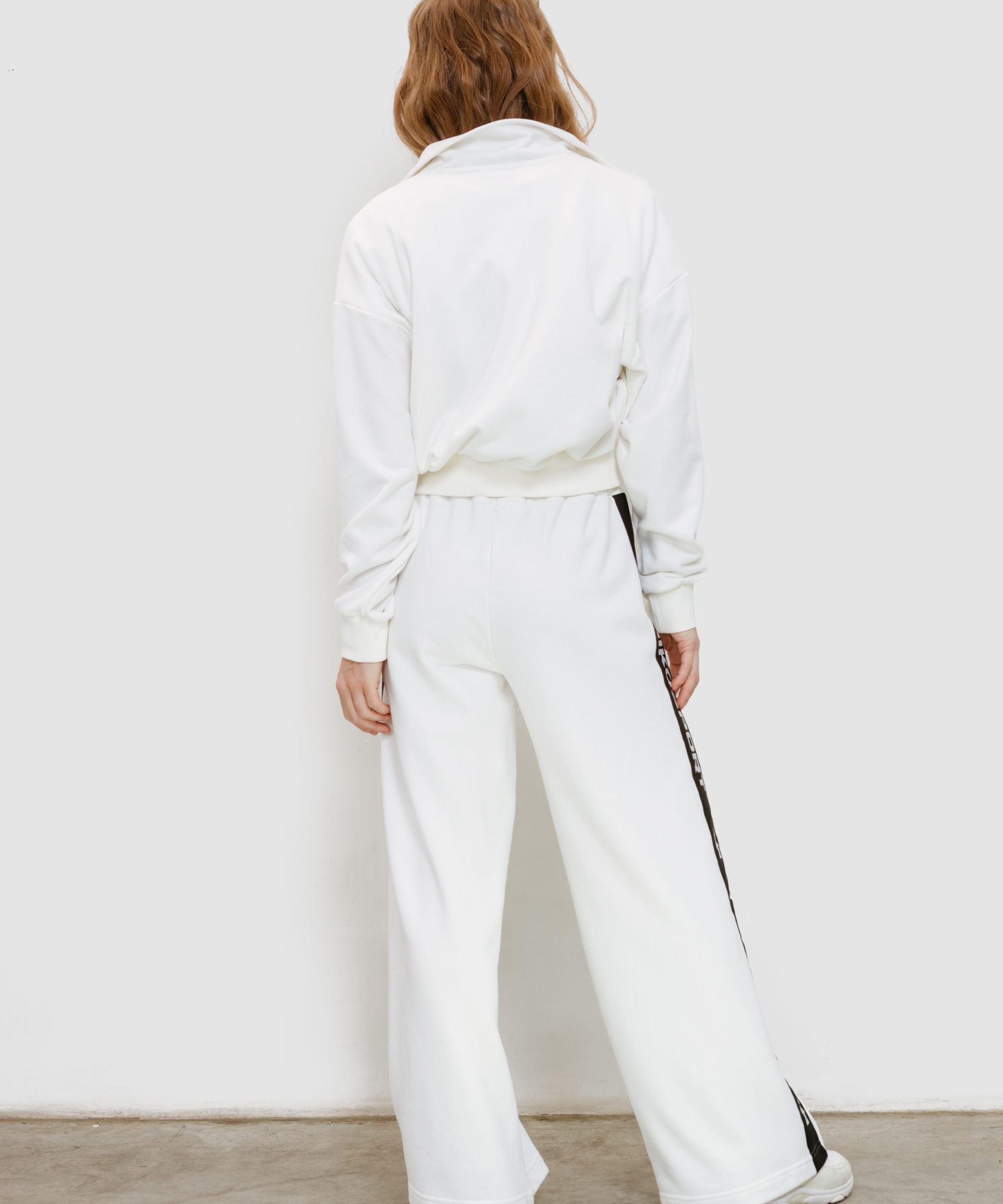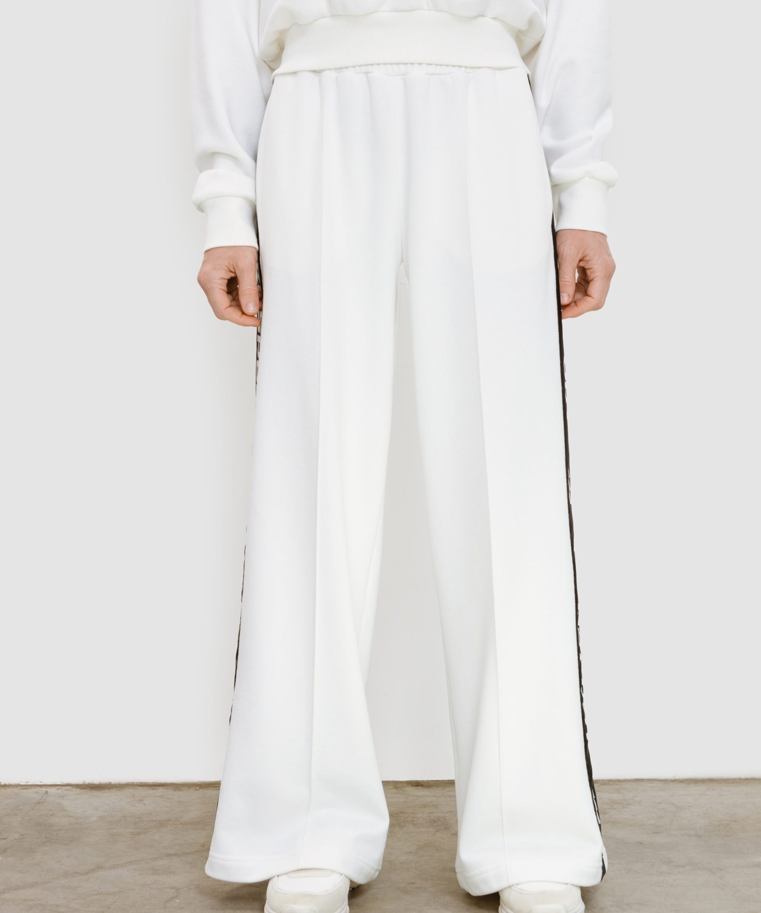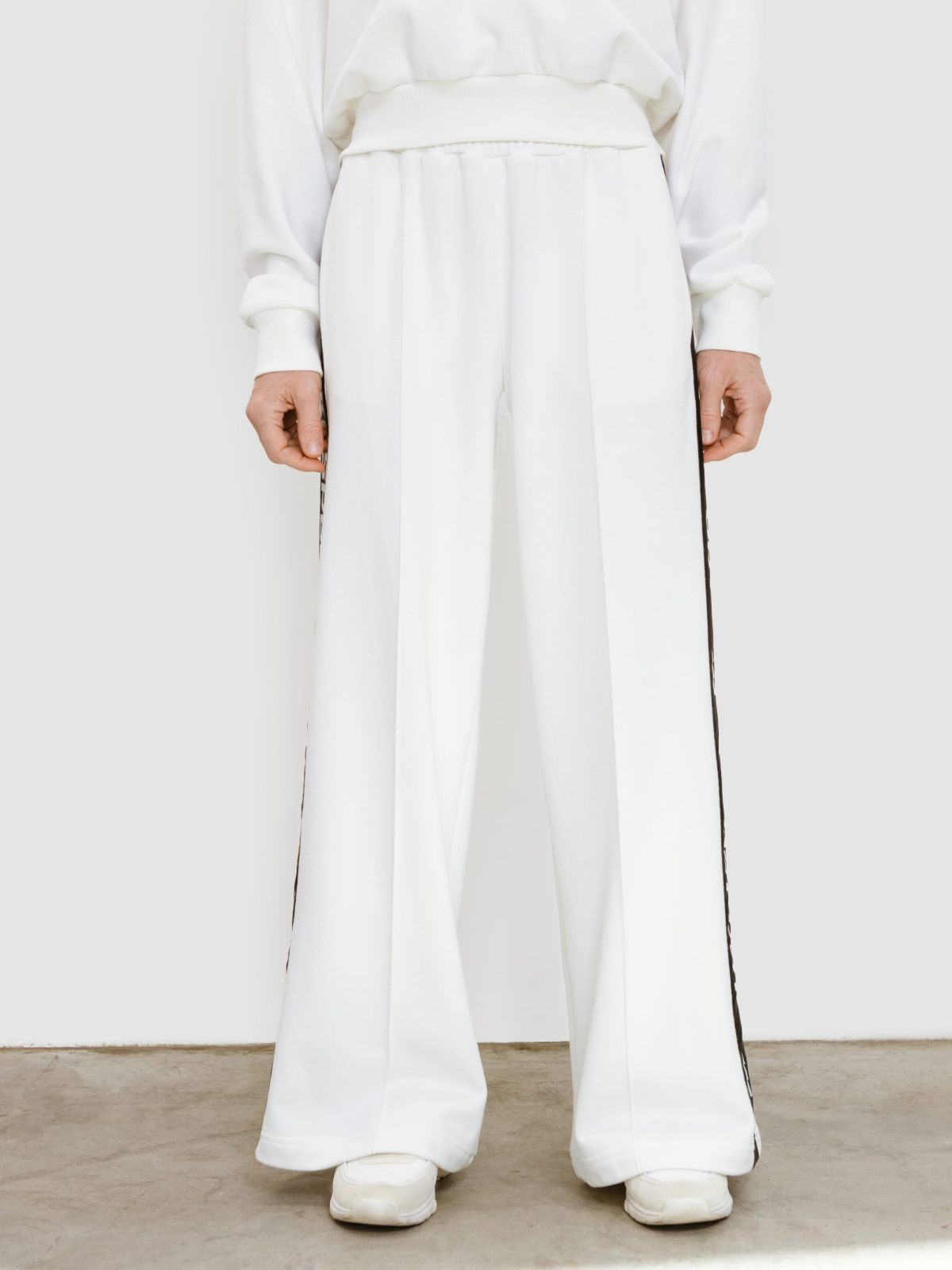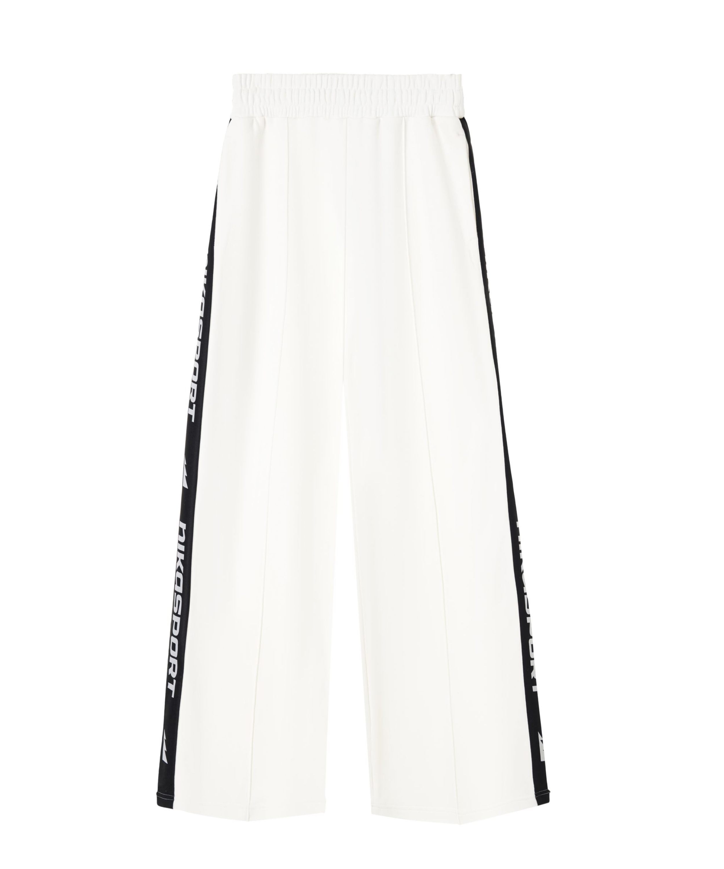 Женские прямые широкие брюки выполнены из материала, в составе которого 70% хлопка и 30% полиэстера, что обеспечивает отличную посадку и долговечность изделия. Представлены в классическом черном и белом цветах. Свободный крой, широкая эластичная резинка на поясе, стильные прострочки и лампасы с принтами-логотипами компании - все это прекрасно подходит для создания стильного спортивного или повседневного образа.