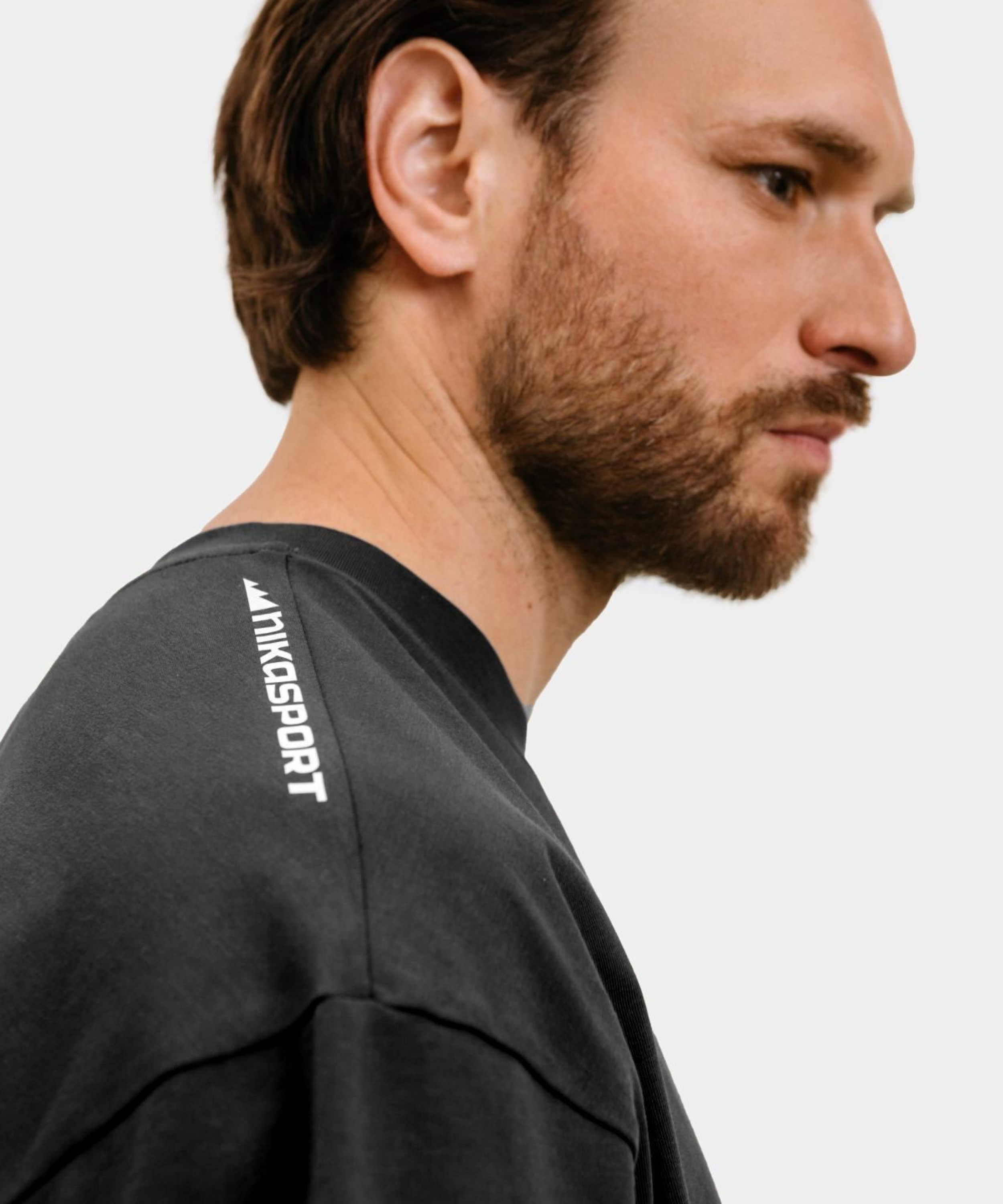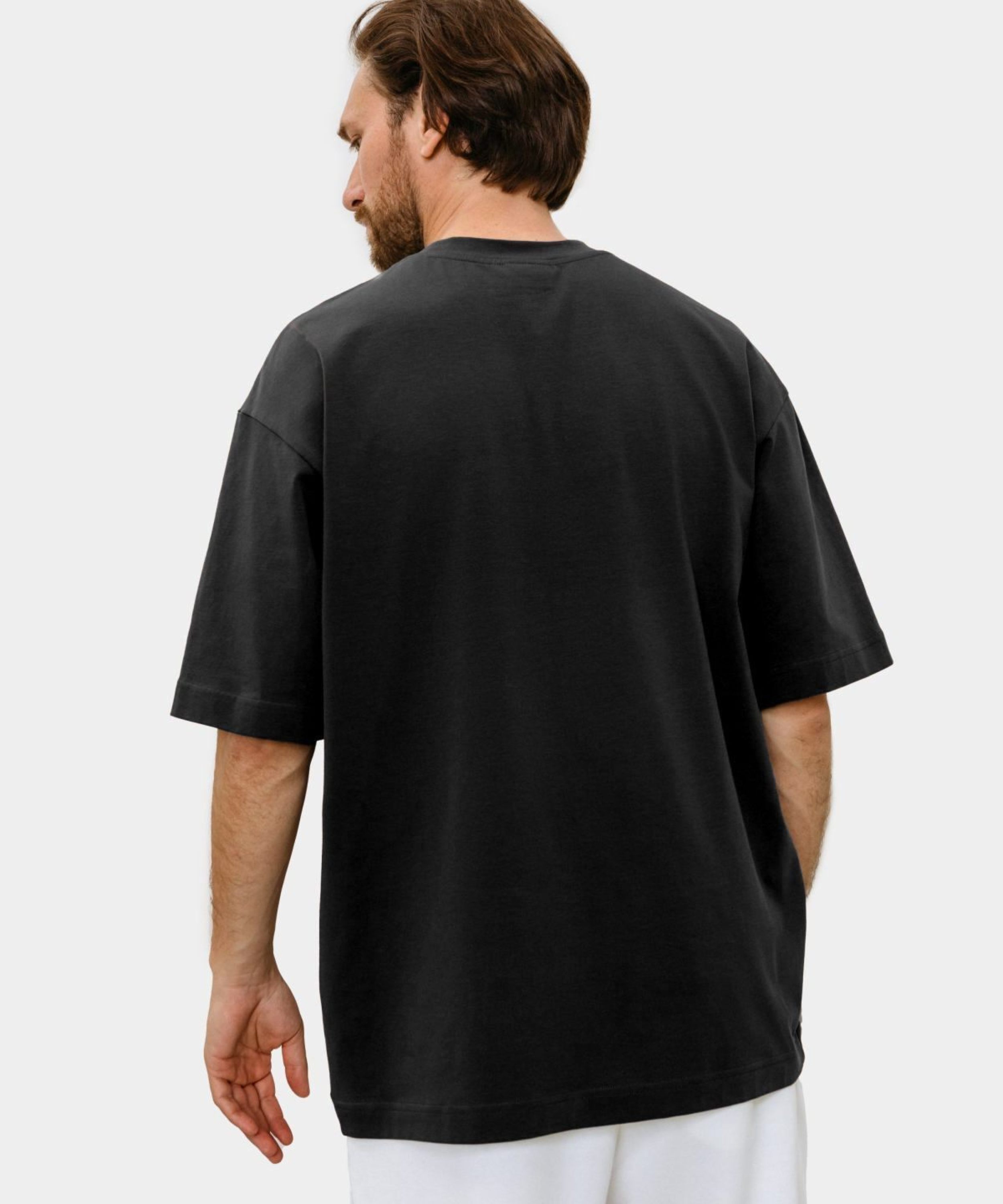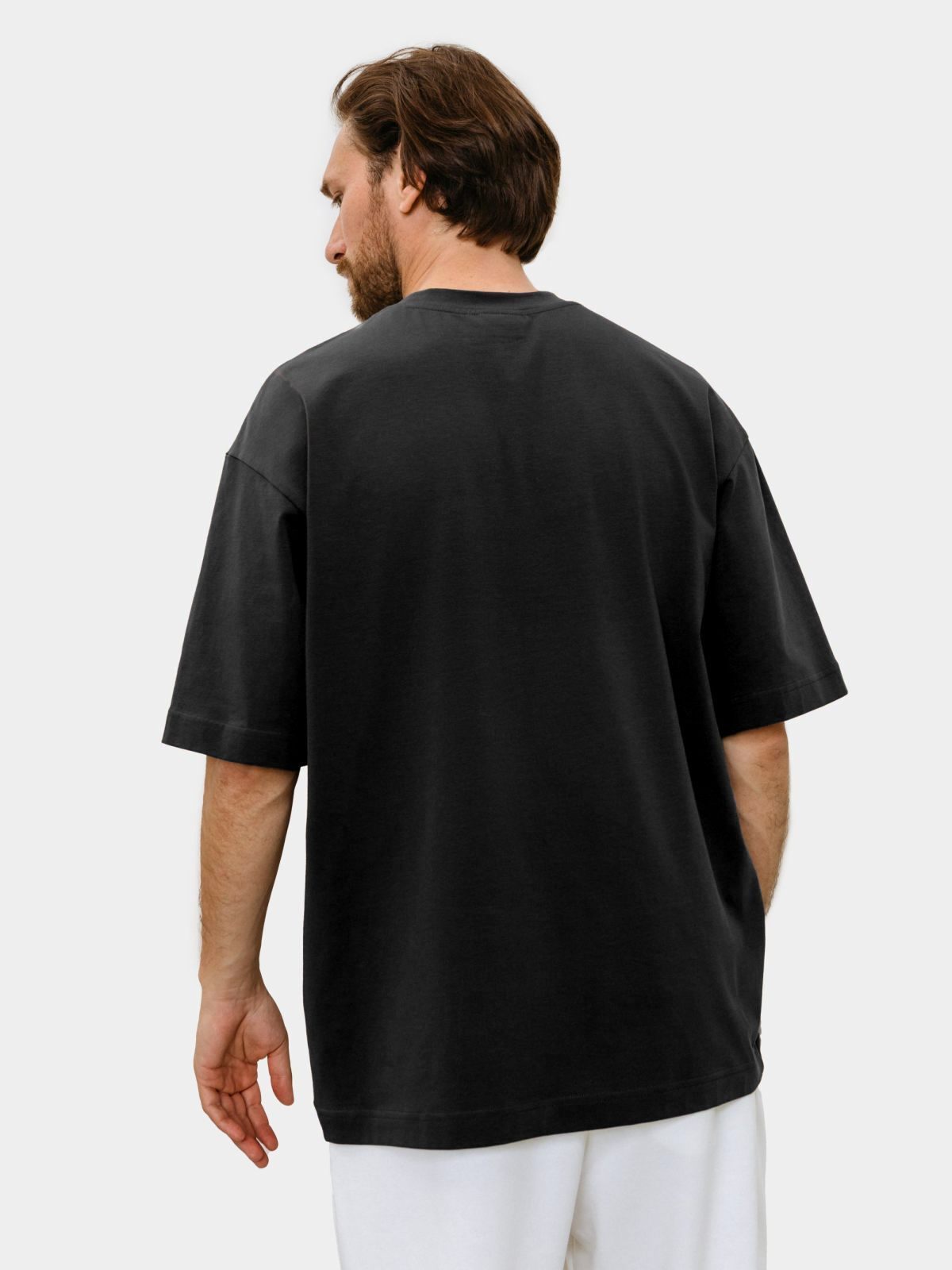 Мужская футболка oversize силуэта. Сделана из 100% плотного хлопка - гипоаллергенного материала, отлично пропускающего воздух. Спущенная линия плеча и контрастные лого-принты создают спокойный повседневный образ. Футболка представлена в классическом черном цвете и отлично сочетается как со спортивным, так и с повседневным стилем.