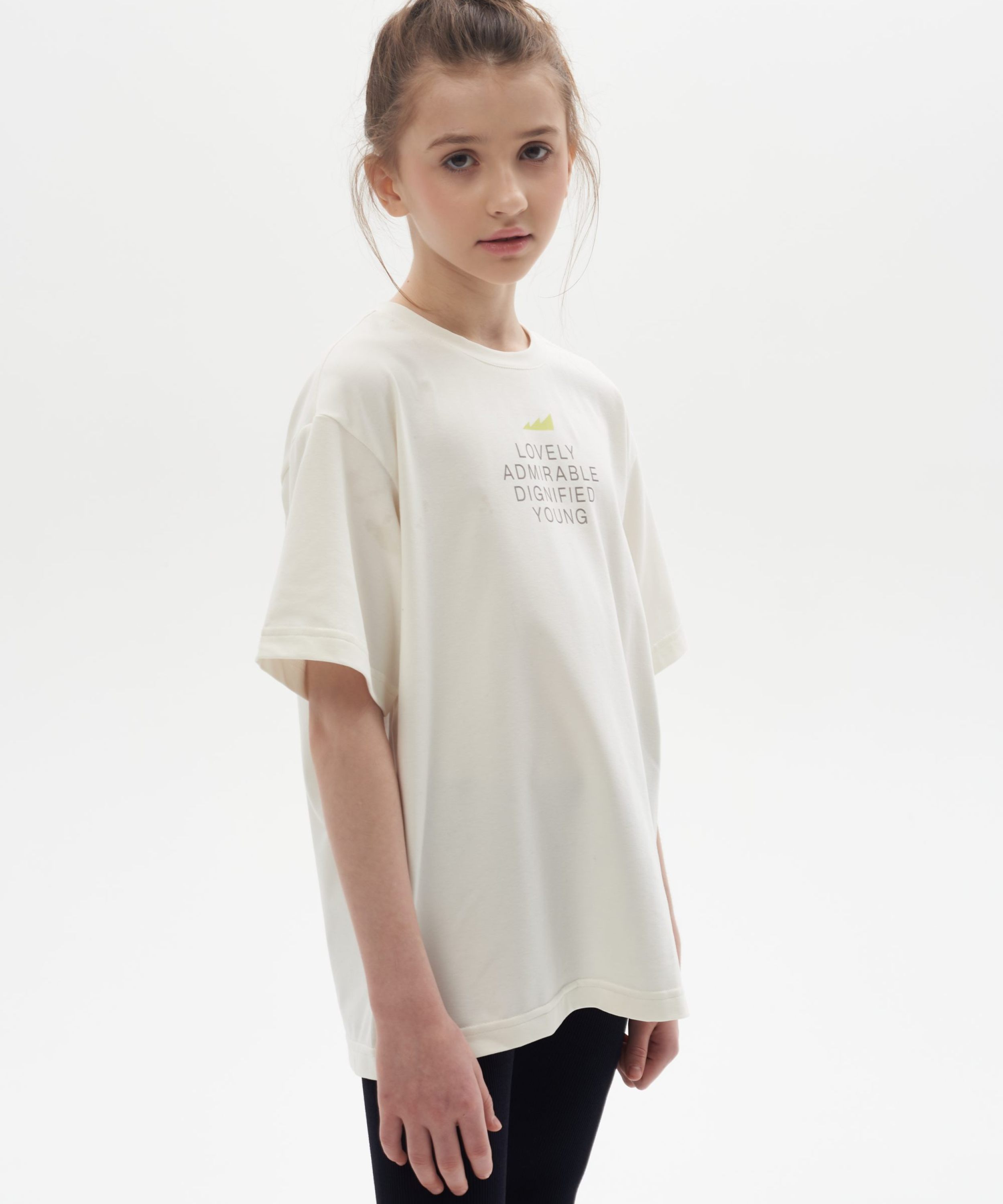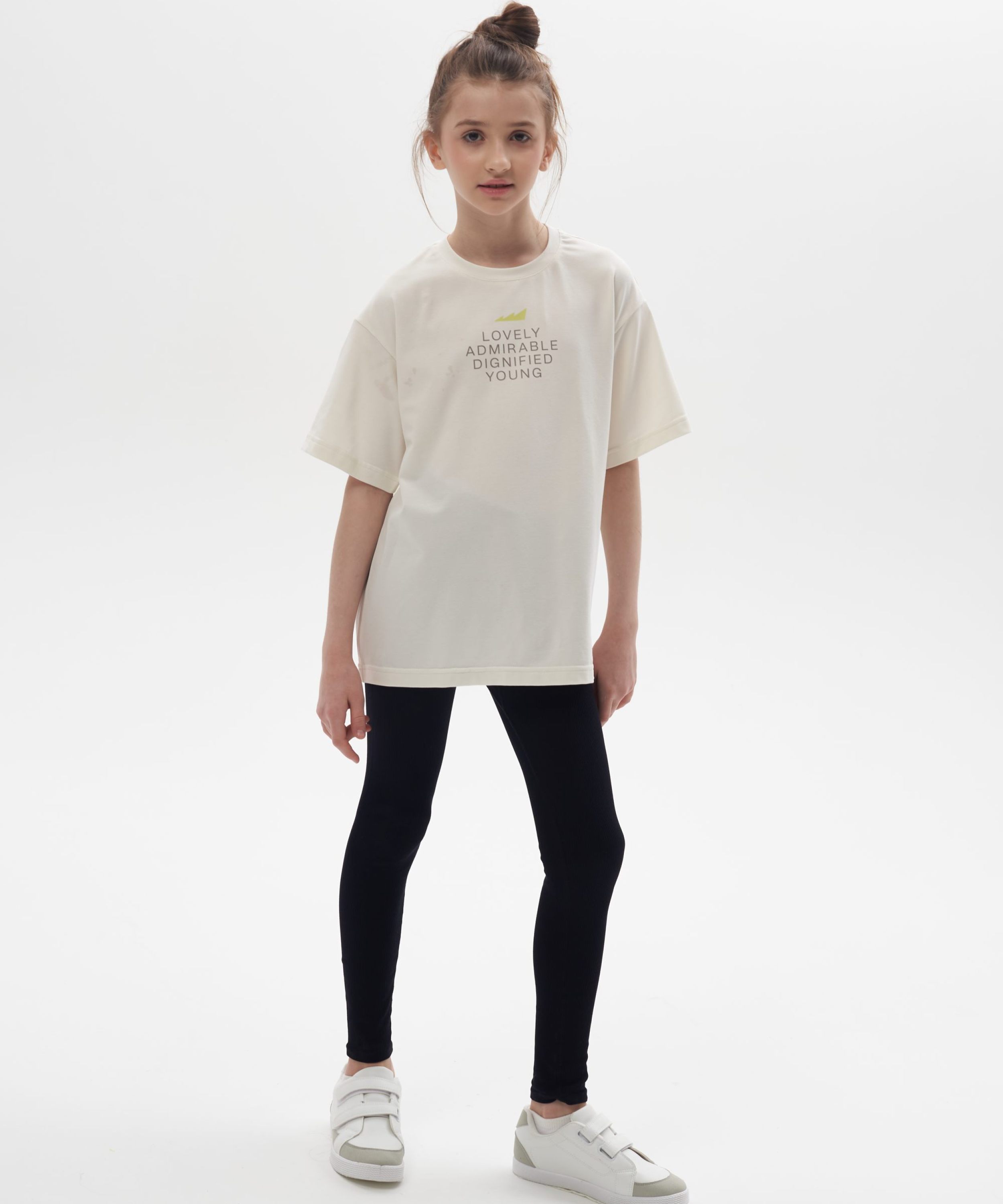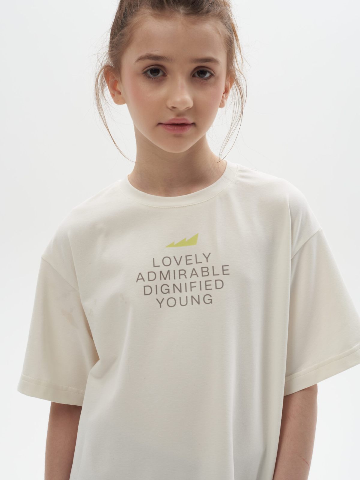 Детская футболка свободного кроя со спущенным плечом из хлопка с бархатистым эффектом. На передней части изделия и на спине расположены принты.
