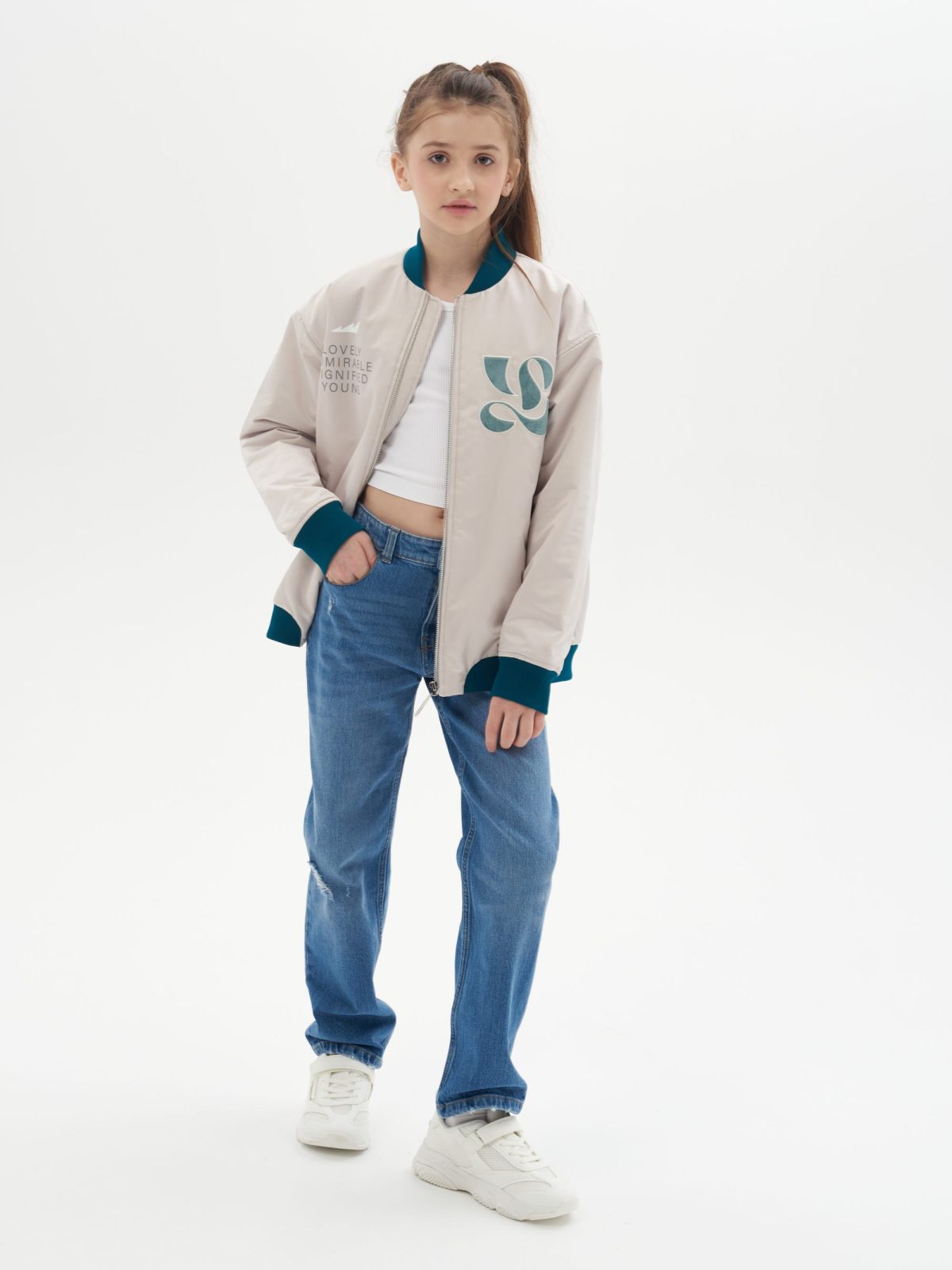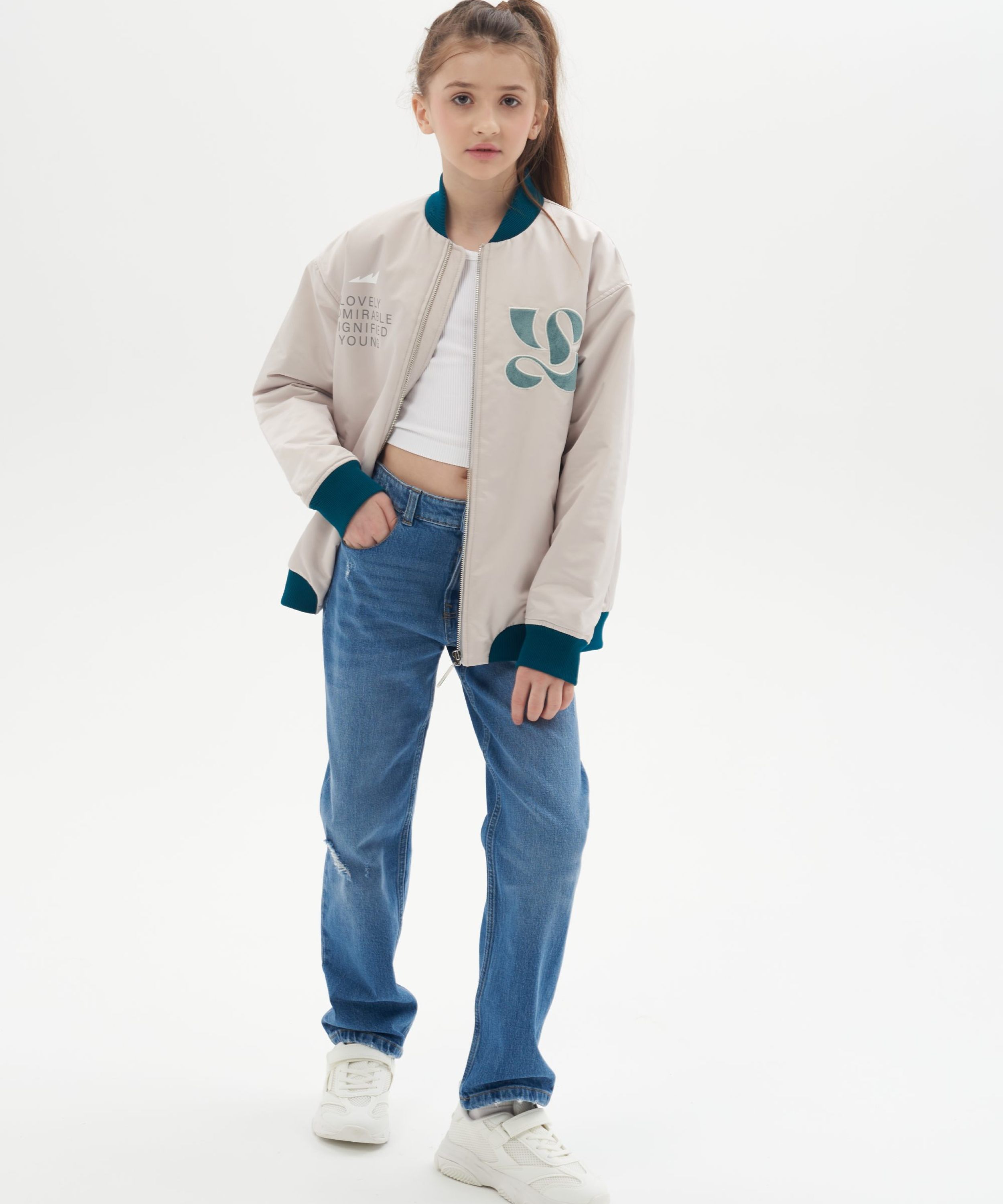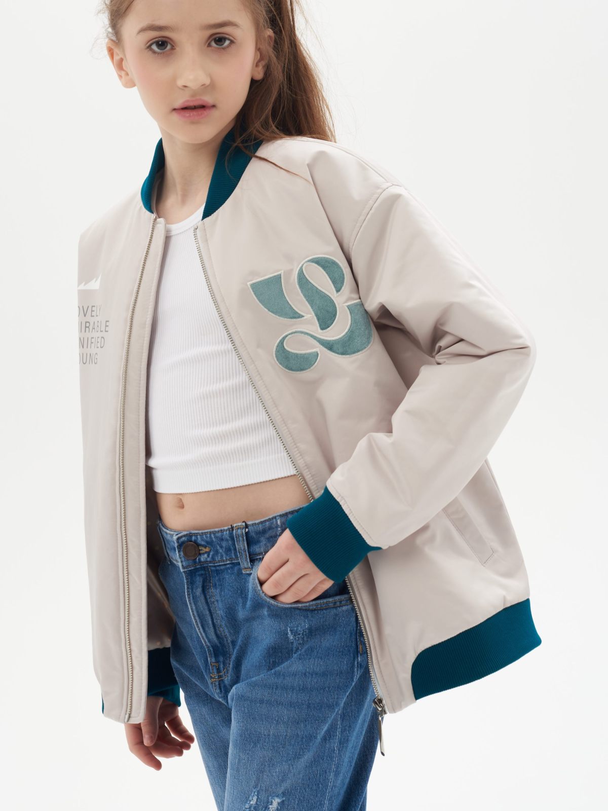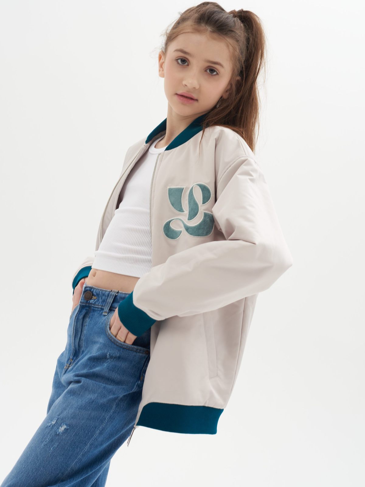 Детский бомбер свободного кроя имеет большую вышивку на передней части изделия с левой стороны и принт с правой, спущенное плечо, центральную застёжку на молнии с внутренней планкой, боковые карманы, контрастные манжеты и воротник. Бомбер отлично сочетается не только с моделями в спортивном стиле, а так же с джинсами и платьями.