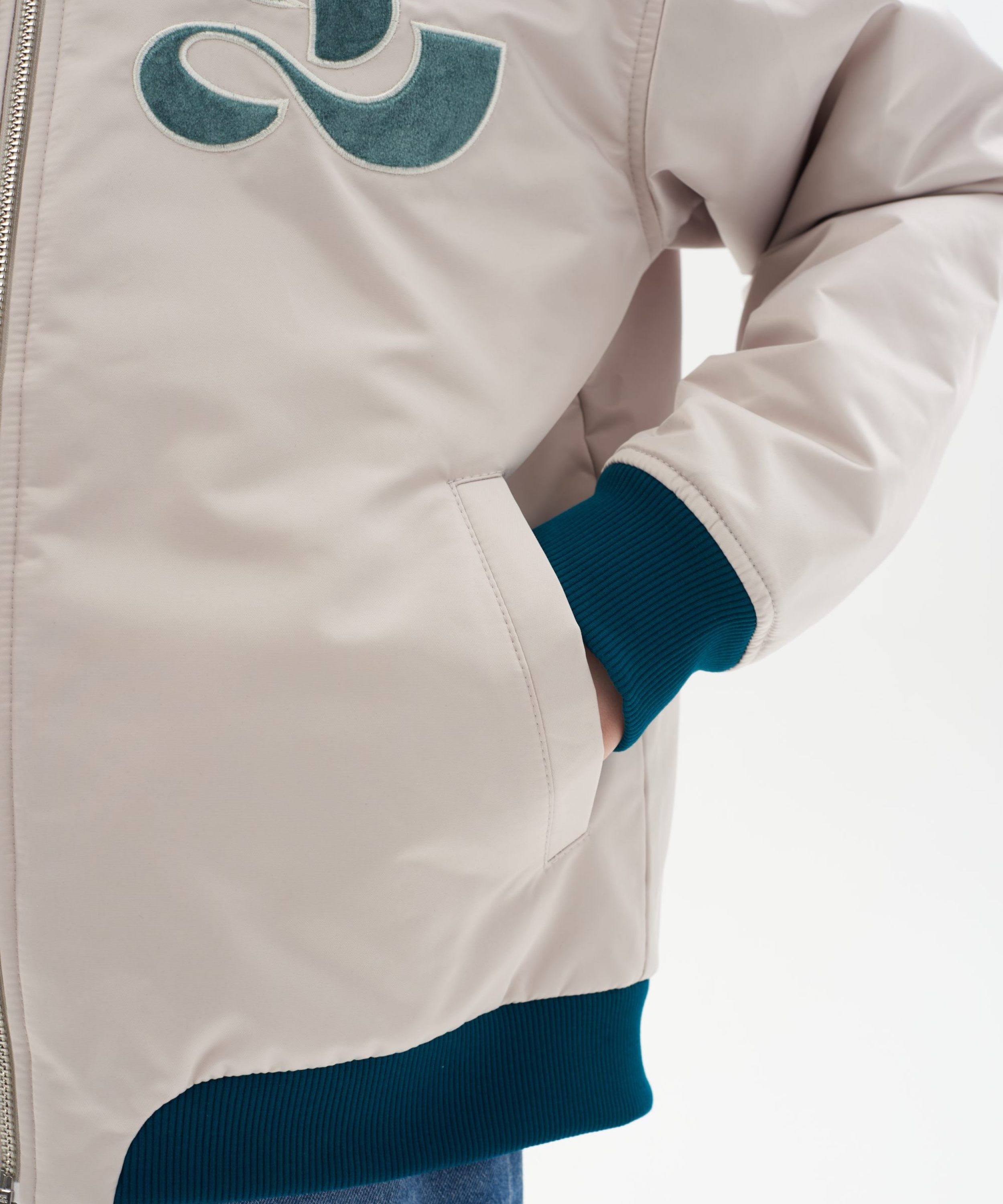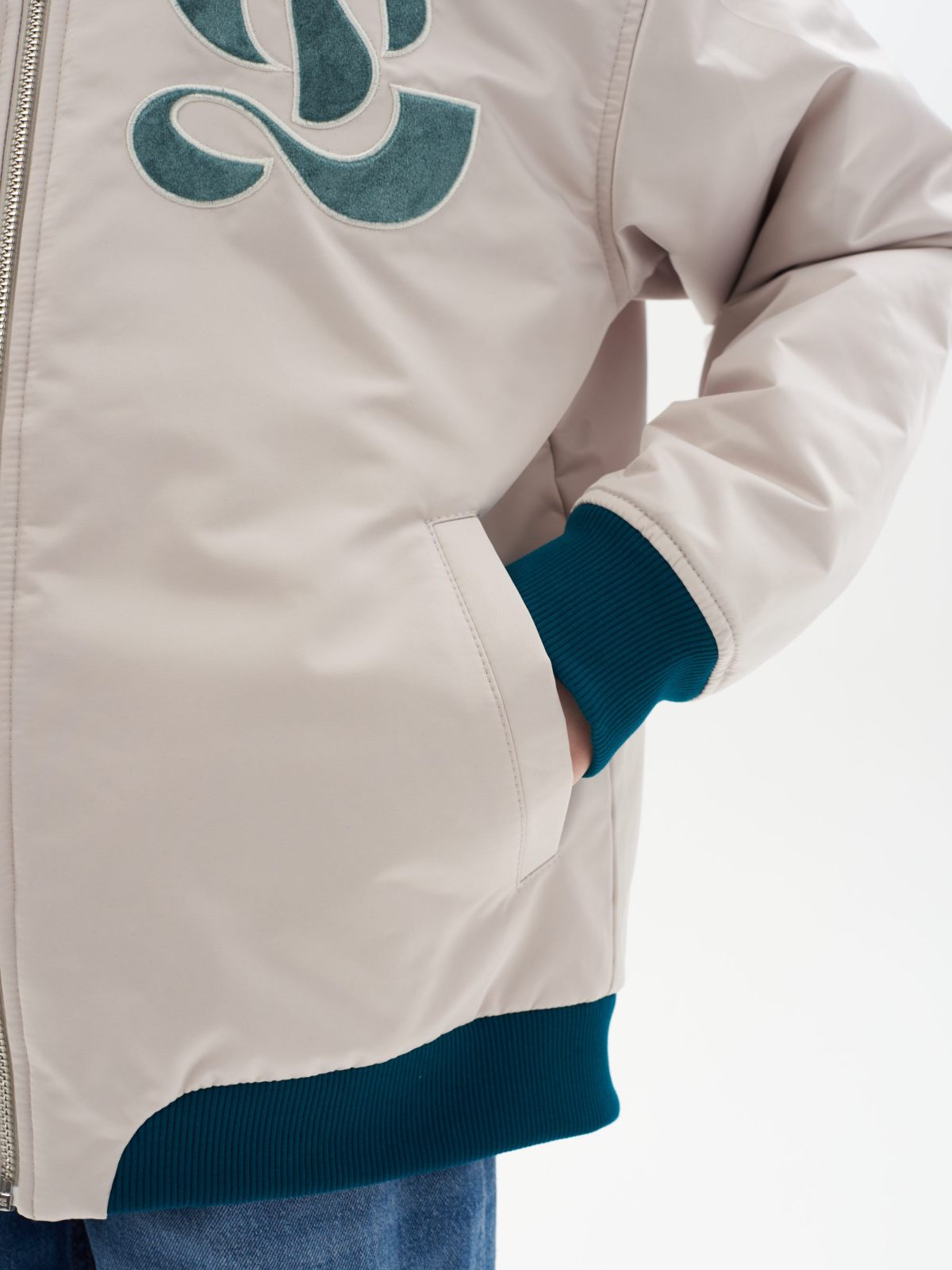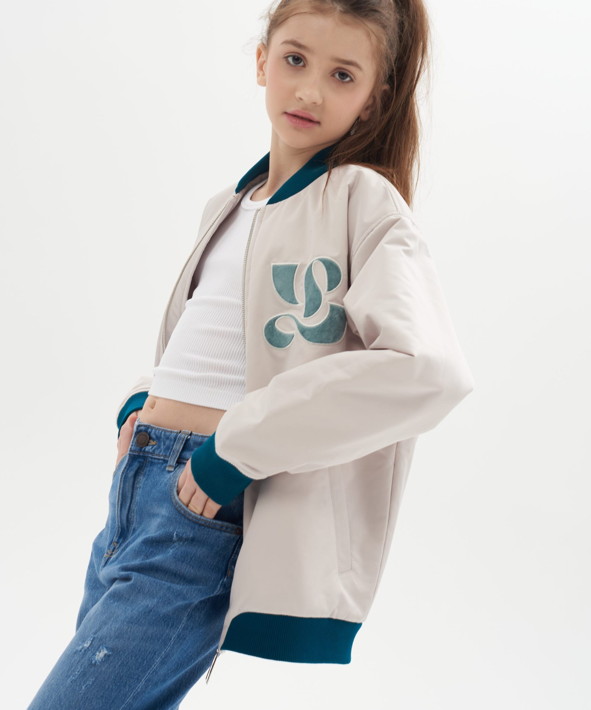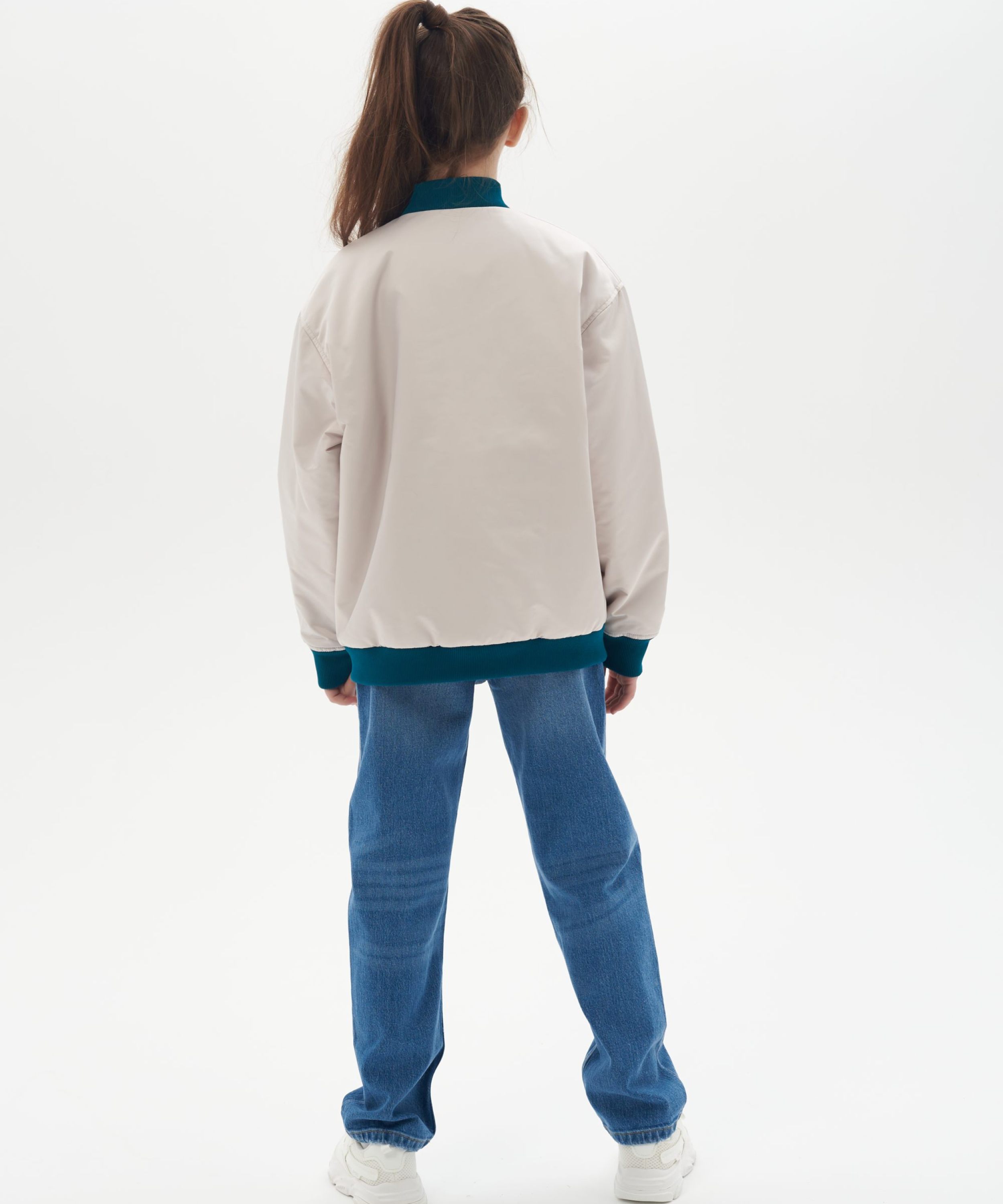Детский бомбер свободного кроя имеет большую вышивку на передней части изделия с левой стороны и принт с правой, спущенное плечо, центральную застёжку на молнии с внутренней планкой, боковые карманы, контрастные манжеты и воротник. Бомбер отлично сочетается не только с моделями в спортивном стиле, а так же с джинсами и платьями.