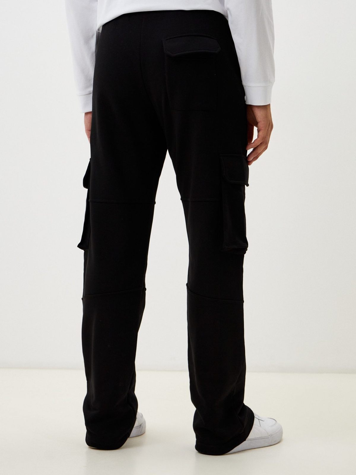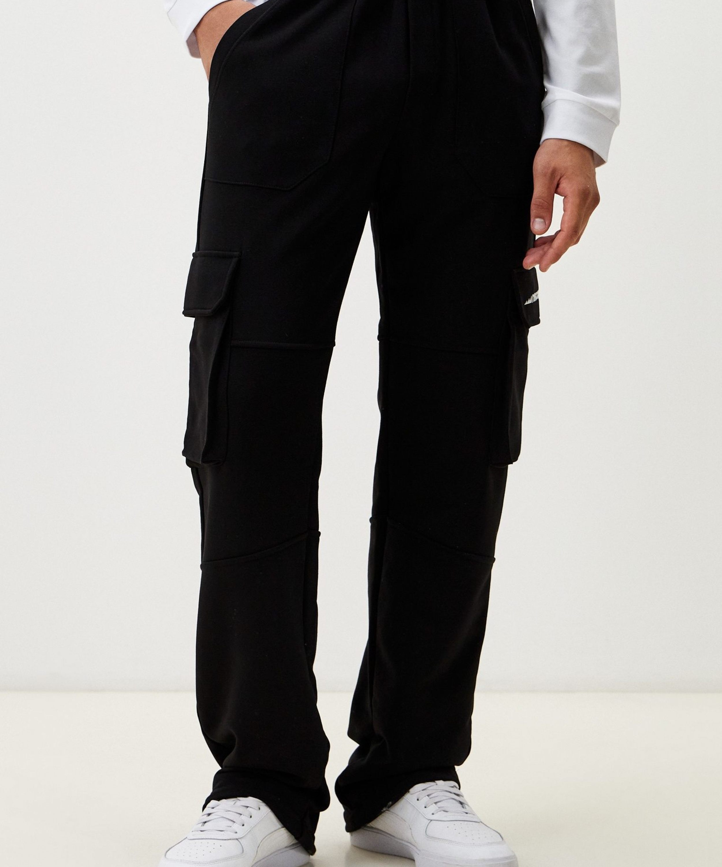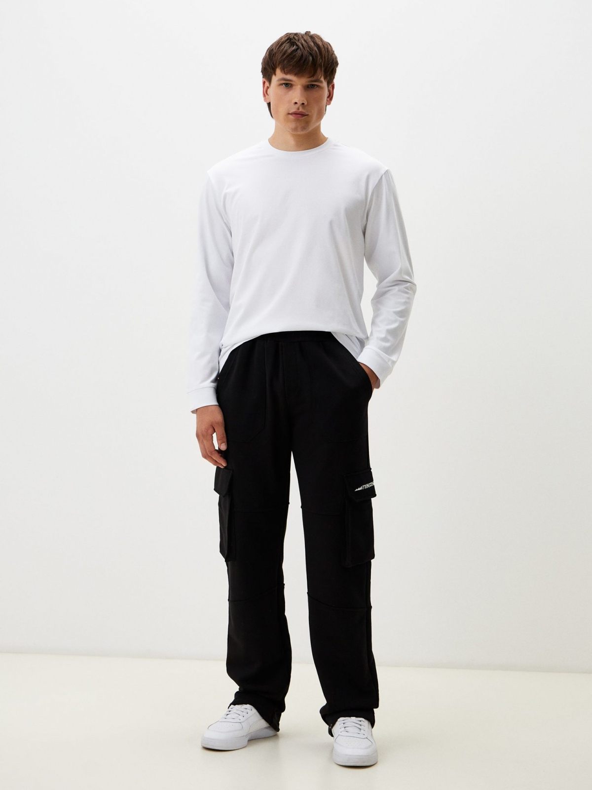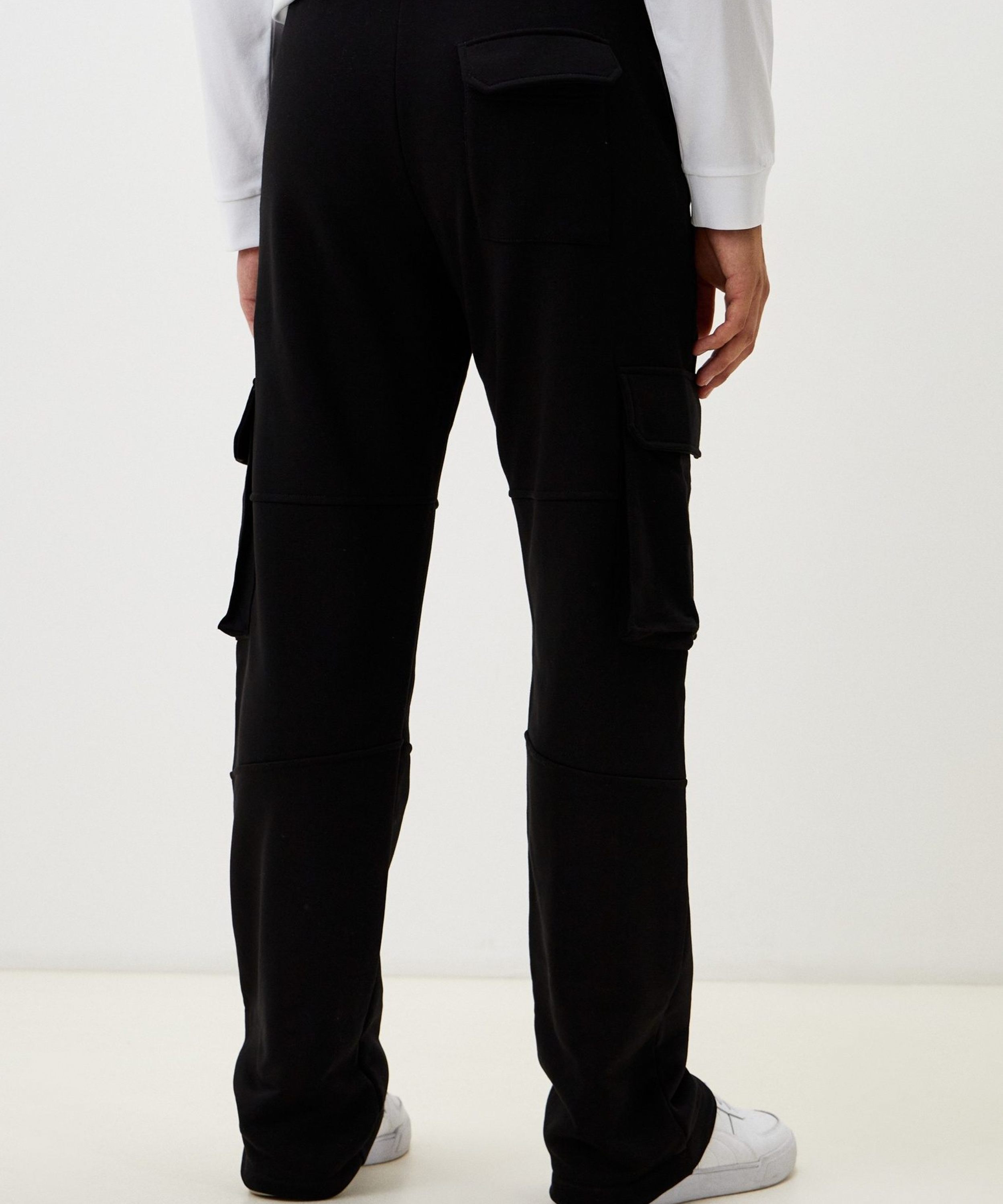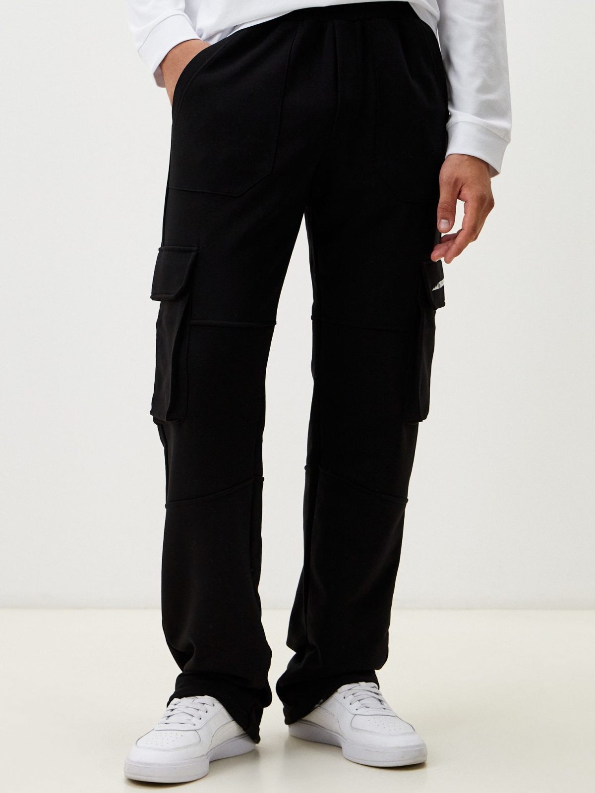 Мужские карго-брюки прямого силуэта Loose выполнены из материала, в составе которого 80% хлопка и 20% полиэстера. Имеют свободный крой, два классических и два больших боковых кармана-портфель с клапанами. Модель рассчитана на высокий рост. Эластичная резинка-утяжка в поясе помогает регулировать посадку. На левом кармане стильная брендовая вышивка. Легкий и приятный к телу материал брюк, трендовый силуэт и классический черный цвет позволяют создавать классные образы в спортивном стиле.