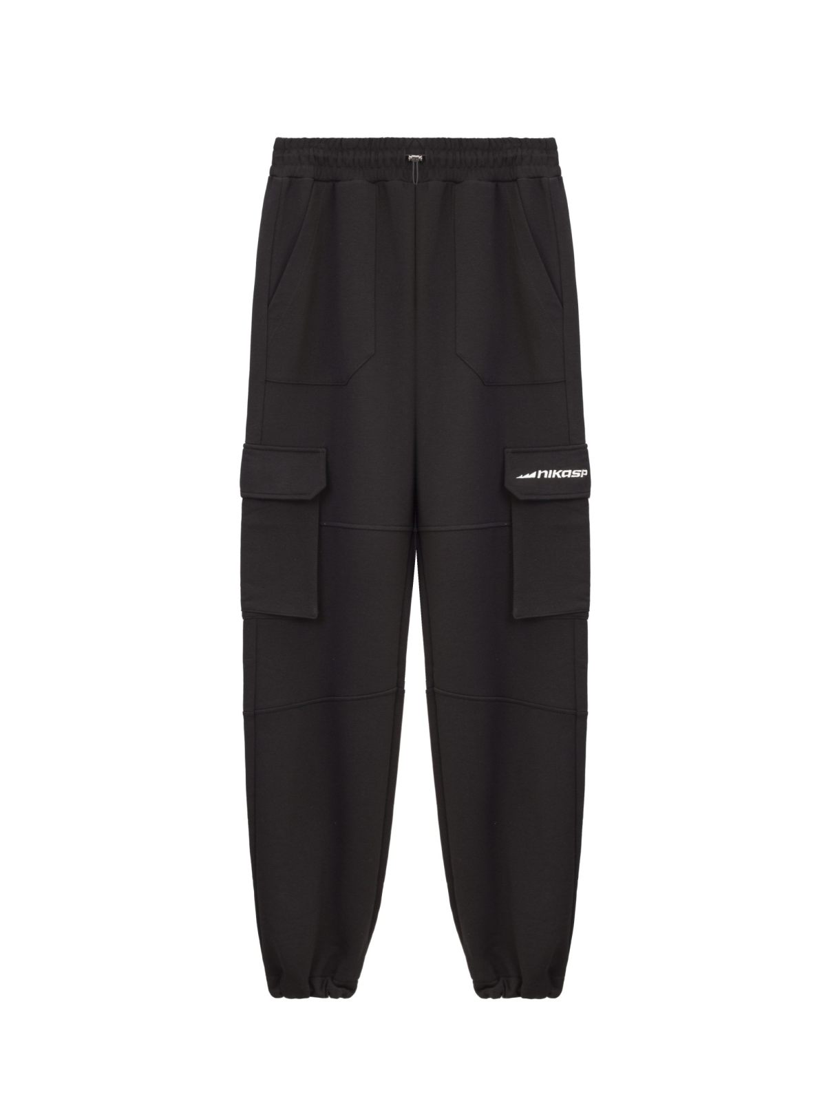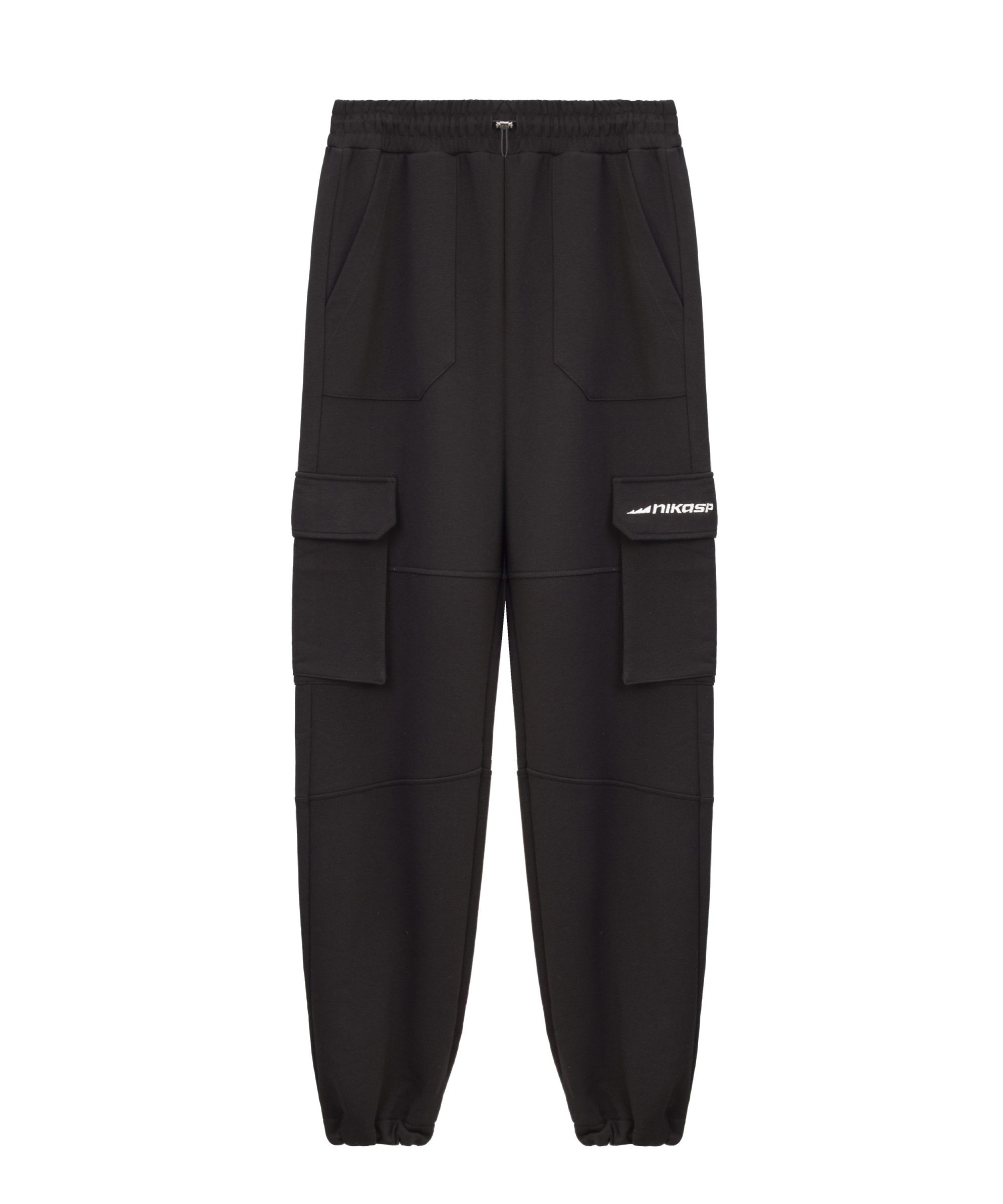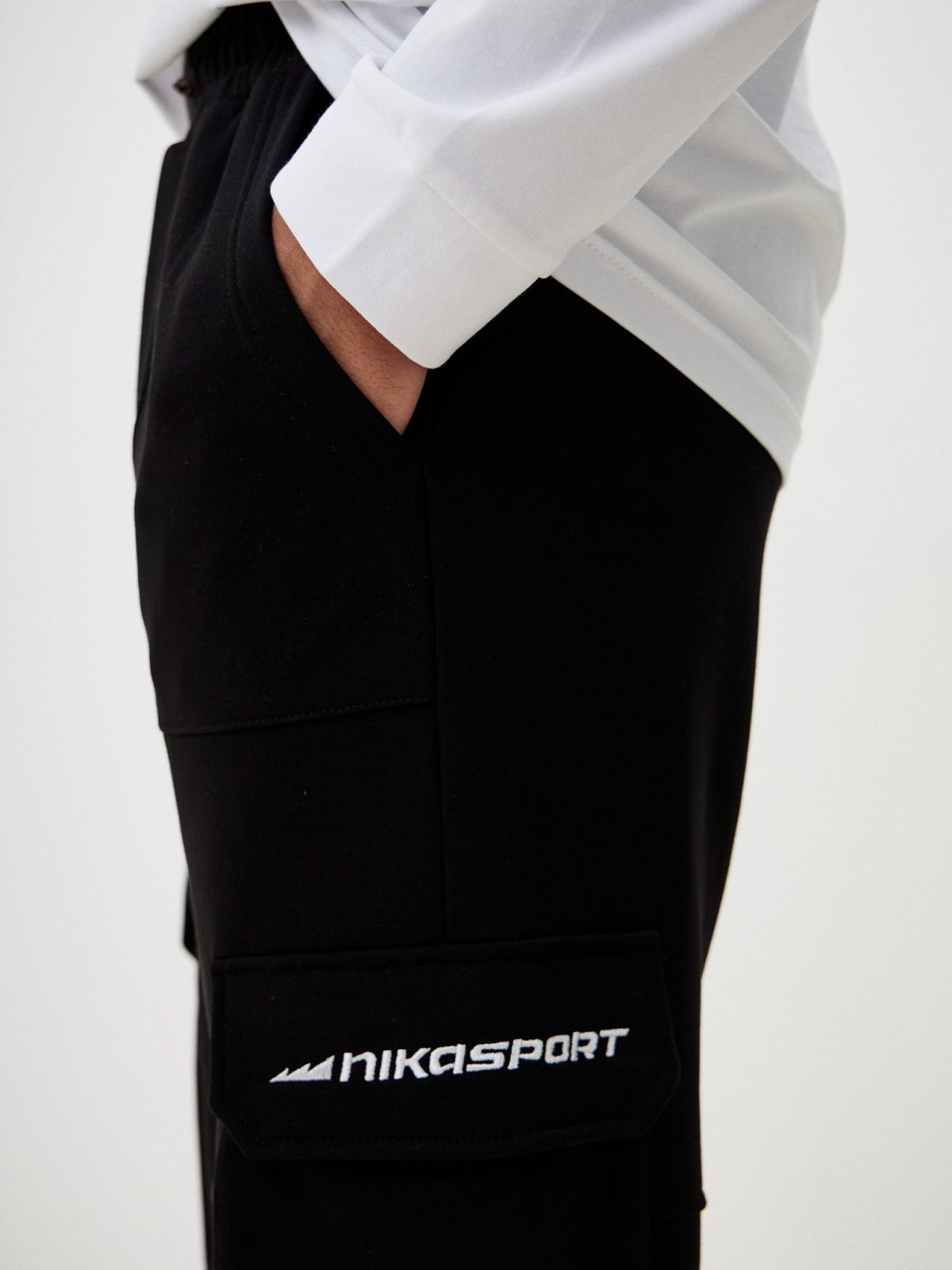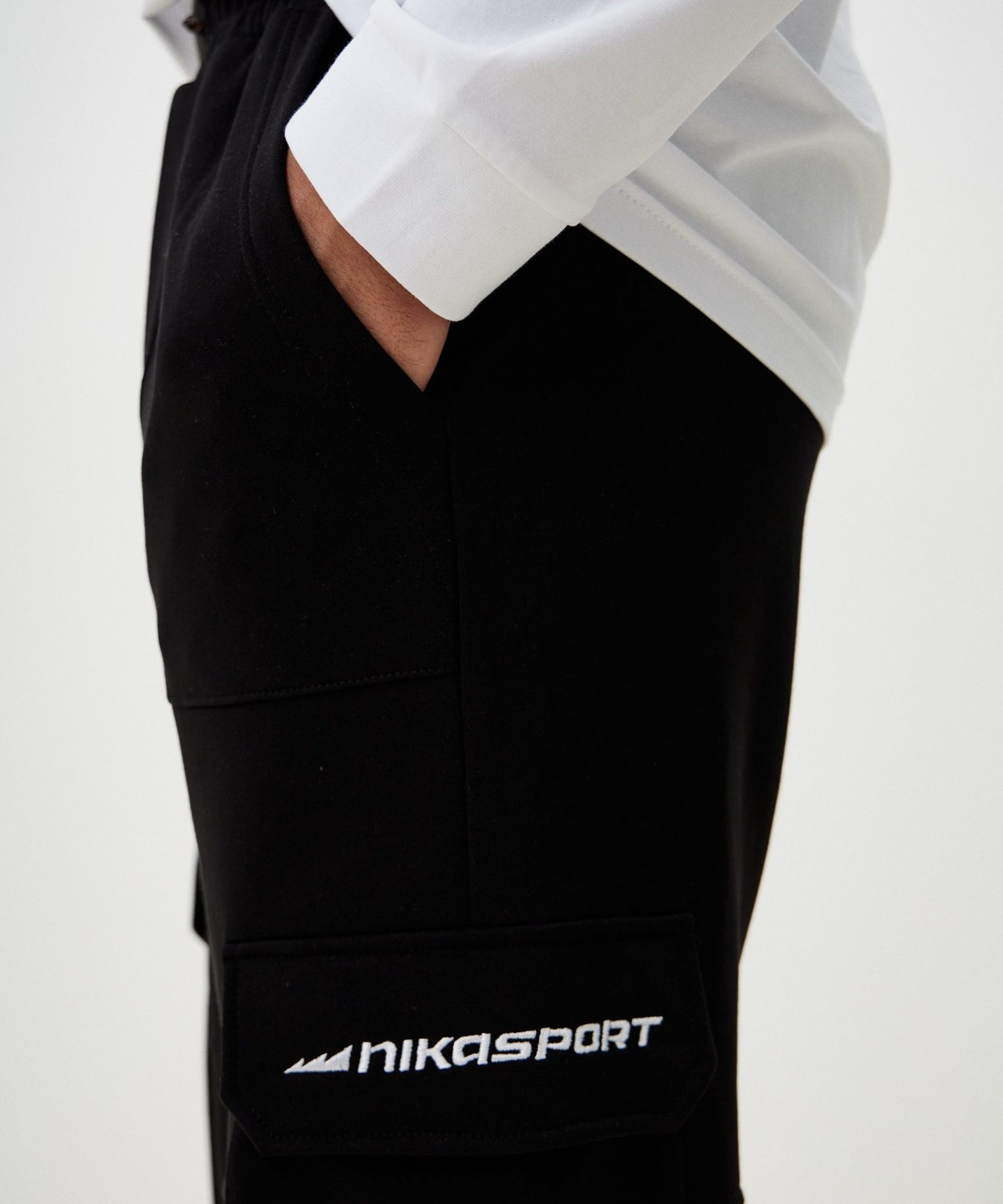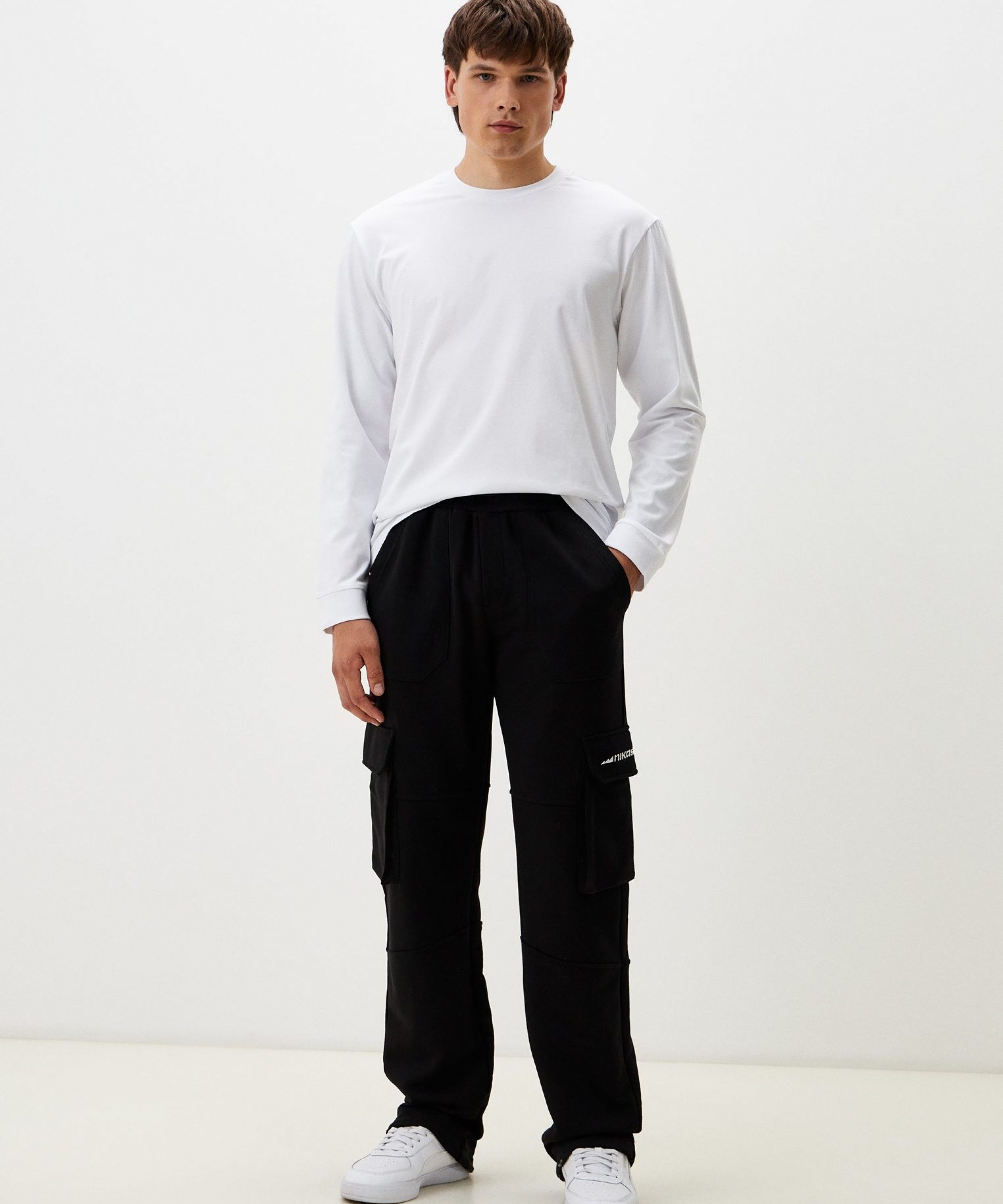 Мужские карго-брюки прямого силуэта Loose выполнены из материала, в составе которого 80% хлопка и 20% полиэстера. Имеют свободный крой, два классических и два больших боковых кармана-портфель с клапанами. Модель рассчитана на высокий рост. Эластичная резинка-утяжка в поясе помогает регулировать посадку. На левом кармане стильная брендовая вышивка. Легкий и приятный к телу материал брюк, трендовый силуэт и классический черный цвет позволяют создавать классные образы в спортивном стиле.