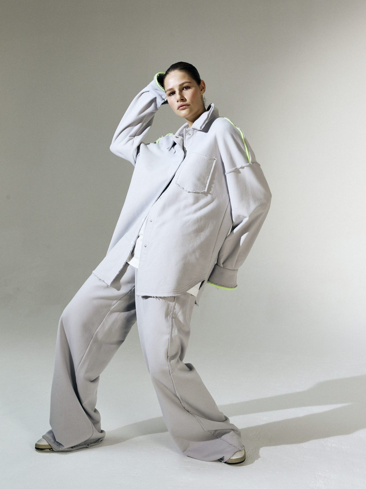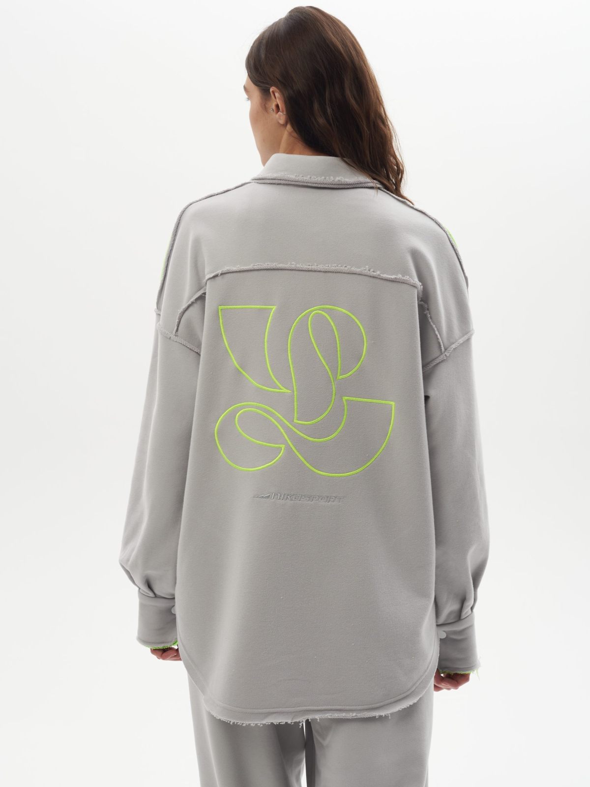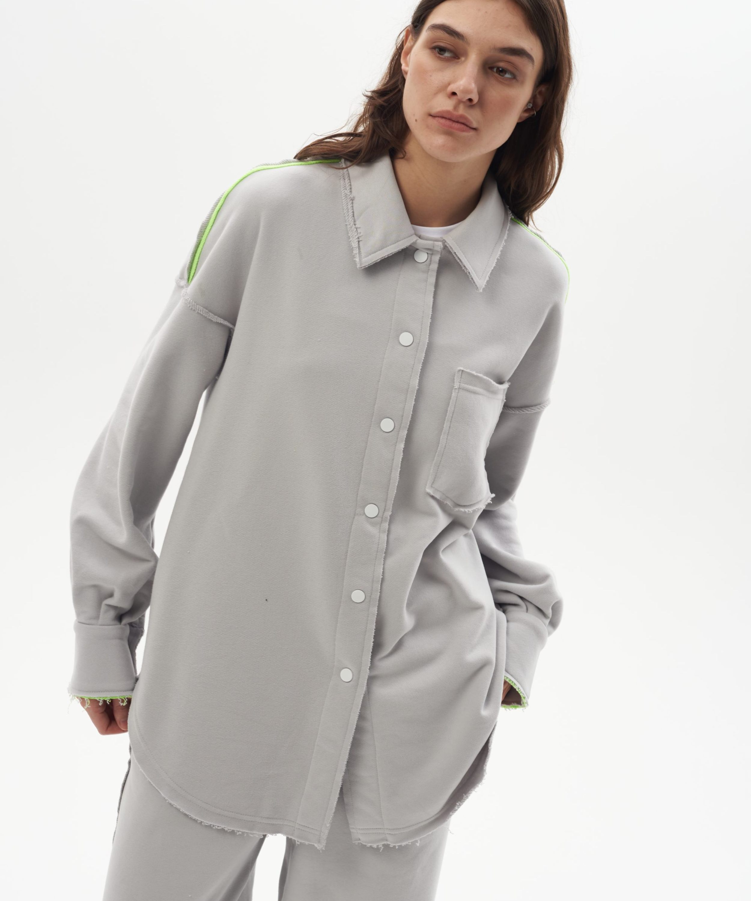 Рубашка oversize силуэта выполнена из плотного хлопка с бархатистым эффектом. Рубашка имеет спущенную линию плеча, классический воротник, необработанные края, в том числе на кокетке, объемный карман на груди, декоративные контрастные вставки и вышивку на спине.