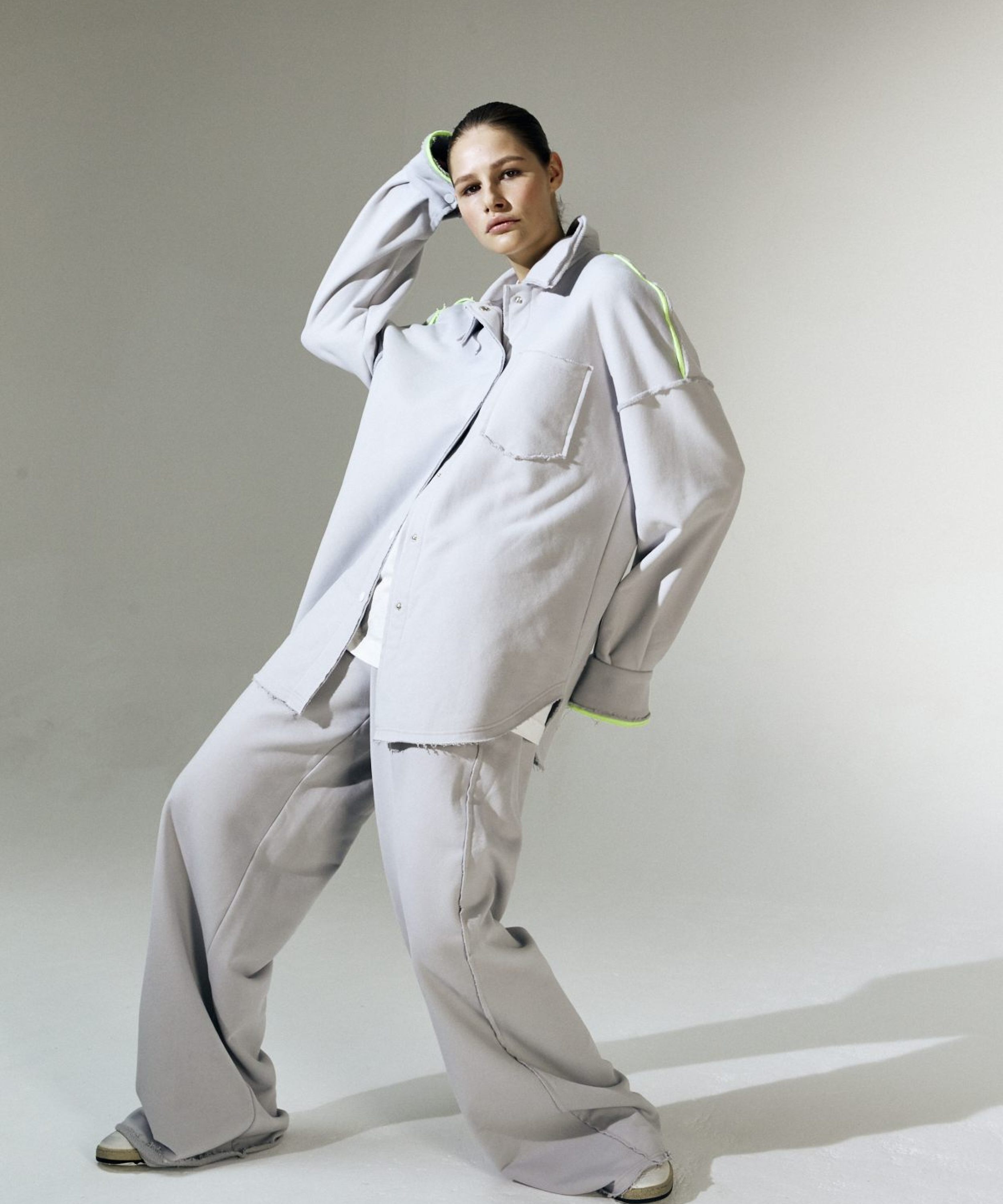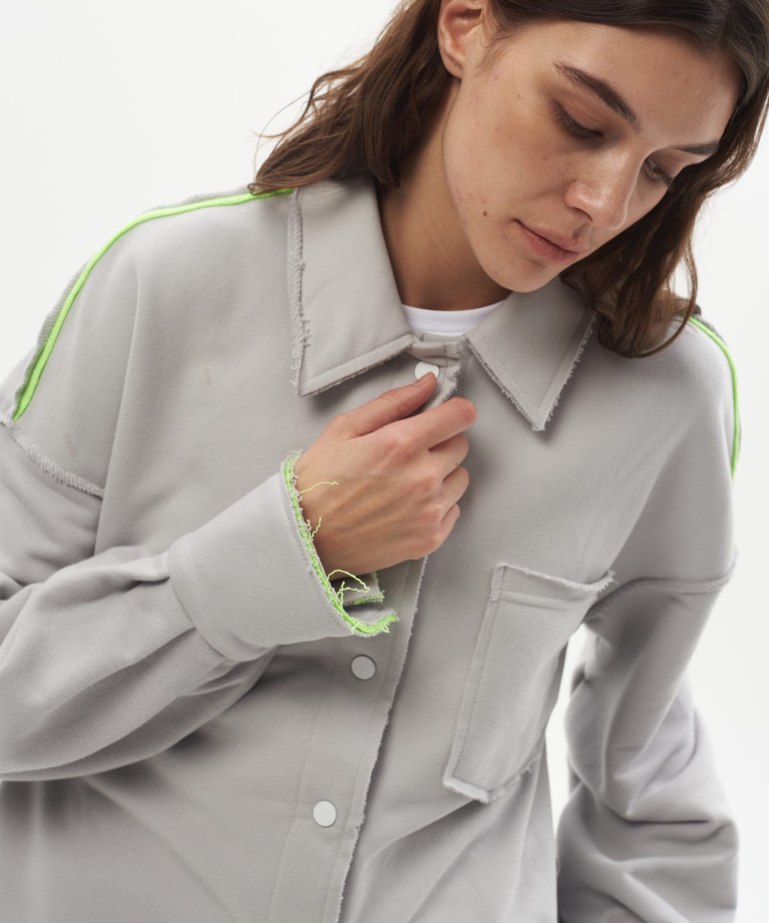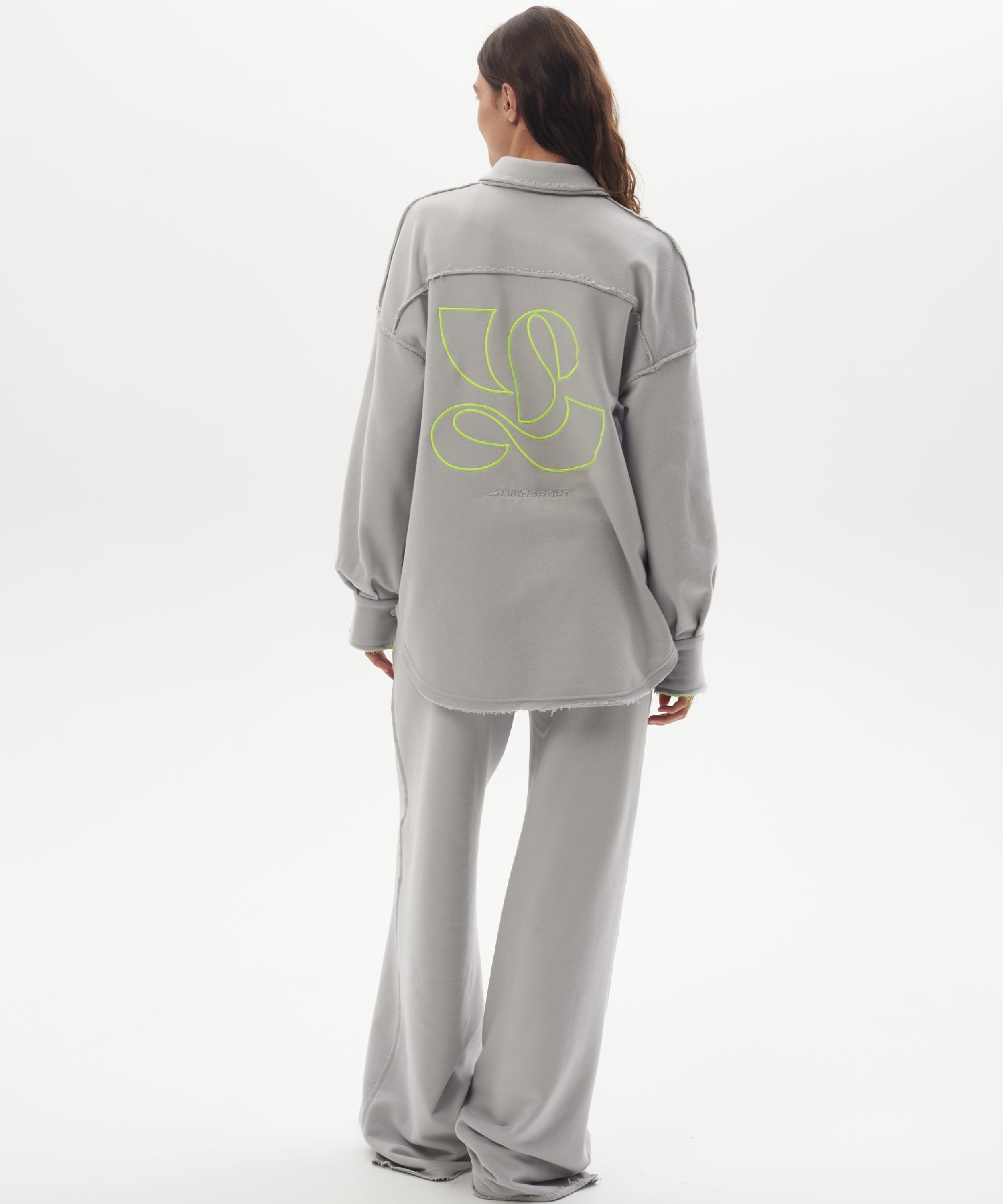 Рубашка oversize силуэта выполнена из плотного хлопка с бархатистым эффектом. Рубашка имеет спущенную линию плеча, классический воротник, необработанные края, в том числе на кокетке, объемный карман на груди, декоративные контрастные вставки и вышивку на спине.
