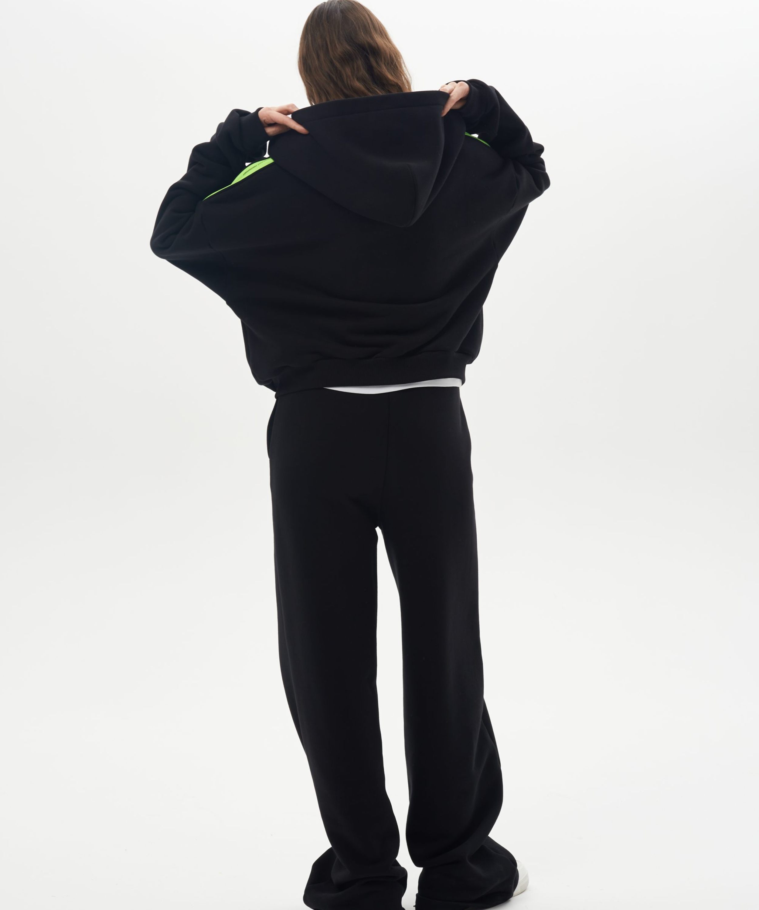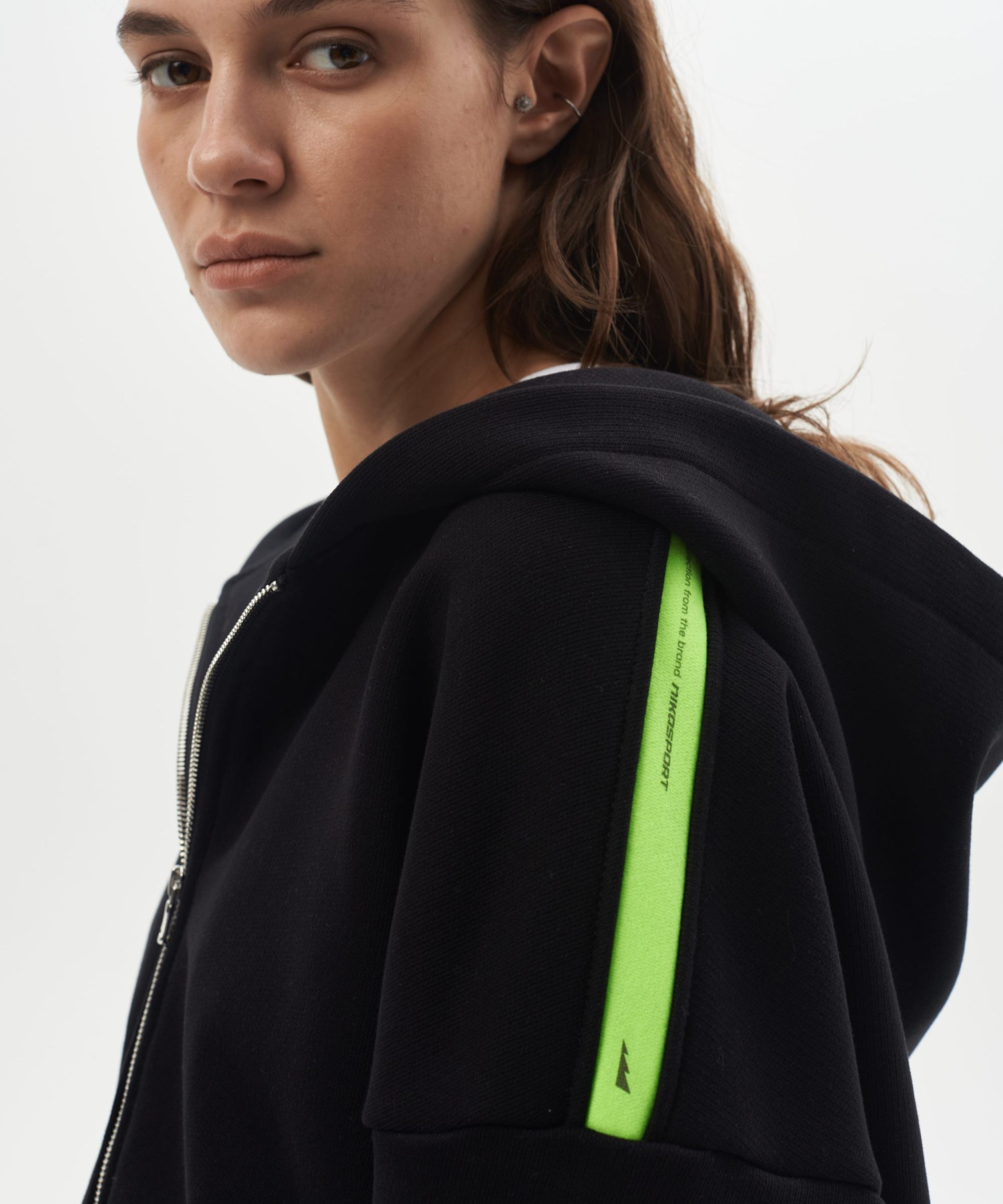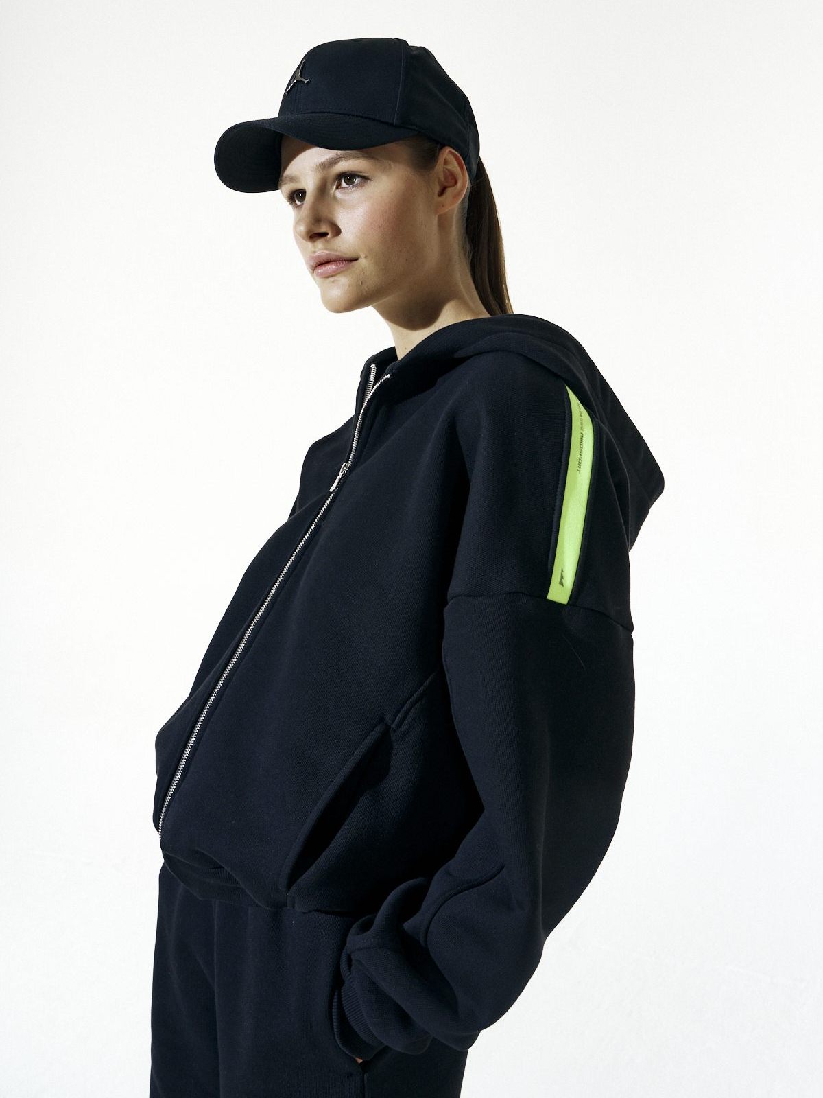 Укороченный oversize худи со спущенным плечом, фигурными боковыми вставками, которые продолжаются по рукаву, боковыми карманами, большим одношовным капюшоном и контрастными вставками на плечах с логотипом коллекции. Ассиметричный низ худи и oversize капюшон позволяют создать стильный современный комфортный образ в спортивном стиле.