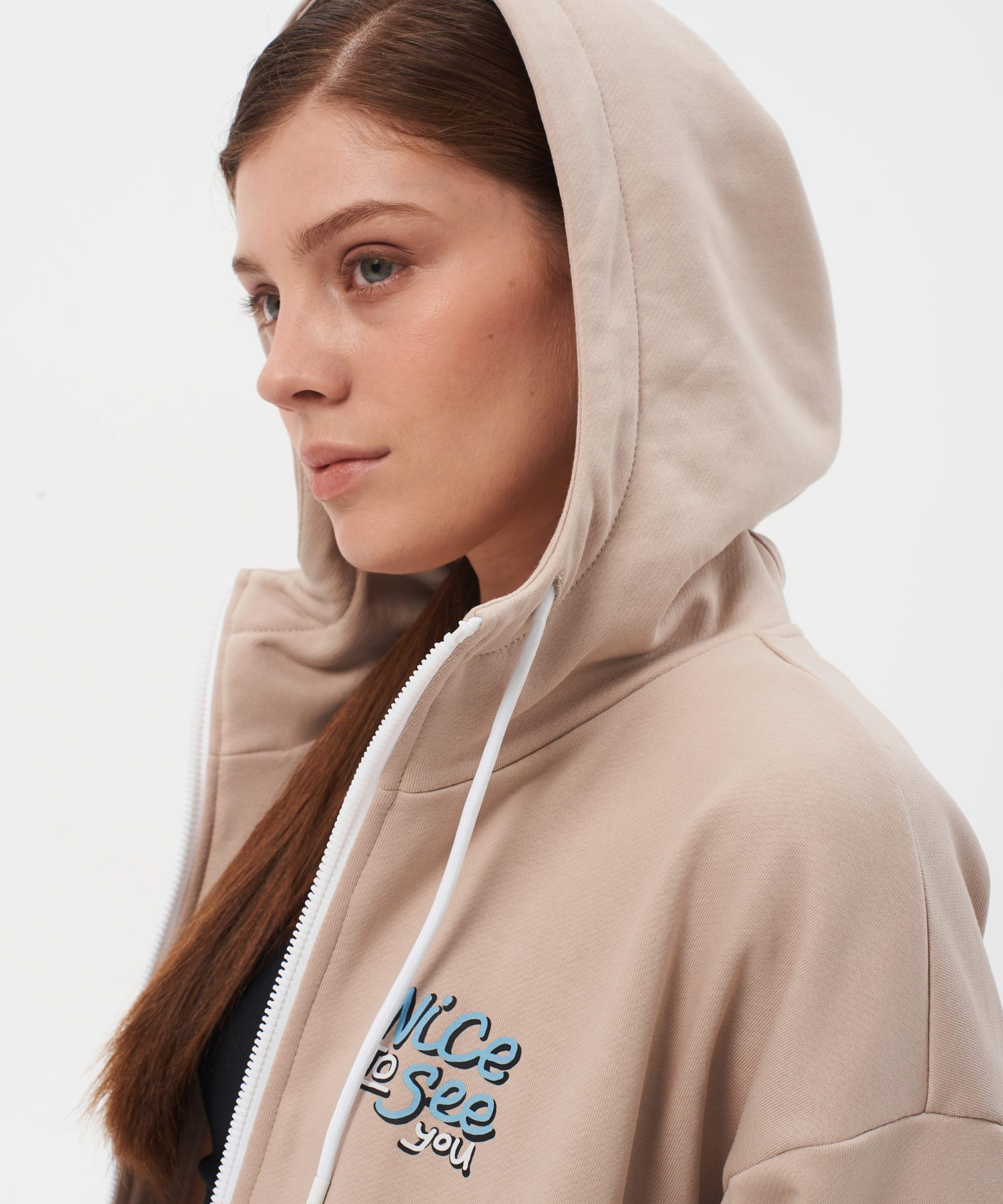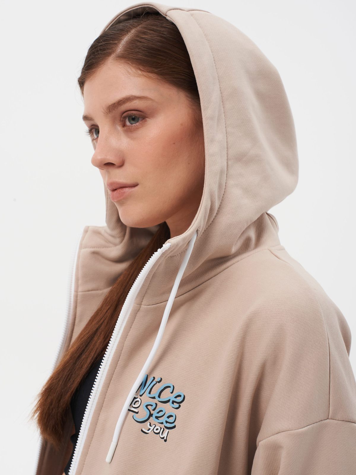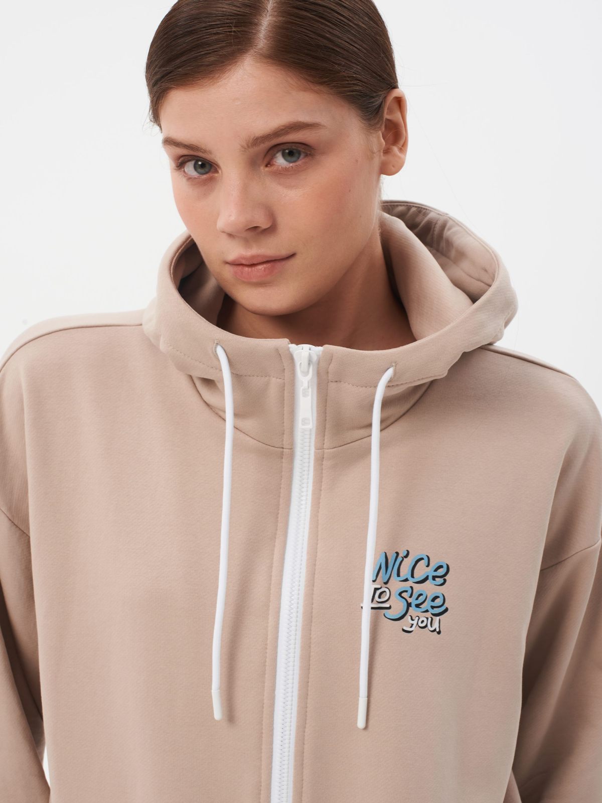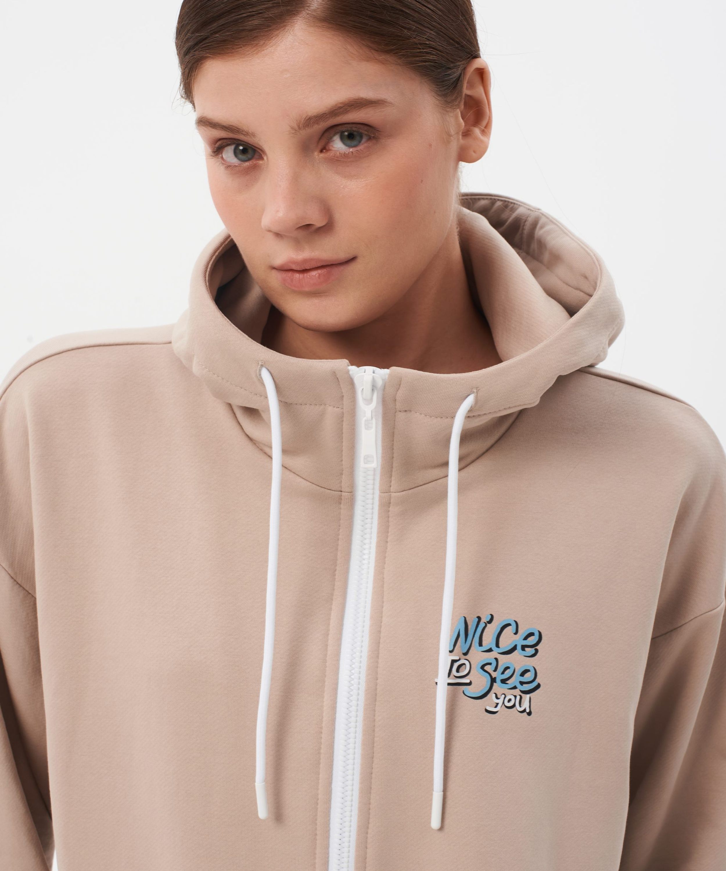 Классическая женская толстовка на молнии. В составе 90% хлопка и 10% полиэстера, что обеспечивает отличную посадку и долговечность изделия. Спущенная линия плеча, свободный крой, высокий воротник на утяжке с капюшоном превращают толстовку в уютный атрибут посведневной одежды. Представлена в сезонных цветах мята и капучино, на груди расположен нежный принт. Модель не сковывает движения и позволяет создавать многослойные образы.