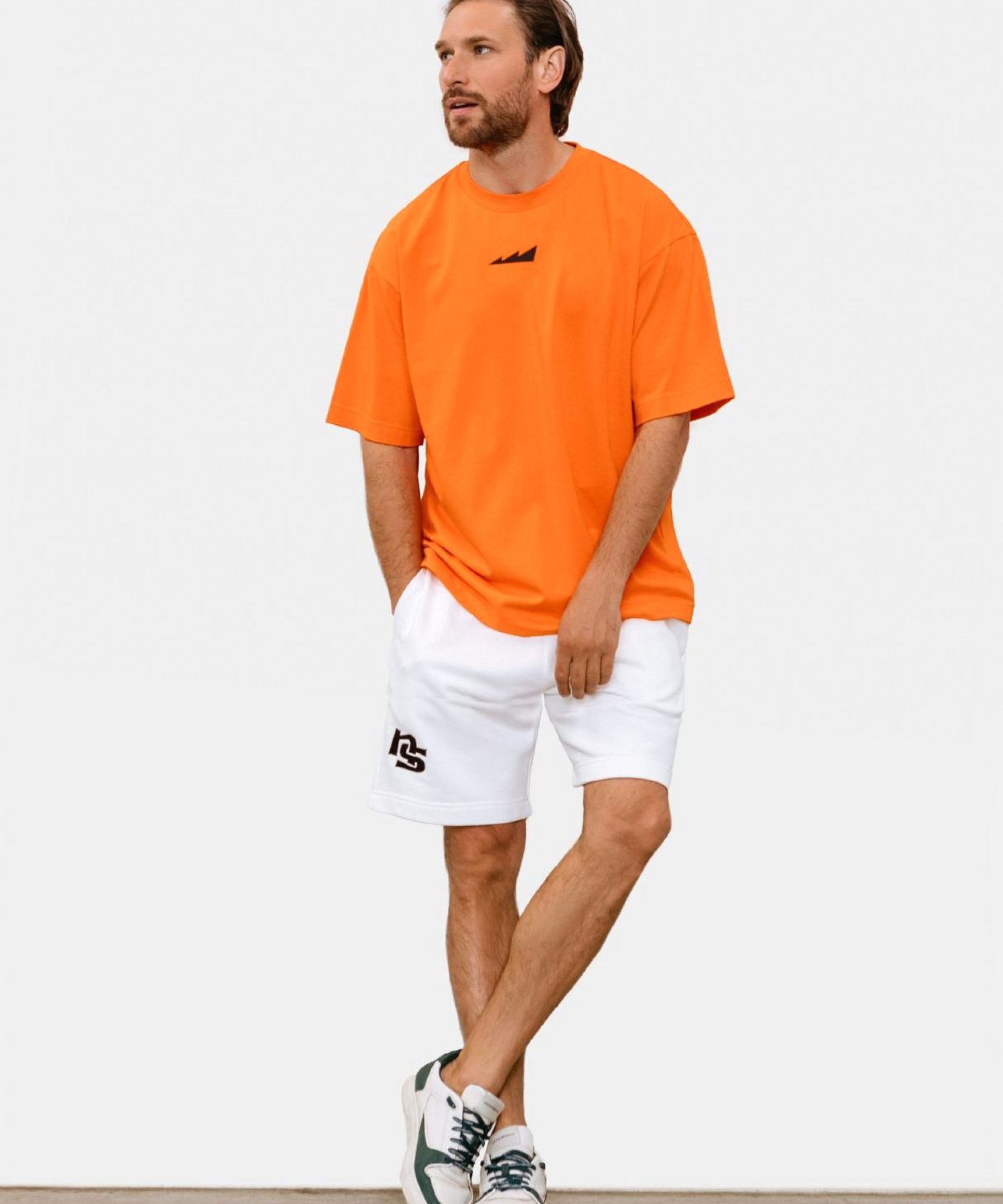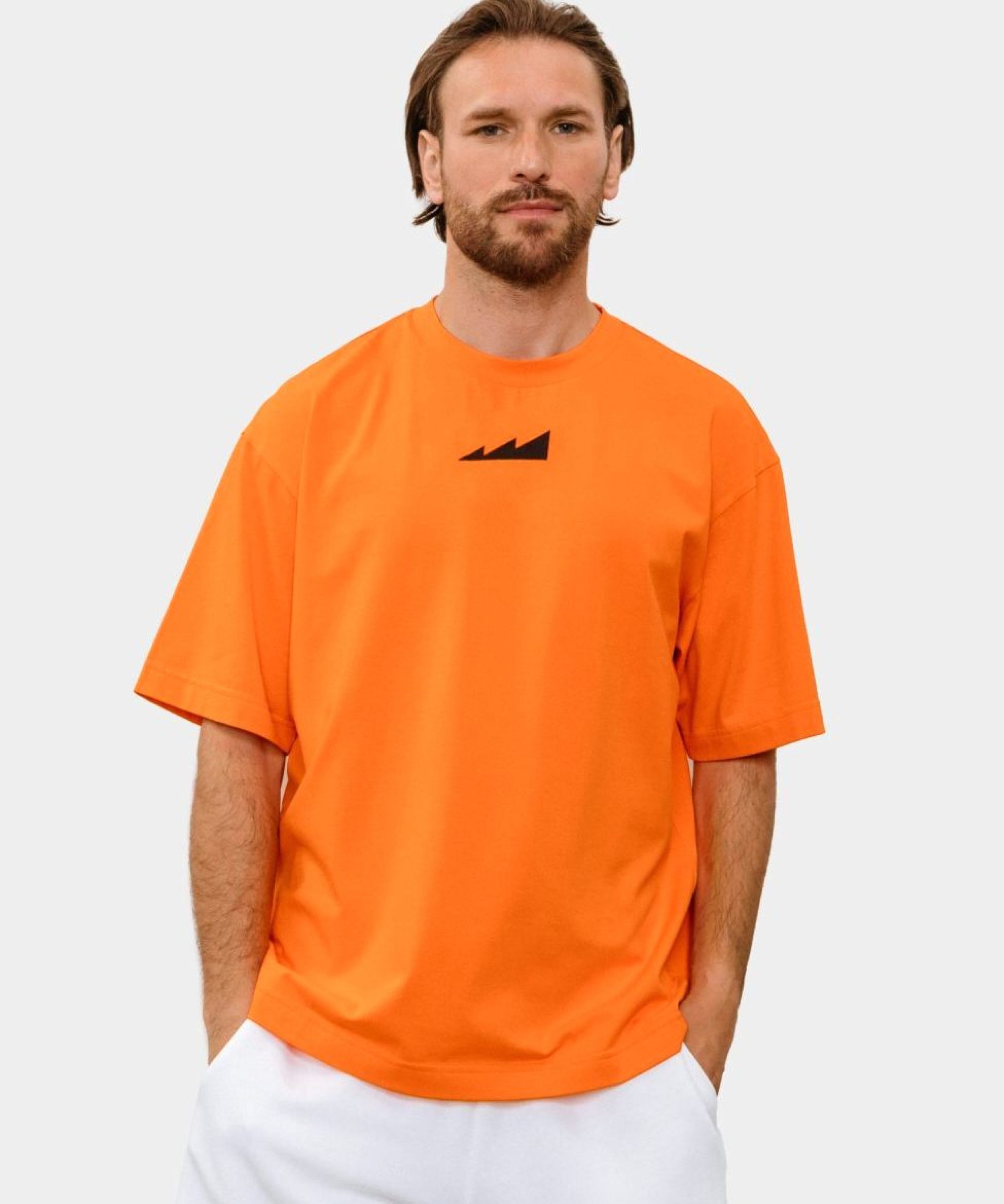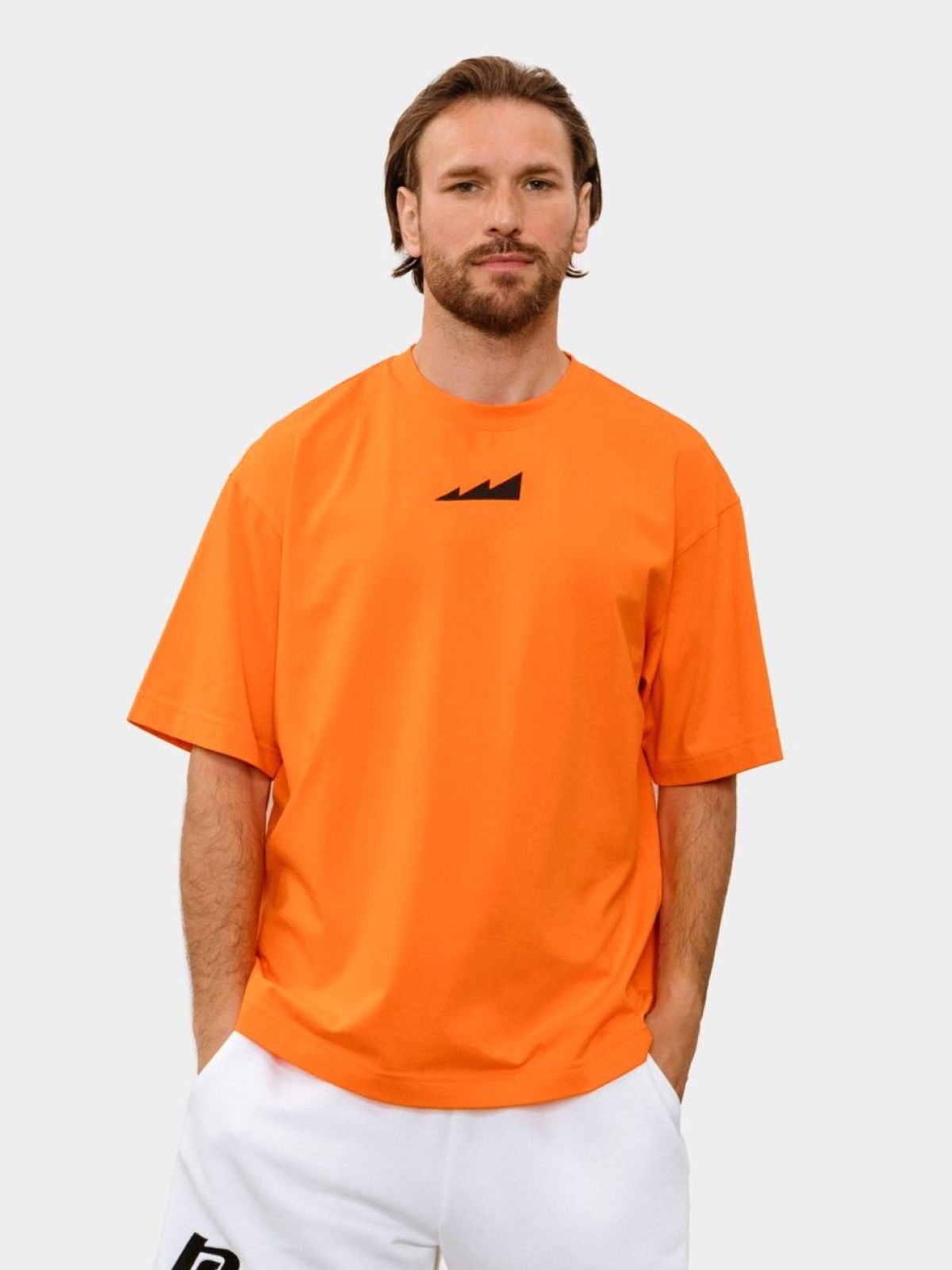 Мужская футболка oversize силуэта. Выполнена из материала, в составе которого 95% хлопка и 5% эластана, за счет чего футболка лучше держит форму. На груди и на плече расположены логотипы бренда. Модель представлена в ярком оранжевом цвете и легко сочетается как со спортивной так и с повседневной одеждой.