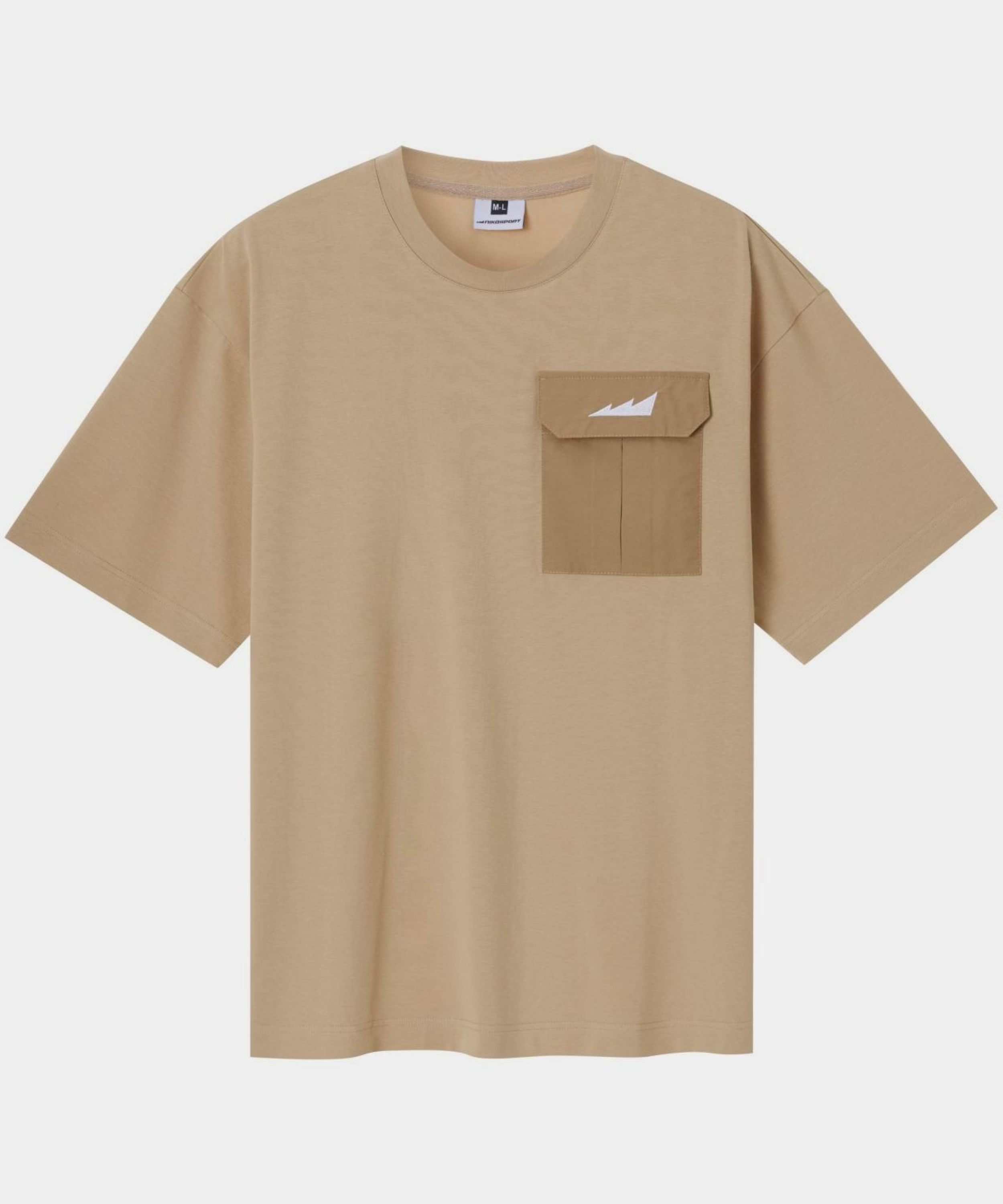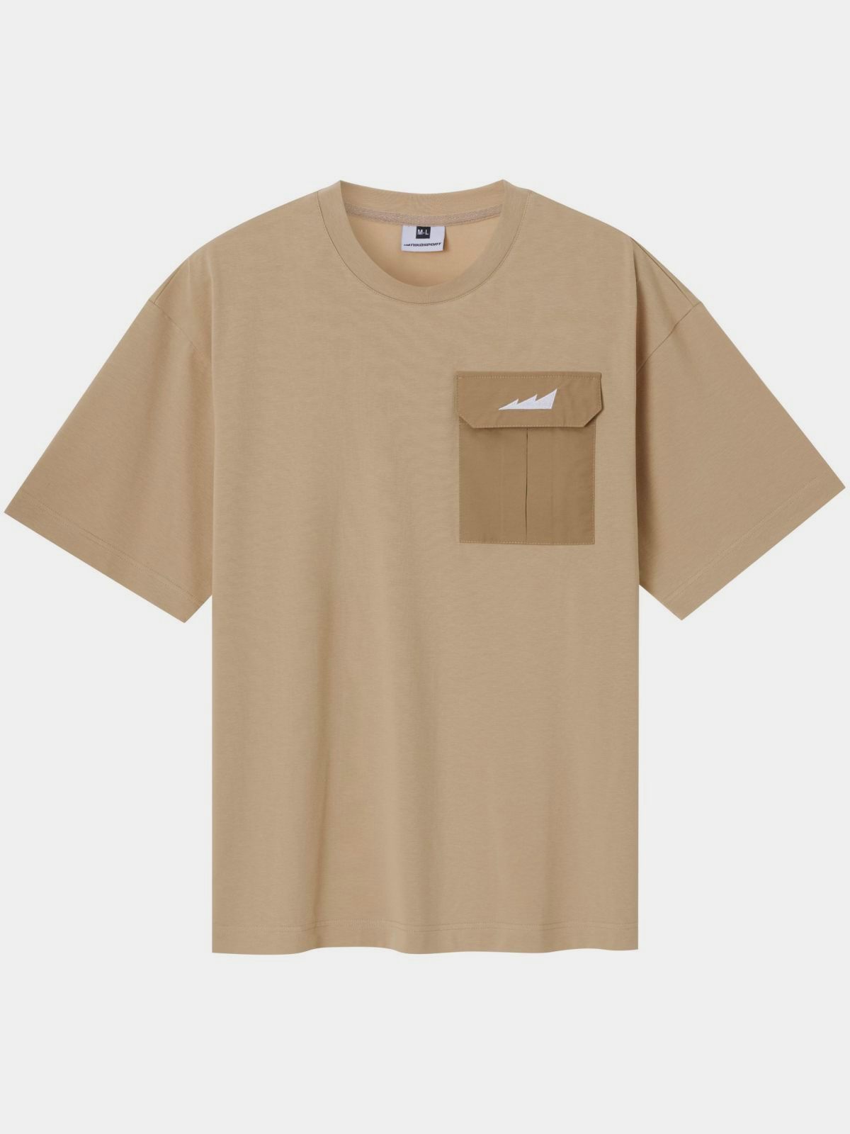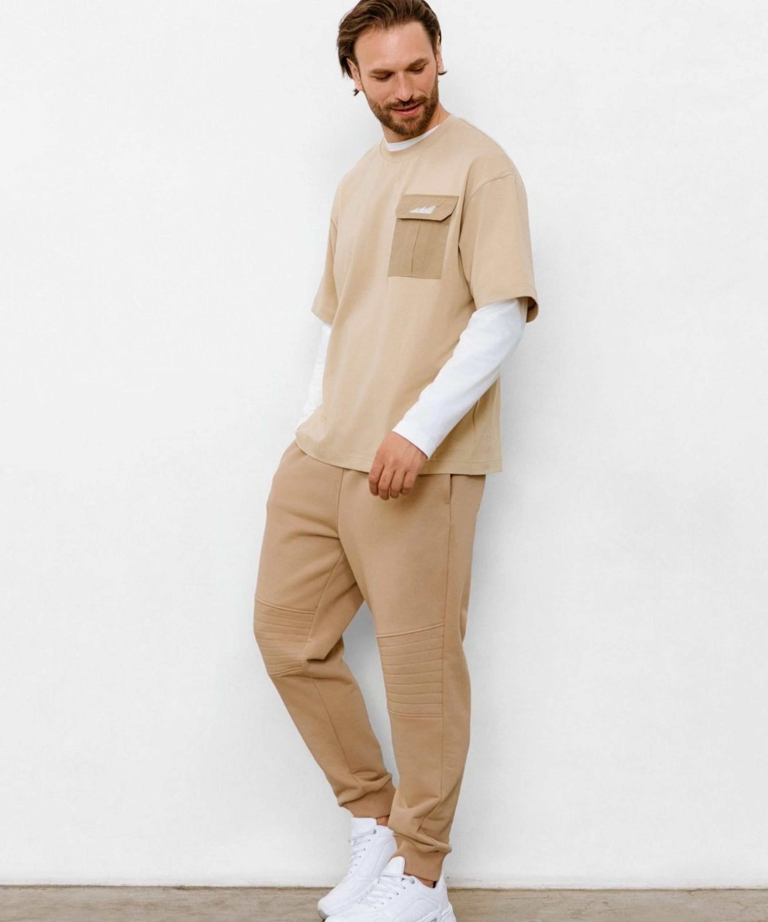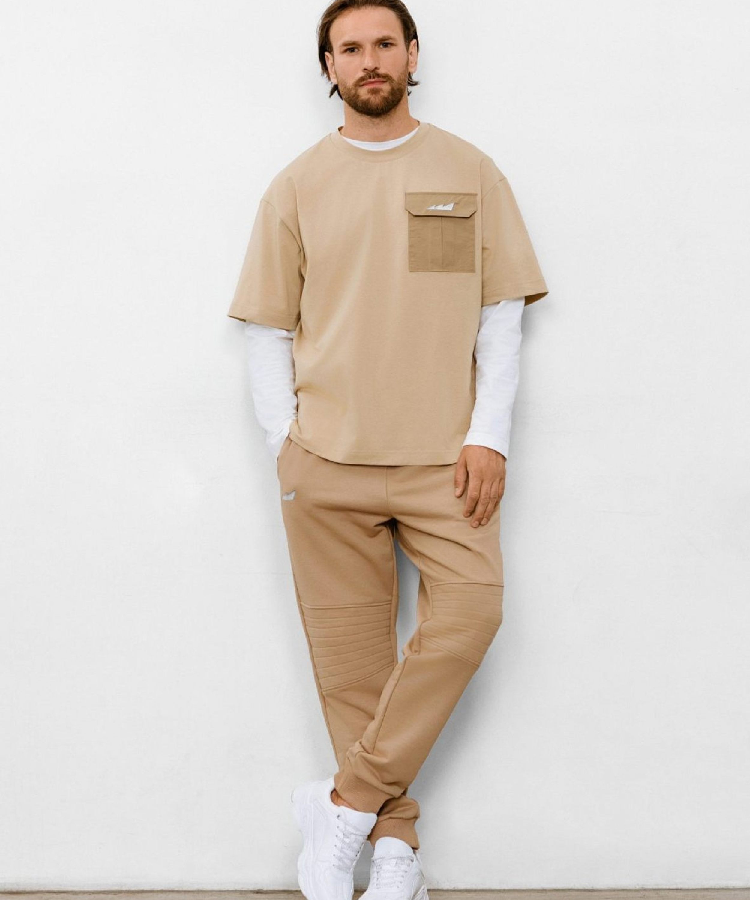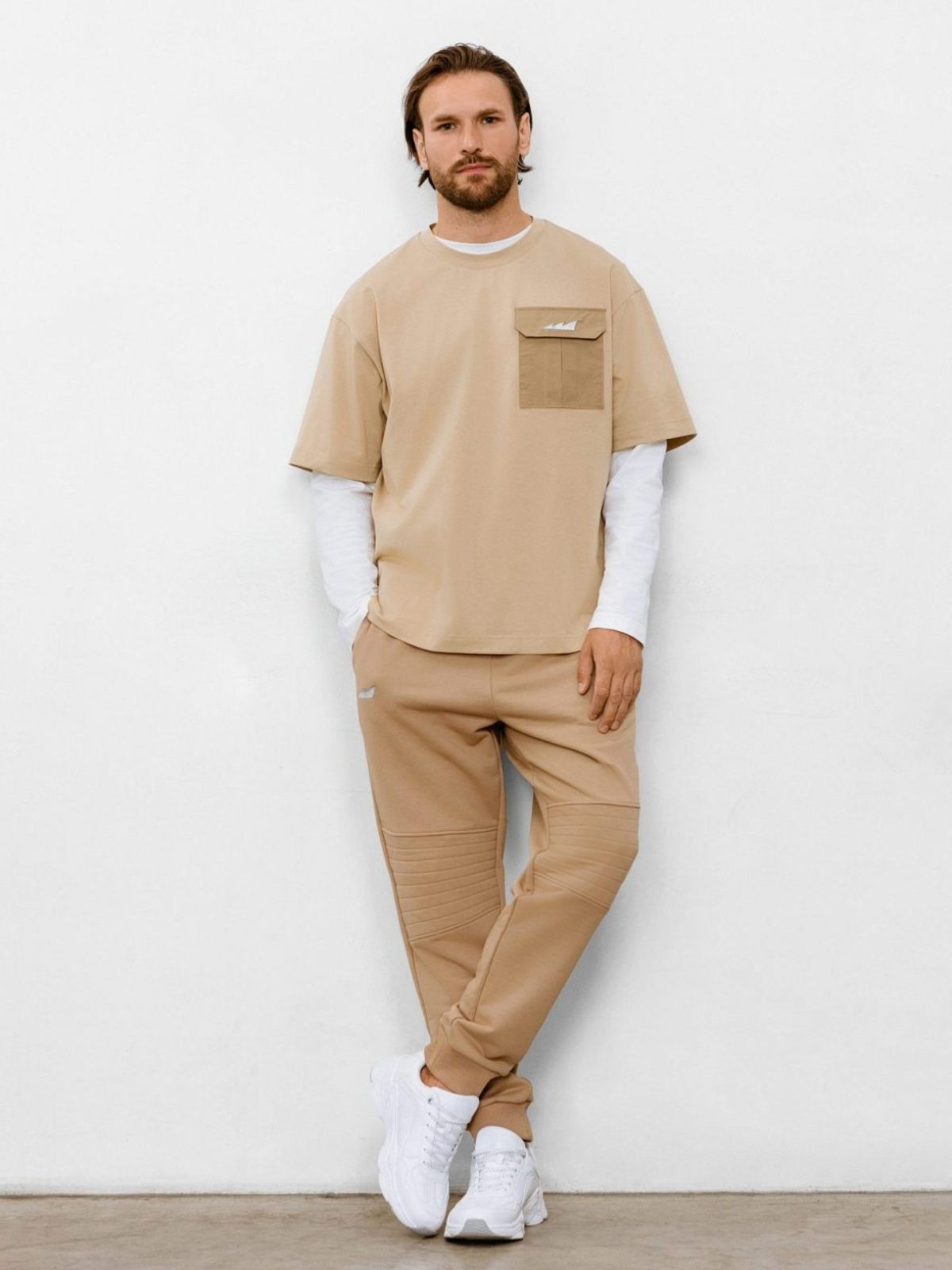 Мужская футболка oversize силуэта. Выполнена из материала, в составе которого 95% хлопка и 5% эластана, за счет чего футболка лучше держит форму. Спущенная линия плеча делает крой футболки более молодежным. Интересный акцент модели - контрастный карман-портфель на груди. Футболка представлена в универсальных бежевых и белом цветах. Создавай спортивный или повседневный образ на каждый день!
