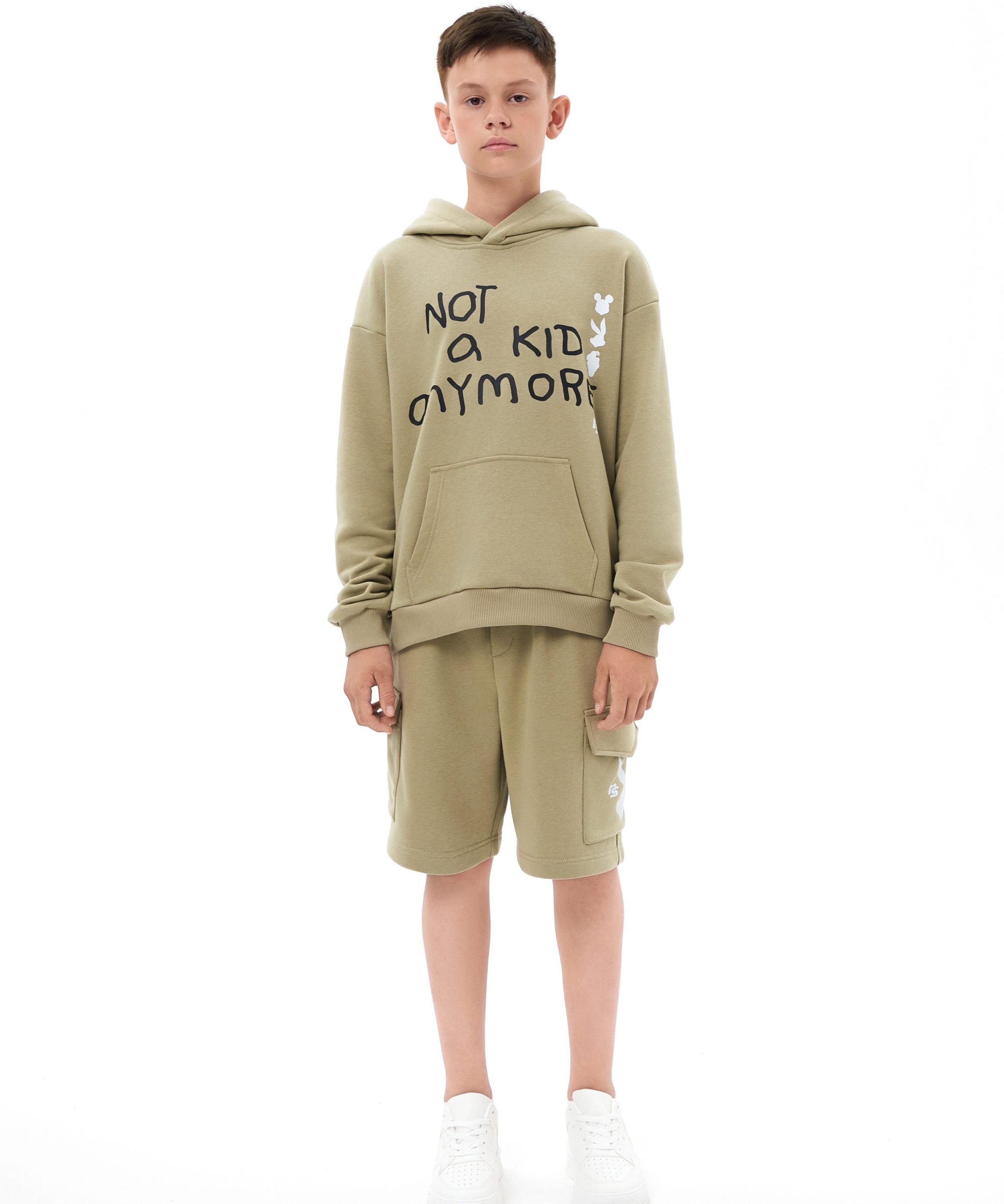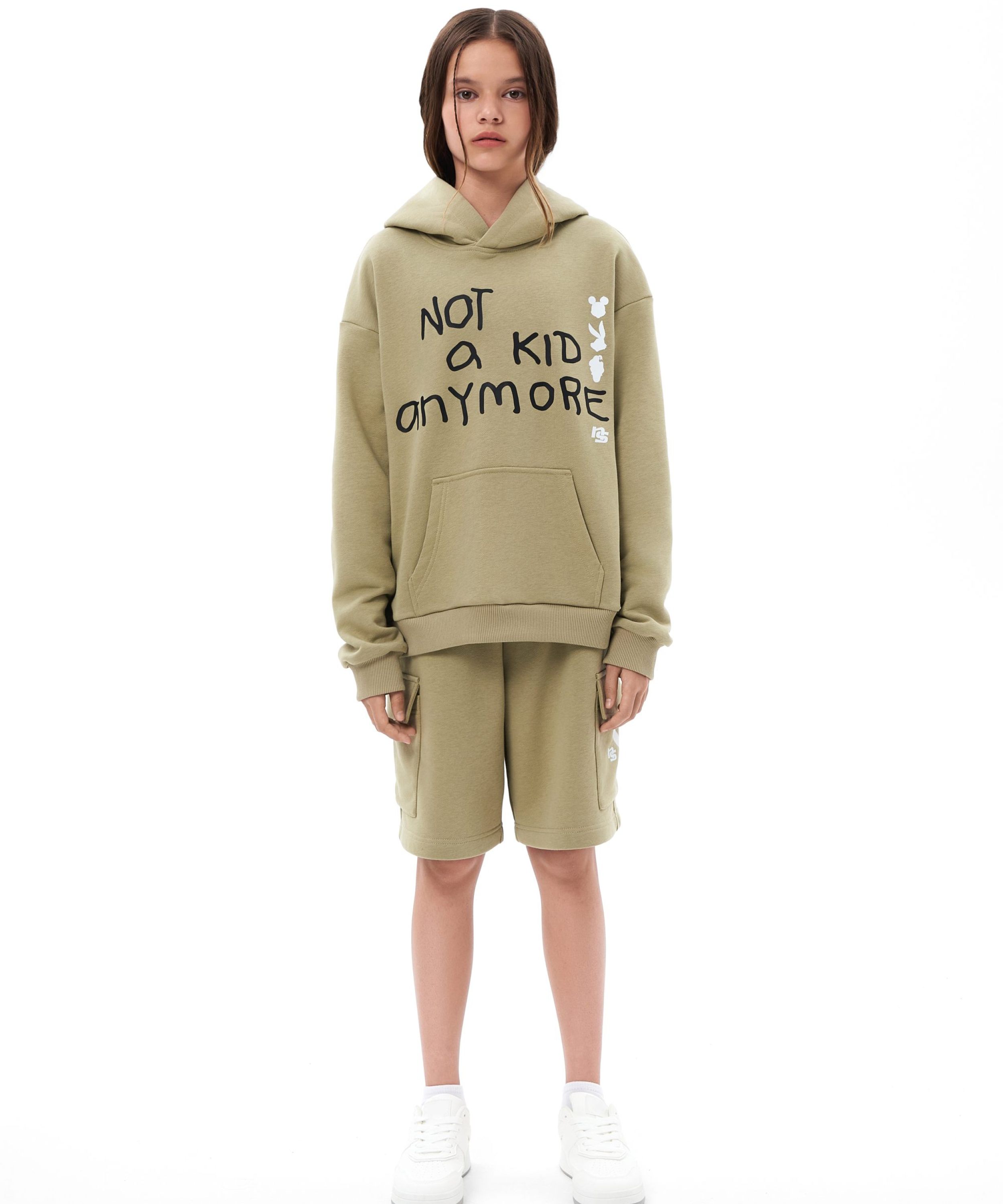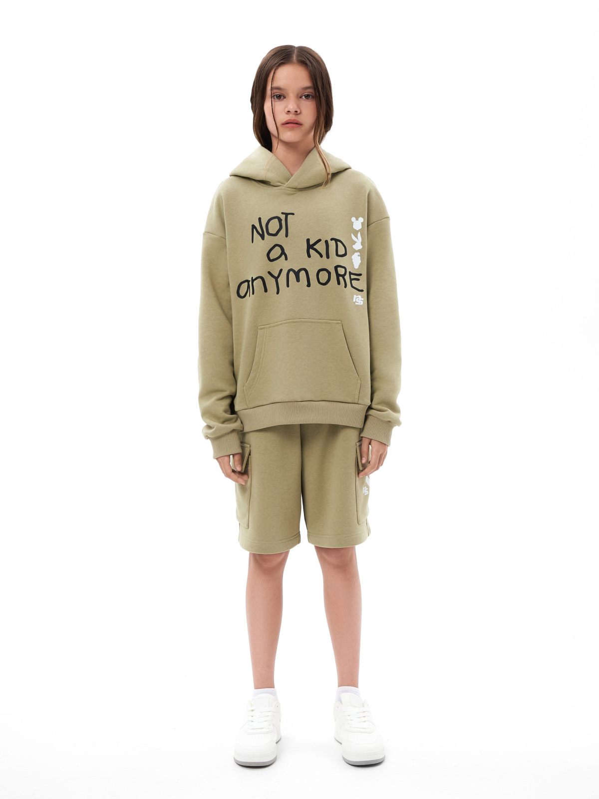 Детские карго-шорты прямого силуэта из коллекции Naka. Выполнены из футера 3х-нитки, в составе которого 92% хлопка и 8% эластана - гипоаллергенного, пропускающего воздух, мягкого и плотного материала. Особенностью модели являются два кармана-портфель на правой и левой ноге, эластичный шнур в поясе для регулировки посадки, а также большой принт с дизайнерским логотипом и символом капсулы "Not A Kid Anymore" - любимым дестким персонажем для тех, кто уже не ребенок! Представлены в трендовом оливковом цвете. Модель создана для комфортного и запоминающегося образа на каждый день.