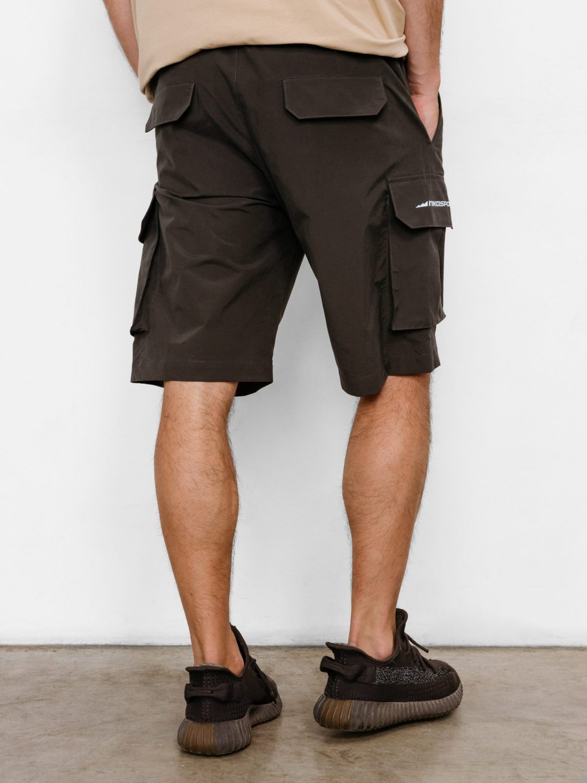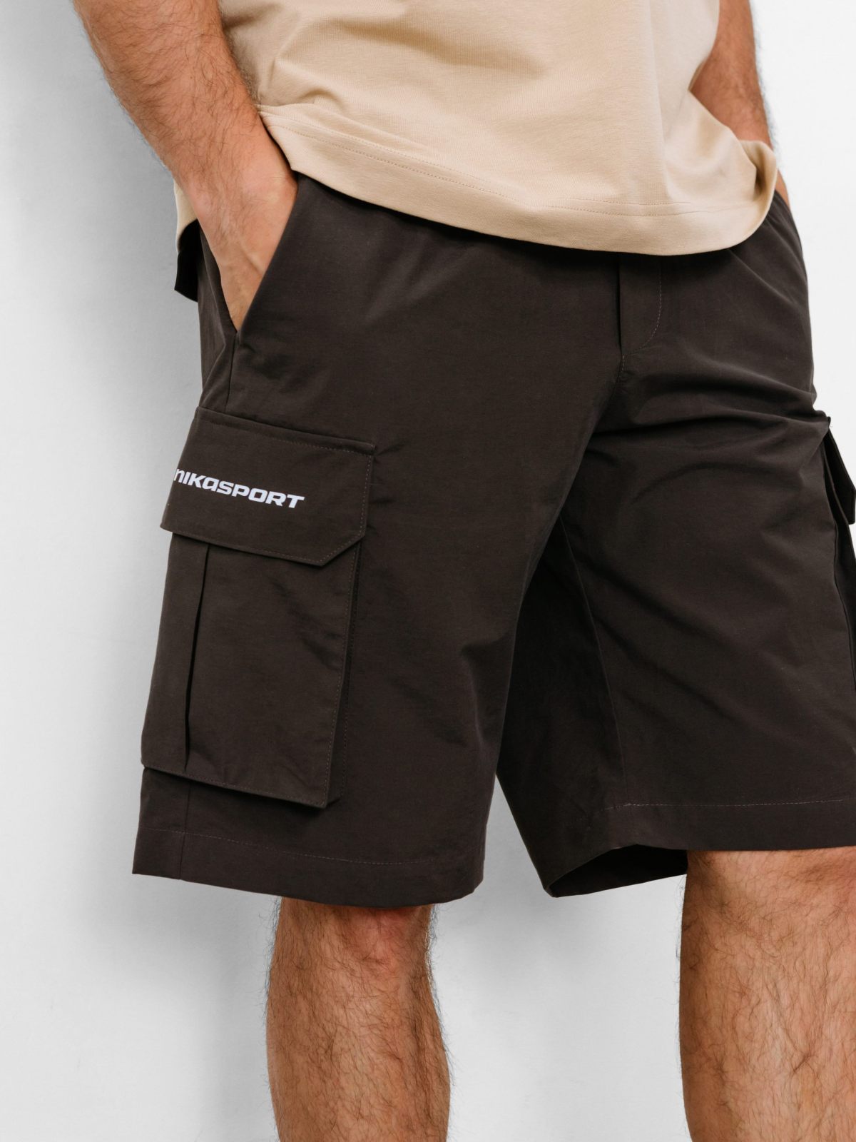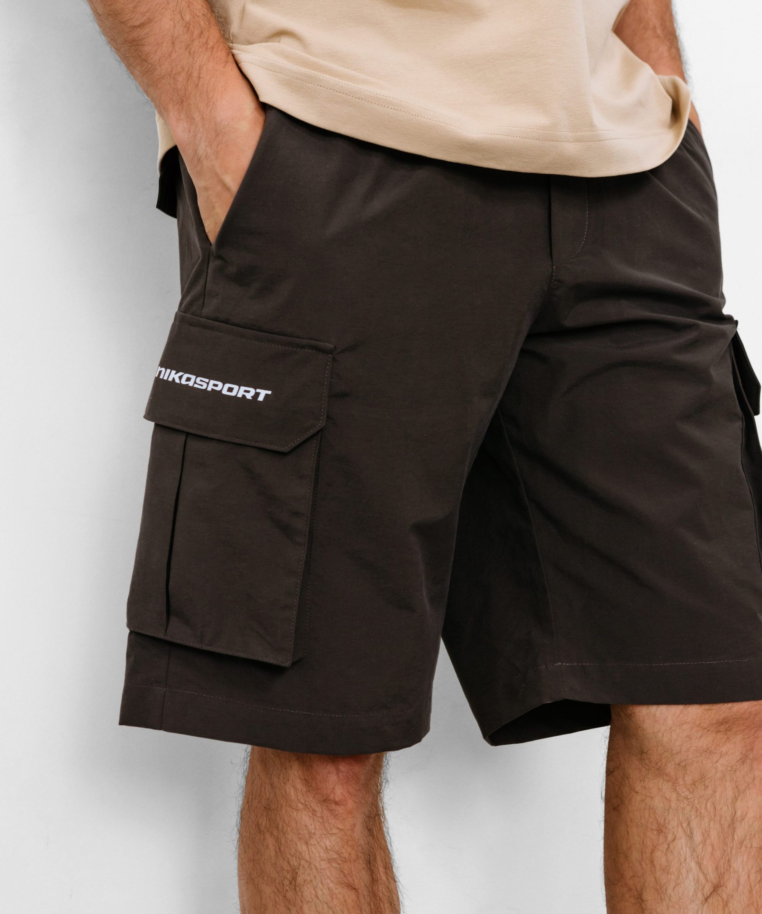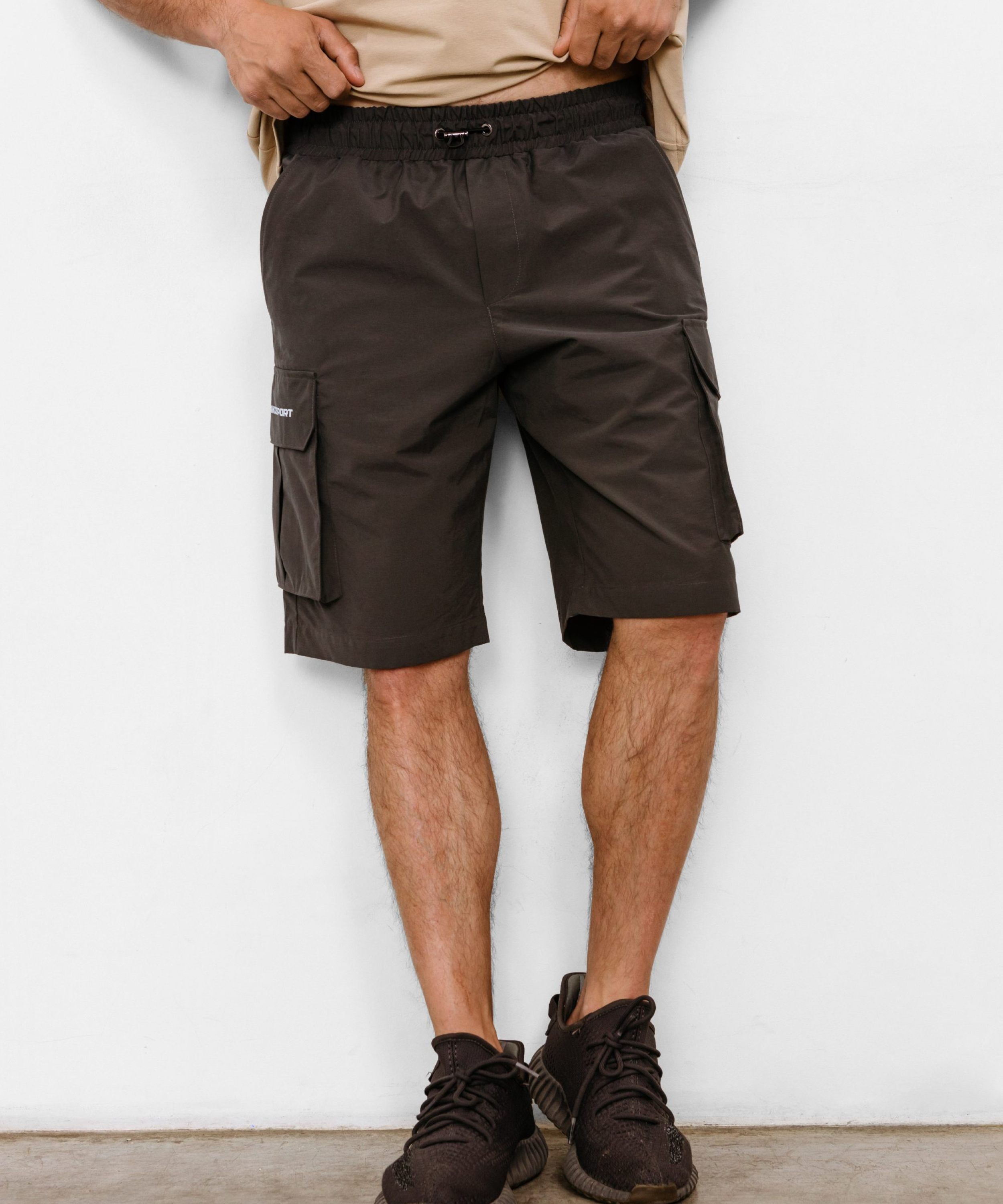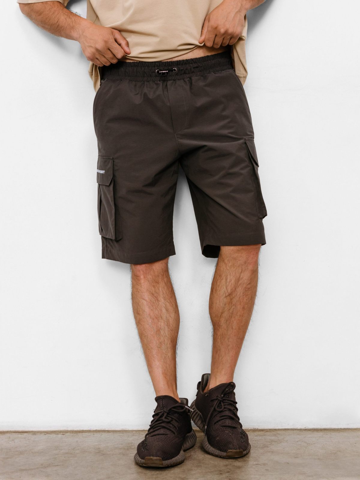Мужские шорты-карго выполнены из материала, в составе которого 70% хлопка и 30% нейлона. Имеют свободный крой, три классических и два больших боковых кармана-портфель с клапанами. Эластичный резинка-утяжка в поясе помогает регулировать посадку. На правом кармане расположен контрастный лого-принт. Модель выполнена в классическом темно-сером цвете. Легкий и приятный к телу материал шорт, трендовый силуэт и детали позволяют создавать классные образы в спортивном стиле.