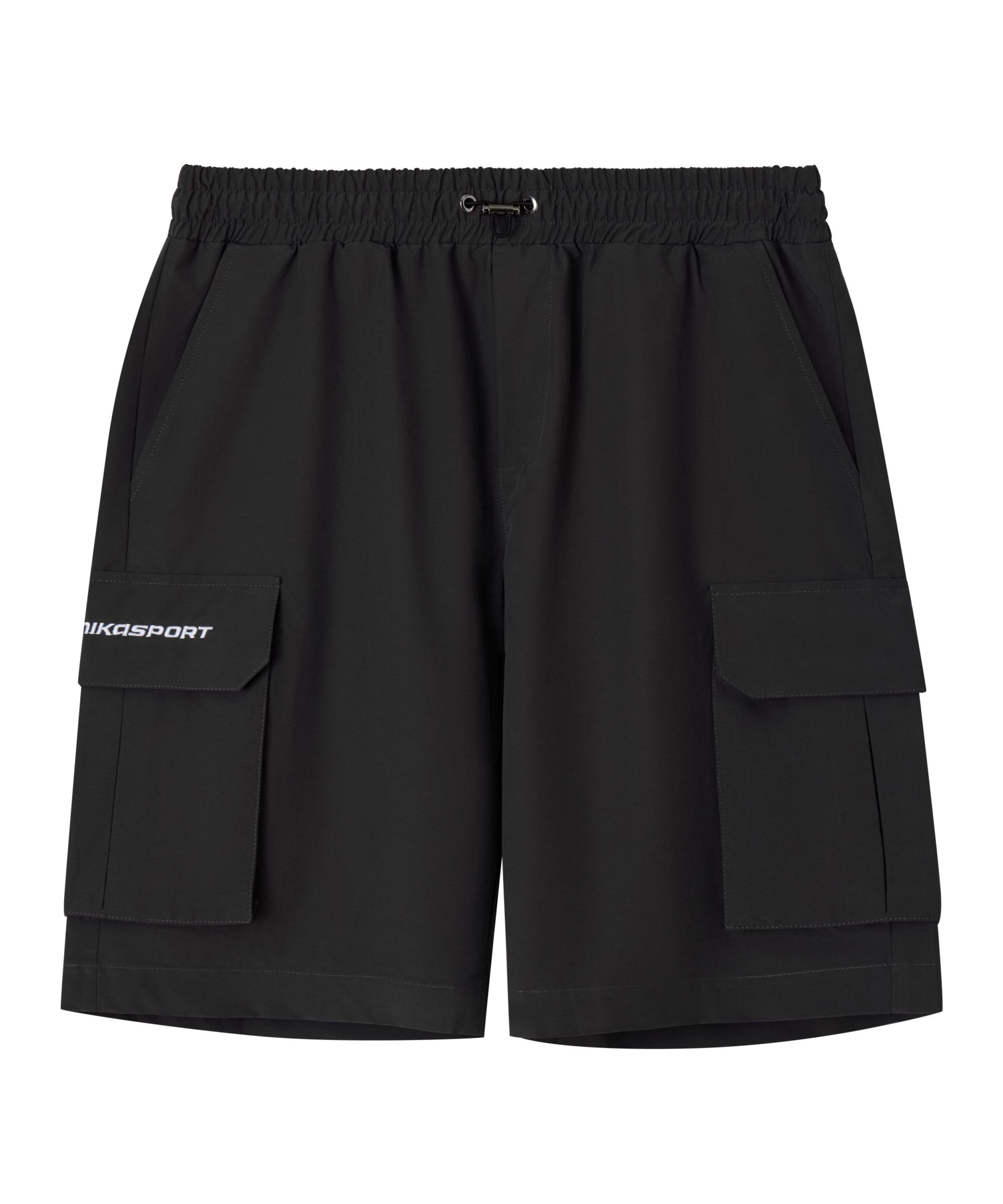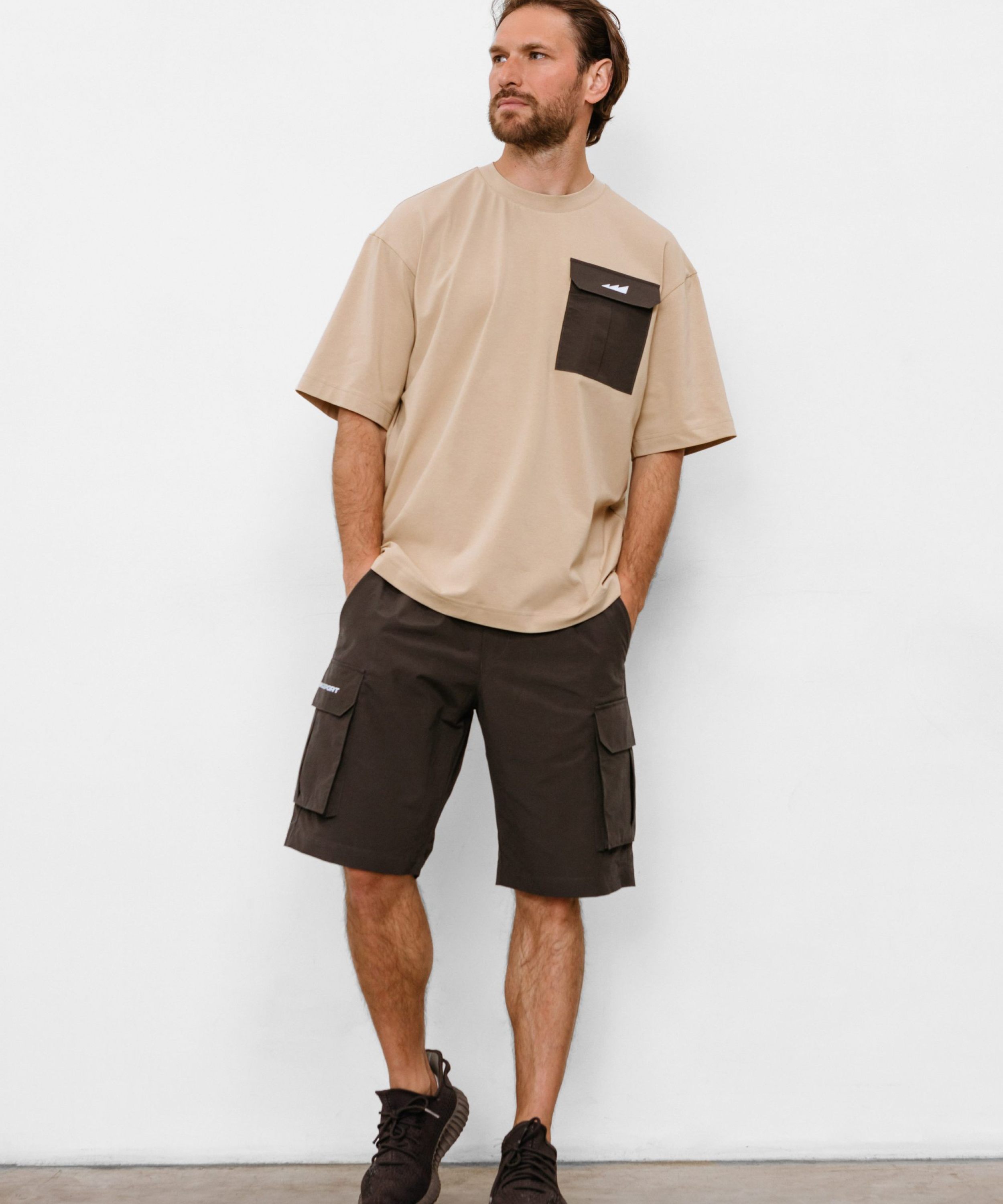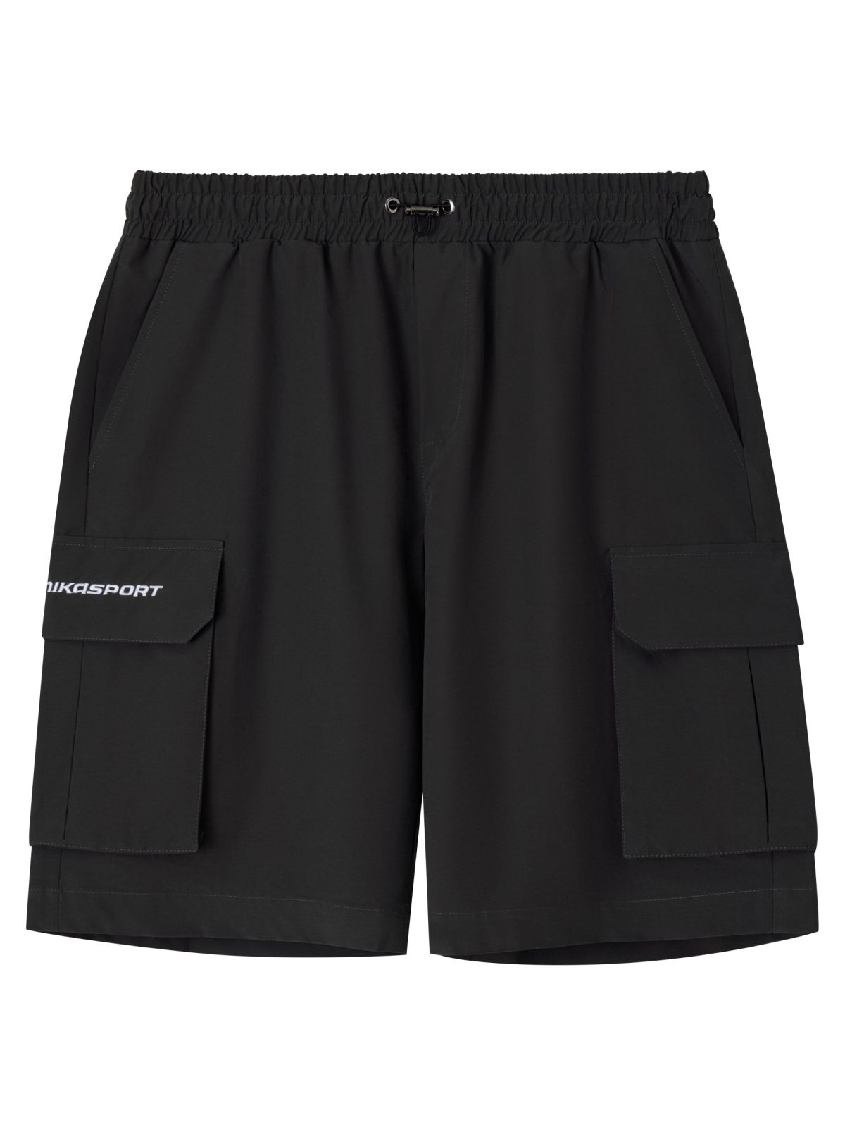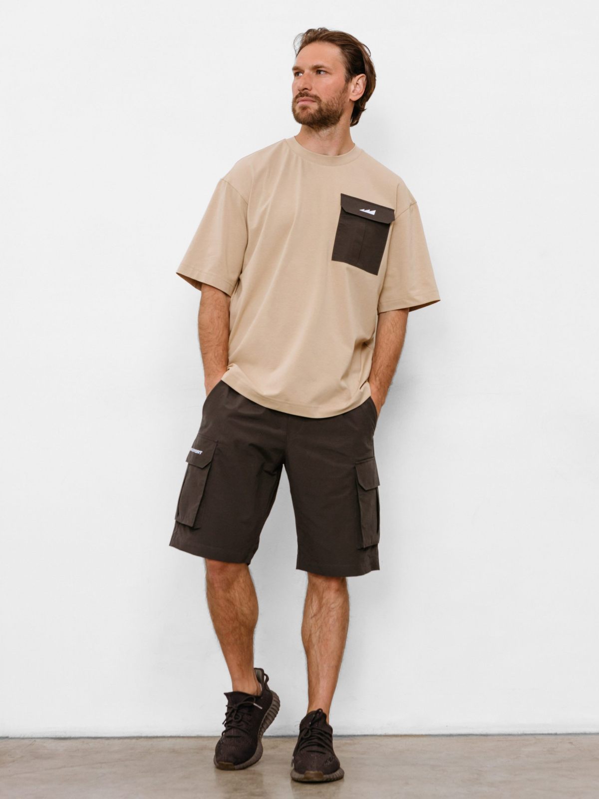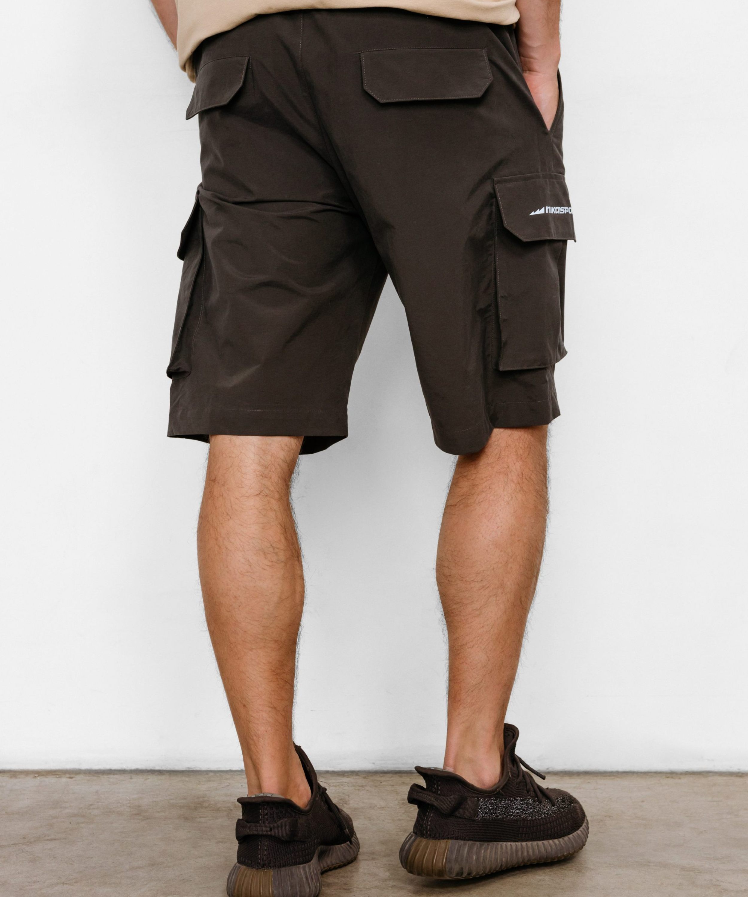 Мужские шорты-карго выполнены из материала, в составе которого 70% хлопка и 30% нейлона. Имеют свободный крой, три классических и два больших боковых кармана-портфель с клапанами. Эластичный резинка-утяжка в поясе помогает регулировать посадку. На правом кармане расположен контрастный лого-принт. Модель выполнена в классическом темно-сером цвете. Легкий и приятный к телу материал шорт, трендовый силуэт и детали позволяют создавать классные образы в спортивном стиле.