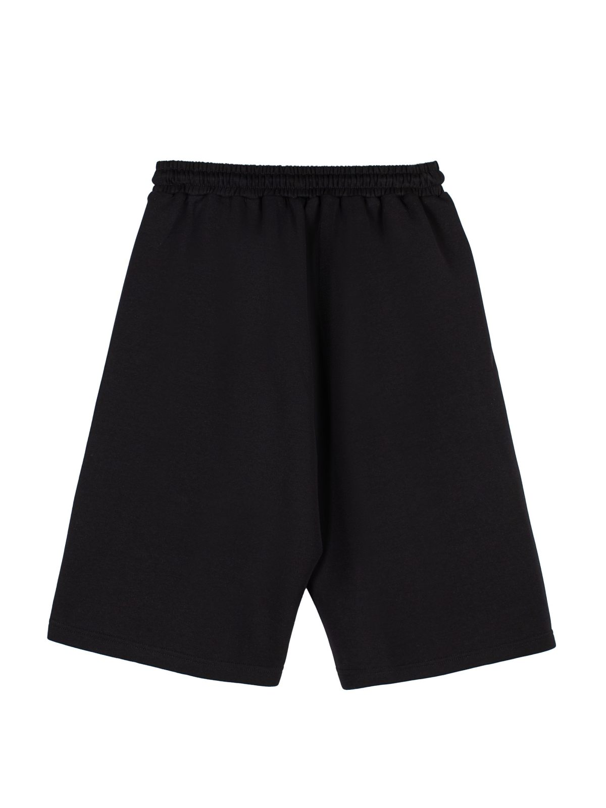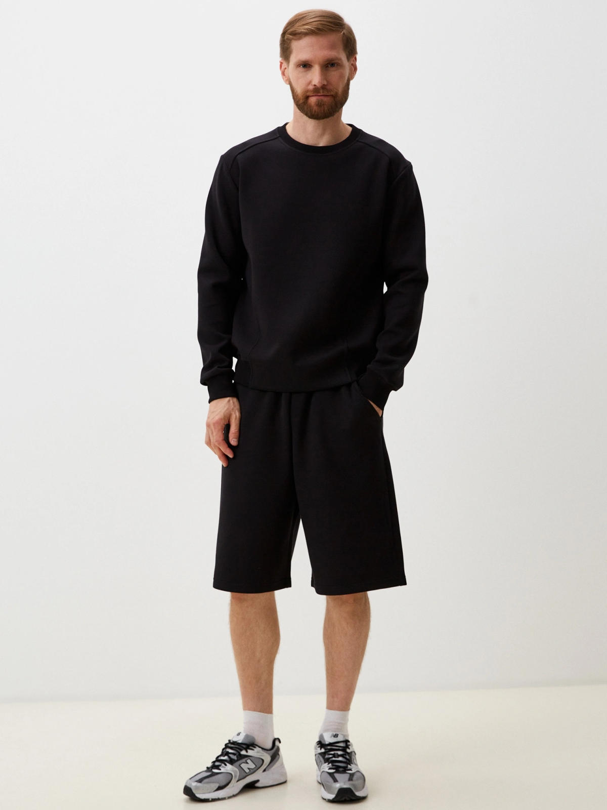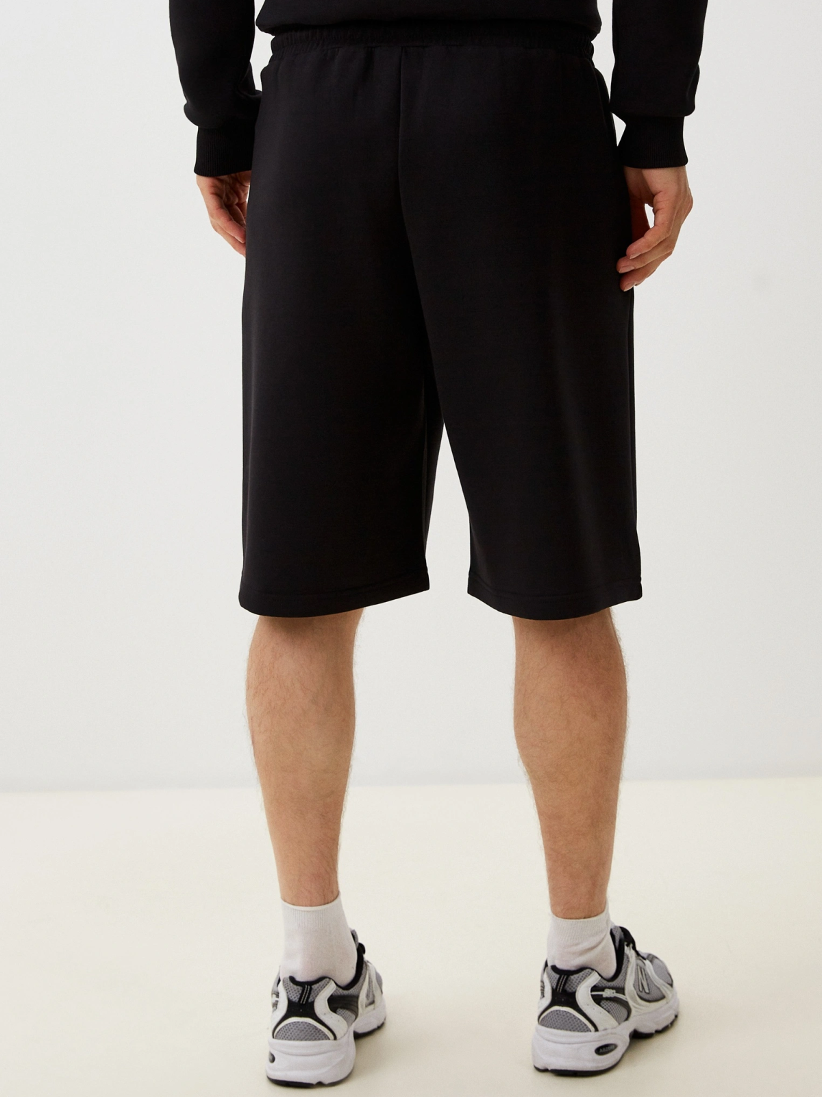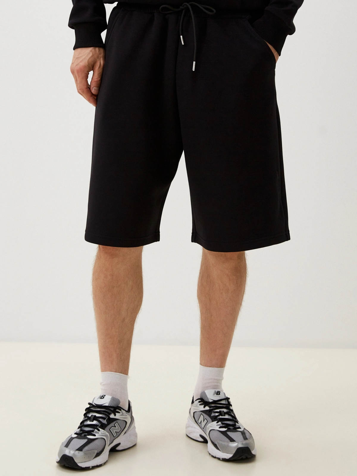 Удлиненные мужские шорты свободного кроя. Выполнены из мягкого материала - скубы, в составе которого 82% хлопка, 12% полиэстера и 6% эластана, что обеспечивает комфорт, отличную посадку и долговечность изделия. Посадка шорт - средняя, регулируемая шнуром в поясе. Шорты представлены в классическом черном цвете. Прекрасно подойдут для повседневных образов в спортивном стиле.