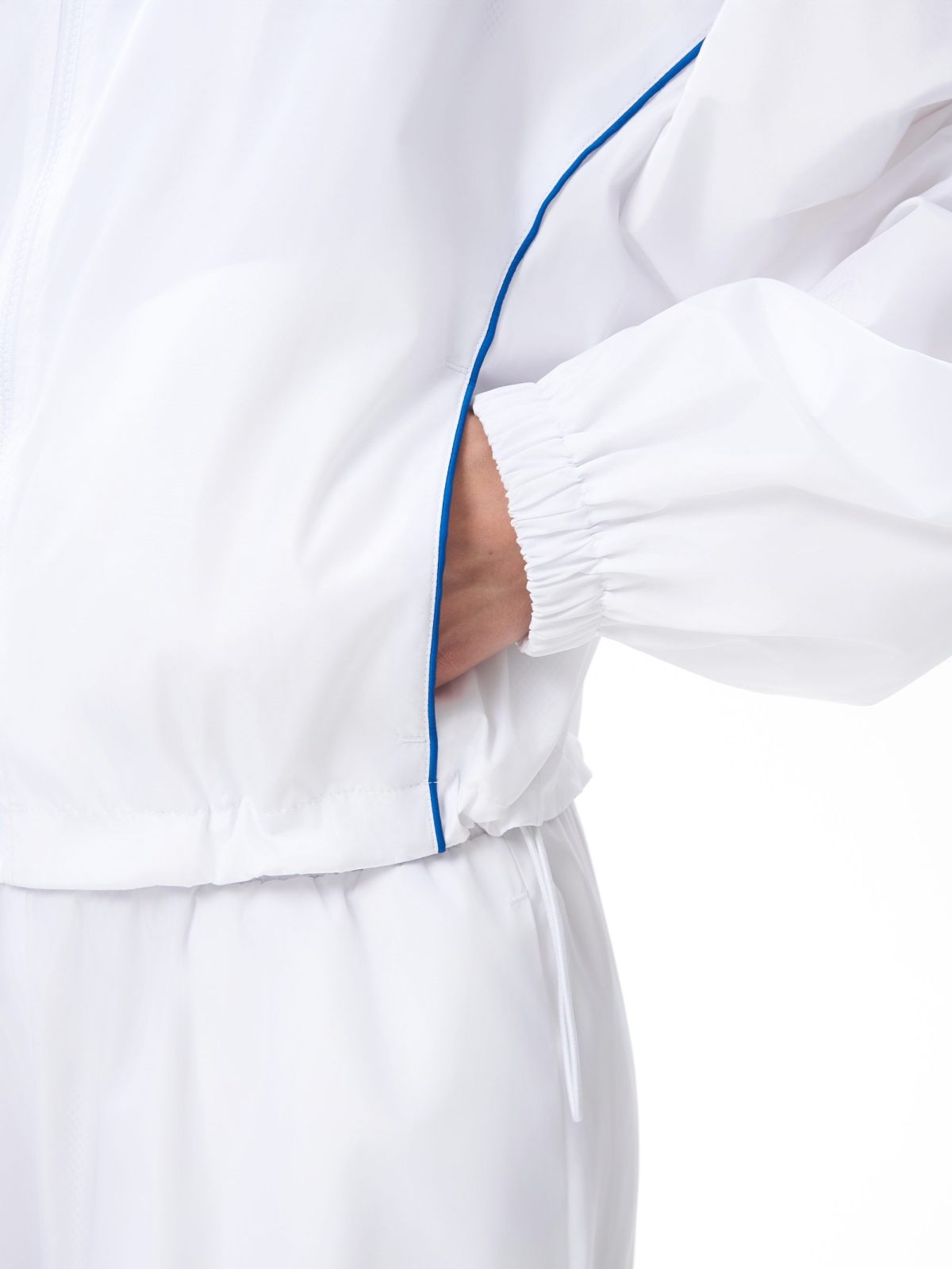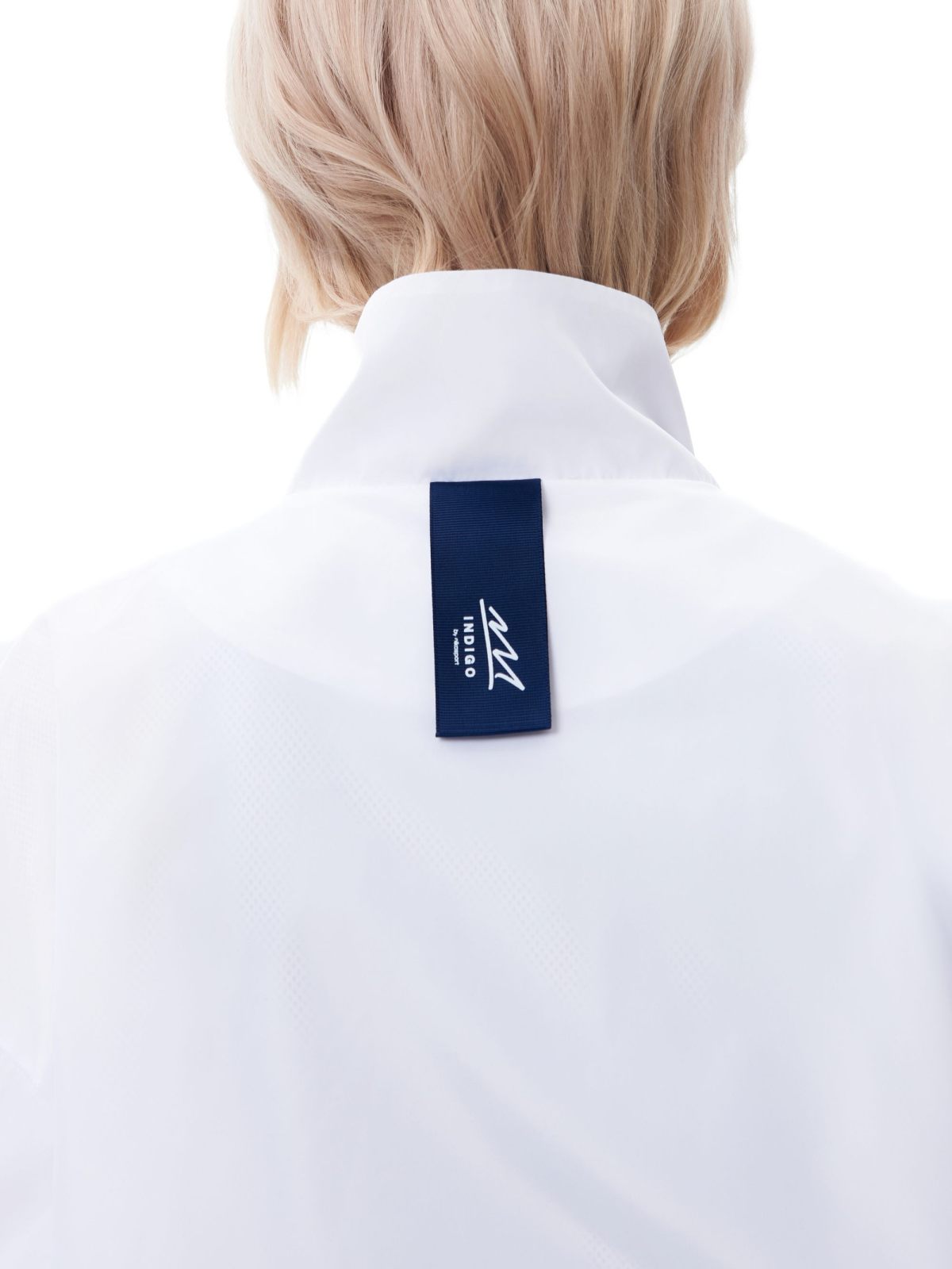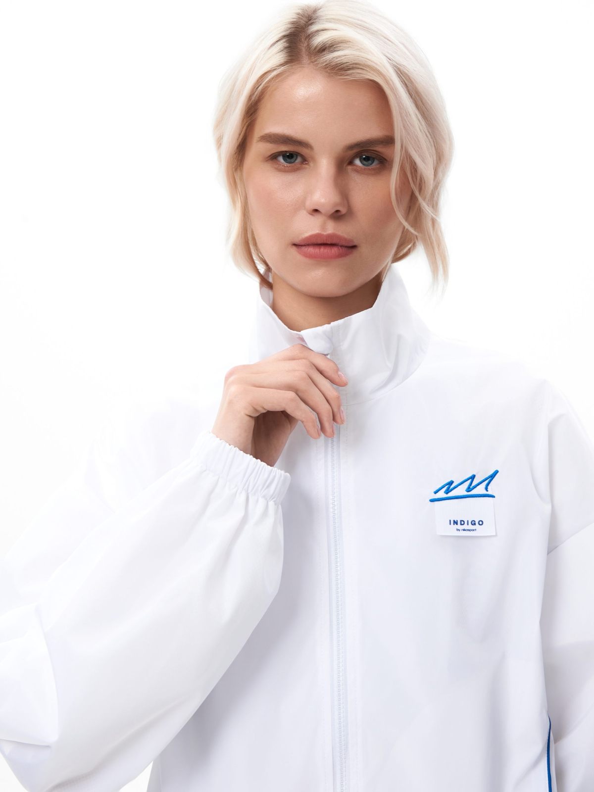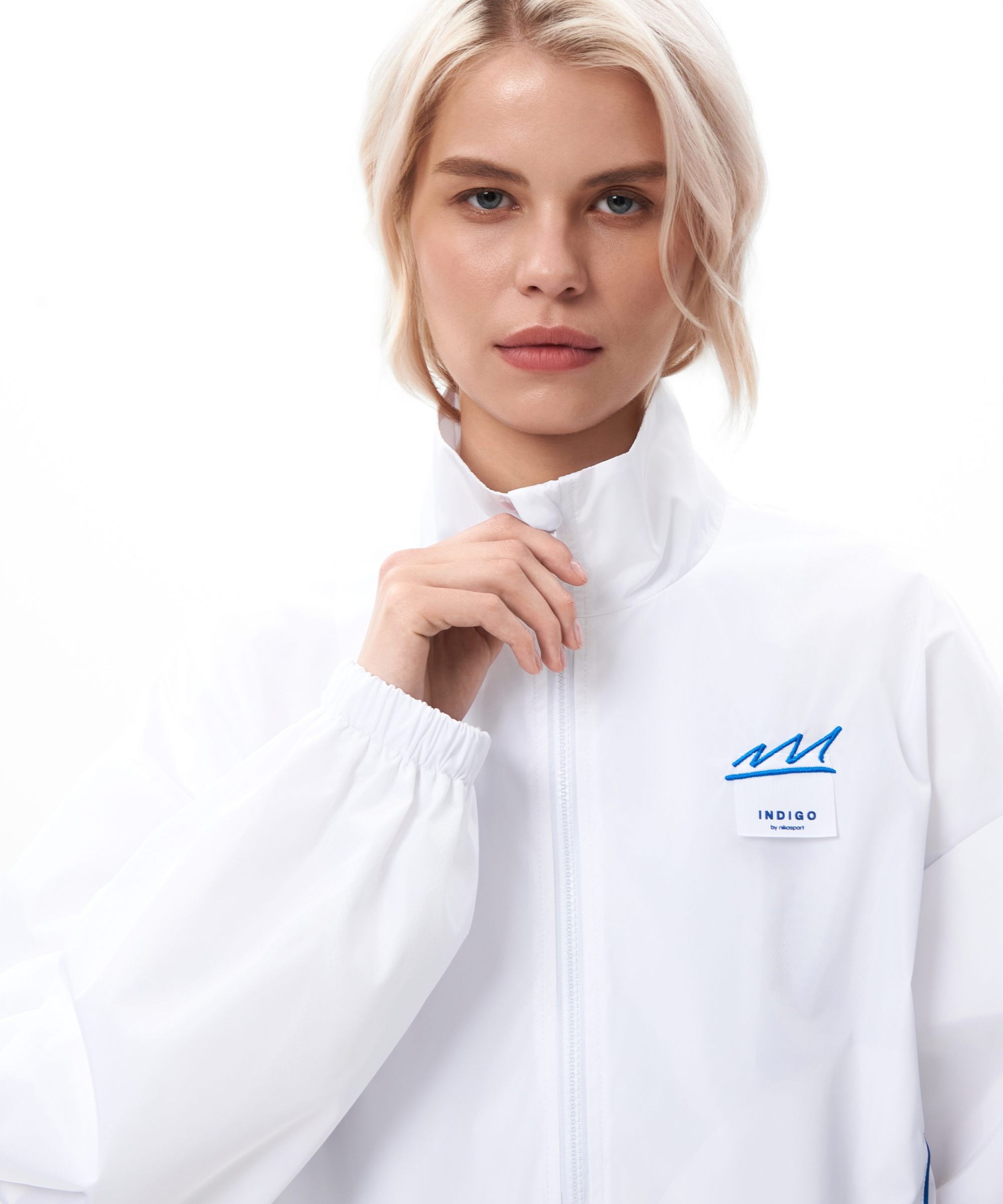 Женская ветровка из коллекции Indigo. Выполнена из 100% полиэстера, свободного силуэта Loose. У модели высокий воротник, два боковых кармана для необходимых вещей, утяжка по низу для защиты от ветра и прохлады. Кипельно-белый цвет, контрастные канты, стильные ярлыки-логотипы на груди и спине помогут создать дерзкий и запоминающийся образ. Прекрасный выбор как для спортивного, так и для повседневного стиля