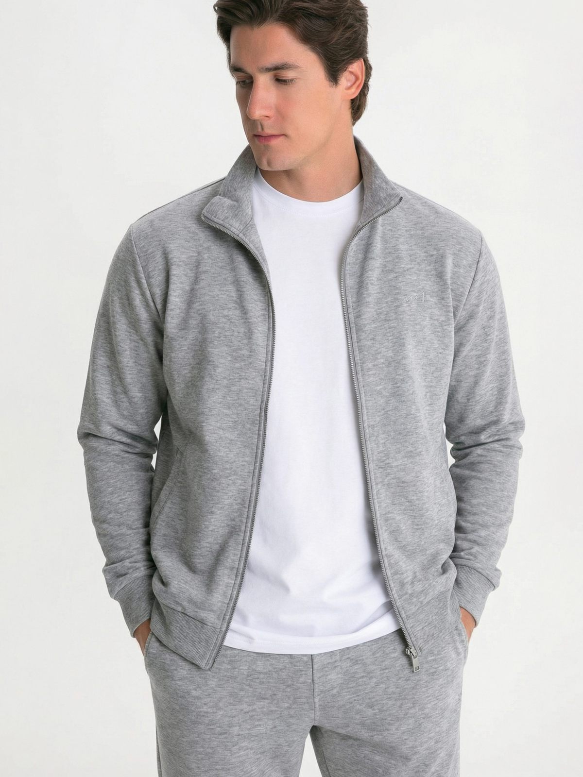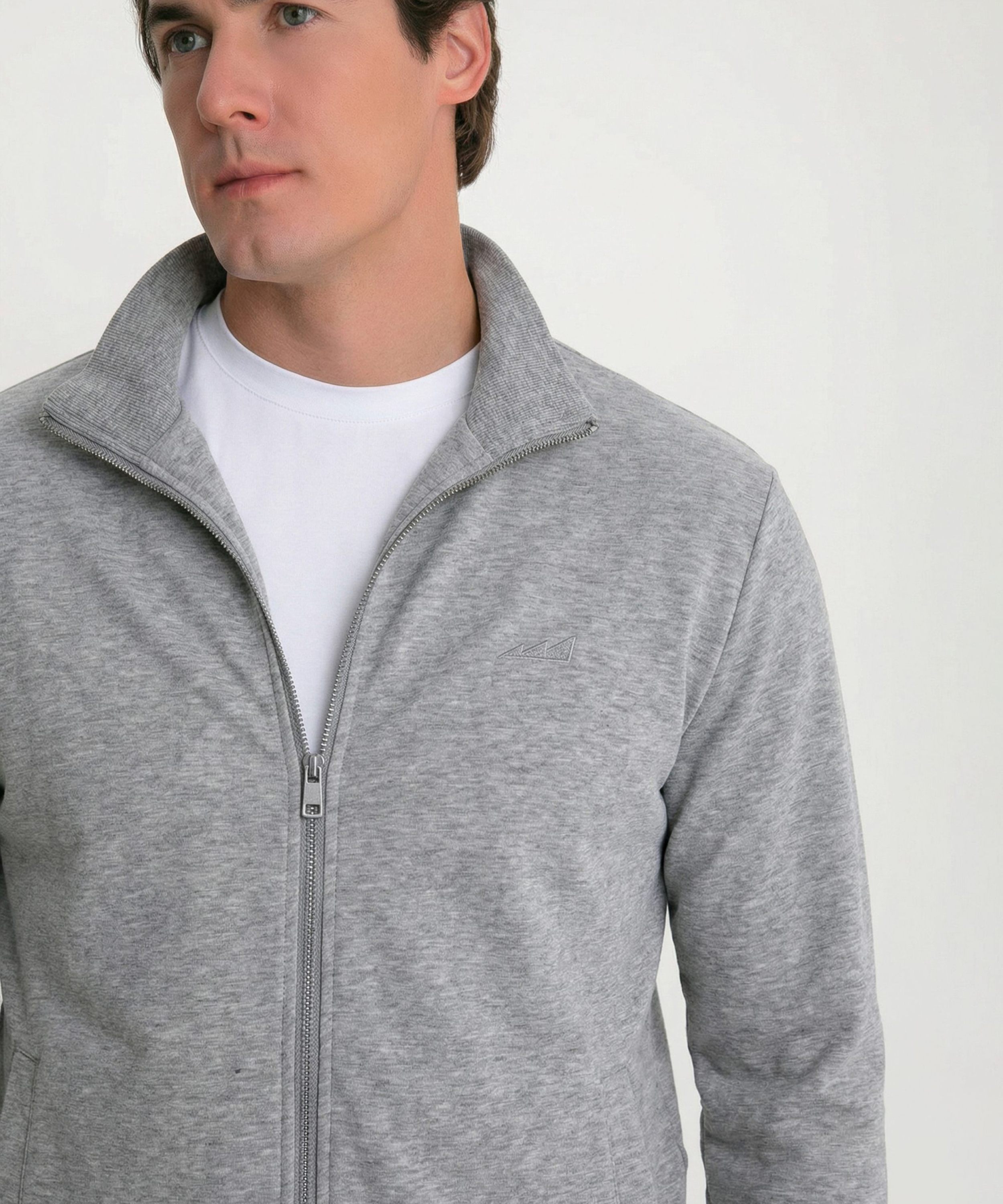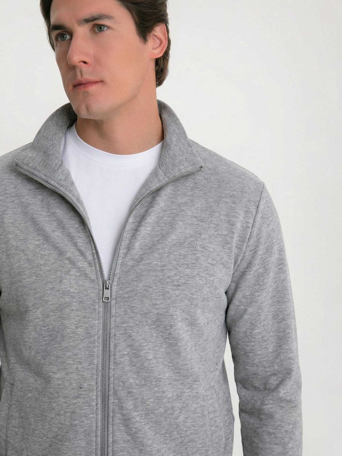 Классическая мужская олимпийка прямого кроя с воротником-стойкой. Выполнена из легкого материала, в составе которого 46% хлопка, 46% полиэстера и 8% эластана, что обеспечивает отличную посадку и долговечность изделия. Представлена в классическом цвете серый меланж, на груди расположена тональная лого-вышивка. Прекрасный выбор как для спортивного, так и для повседневного стиля.