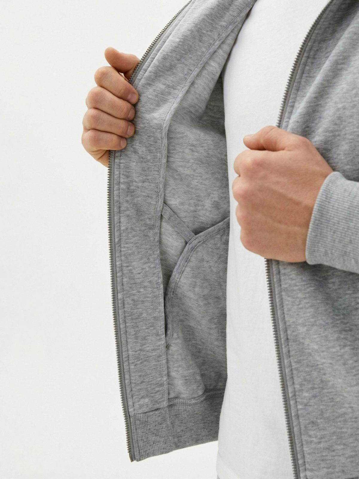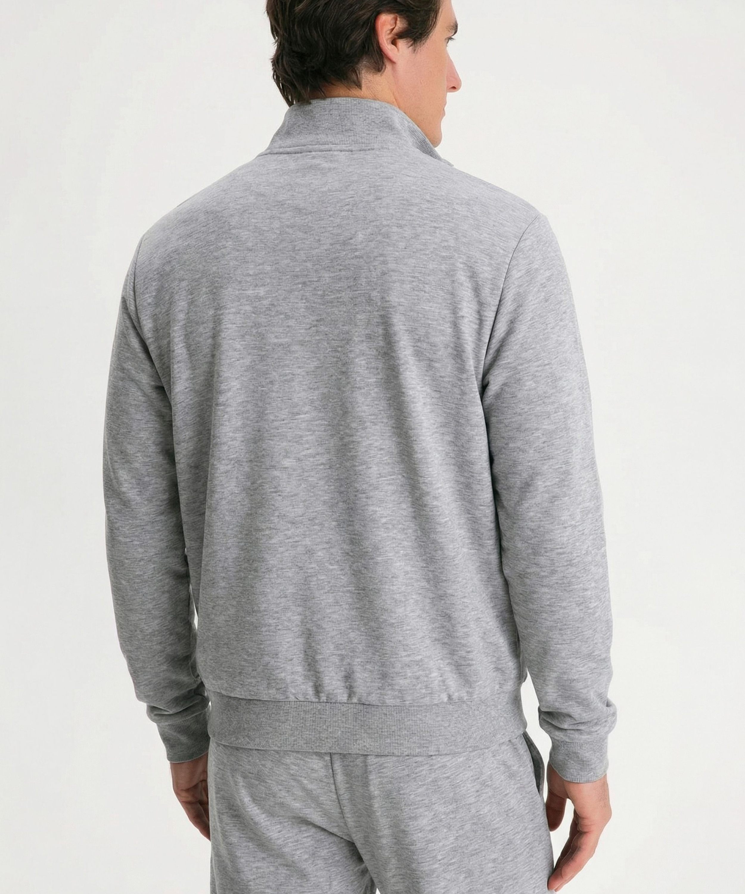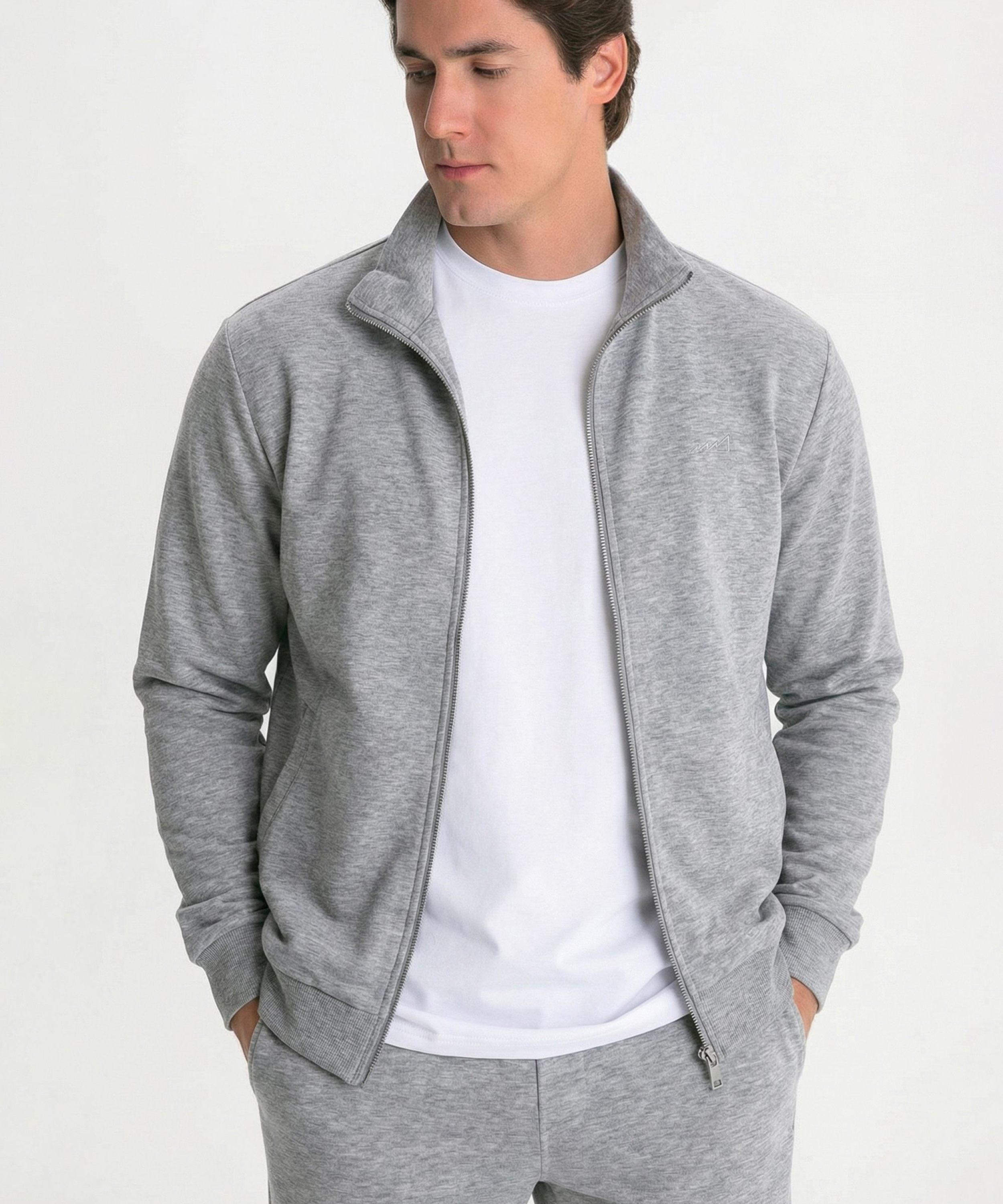 Классическая мужская олимпийка прямого кроя с воротником-стойкой. Выполнена из легкого материала, в составе которого 46% хлопка, 46% полиэстера и 8% эластана, что обеспечивает отличную посадку и долговечность изделия. Представлена в классическом цвете серый меланж, на груди расположена тональная лого-вышивка. Прекрасный выбор как для спортивного, так и для повседневного стиля.