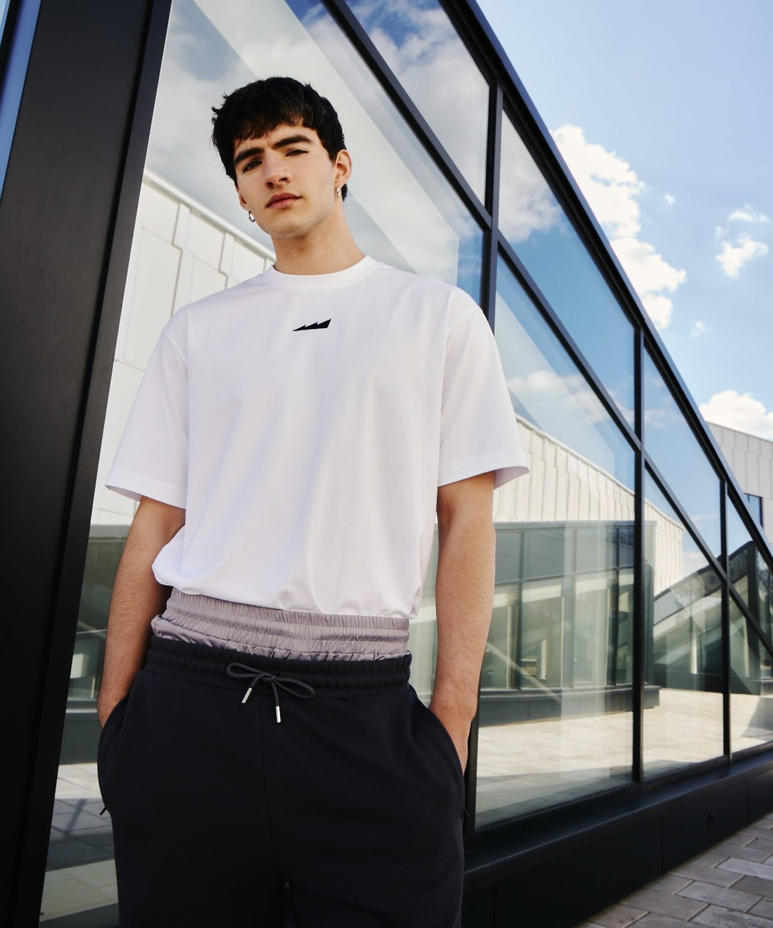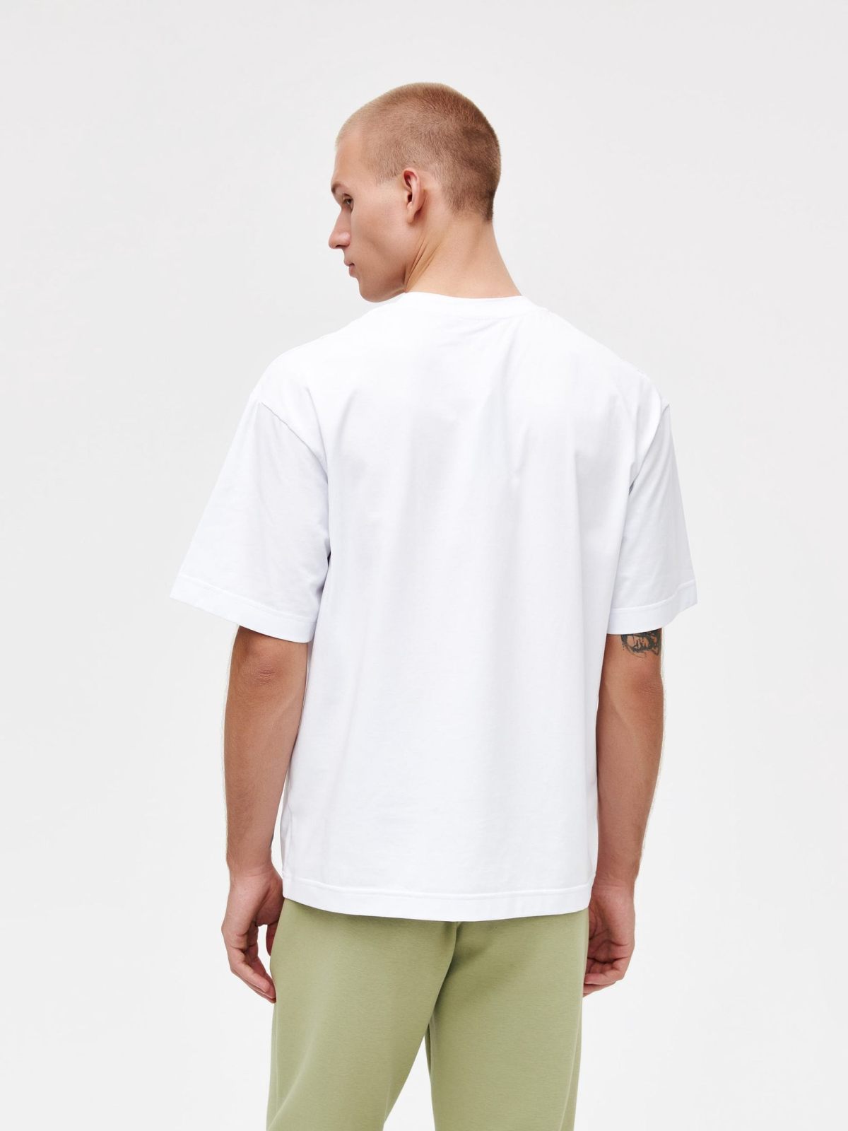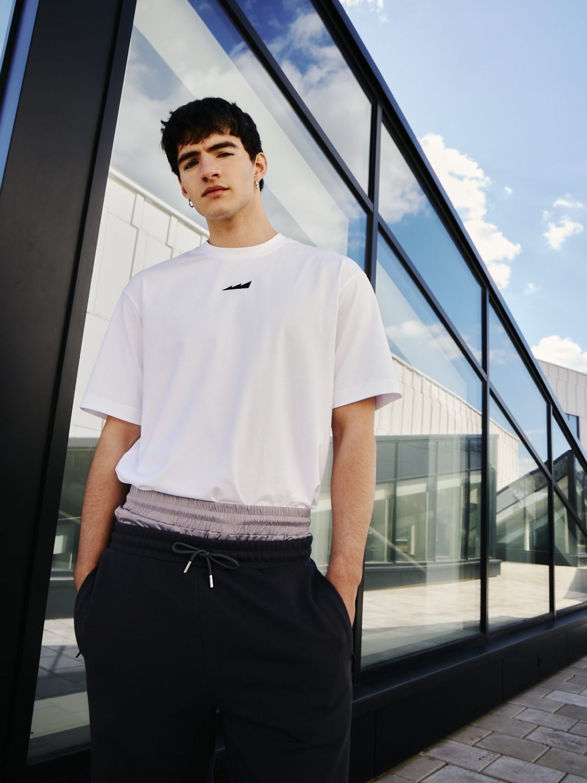 Мужская футболка oversize силуэта выполнена из материала, в состав которого входит 92% хлопка и 8% эластана, за счет чего футболка более эластичная и лучше держит форму. На груди расположена тональная вышивка с логотипом бренда, на плече - принт. Модель представлена в трех классических цветах: серый меланж, темно-синий и белый. Футболка легко сочетается как со спортивной так и с повседневной одеждой, и является незаменимой в вашем базовом гардеробе.