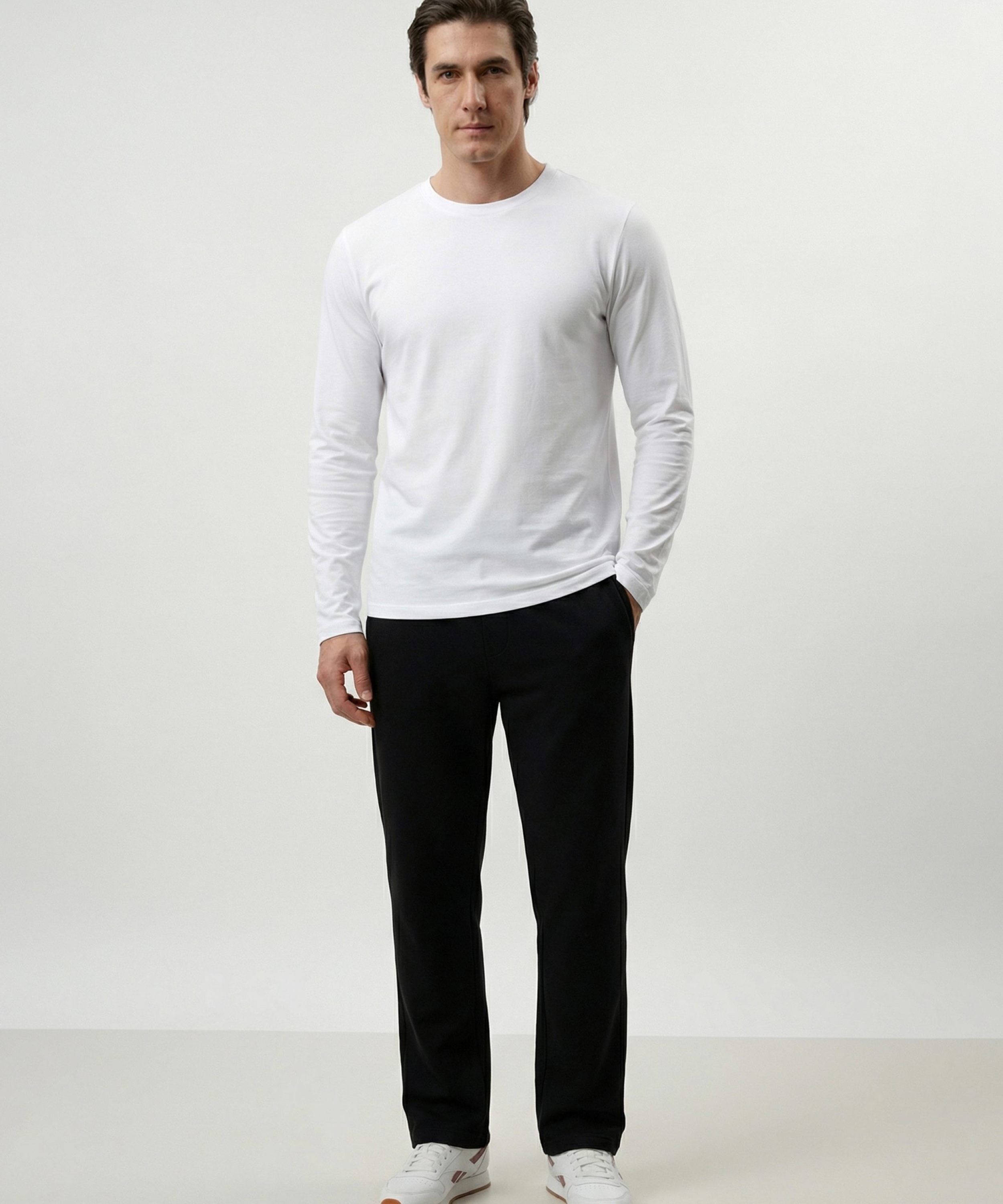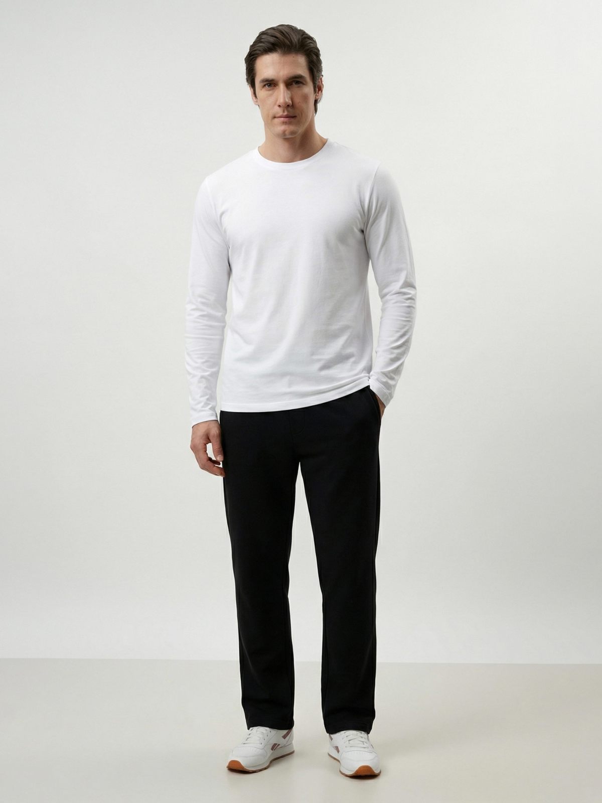 Мужские широкие прямые брюки свободного кроя выполнены из материала, в составе которого 85% хлопка и 15% полиэстера. Брюки имеют два боковых кармана на молнии для хранения личных вещей и лаконичную тональную лого-вышивку на левой ноге. Мягкий, комфортный материал, эластичный шнур в поясе для регулировки посадки и универсальный черный цвет делают модель незаменимой и стильной вещью вашего повседневного гардероба.
