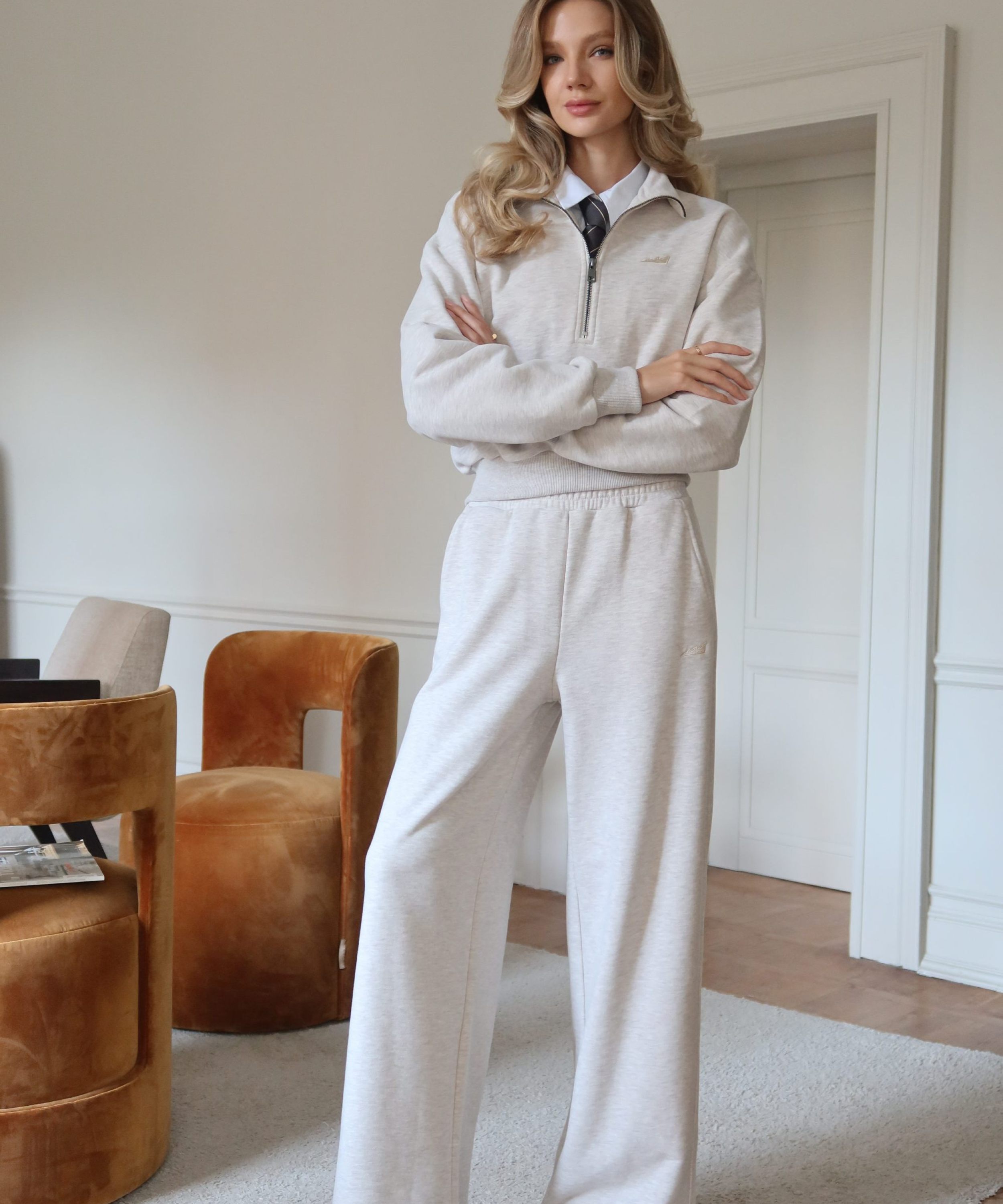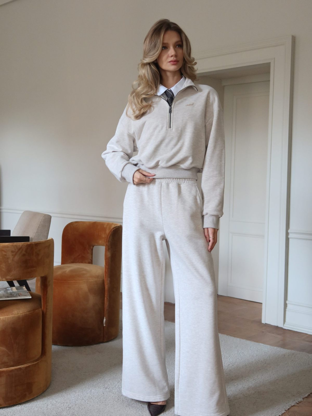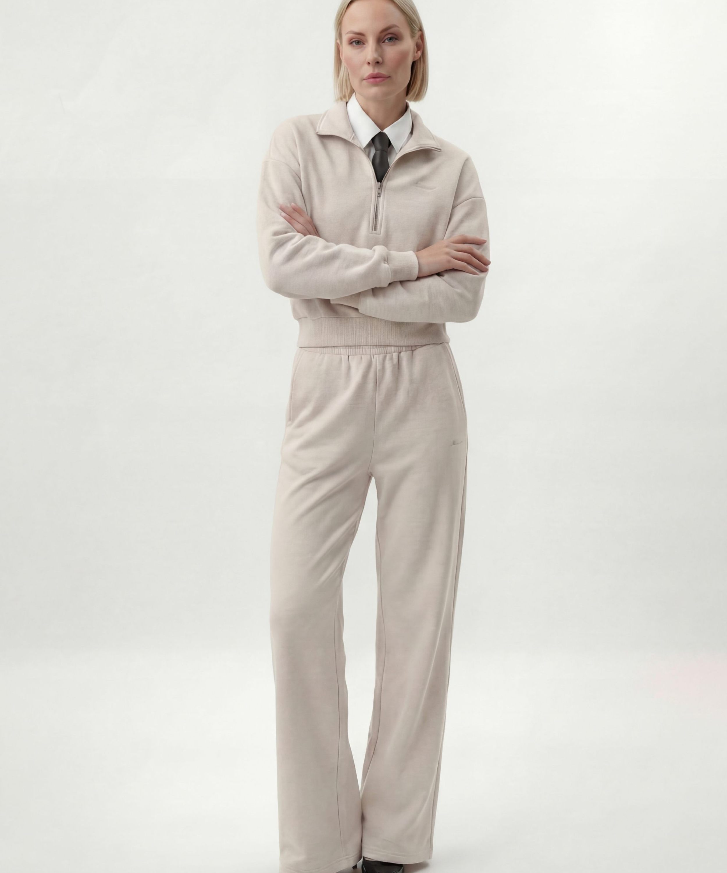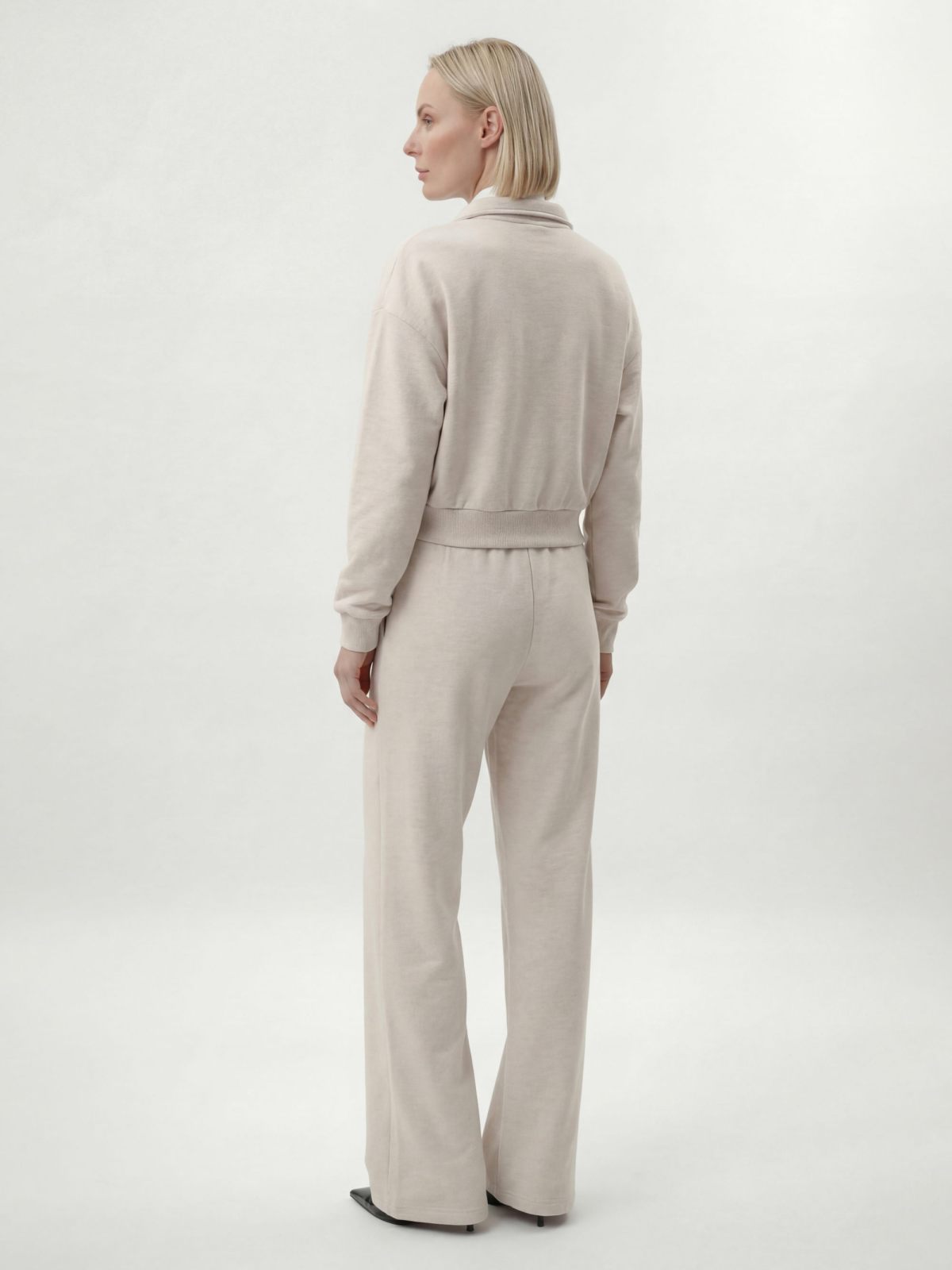 Широкие прямые женские брюки свободного силуэта выполнены из материала с эффектом peach, в состав которого входит 90% хлопка и 10% полиэстера, поэтому данная модель невероятно мягкая и приятная на ощупь. Брюки имеют два боковых кармана для хранения личных вещей, на левой ноге расположена контрастная вышивка с логотипом бренда. Эластичный шнур в поясе помогает регулировать посадку. Классический цвет бежевый меланж отлично подойдет для стильных повседневных образов.