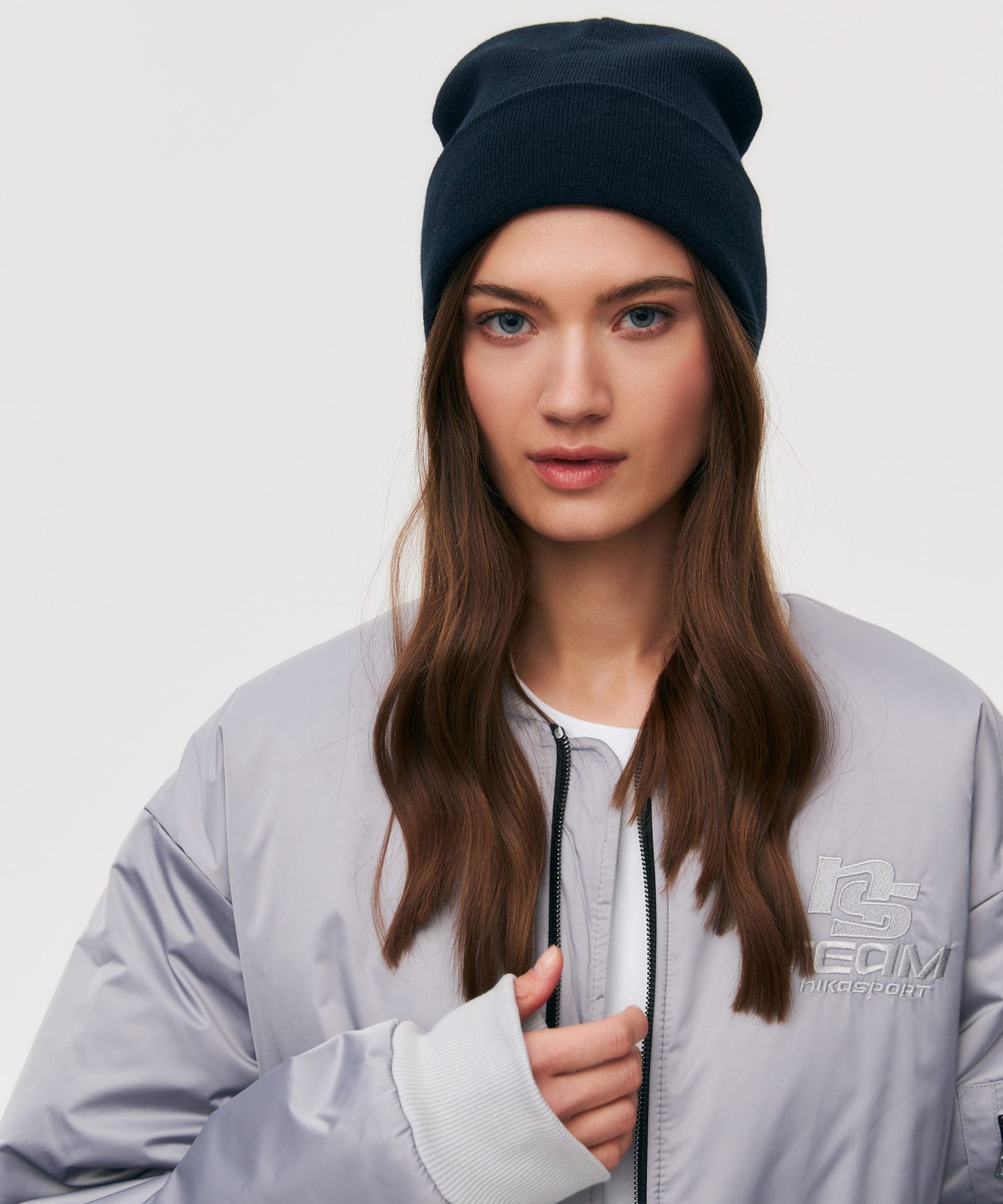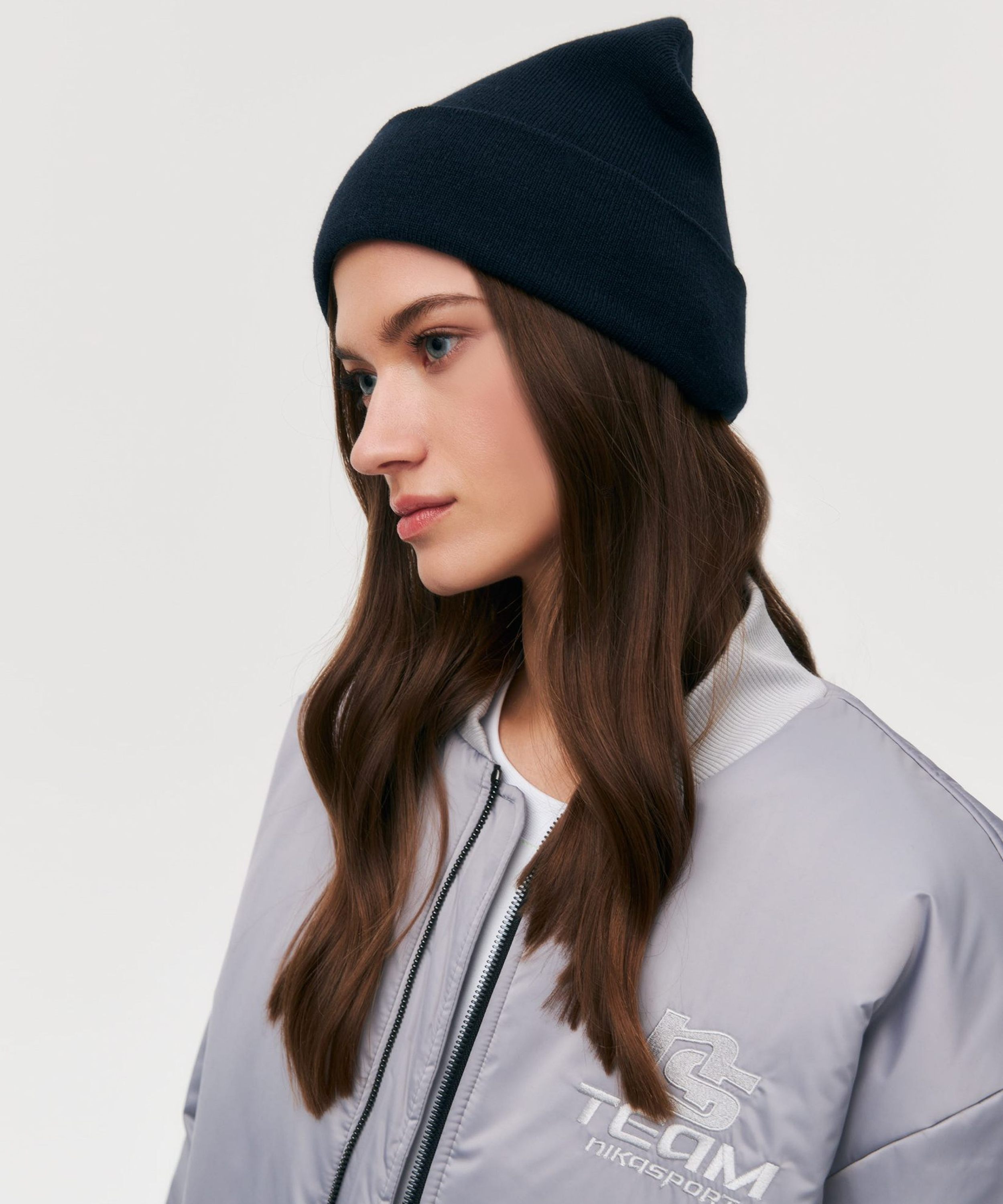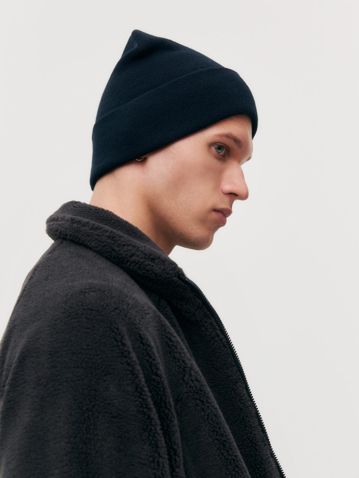 Удлиненная шапка с подворотом. Состав: 50% хлопок 50% акрил. Шапка представлена в трех цветах: черный, темно-синий и бежевый.