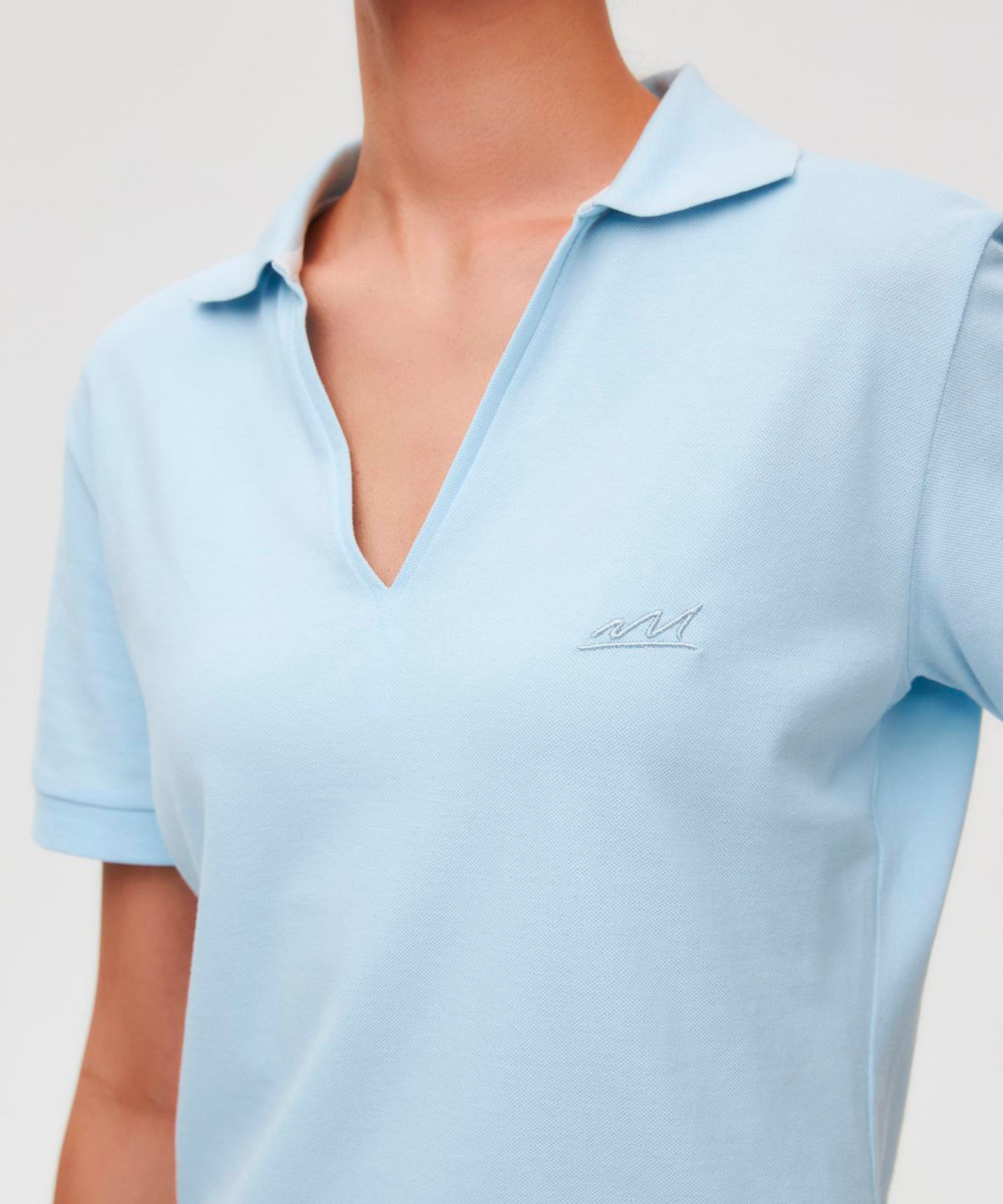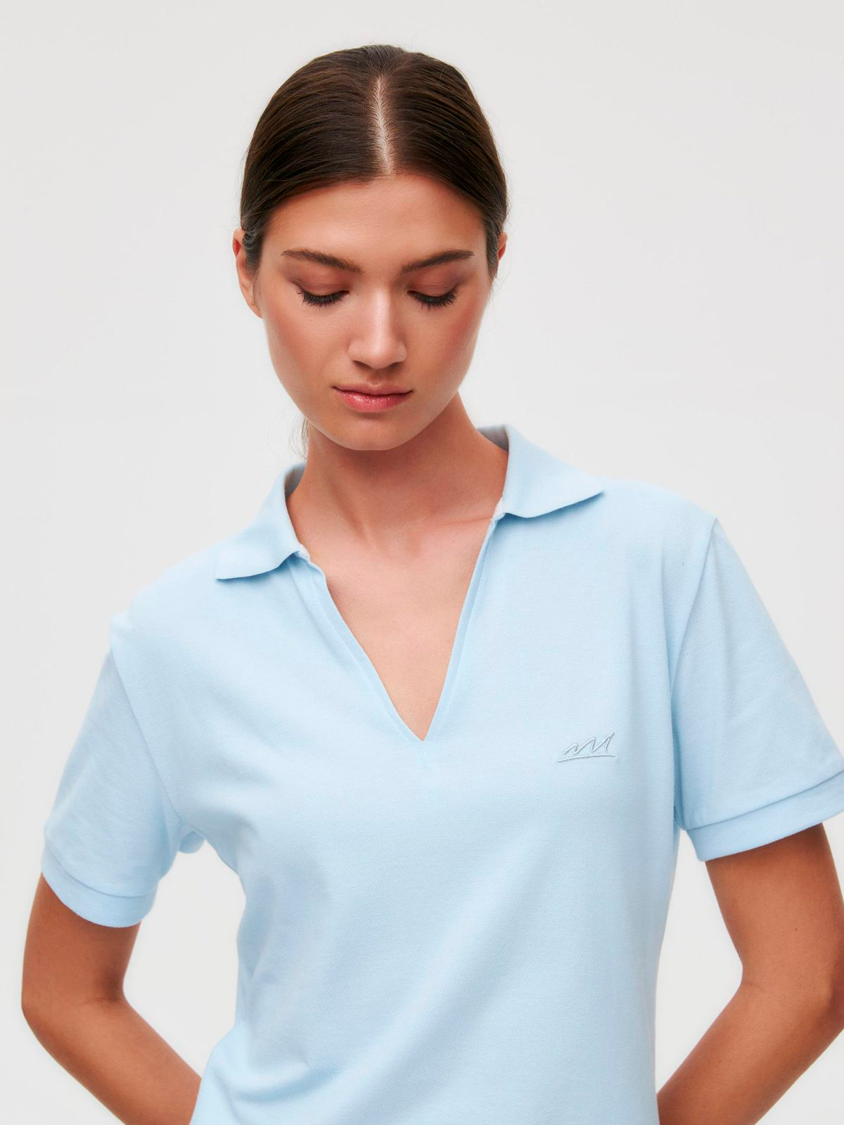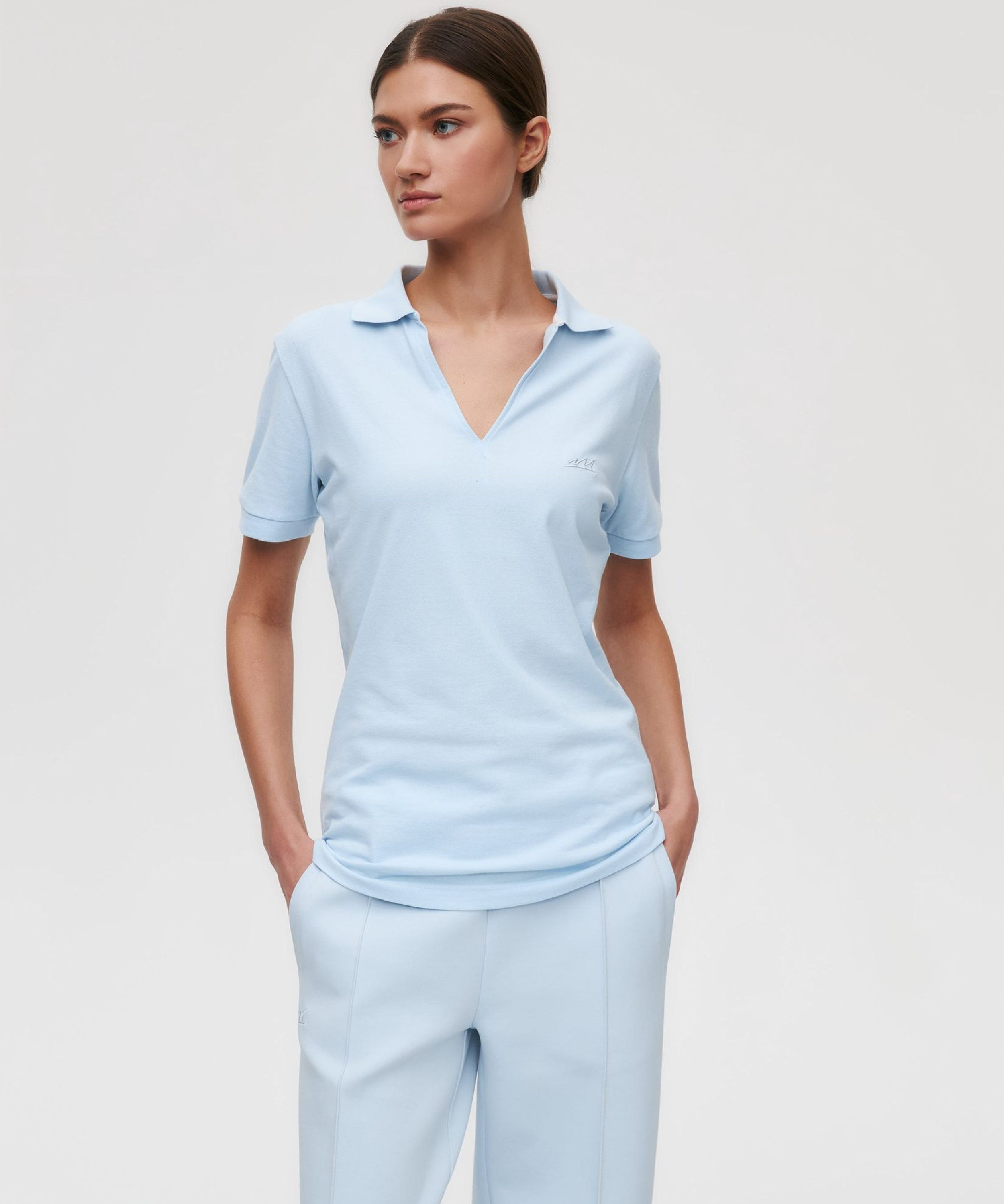 Женское классическое поло в спортивном стиле с V-вырезом выполнено из 100% хлопка. Прямой крой, классическая посадка. На груди расположена лаконичная вышивка с логотипом бренда. Поло представлено в двух цветах: нежно-голубой и холодный серый. Поло отлично сочетается как со спортивными вещами, так и с классическими брюками и юбкой.